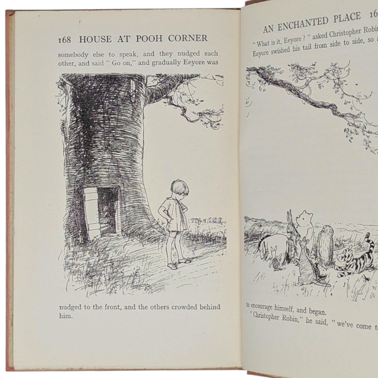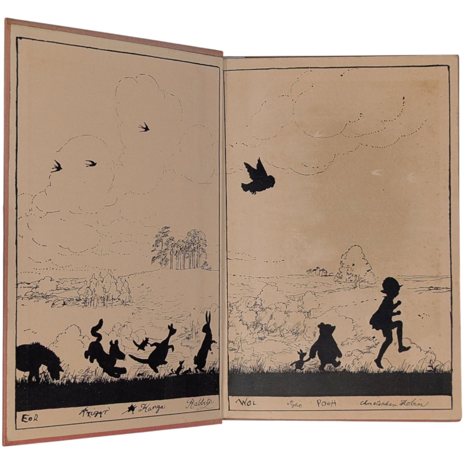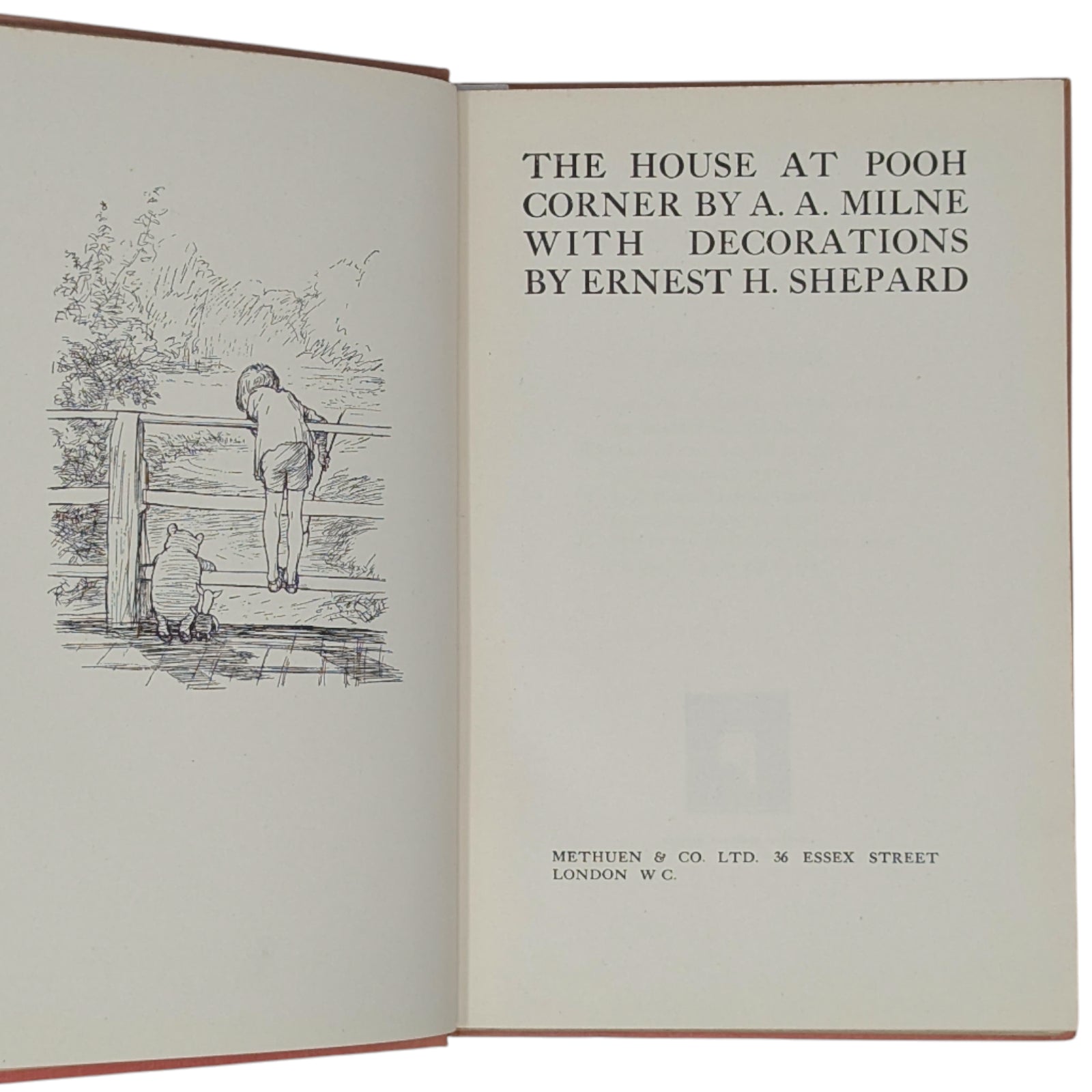 Original pink cloth, spine lettered in gilt, vignette of Christopher Robin, Pooh, and Piglet on front cover within gilt border, pink pictorial endpapers, top edge gilt. Missing the rare dustwrapper.