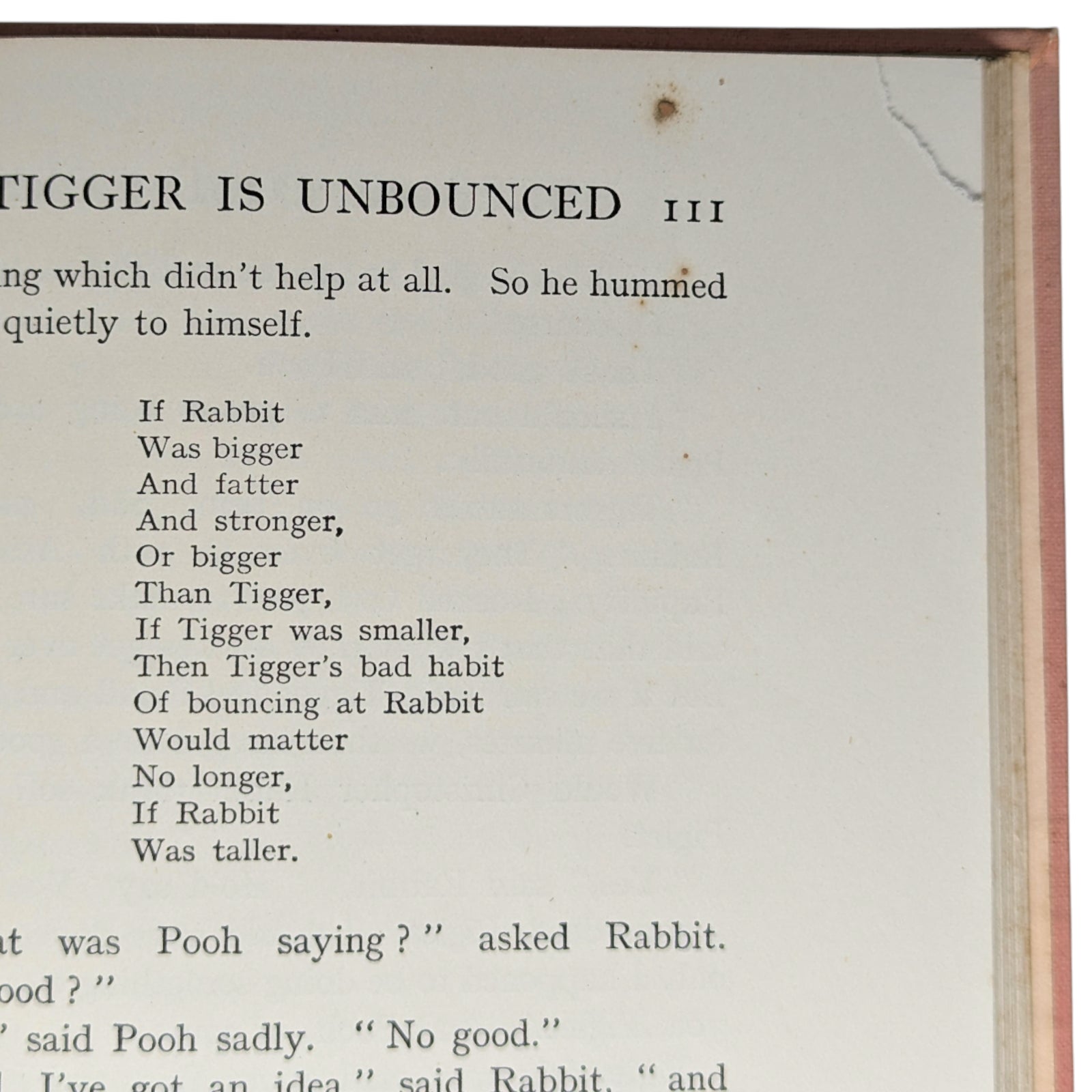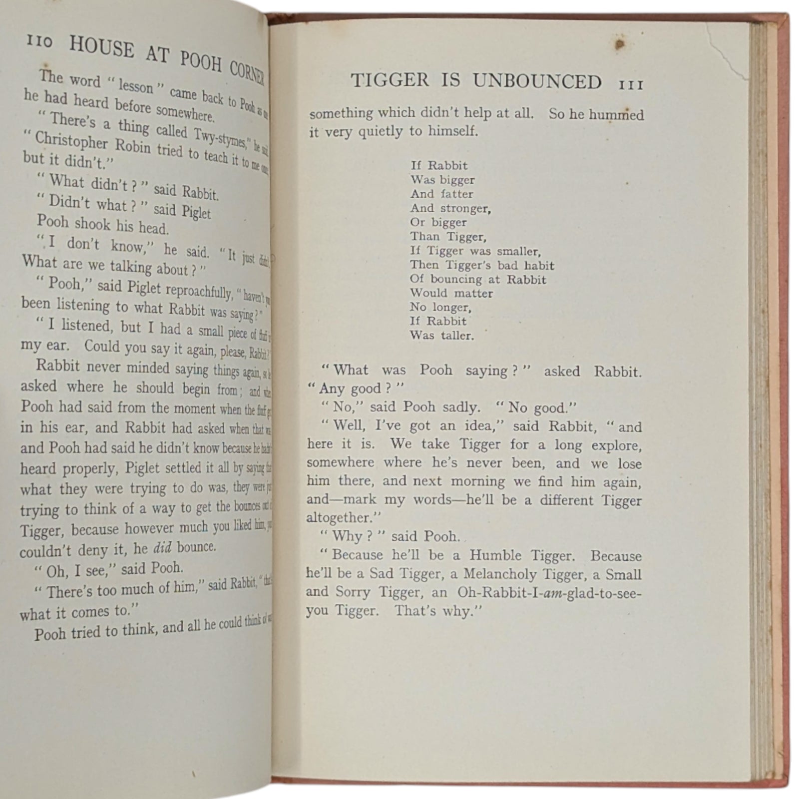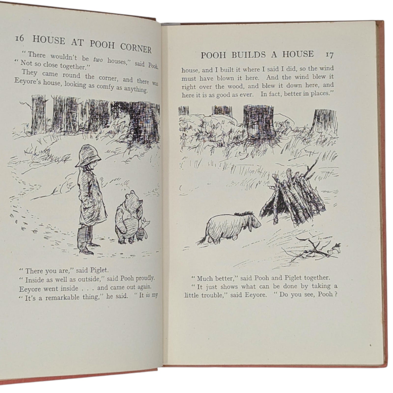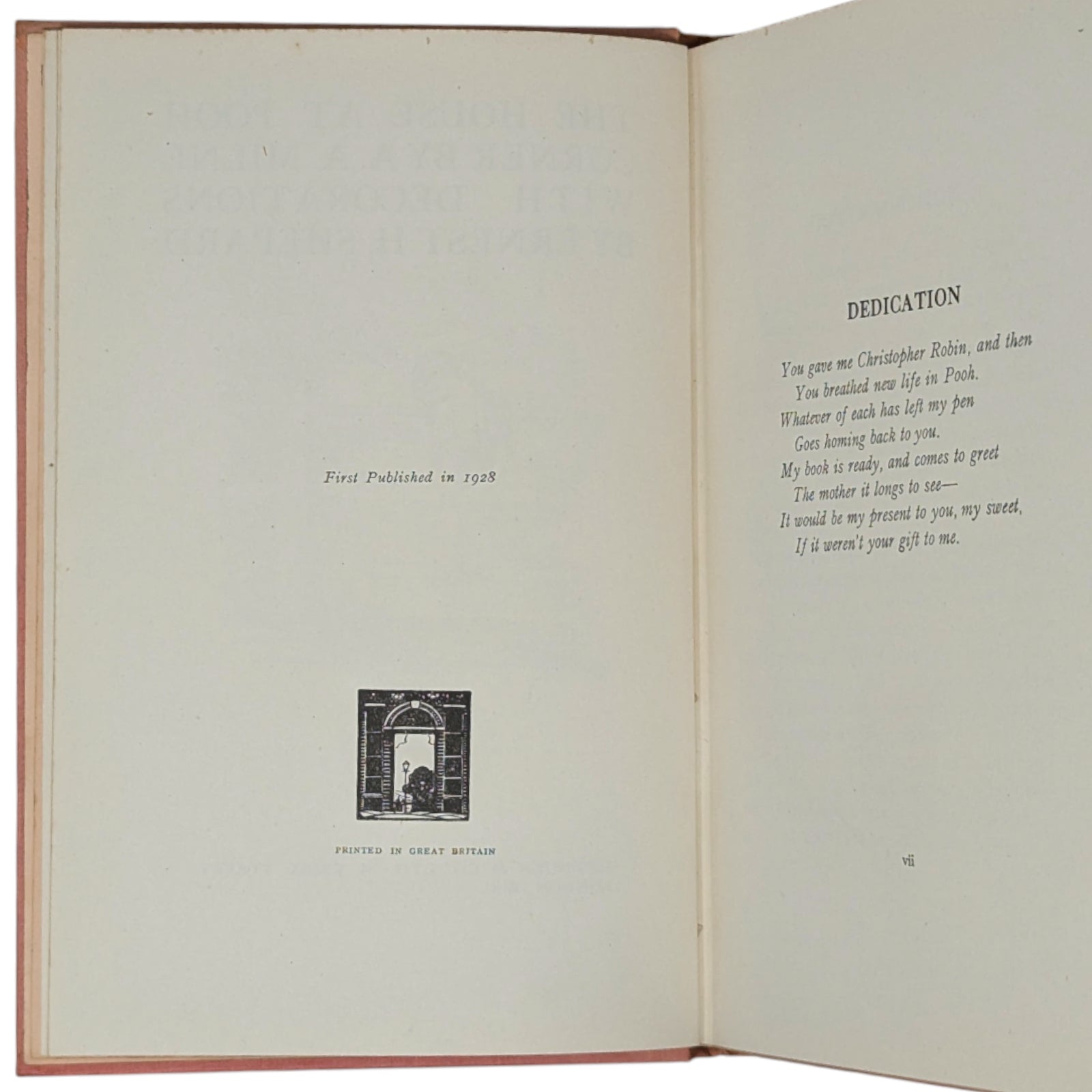 Original pink cloth, spine lettered in gilt, vignette of Christopher Robin, Pooh, and Piglet on front cover within gilt border, pink pictorial endpapers, top edge gilt. Missing the rare dustwrapper.