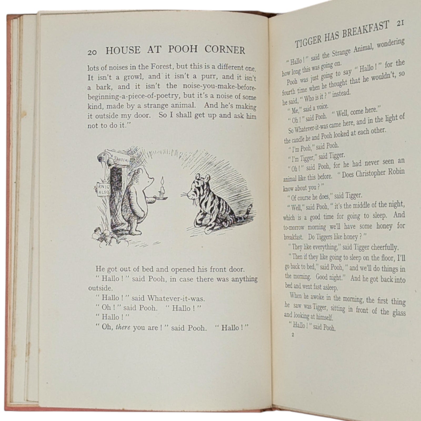 MILNE, A. A. The House at Pooh Corner. First edition, first impression, of the final Pooh book, which introduces both Tigger and the game of Poohsticks. London: Methuen & Co. Ltd, 1928. Octavo, pp. xi, 178. With numerous line drawings plus endpaper illustrations by E. H. Shepard.