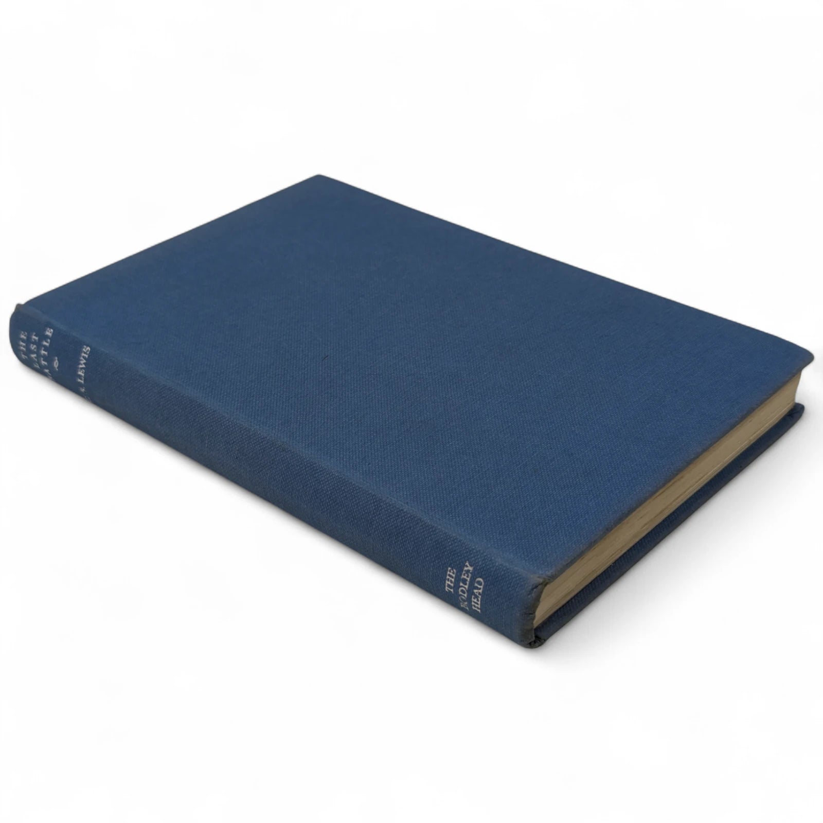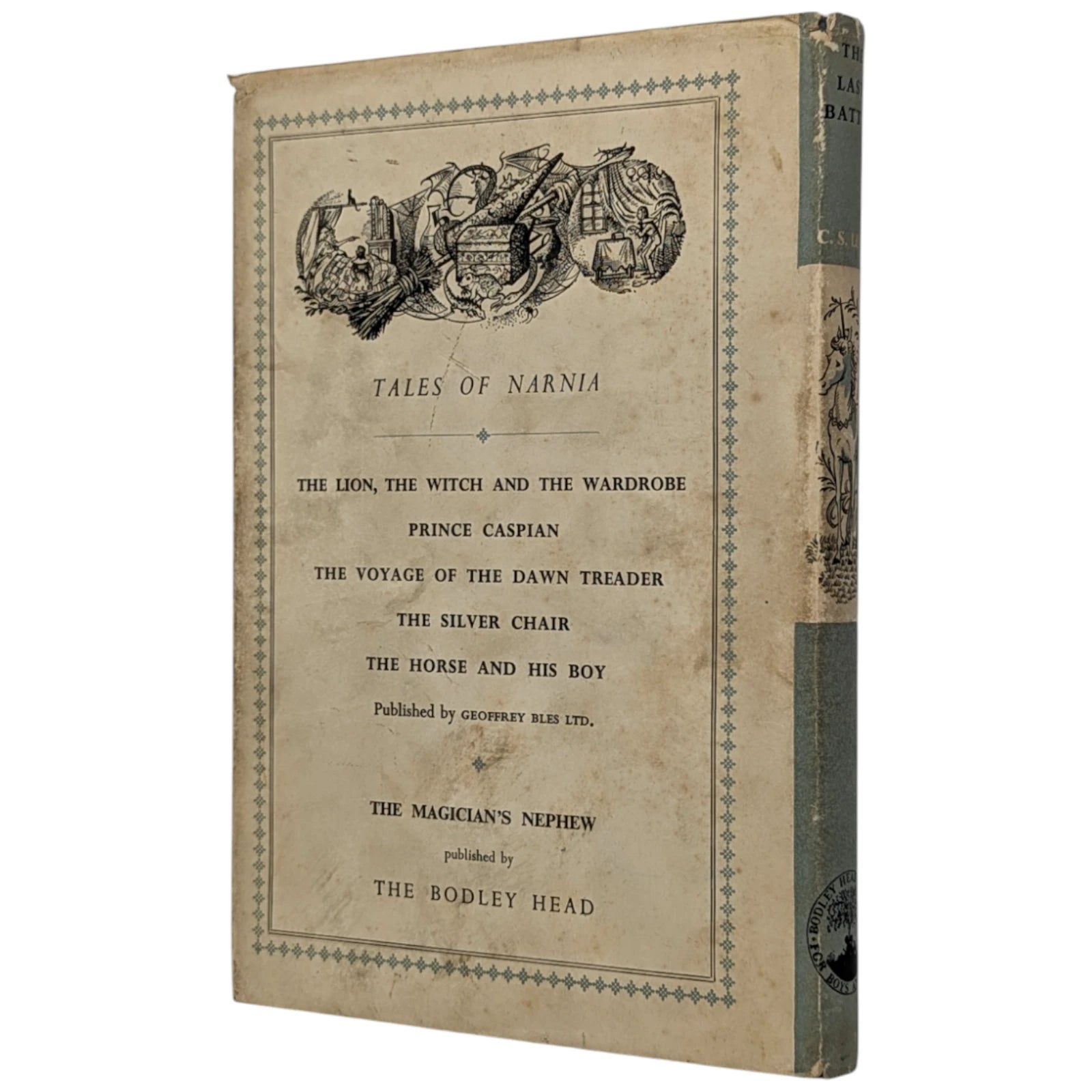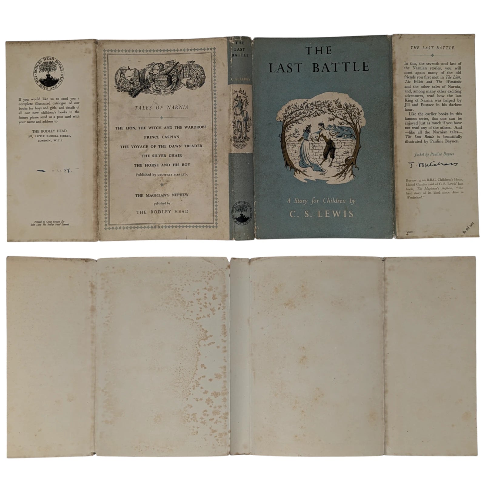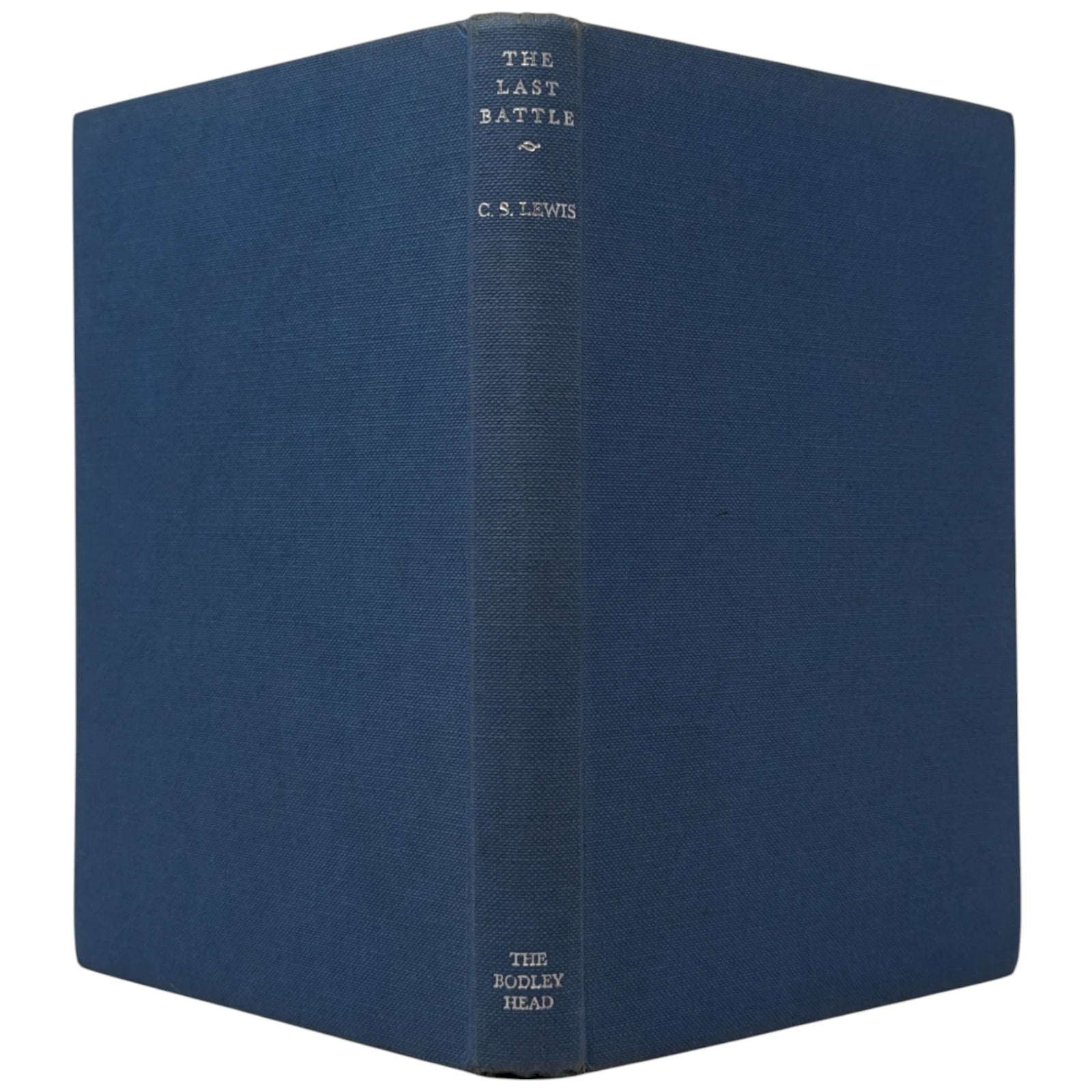 The Last Battle: A Story for Children, by C. S. Lewis. London: The Bodley Head, 1956. First edition, first printing. Chronologically, the seventh and last book in the Chronicles of Narnia series. Publisher's blue cloth binding, silver lettering to spine, plain endpapers; in original, unclipped dust wrapper priced 9s 6d to front flap.