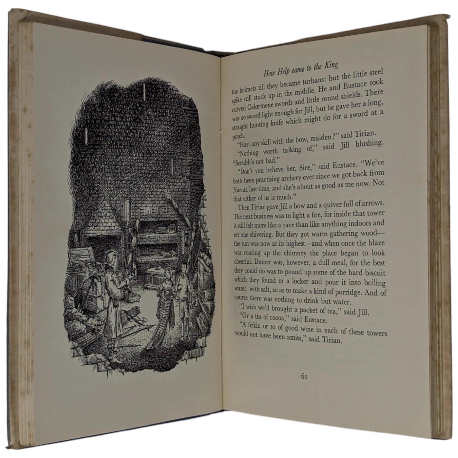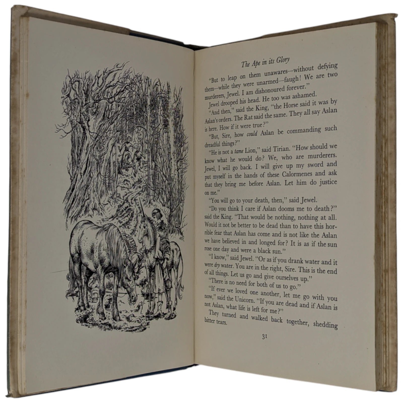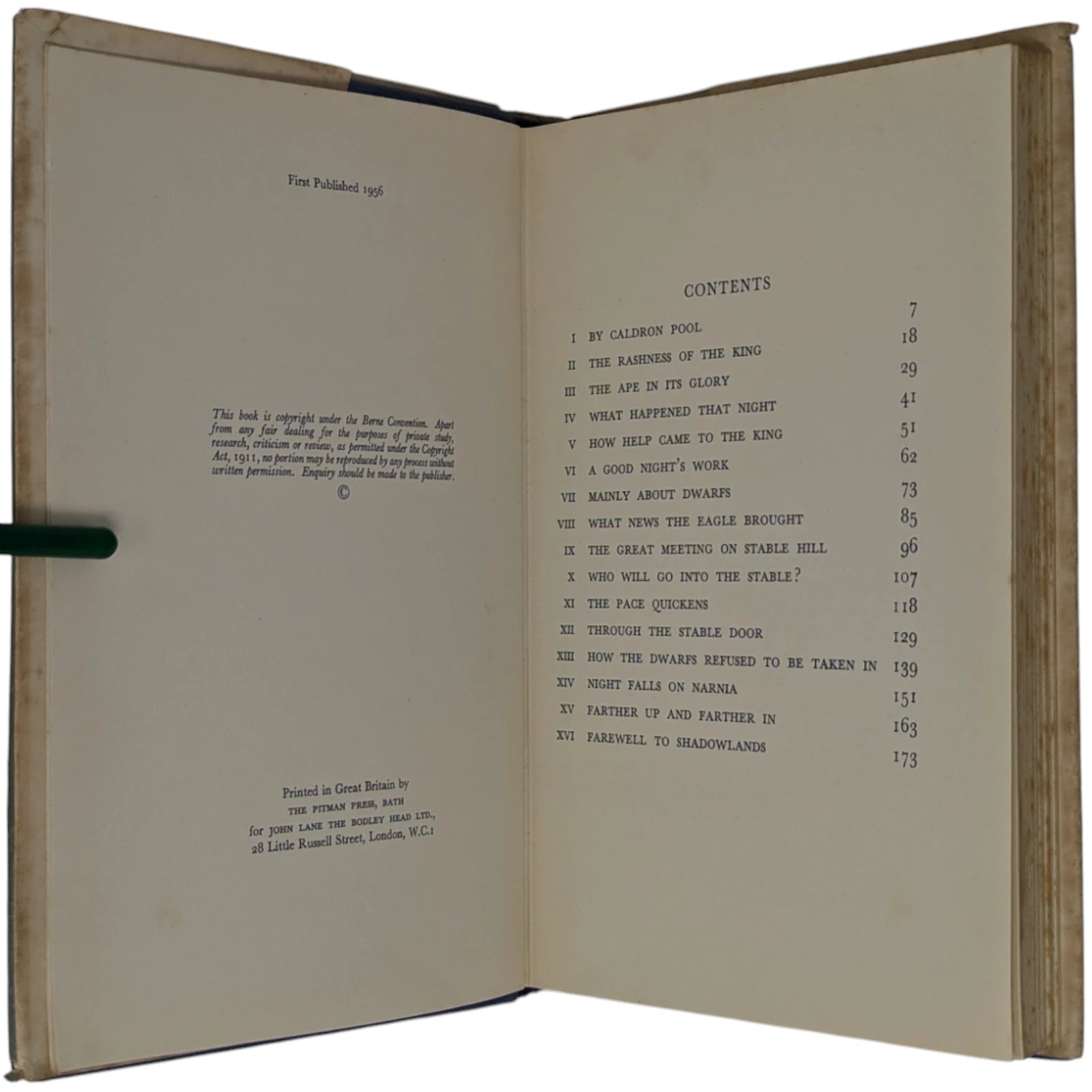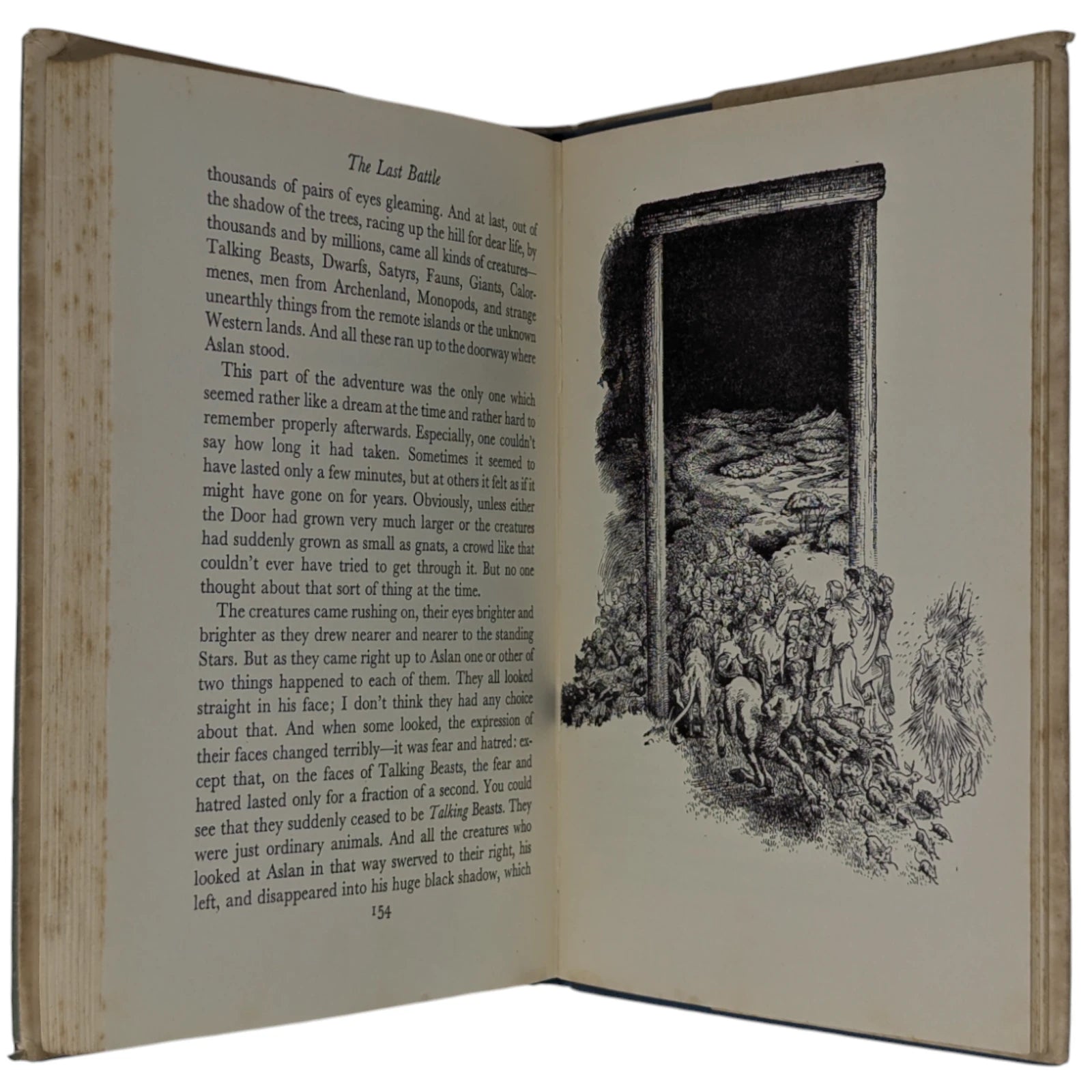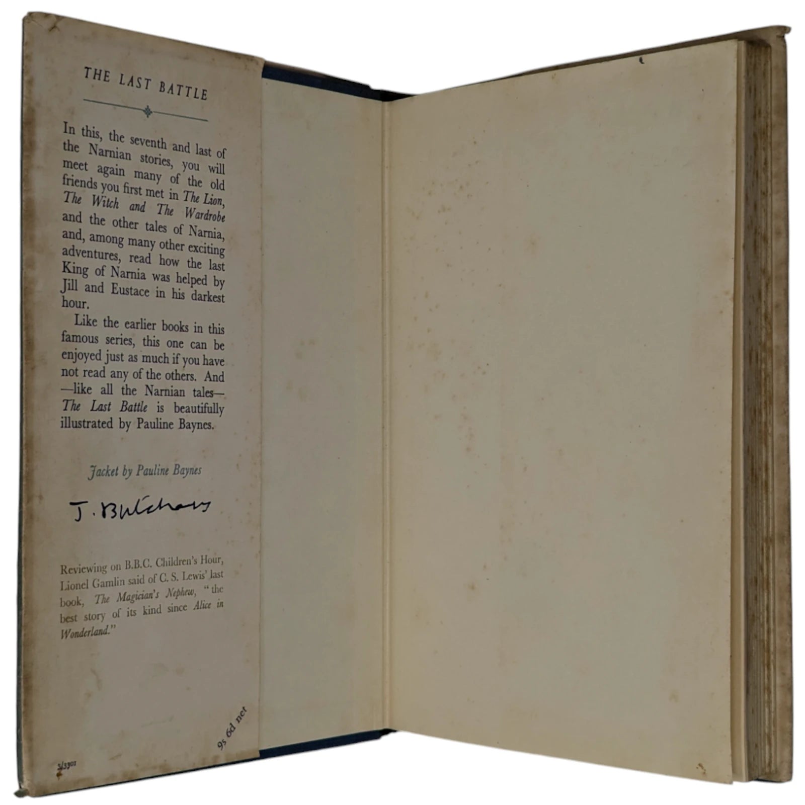 A first edition, first printing copy of the story of the last war of Narnia, when King Tirian and his loyal followers fight the Calormene invaders and their allies; a conflict which leads to the end of the old world of Narnia and the beginning of a new adventure in Aslan's real country.