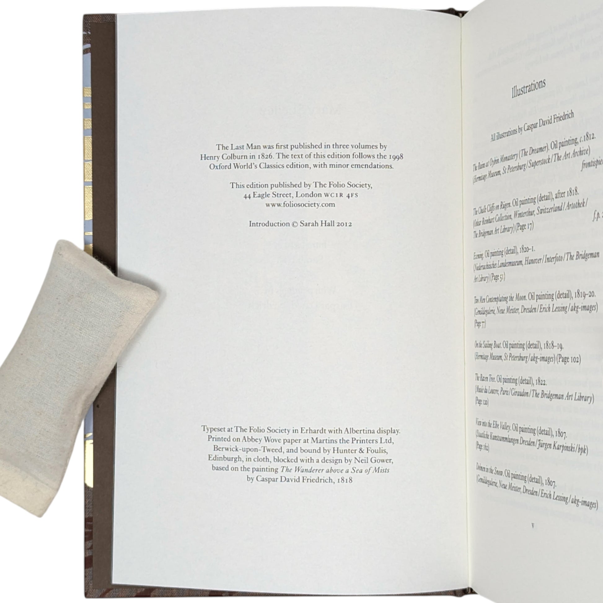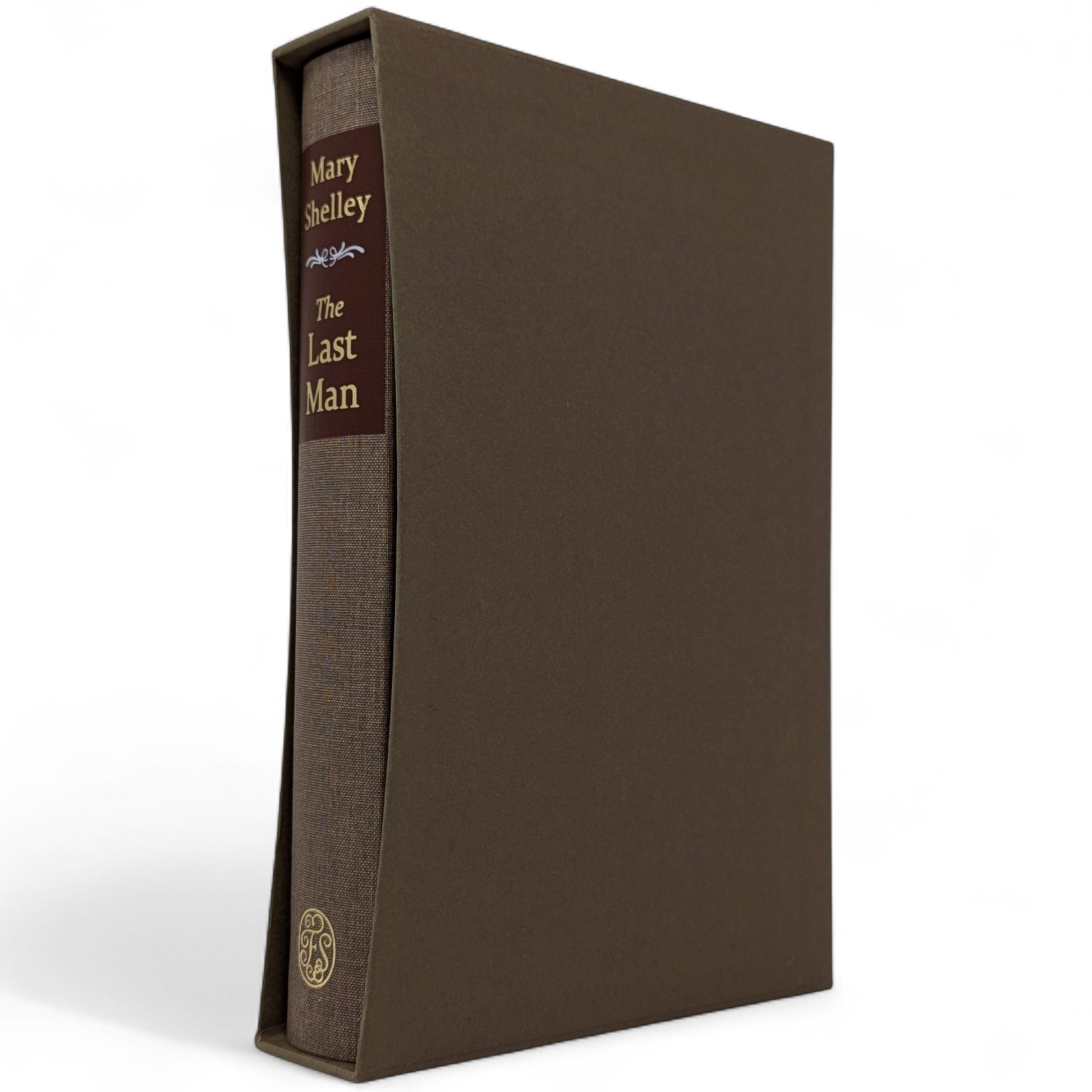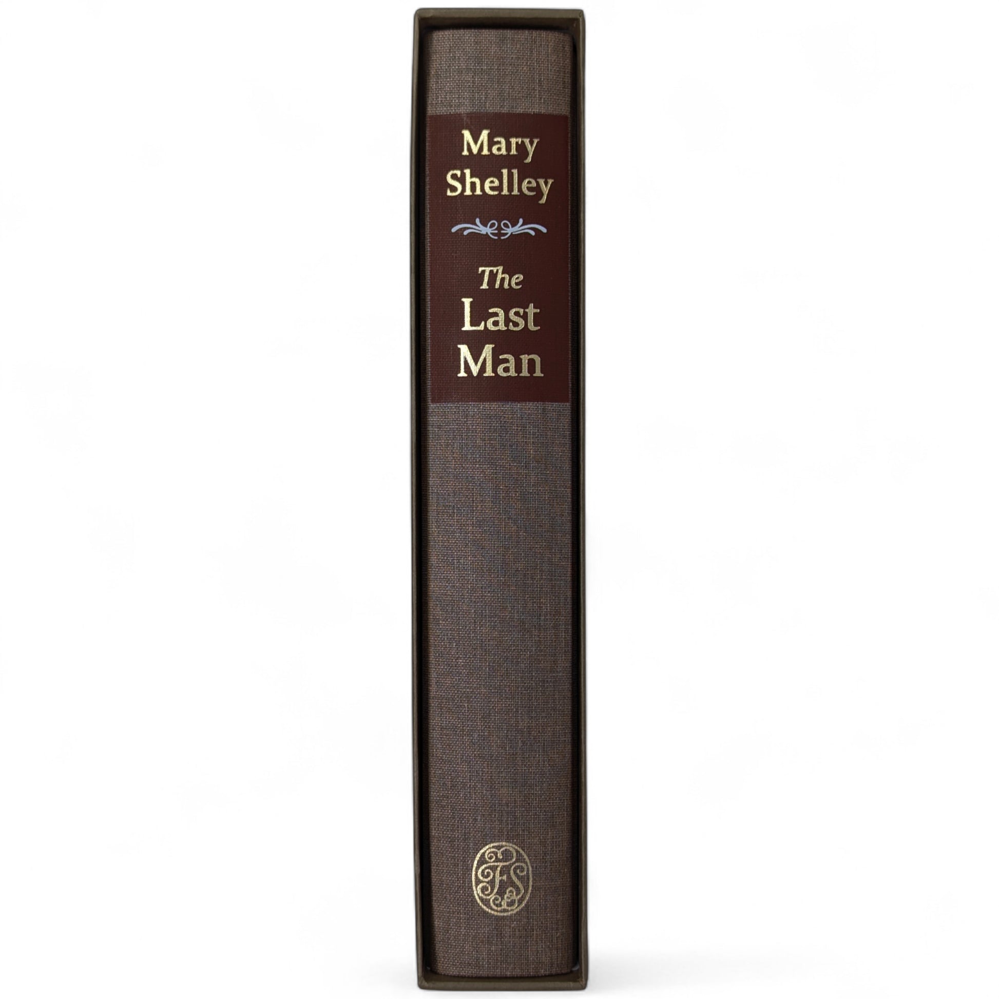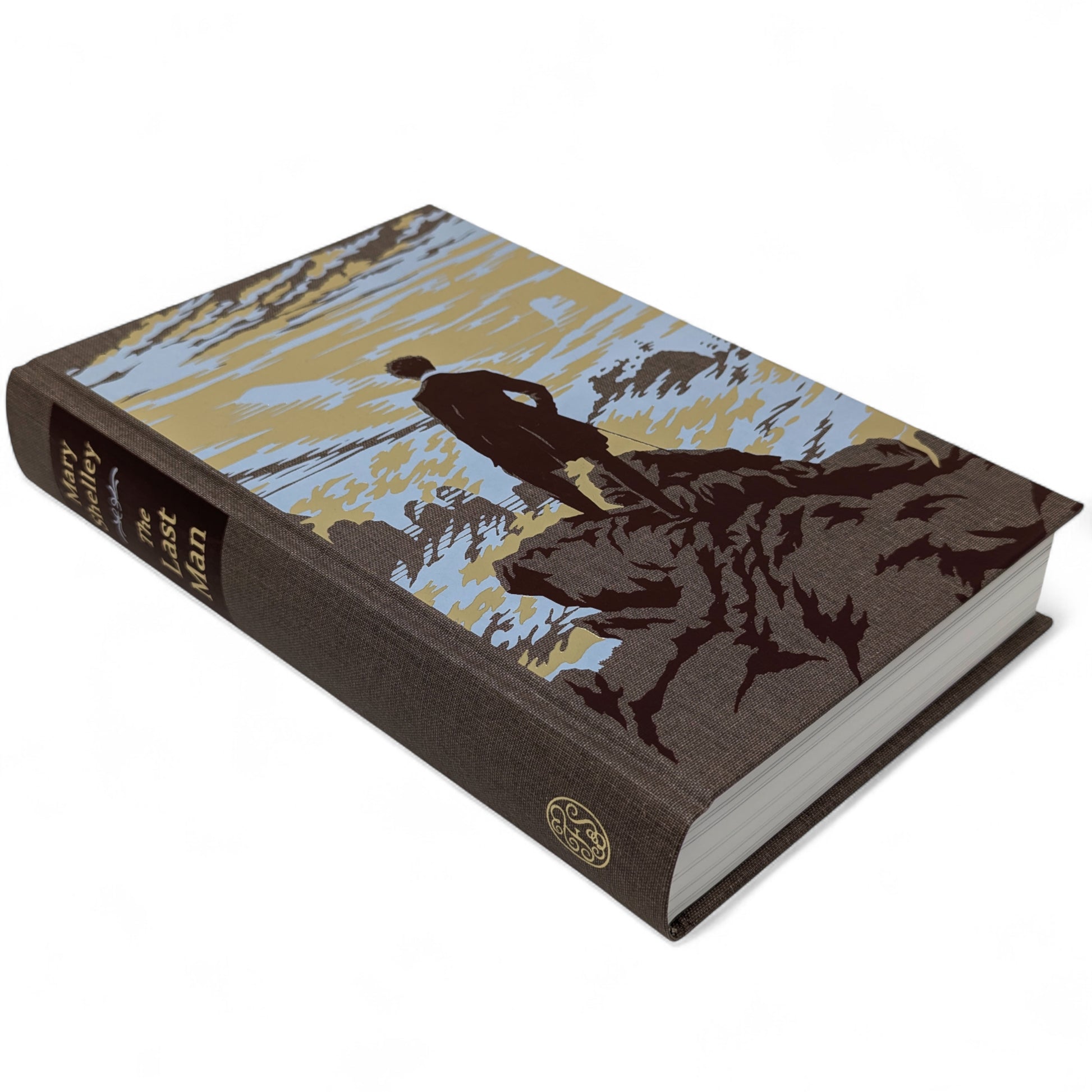 SHELLEY, Mary. The Last Man. London: The Folio Society, 2012. First printing thus. Introduced by Sarah Hall, with paintings by Caspar David Friedrich. 240 × 160 × 37 mm. Pp. [i–iv] v–xii, [1–6] 7–426 [427–428]: [13] leaves of colour plates. Type: Ehrhardt with Albertina for display. Printed by Martins of Berwick. Bound by Hunter and Foulis in full brown cloth blocked in gold, grey and dark brown with design by Neil Gower based on a painting by Friedrich; brown endleaves. Brown slip case.
