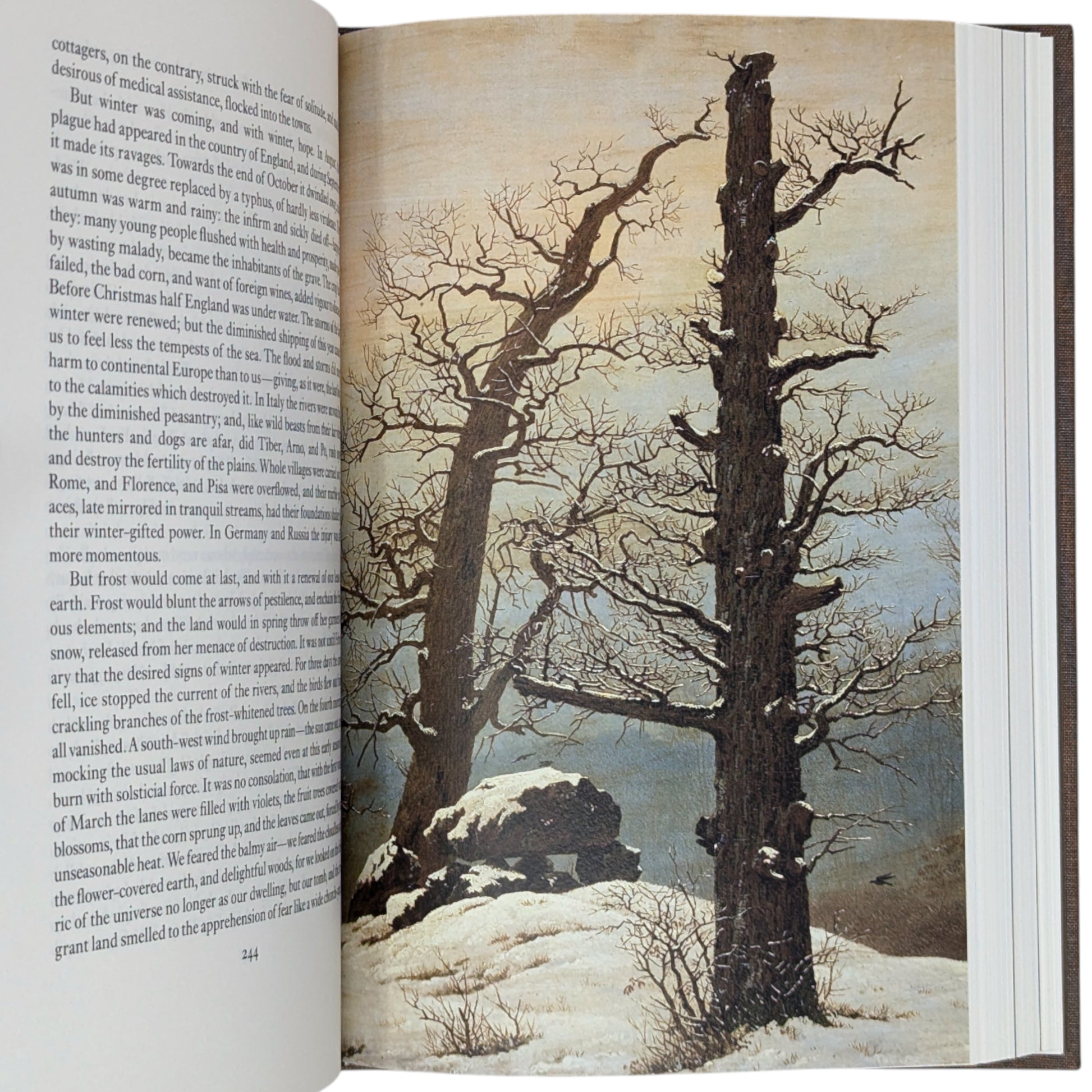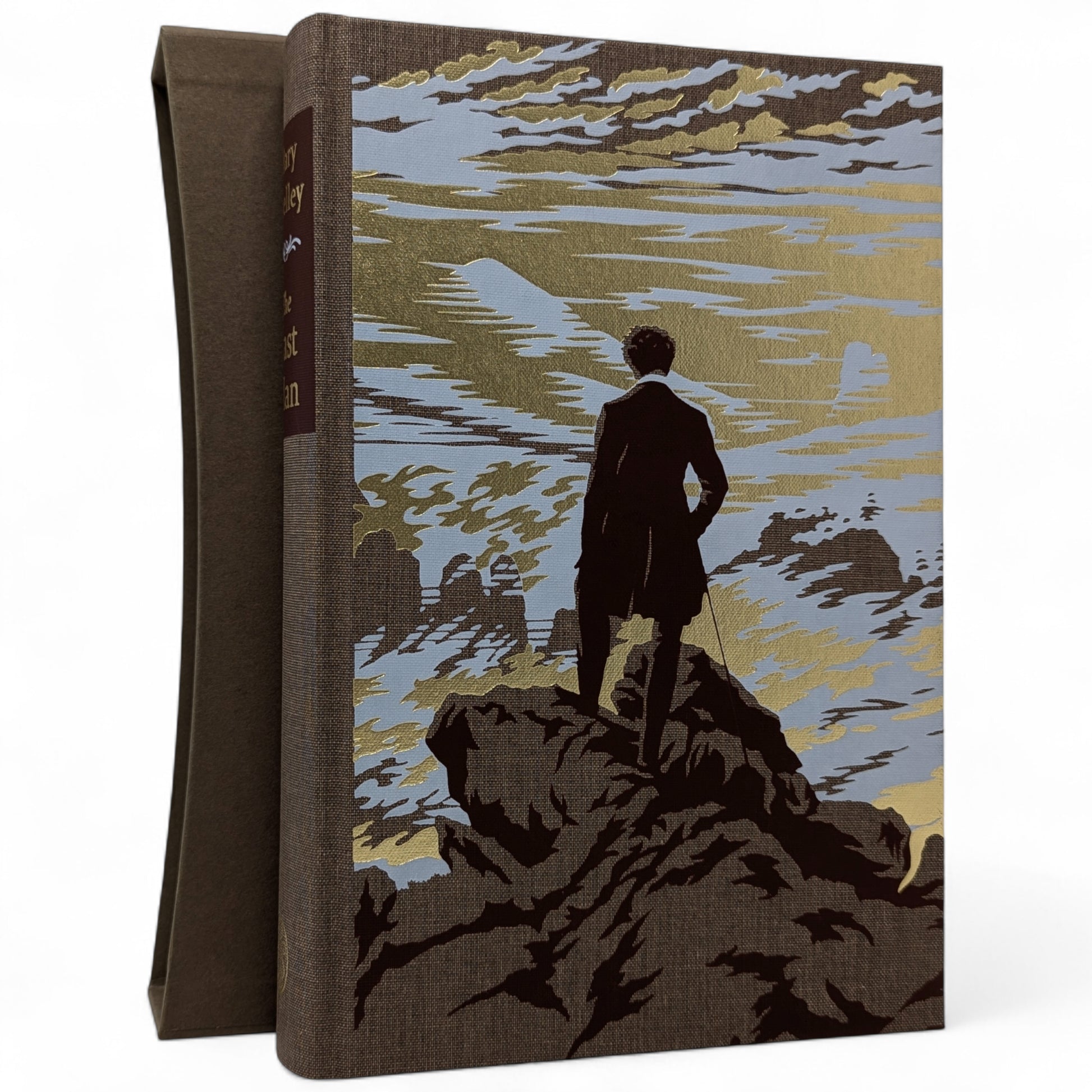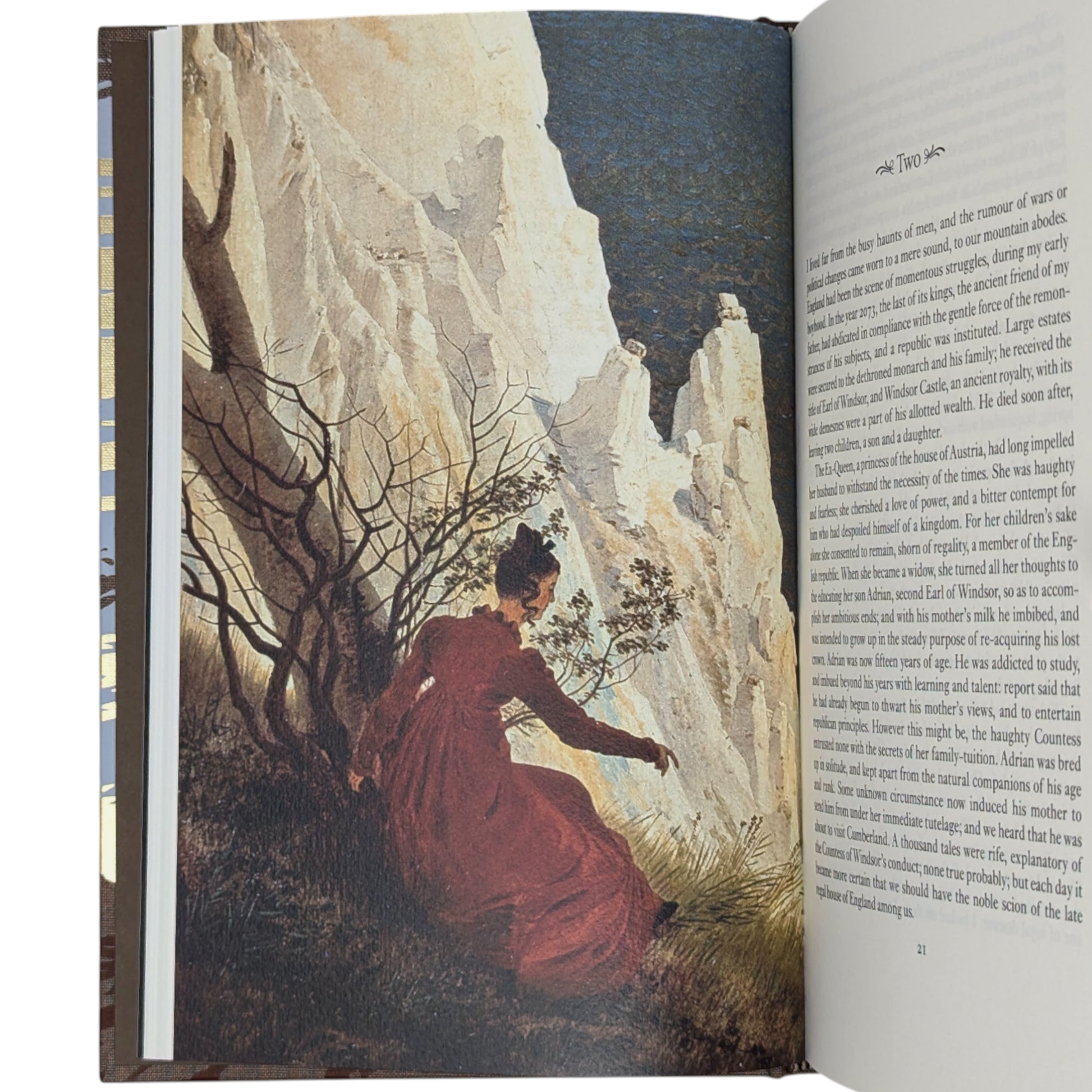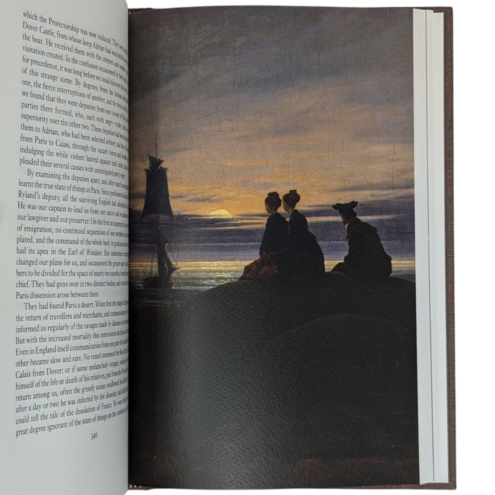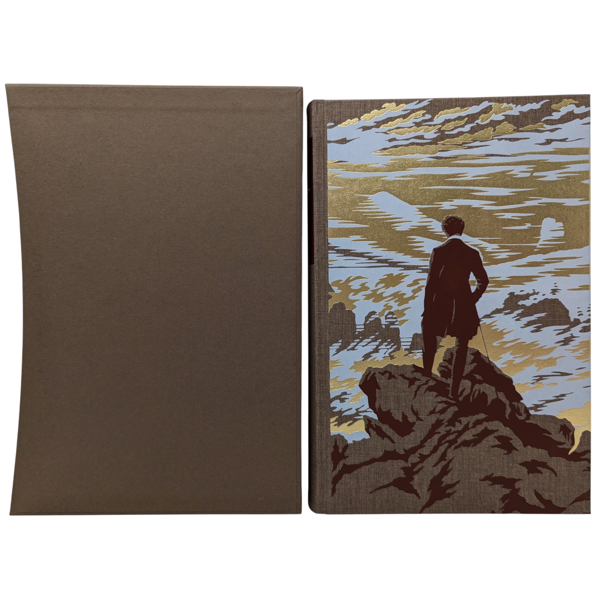 SHELLEY, Mary. The Last Man. London: The Folio Society, 2012. First printing thus. Introduced by Sarah Hall, with paintings by Caspar David Friedrich. 240 × 160 × 37 mm. Pp. [i–iv] v–xii, [1–6] 7–426 [427–428]: [13] leaves of colour plates. Type: Ehrhardt with Albertina for display. Printed by Martins of Berwick. Bound by Hunter and Foulis in full brown cloth blocked in gold, grey and dark brown with design by Neil Gower based on a painting by Friedrich; brown endleaves. Brown slip case.