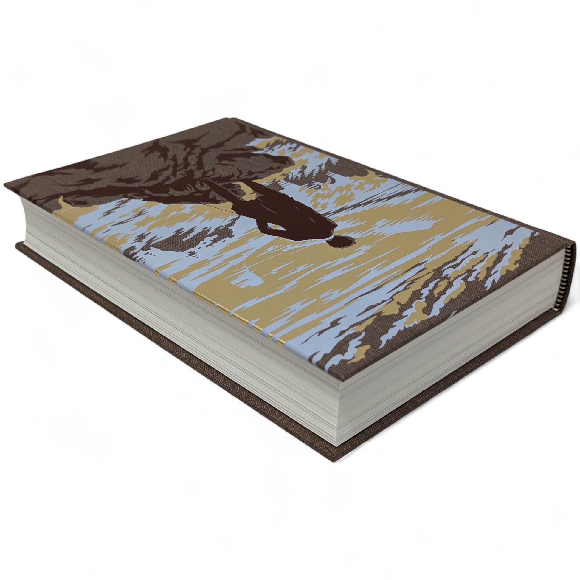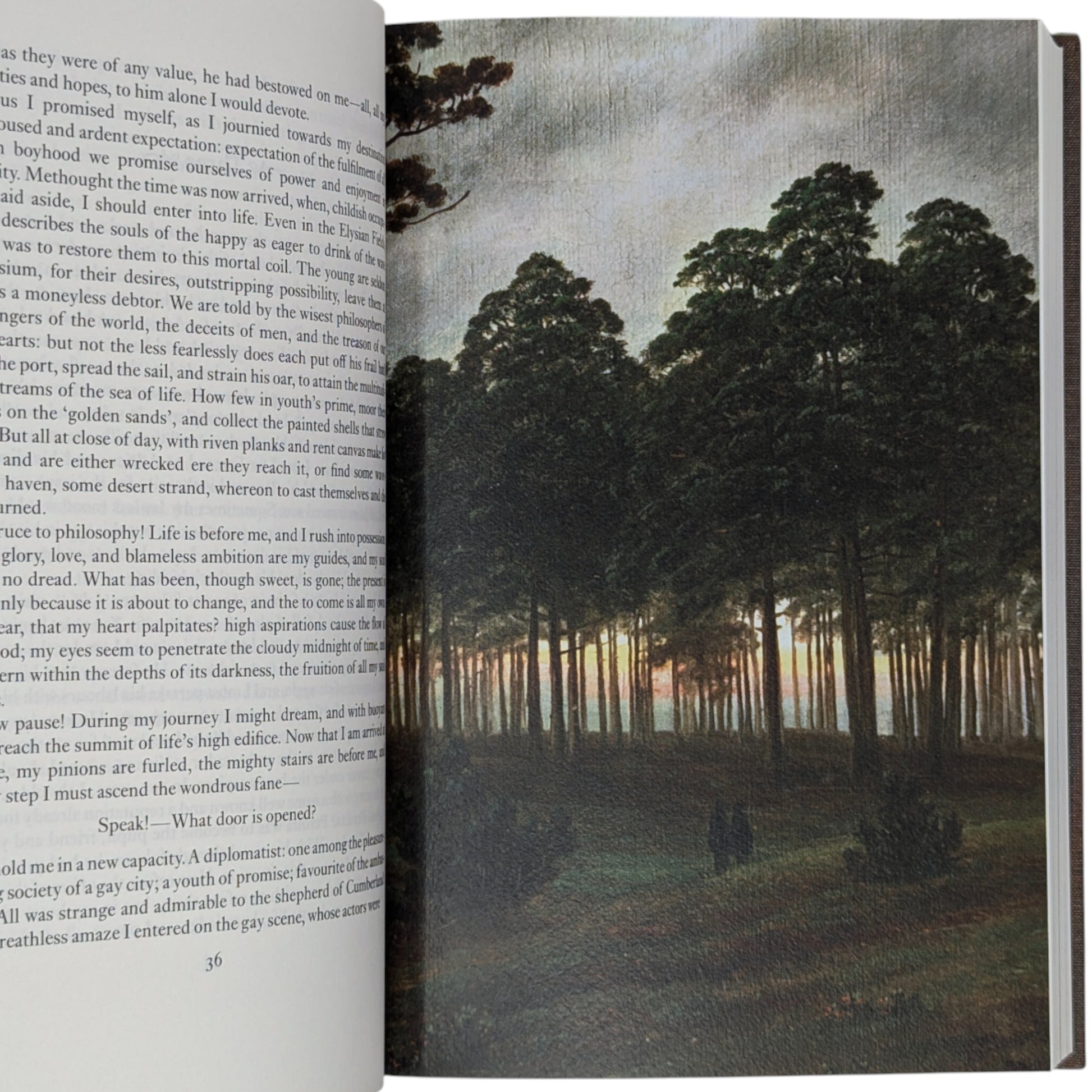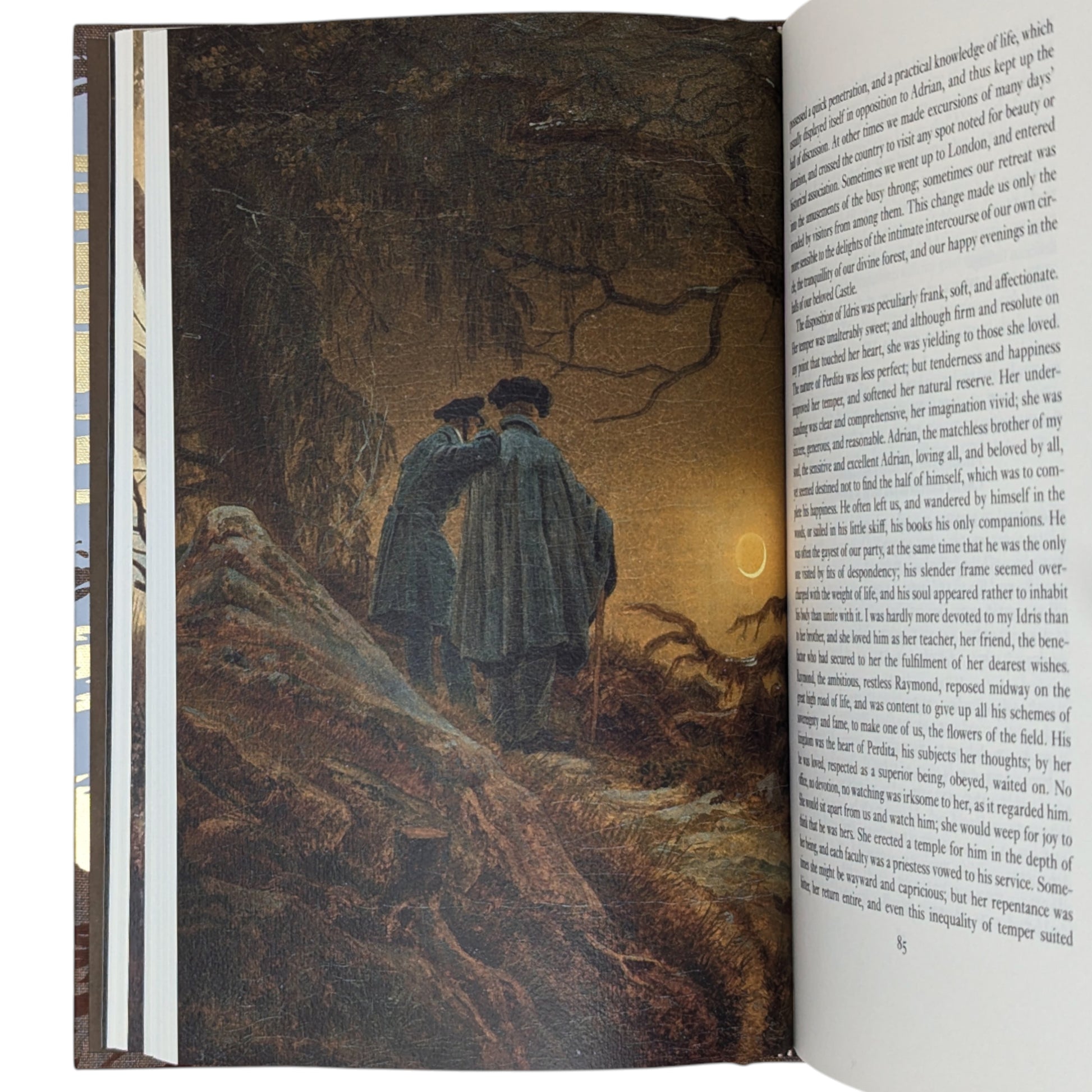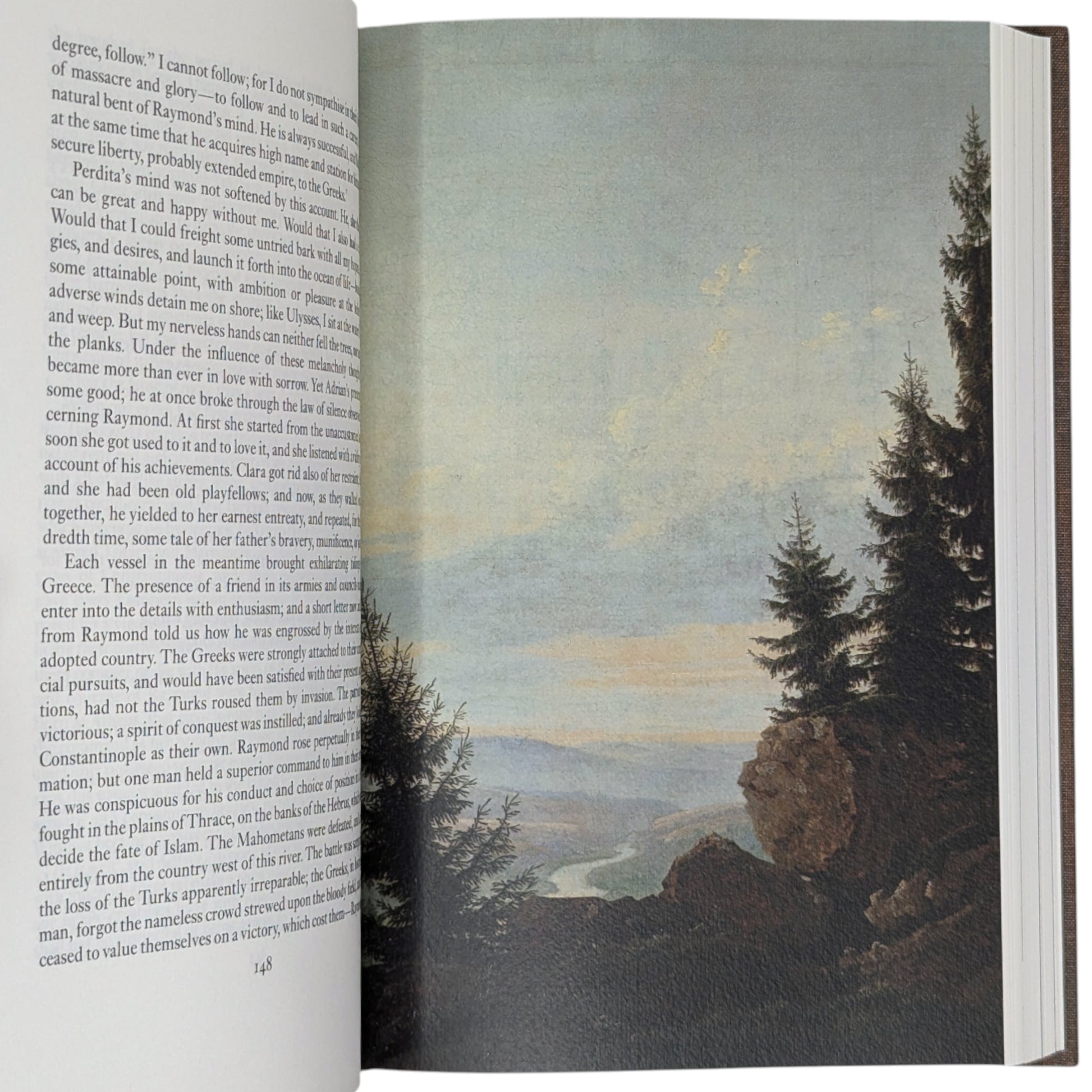 SHELLEY, Mary. The Last Man. London: The Folio Society, 2012. First printing thus. Introduced by Sarah Hall, with paintings by Caspar David Friedrich. 240 × 160 × 37 mm. Pp. [i–iv] v–xii, [1–6] 7–426 [427–428]: [13] leaves of colour plates. Type: Ehrhardt with Albertina for display. Printed by Martins of Berwick. Bound by Hunter and Foulis in full brown cloth blocked in gold, grey and dark brown with design by Neil Gower based on a painting by Friedrich; brown endleaves. Brown slip case.