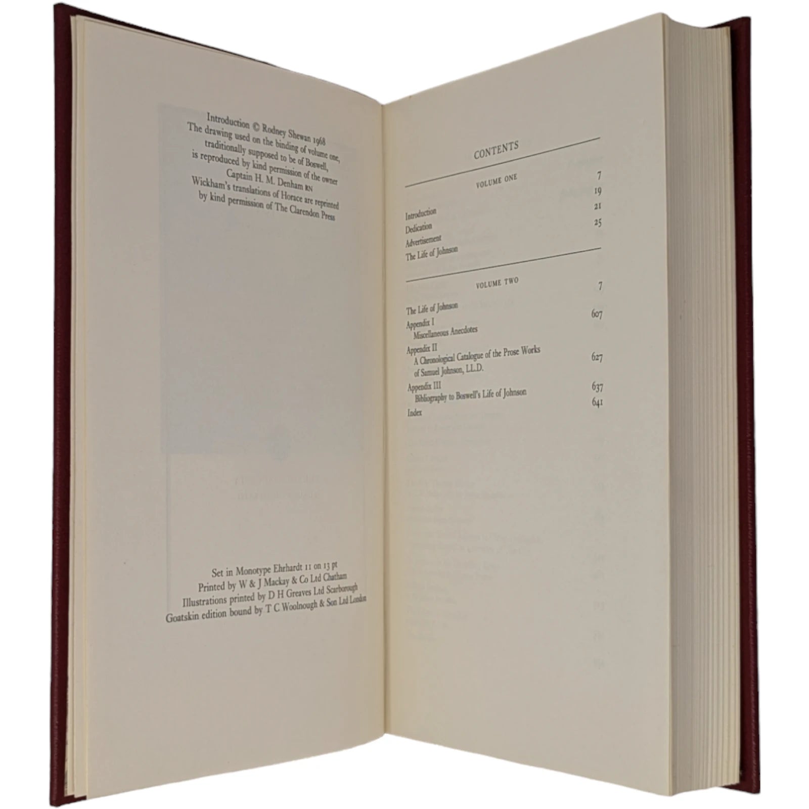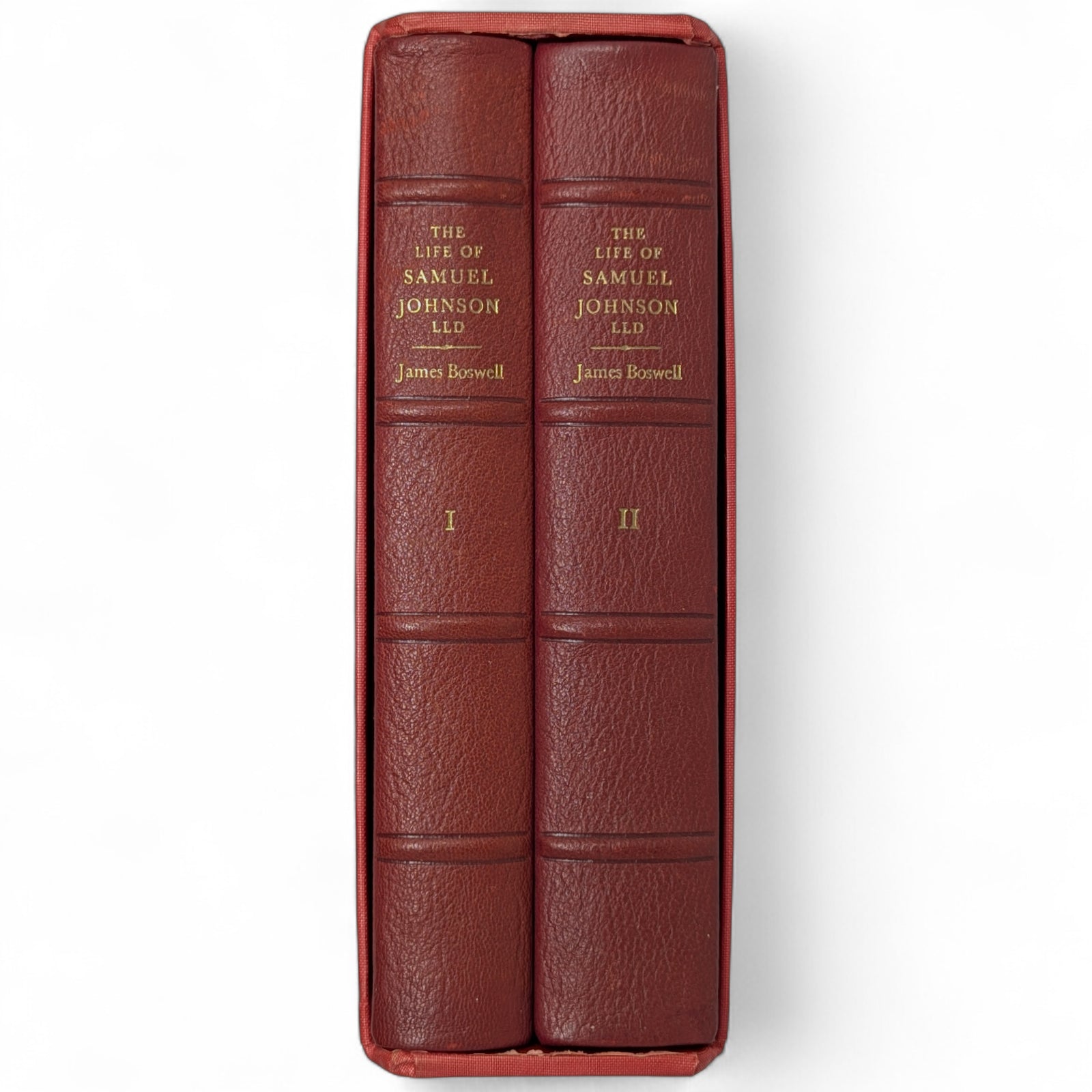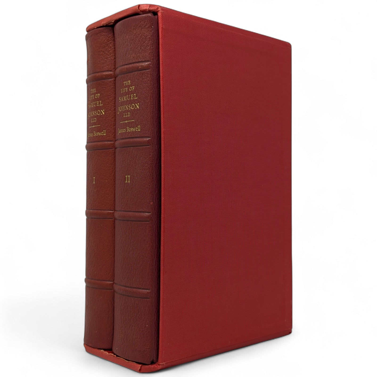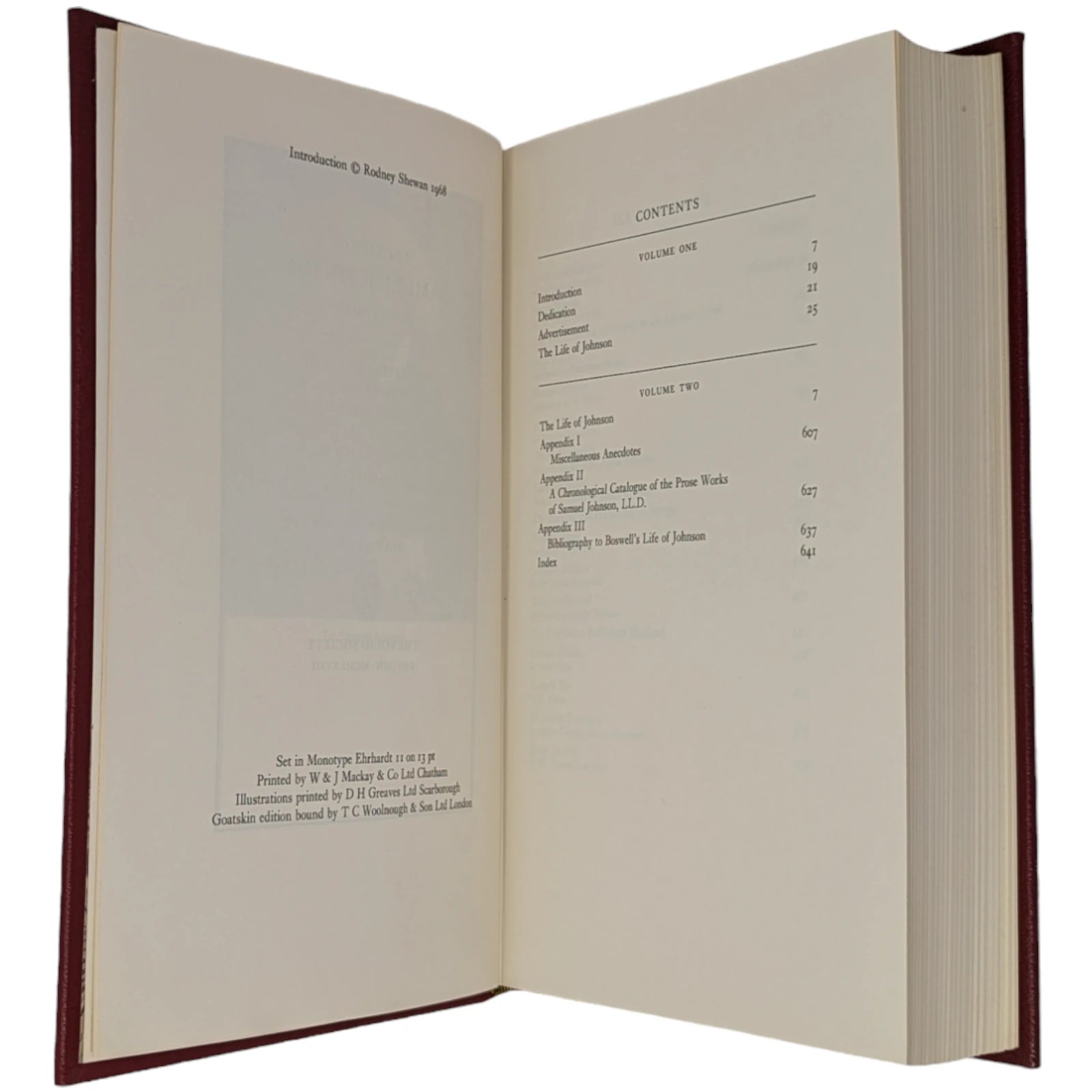 Edited by Rodney Shewan, volume one [–two]. 254 × 163 × 38–44 mm. 2 vols (pp. [1–7] 8–568: [16] leaves of gravure plates; [1–9] 10–682 [683–684]: [16] leaves of gravure plates). Type: Ehrhardt with Rosart capitals at chapter openings. Printed by Mackay, the gravures by D.H. Greaves. Bound by T C Woolnough & Son Ltd in full red goatskin leather titled in gold, with Cockerell marbled endleaves. Red buckram-covered two-volume slip case. The text follows the first edition of 1791, corrected according to Boswell’s Principal corrections and additions, published to accompany the second edition in 1793.