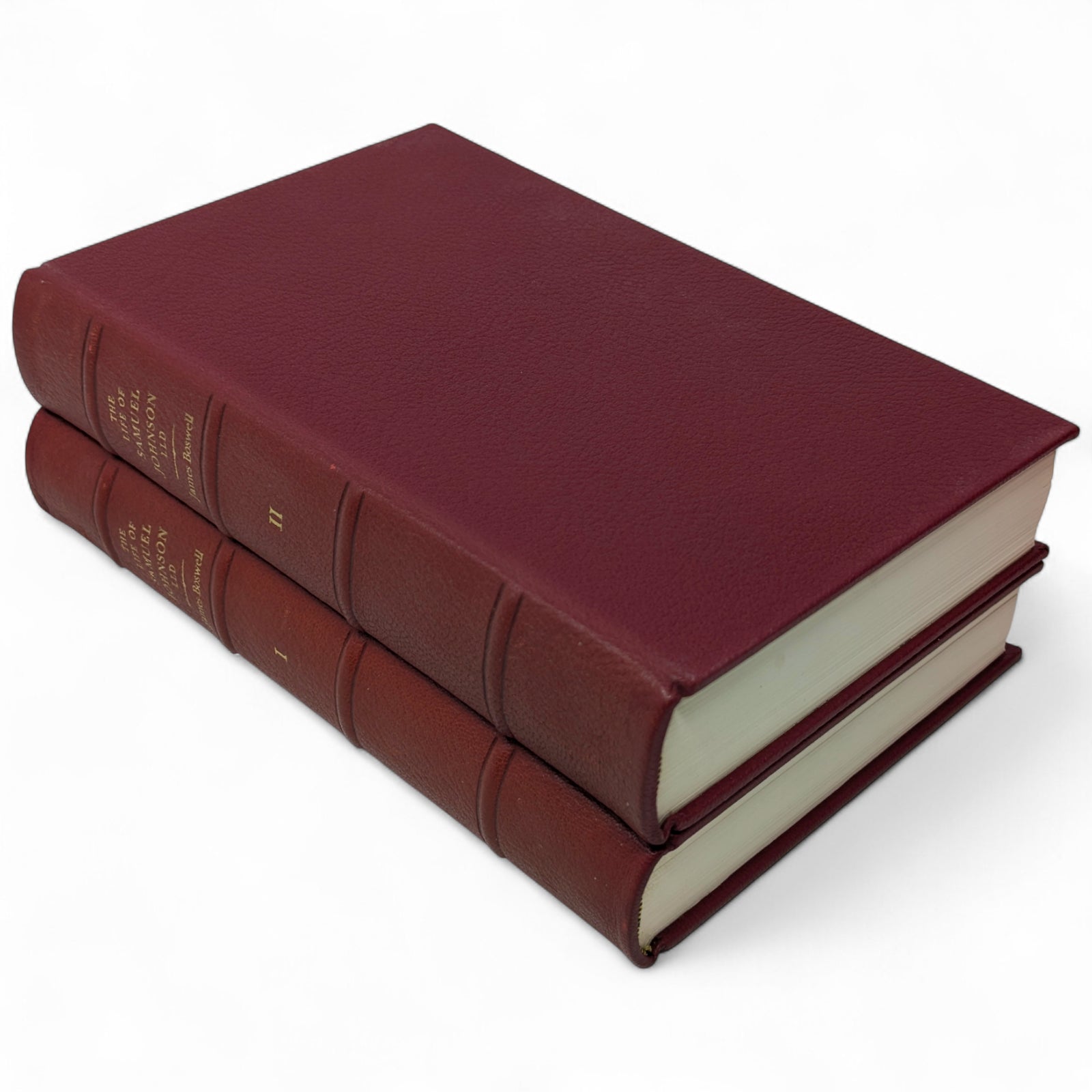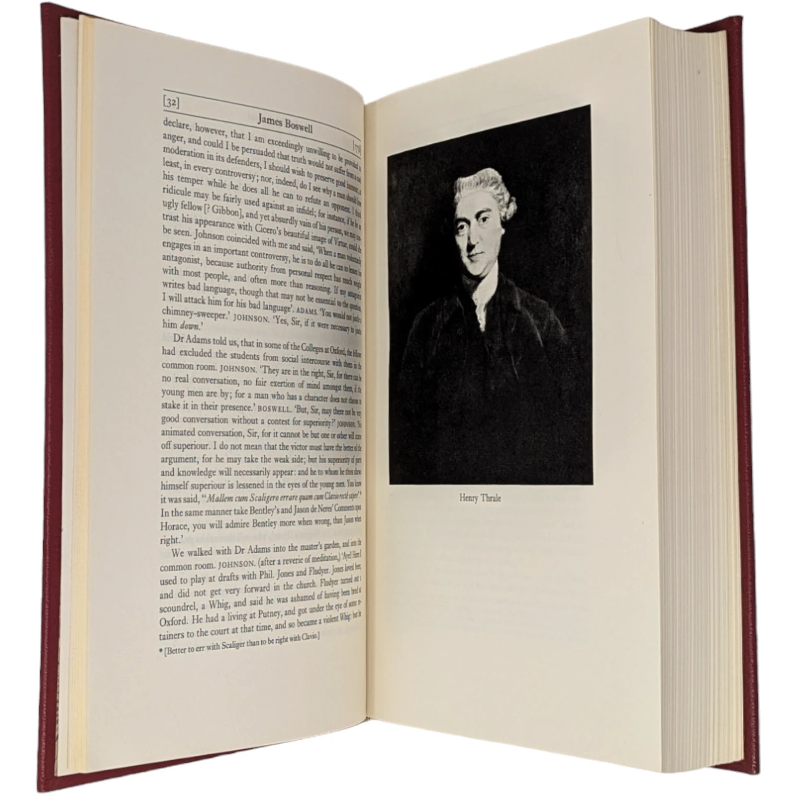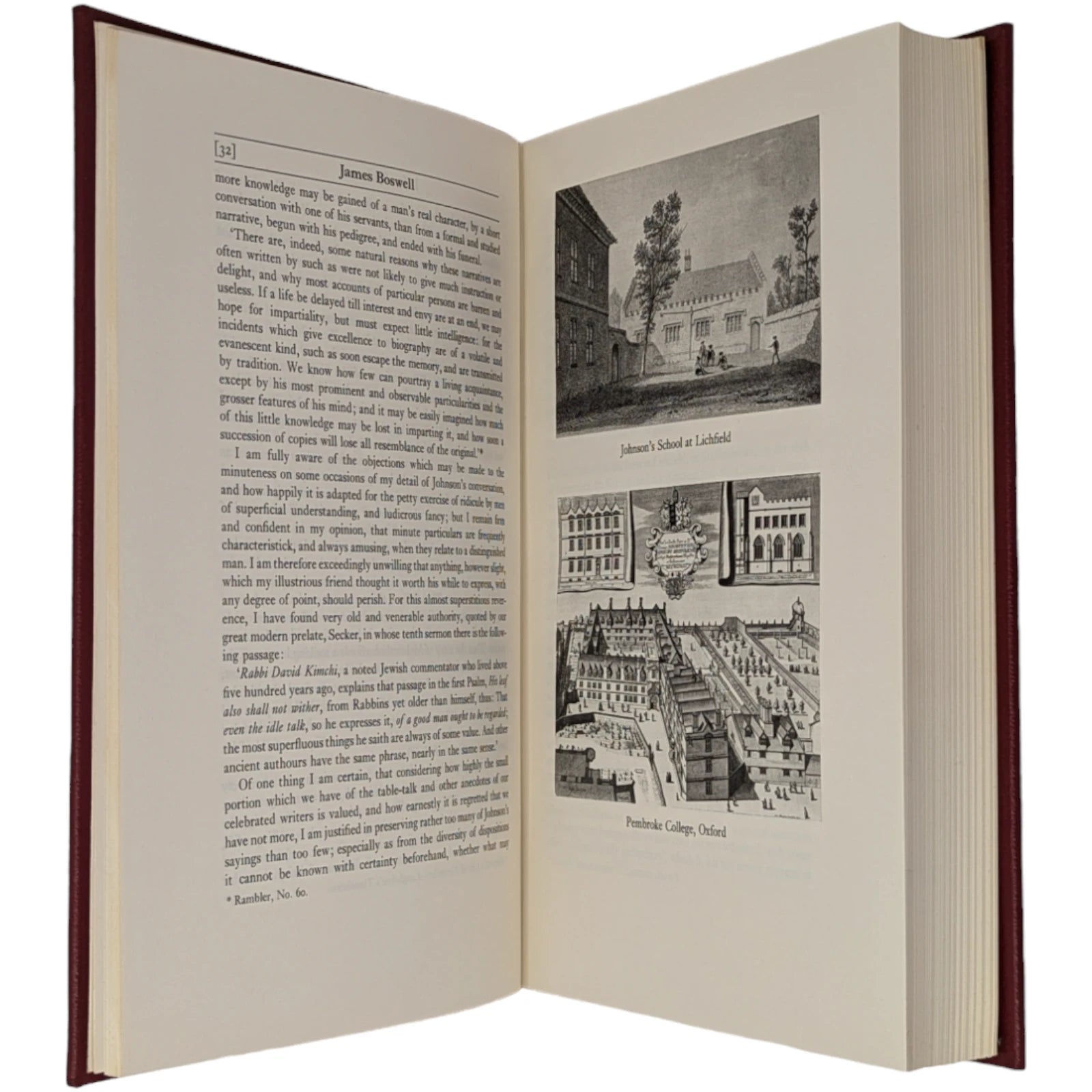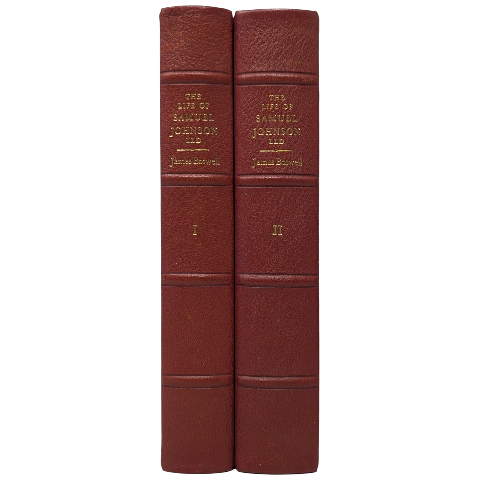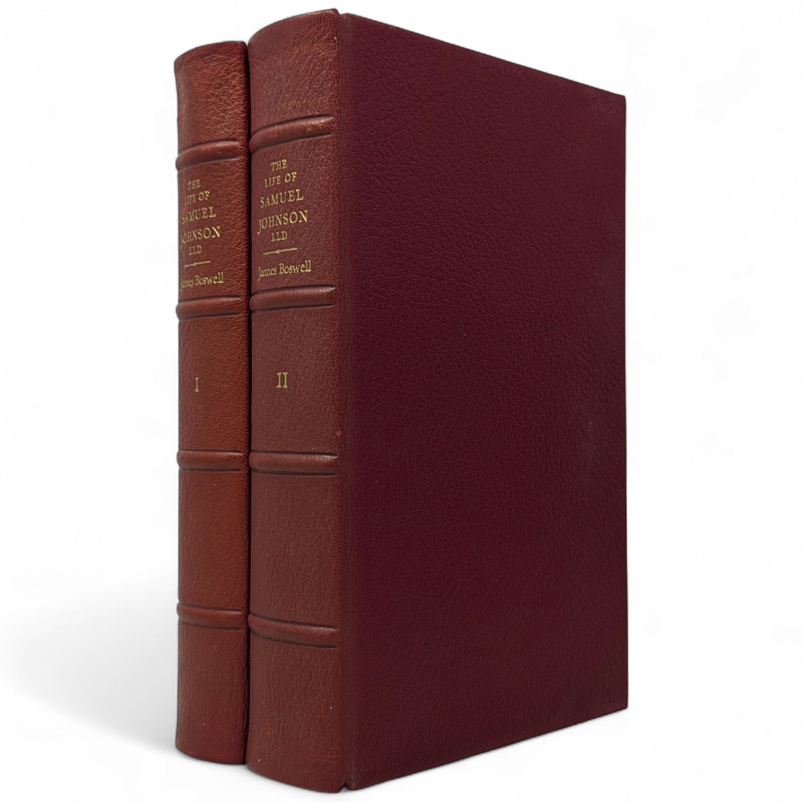 Edited by Rodney Shewan, volume one [–two]. 254 × 163 × 38–44 mm. 2 vols (pp. [1–7] 8–568: [16] leaves of gravure plates; [1–9] 10–682 [683–684]: [16] leaves of gravure plates). Type: Ehrhardt with Rosart capitals at chapter openings. Printed by Mackay, the gravures by D.H. Greaves. Bound by T C Woolnough & Son Ltd in full red goatskin leather titled in gold, with Cockerell marbled endleaves. Red buckram-covered two-volume slip case. The text follows the first edition of 1791, corrected according to Boswell’s Principal corrections and additions, published to accompany the second edition in 1793.