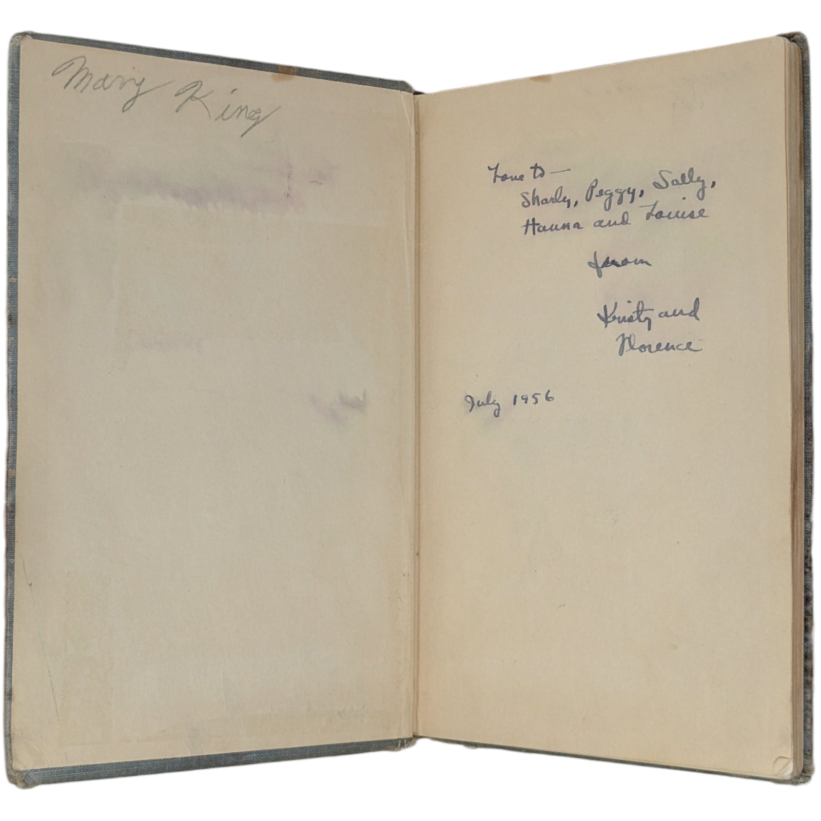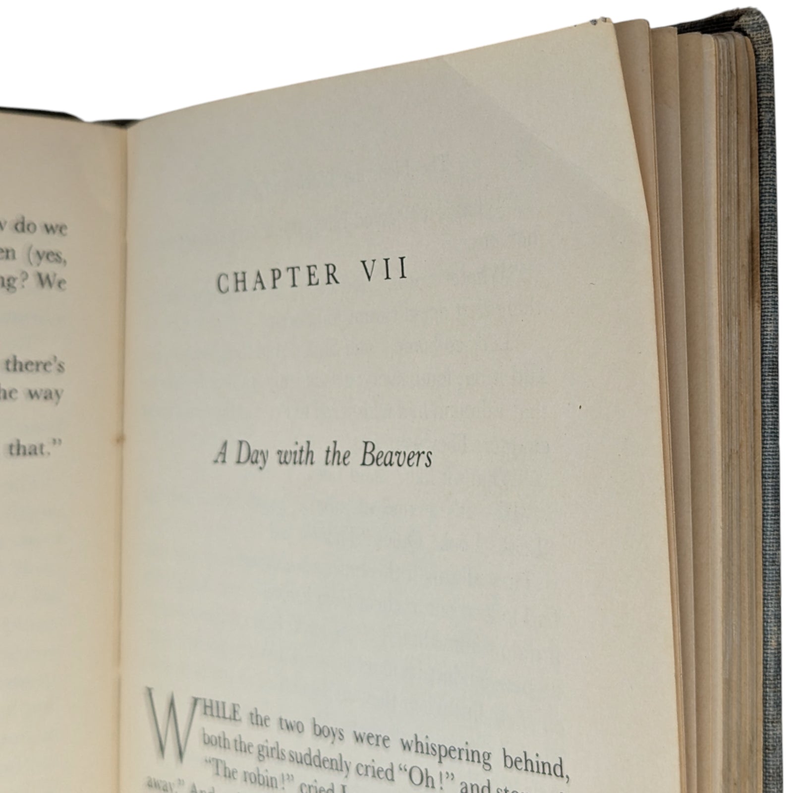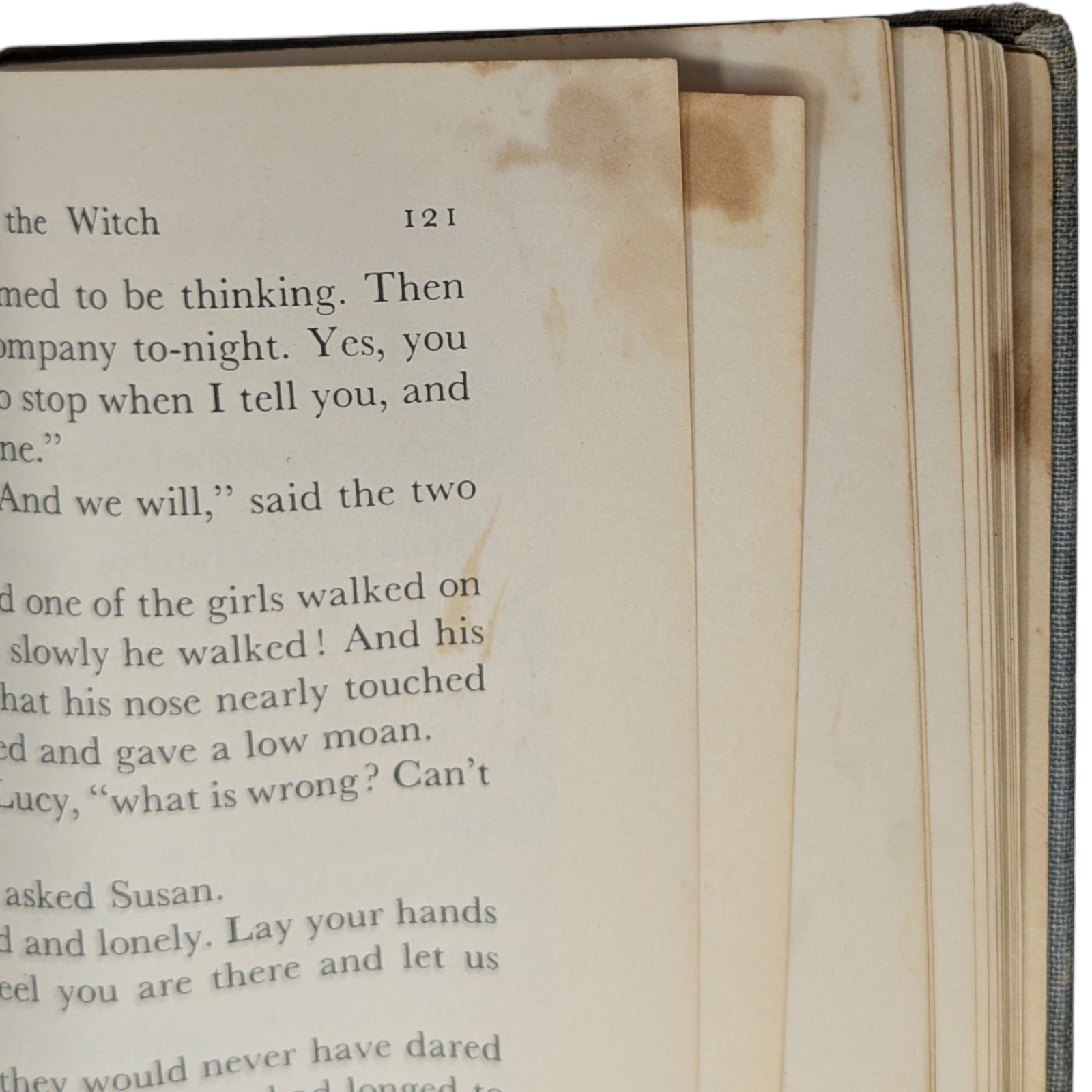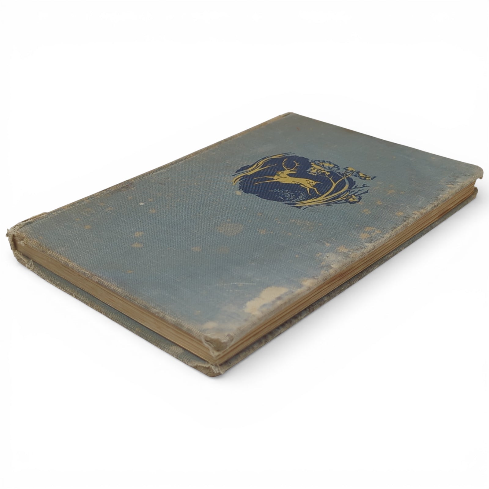 A very poor copy in dire need of restoration. The covers are heavily stained and worn, the corners and spine tips are bumped and heavily frayed, the cloth on the spine is partially detached and coming off, and the edges are foxed with a few stains. The front hinge holds well, but the rear one is completely broken to gutter with netting exposed, and there are a few further breaks to gutter throughout; no pages are coming off however. The front paste-down has a small inscription, while the front free endpaper has a contemporary 1956 dedication in pen. Throughout, there are are few marginal closed tears to a handful of pages, some ear marks, a few stains throughout (all faded and leaving text legible); worst culprits shown in the listing. With the exception of the half-title (unsure if this is as called for, or just missing in this particular copy), the book is collated as complete with all pages and illustrations present, and with none of the illustrations coloured in. An OK reading copy, but in dire need of restoration.