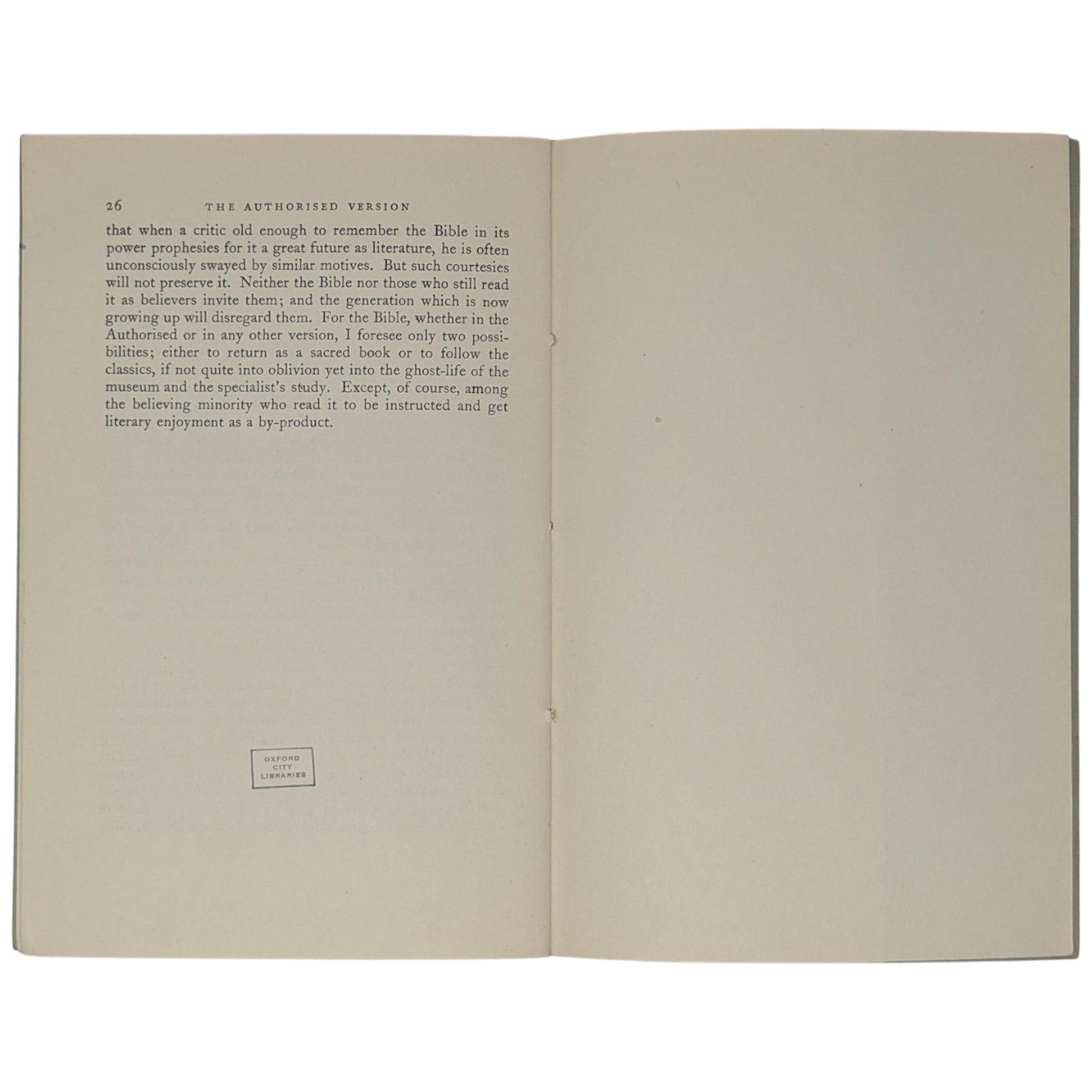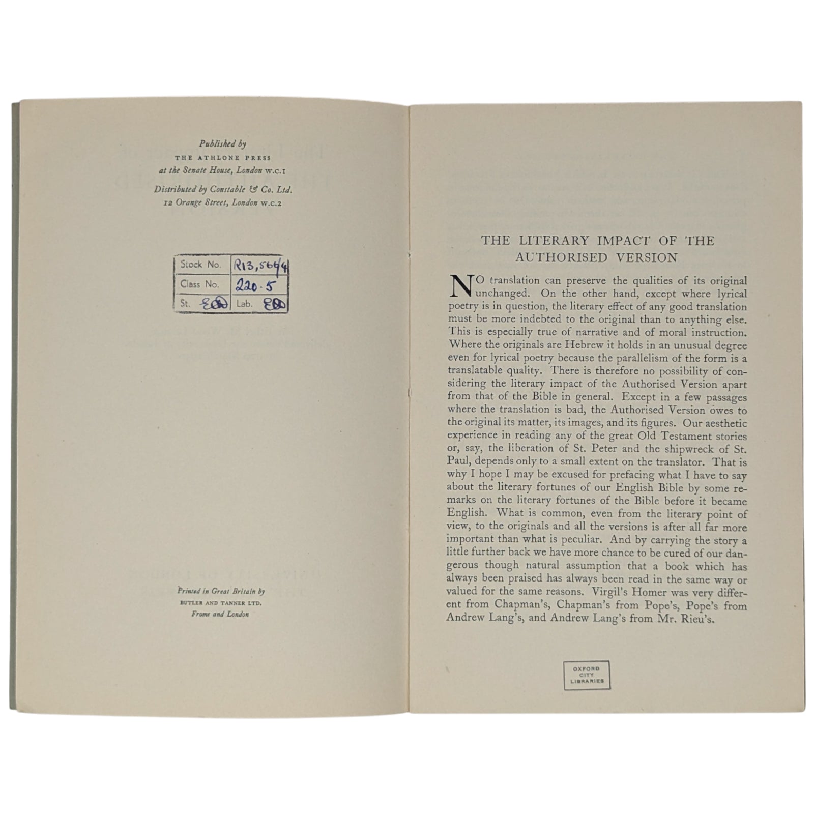 LEWIS, C. S. The Literary Impact of the Authorised Version. University of London: The Athlone Press, 1950. First edition, first printing of the author's Ethel M. Wood Lecture delivered before the University of London on 20 March 1950.