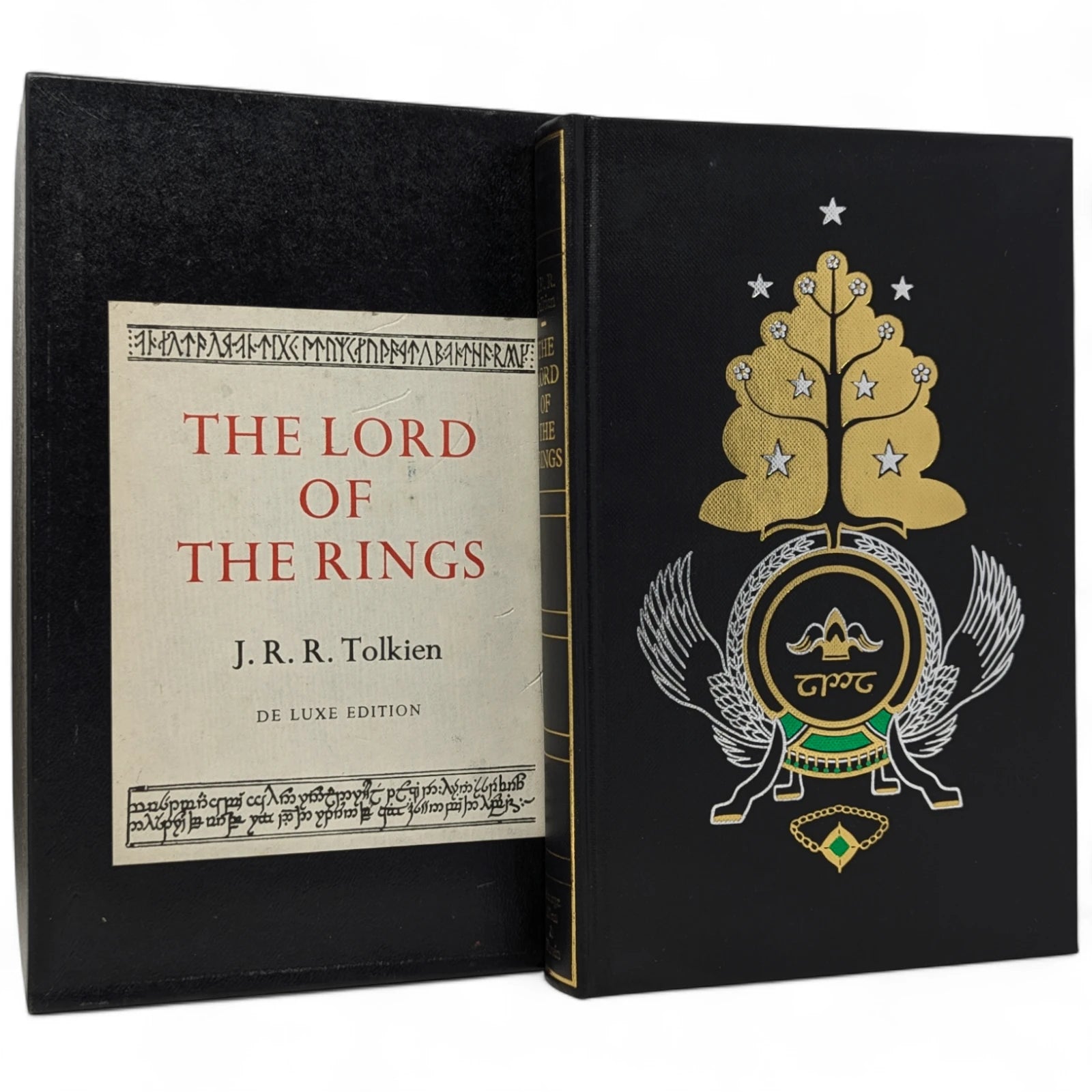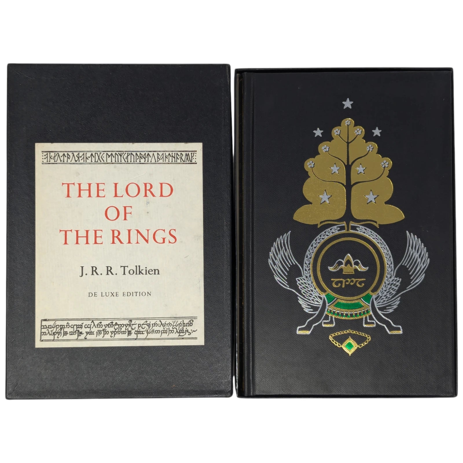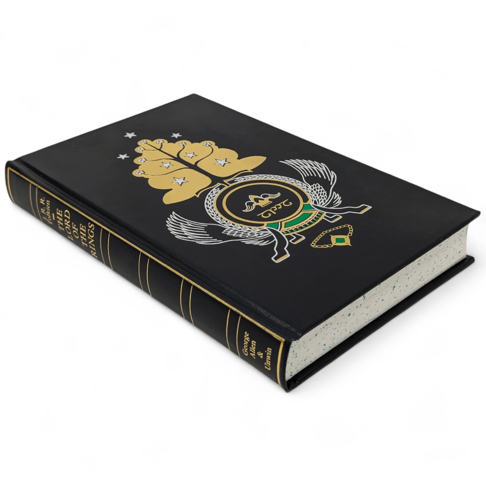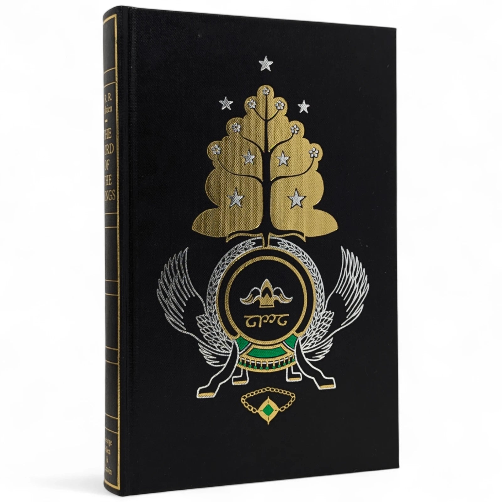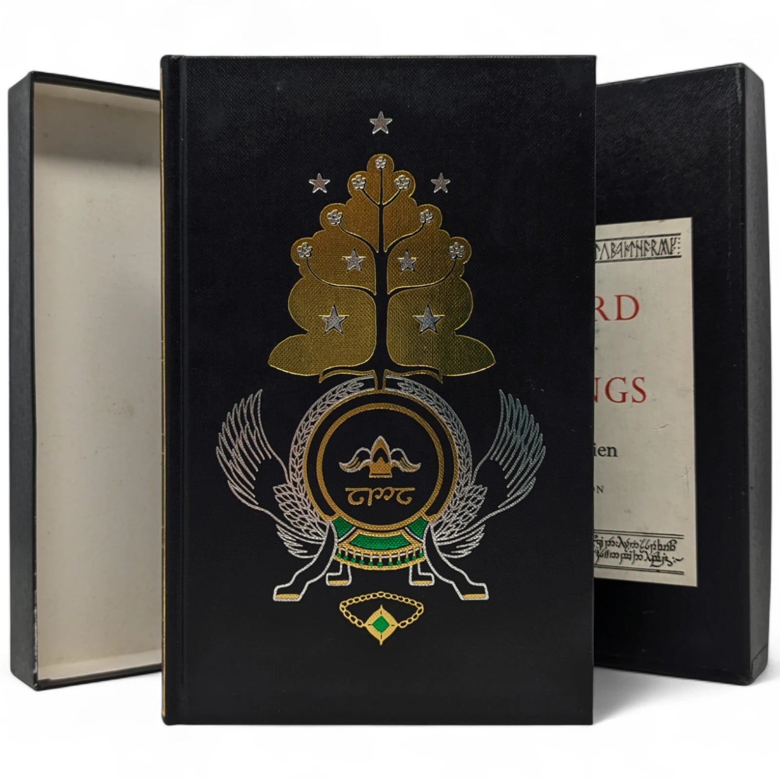 The Lord of the Rings by J. R. R. Tolkien. London: George Allen and Unwin, [1969]. Eight impression, [1982]. Octavo. Publisher’s black cloth, gilt lettering and rulling to the spine, illustrated on front cover by Tolkien, depicting a Numenorean throne, with “Elendil” set in Tengwar to the centre, in gilt, silver and green, all edges speckled. Housed in the original publisher’s tray case with label with titles to front.