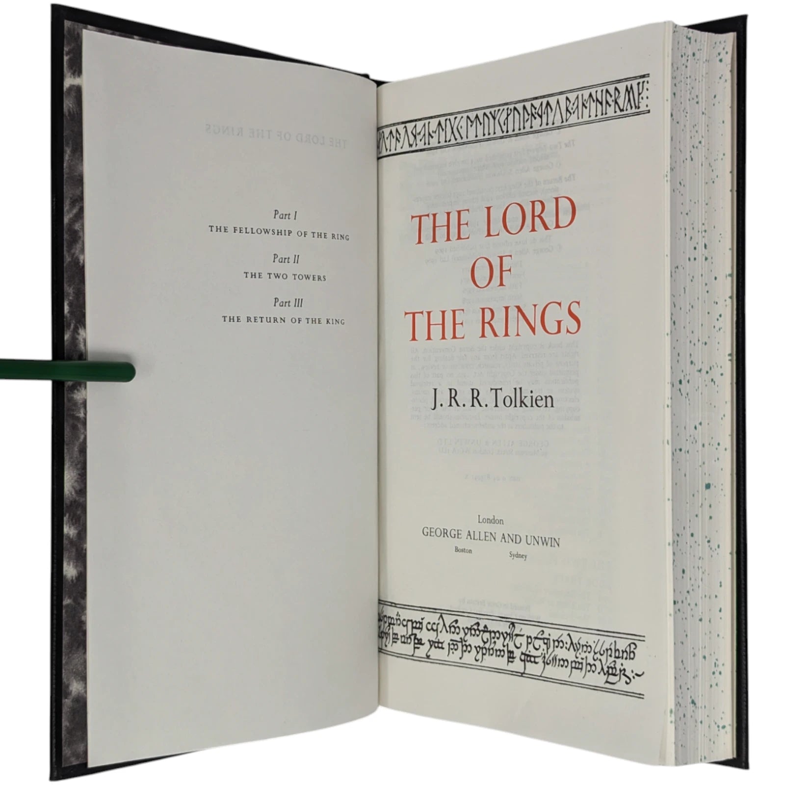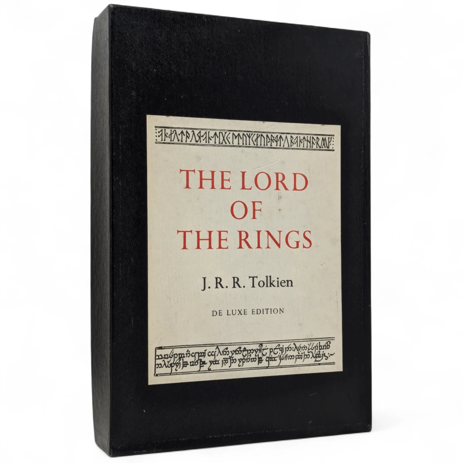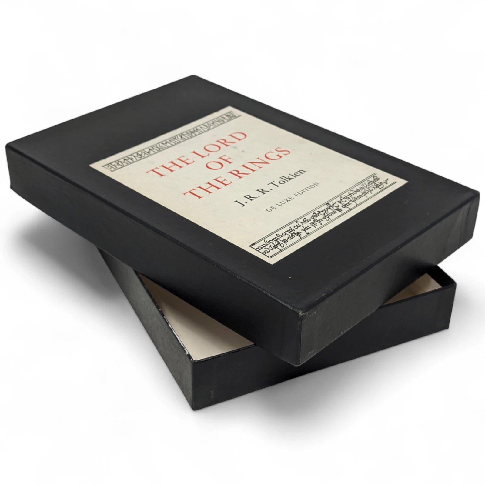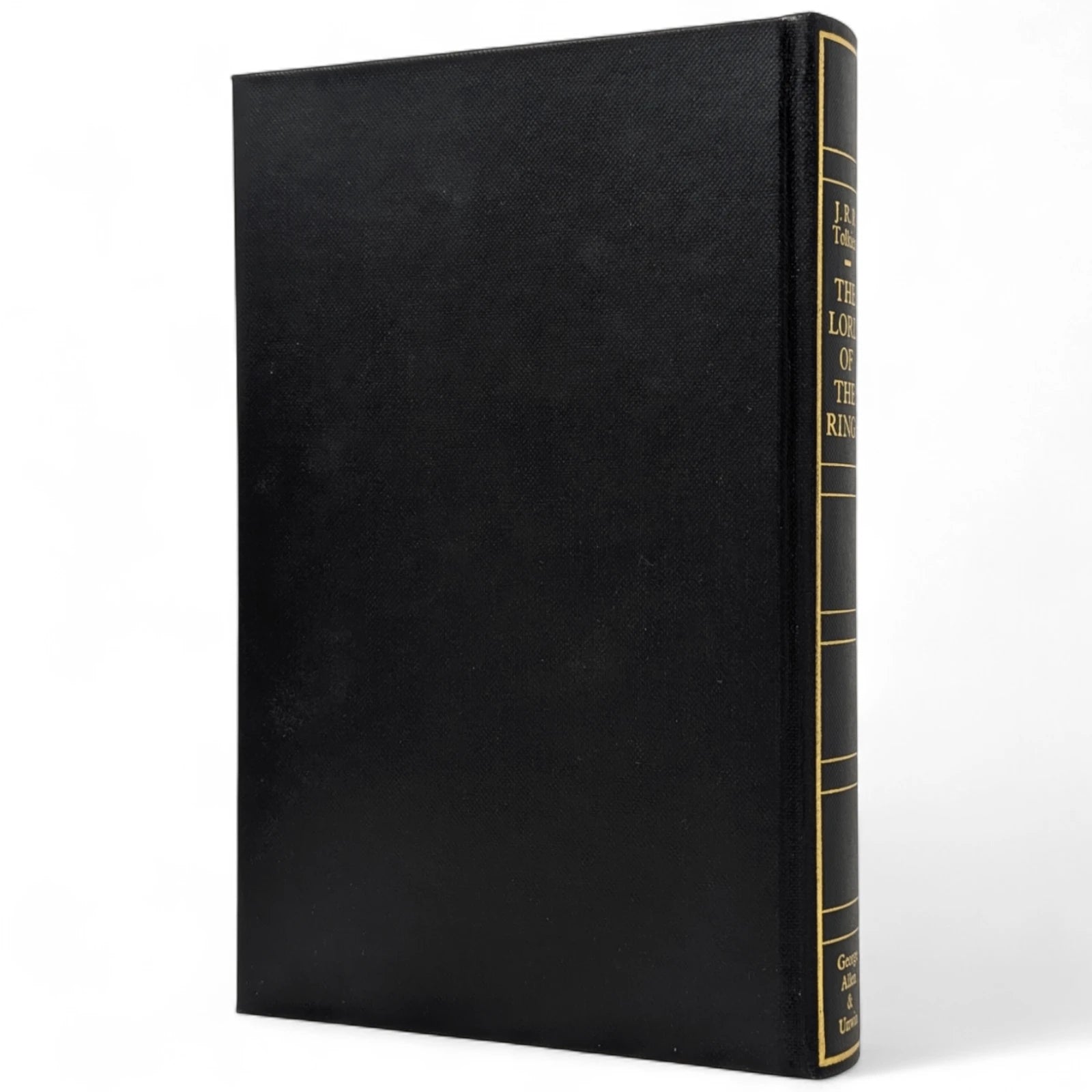 The Lord of the Rings by J. R. R. Tolkien. London: George Allen and Unwin, [1969]. Eight impression, [1982]. Octavo. Publisher’s black cloth, gilt lettering and rulling to the spine, illustrated on front cover by Tolkien, depicting a Numenorean throne, with “Elendil” set in Tengwar to the centre, in gilt, silver and green, all edges speckled. Housed in the original publisher’s tray case with label with titles to front.