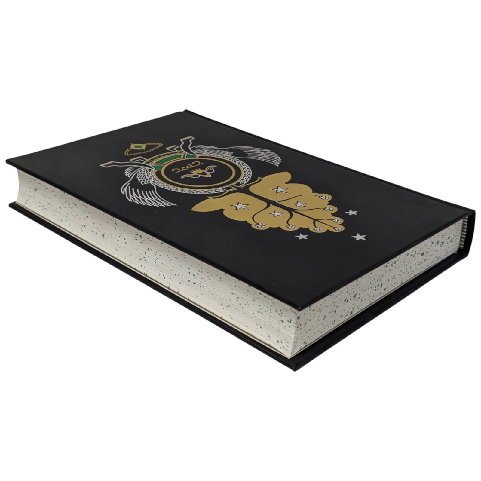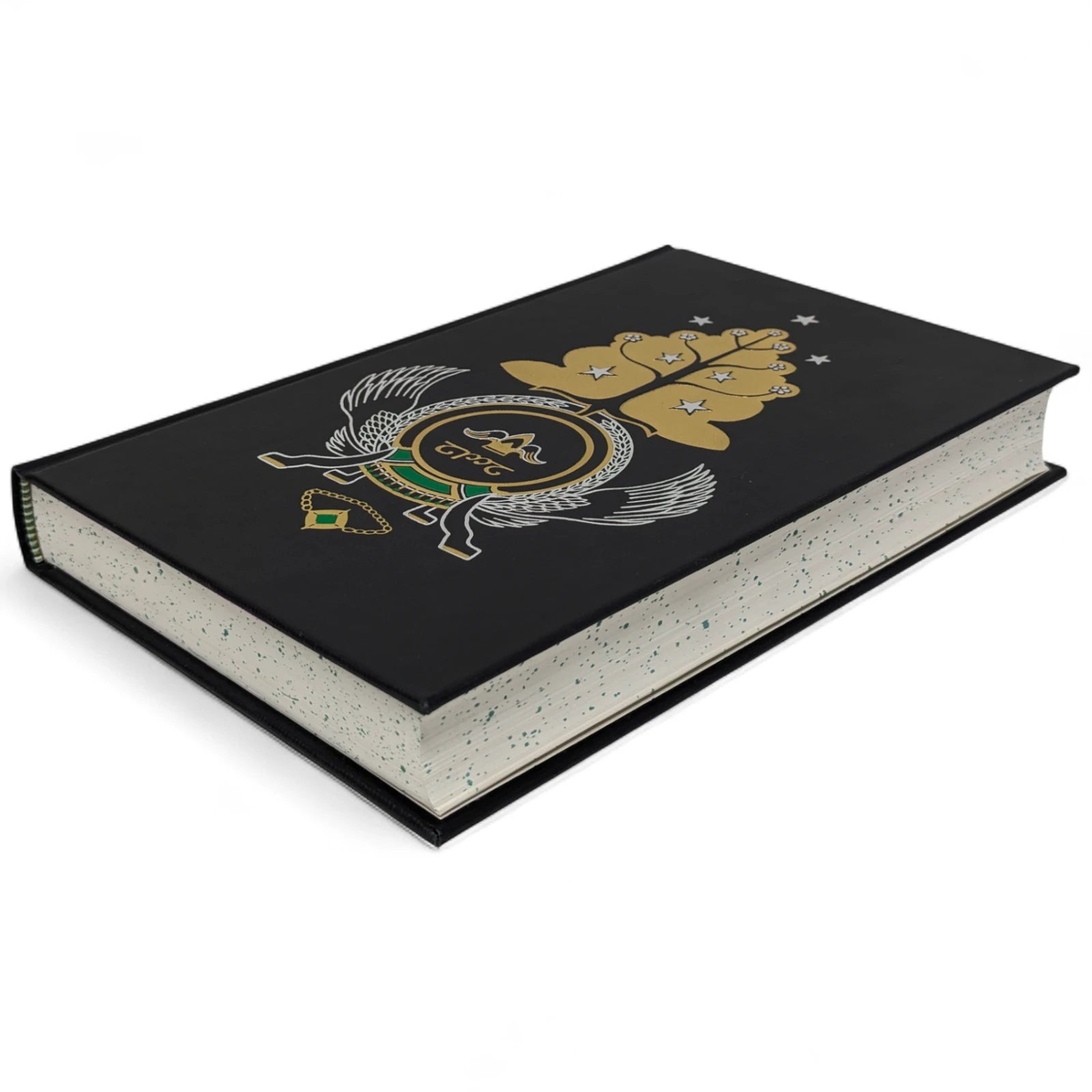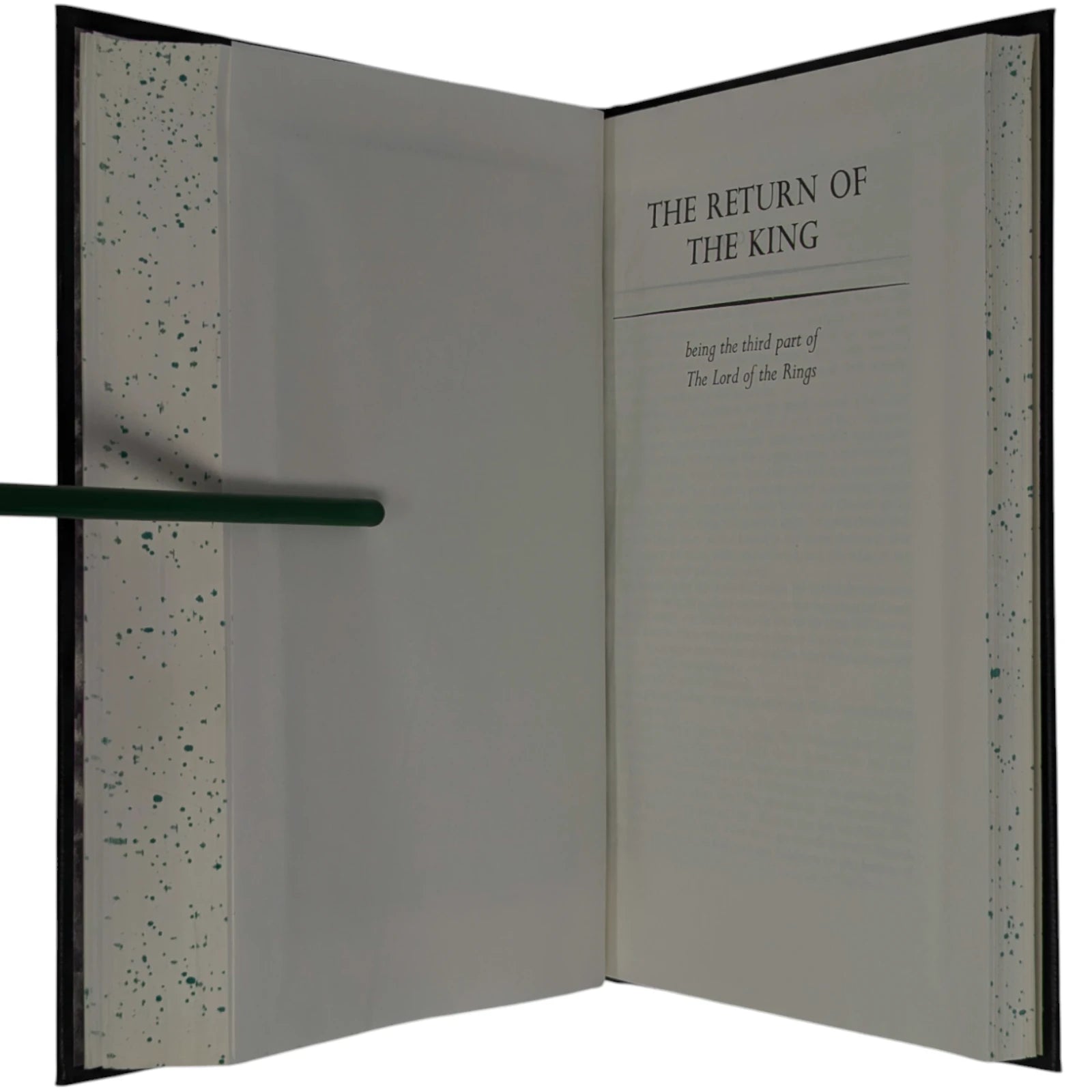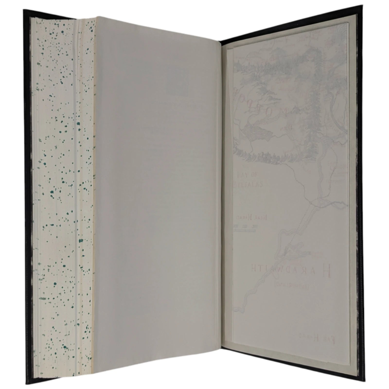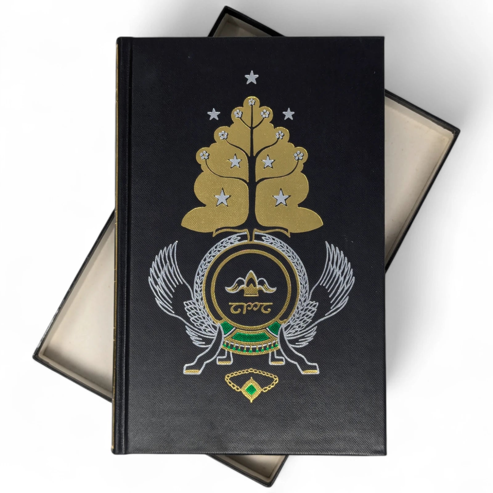 The Lord of the Rings by J. R. R. Tolkien. London: George Allen and Unwin, [1969]. Eight impression, [1982]. Octavo. Publisher’s black cloth, gilt lettering and rulling to the spine, illustrated on front cover by Tolkien, depicting a Numenorean throne, with “Elendil” set in Tengwar to the centre, in gilt, silver and green, all edges speckled. Housed in the original publisher’s tray case with label with titles to front.
