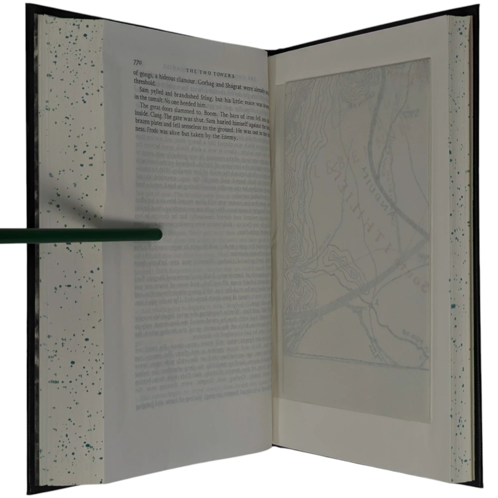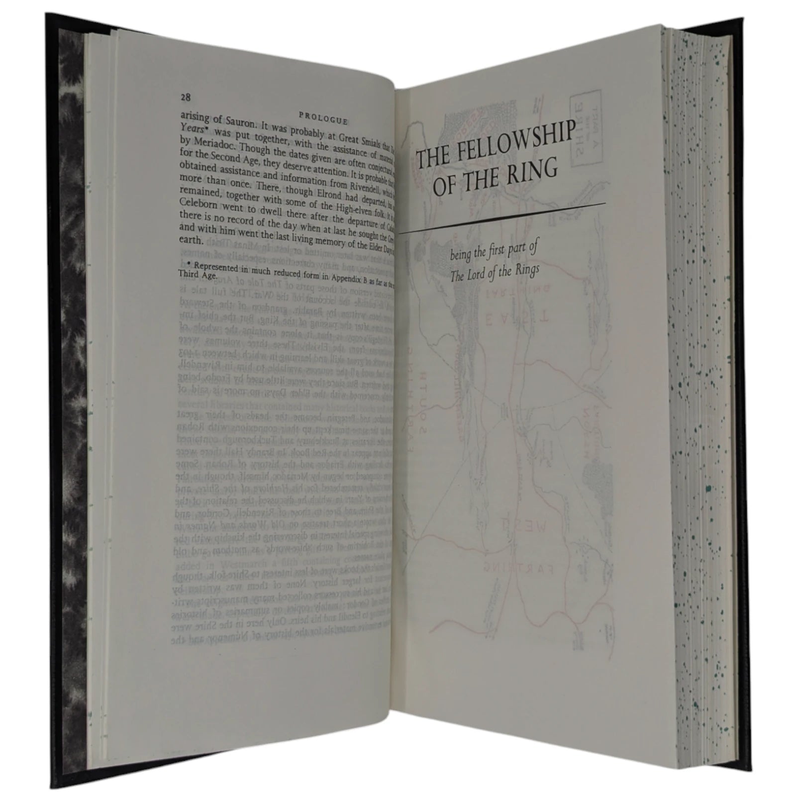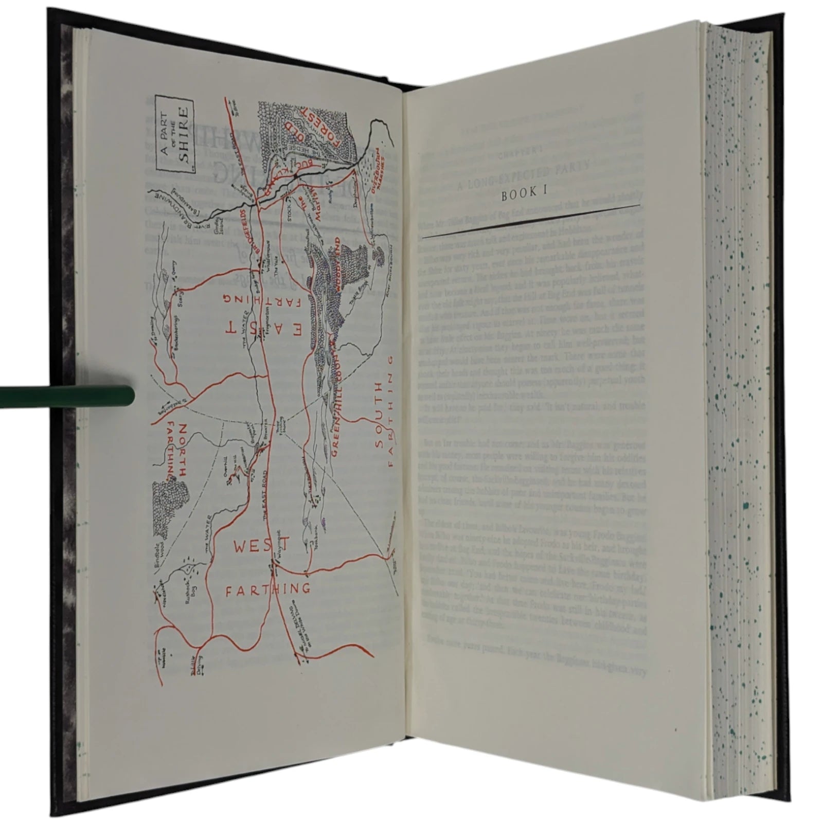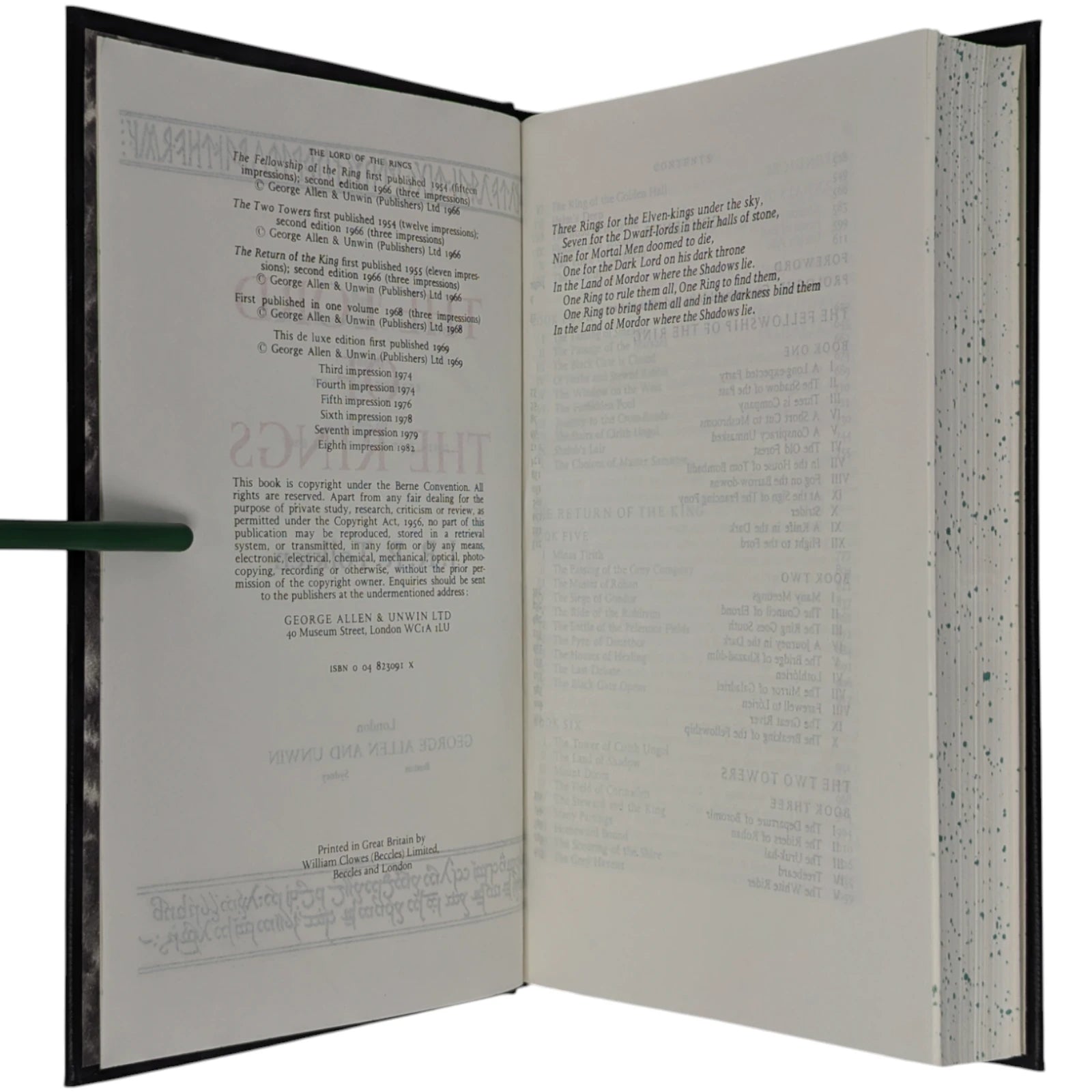 The eight impression of this De Luxe edition, printed on India Paper and containing 'The Fellowship of the Ring', 'The Two Towers' and 'The Return of the King', all bound into one single one-inch-thick volume. With maps.