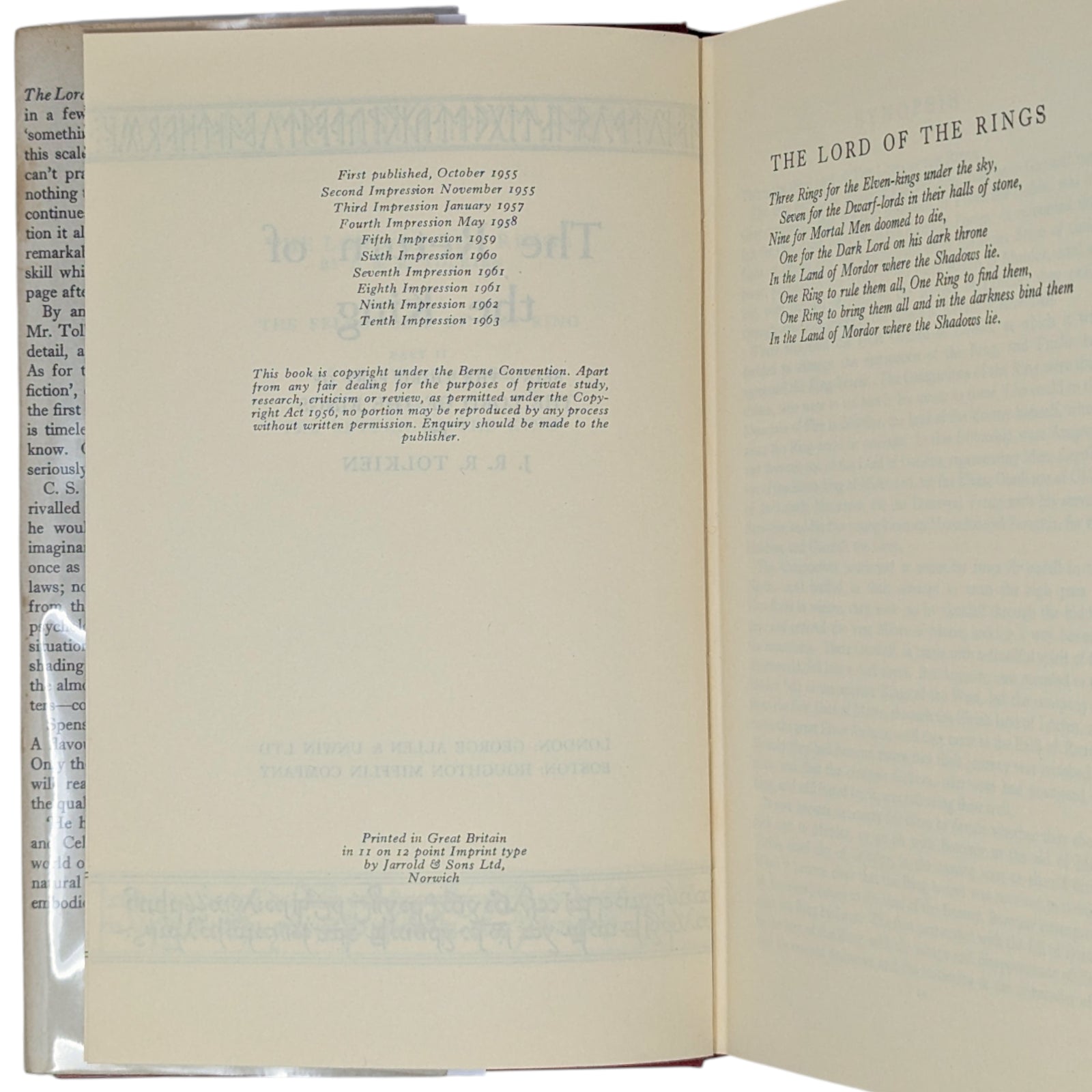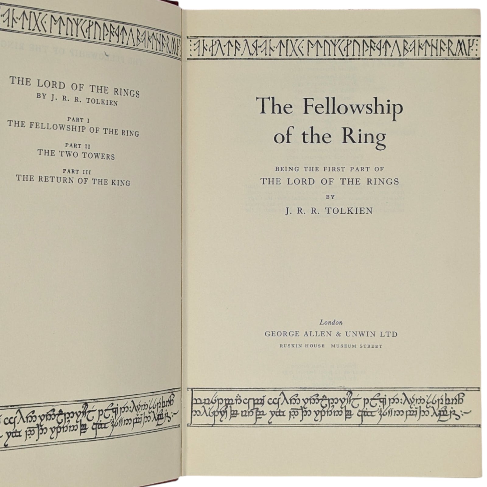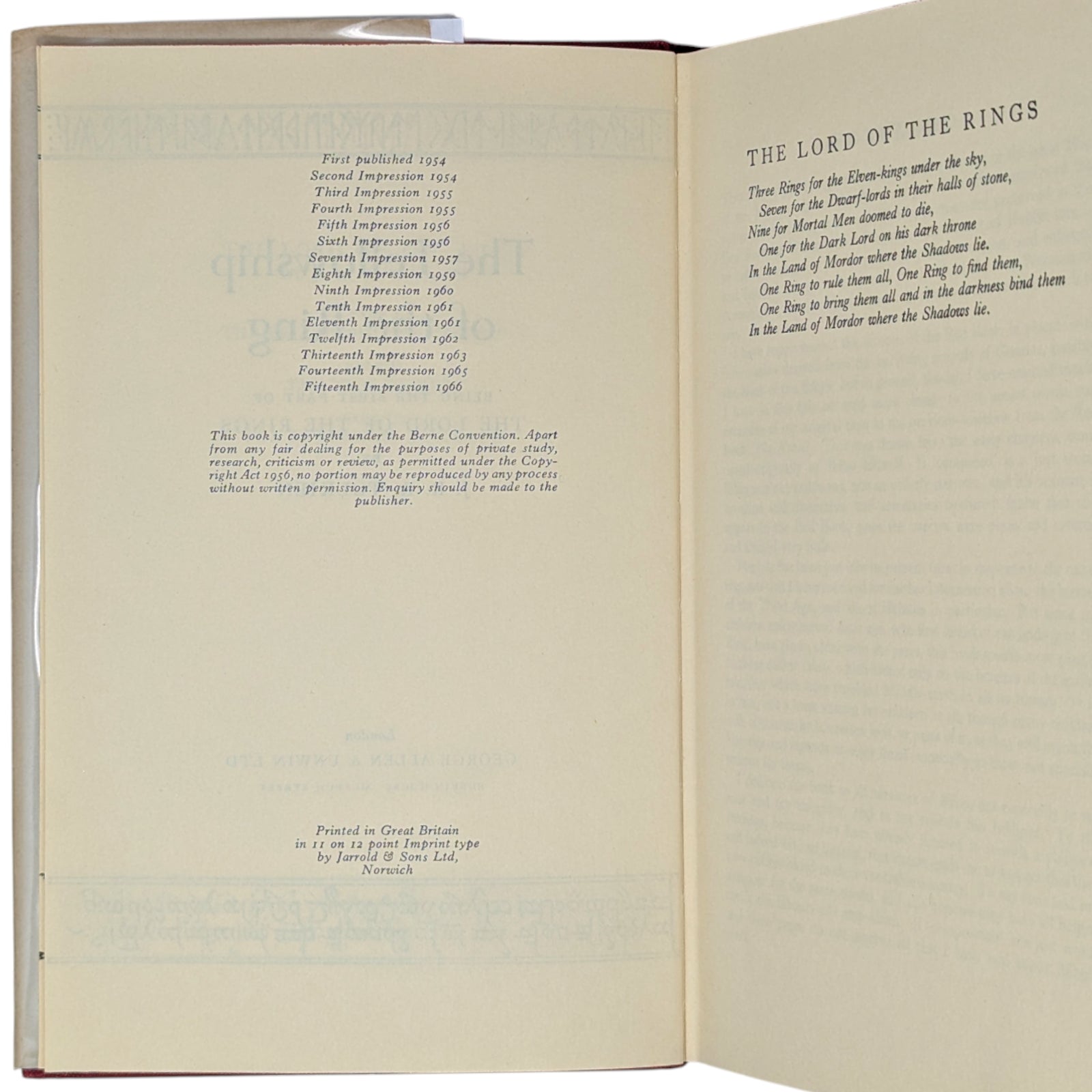 - The Fellowship of the Ring (15th impression, 1966, in correct dustwrapper). The book itself is externally in very clean condition with very bright gilt lettering. Spine tips and corners are bumped, there is some foxing and grubby thumbmarks to the closed text block, and the binding is heavily cocked. Binding itself is firm (although the book has the give of a read one). There are a few ear marks throughout and the tiniest nick to bottom of page 423. The unclipped dust wrapper is tanned to spine and (unevenly) to rear panel, with a few small stains and thumbmarks throughout, nibbled slightly to extremities with a little loss to spine tips and a few small marginal tears.