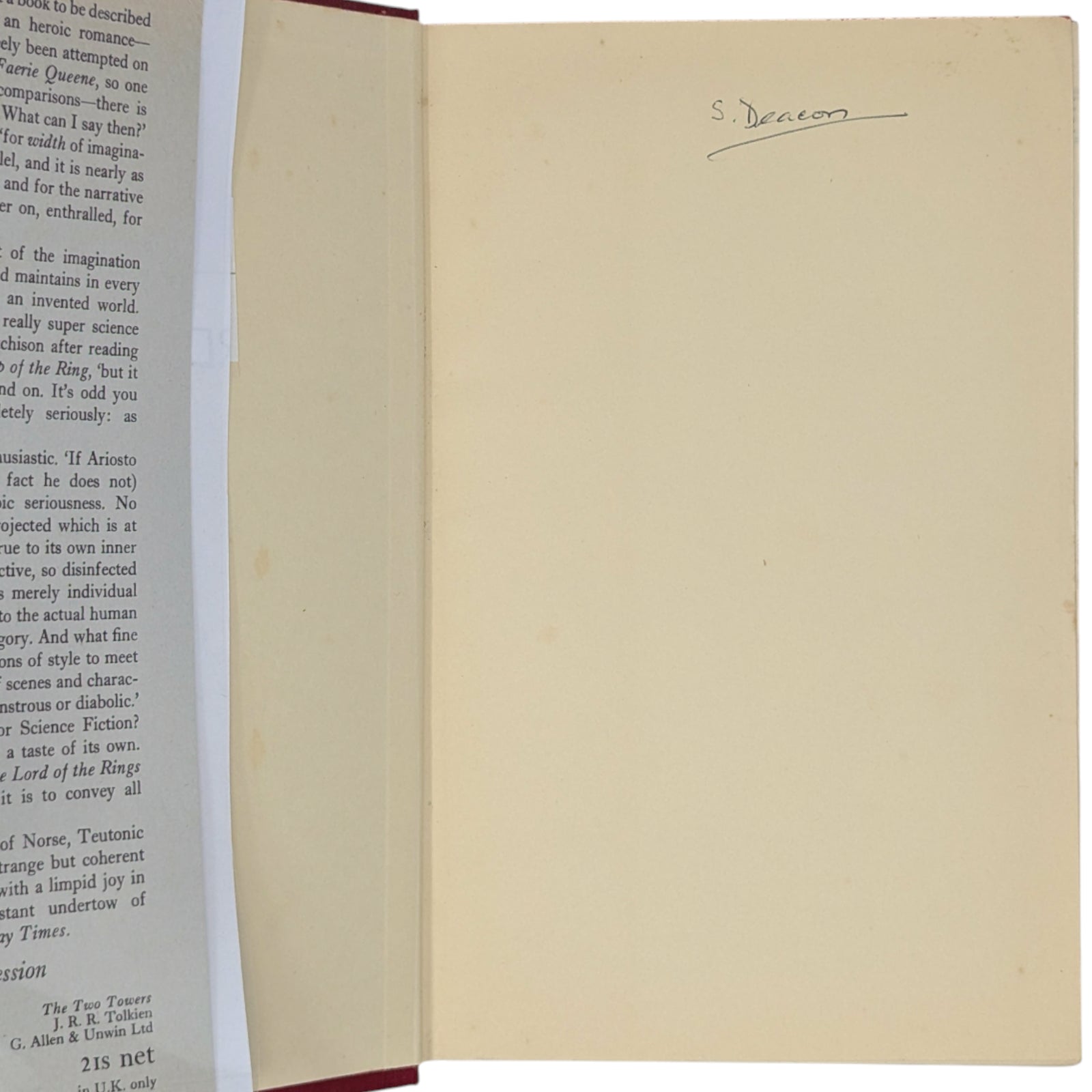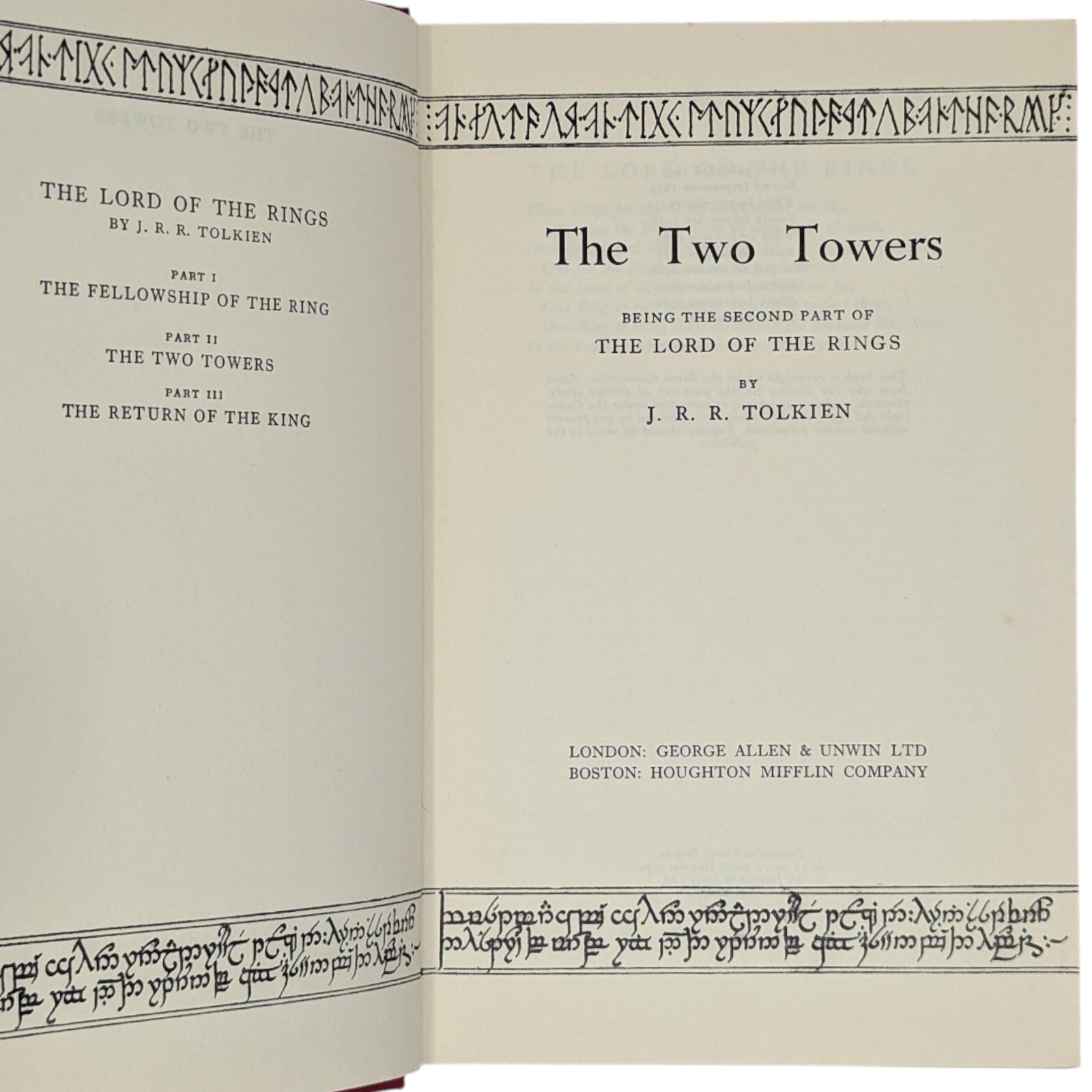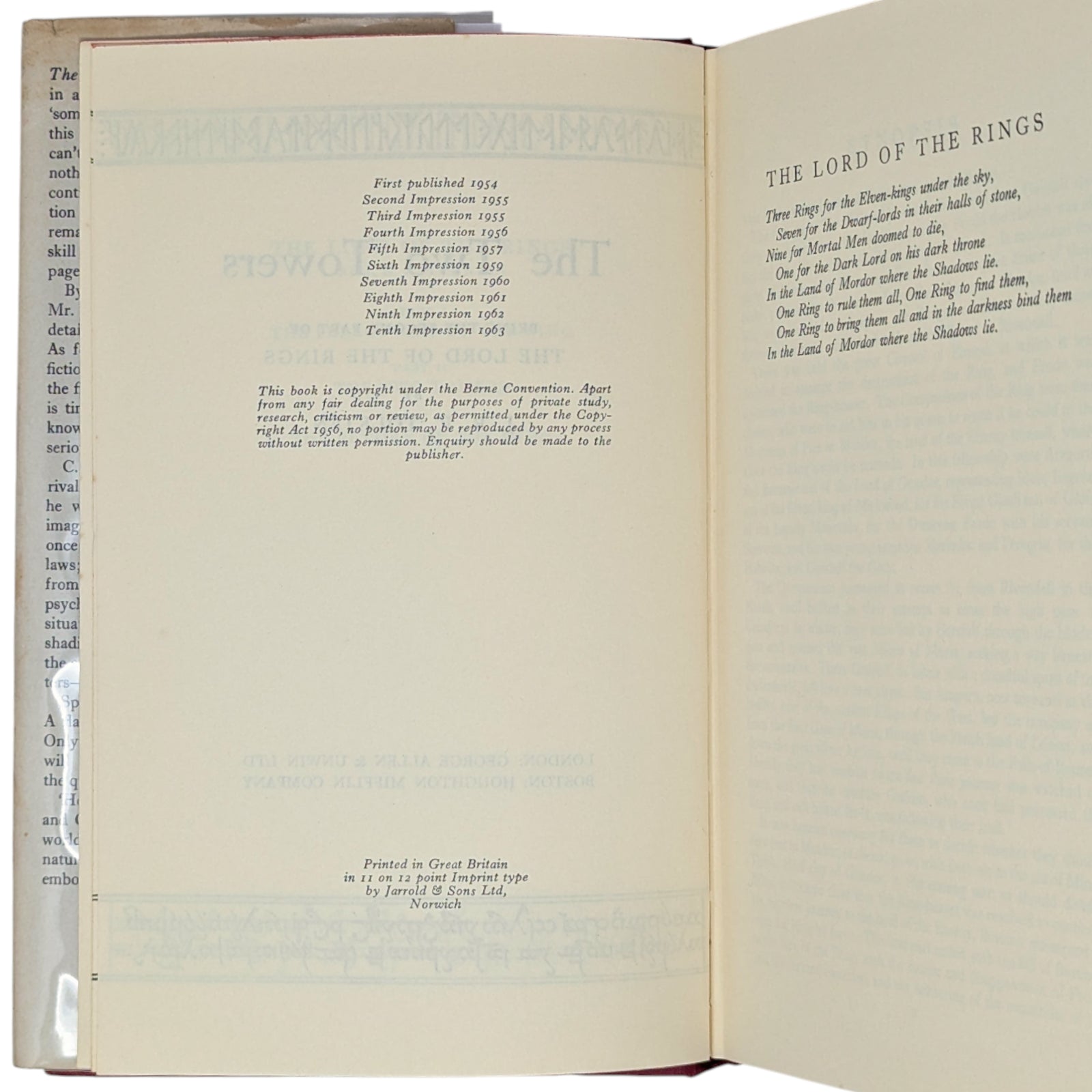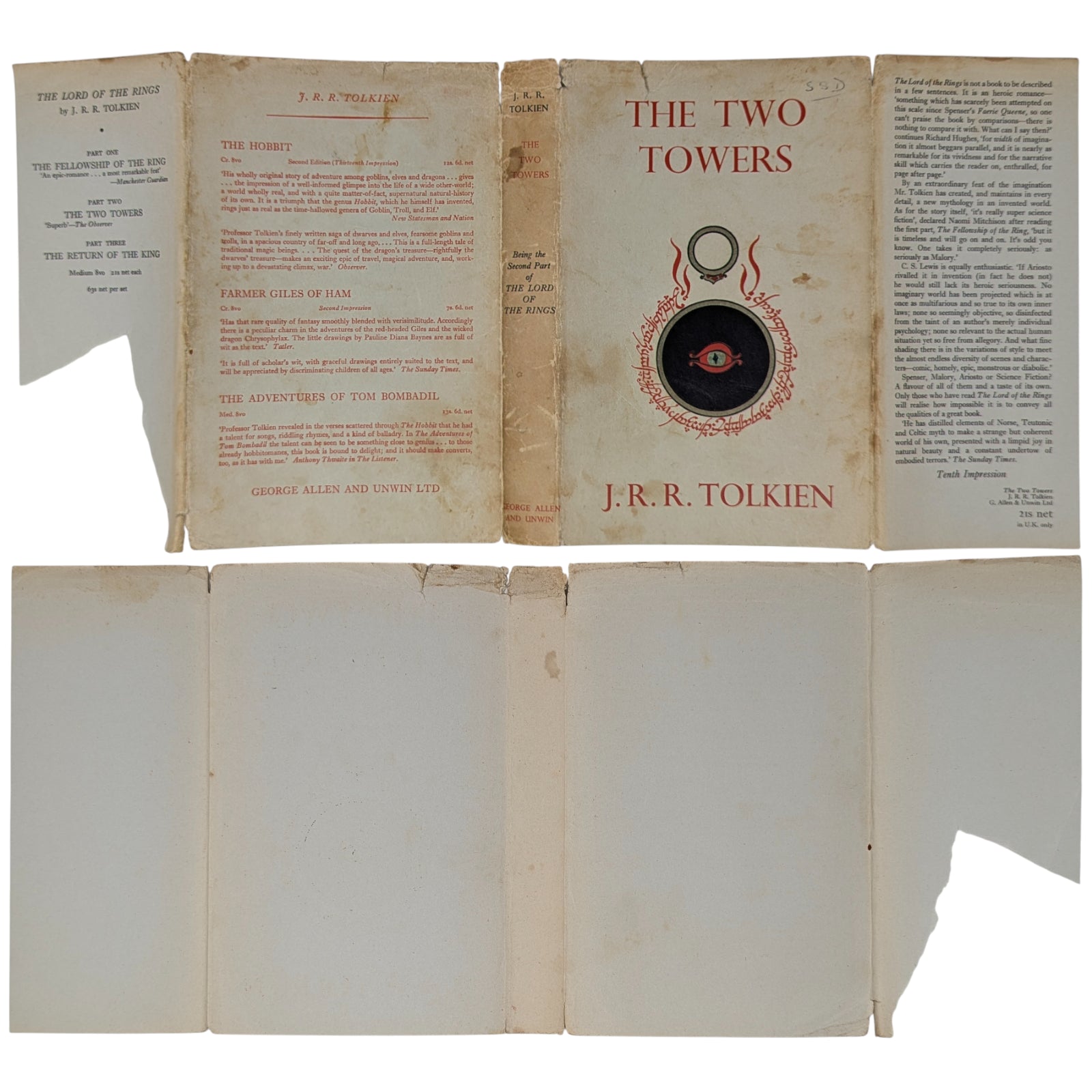 - The Two Towers (10th impression, 1963, in correct dustwrapper). The book itself is externally in overall clean condition with very bright gilt lettering and only one small dot mark to rear cover. Spine tips and corners are bumped, there is heavier foxing and some marking to the closed text block, and the binding is heavily cocked. Binding itself is firm (although the book has the give of a read one). There is some marginal foxing throughout and a small inscription penned to FFEP. The unclipped dust wrapper is tanned to spine and joints, with staining and foxing to panels, a large (just under half) portion missing from the rear flap, many nibbles and small closed tears to extremities, small initials penned to front panel near title, and a little marginal loss; fair only.