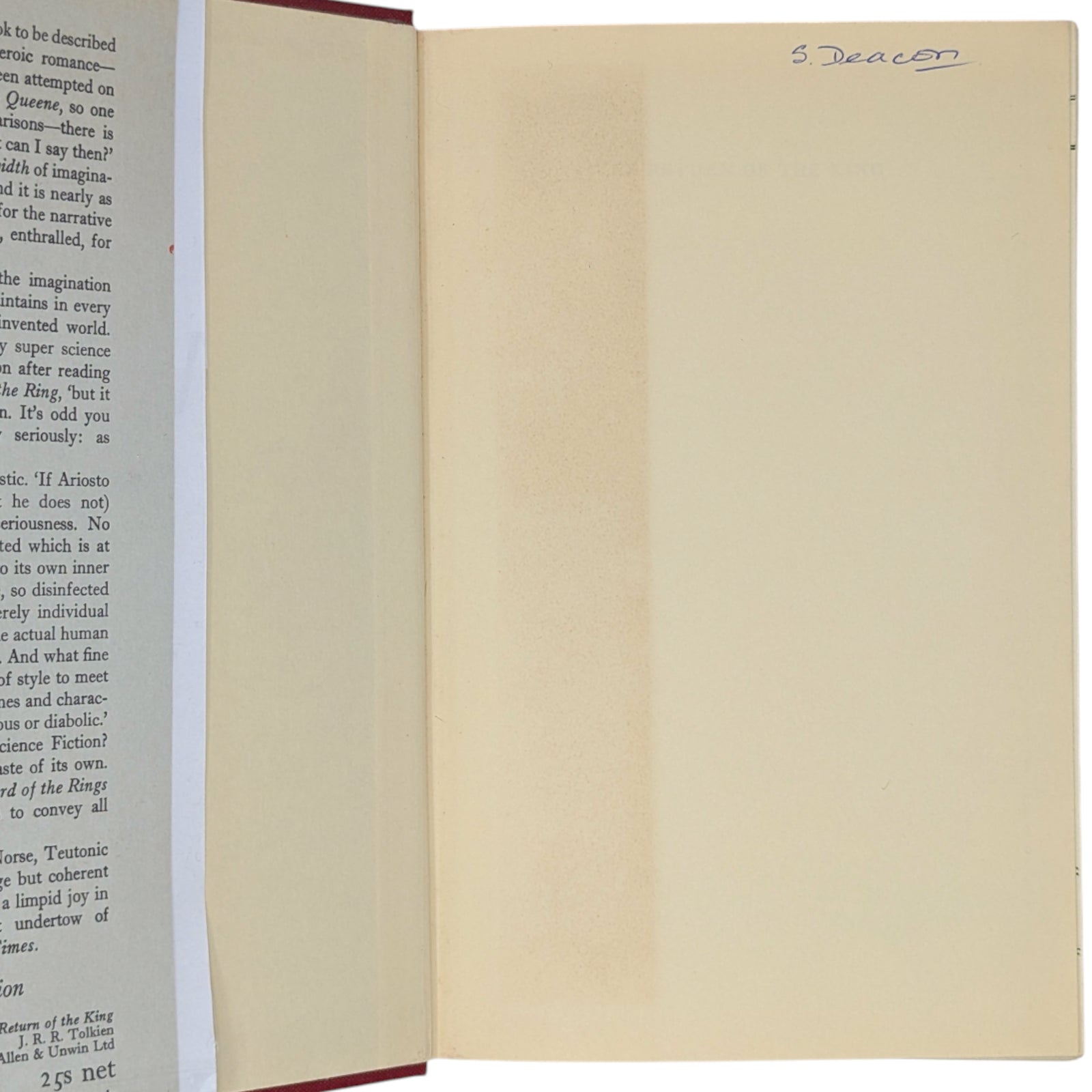 - The Return of the King (10th impression, 1963, in 11th impression dustwrapper). The book itself is externally in very clean condition with very bright gilt lettering and a few areas of light discolouration. Spine tips and corners are bumped, there is some foxing and staining to the closed text block, and the binding is heavily cocked. Binding itself is firm (although the book has the give of a read one). There is a shallow earmark and a small smudge to page 172, as well as an inscription in pen to FFEP and some marginal foxing throughout. The unclipped dust wrapper is tanned to spine and joints, with staining and foxing to panels, about an inch-sized piece at the head of the spine barely attached to the spine (now held securely in place by a removable archival wrapper), many nibbles and small closed tears to extremities and a little marginal loss; fair only.