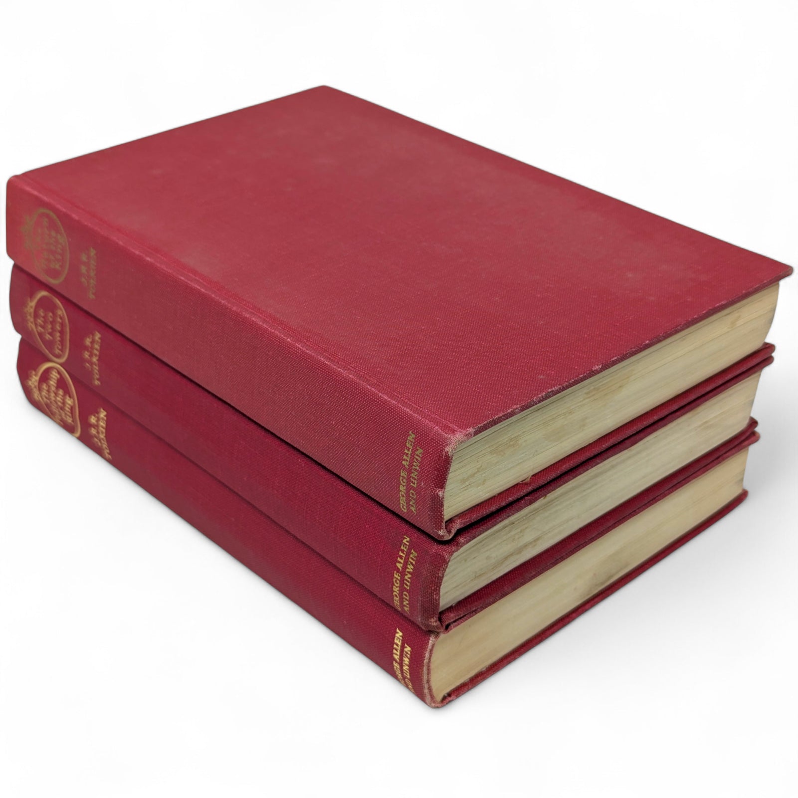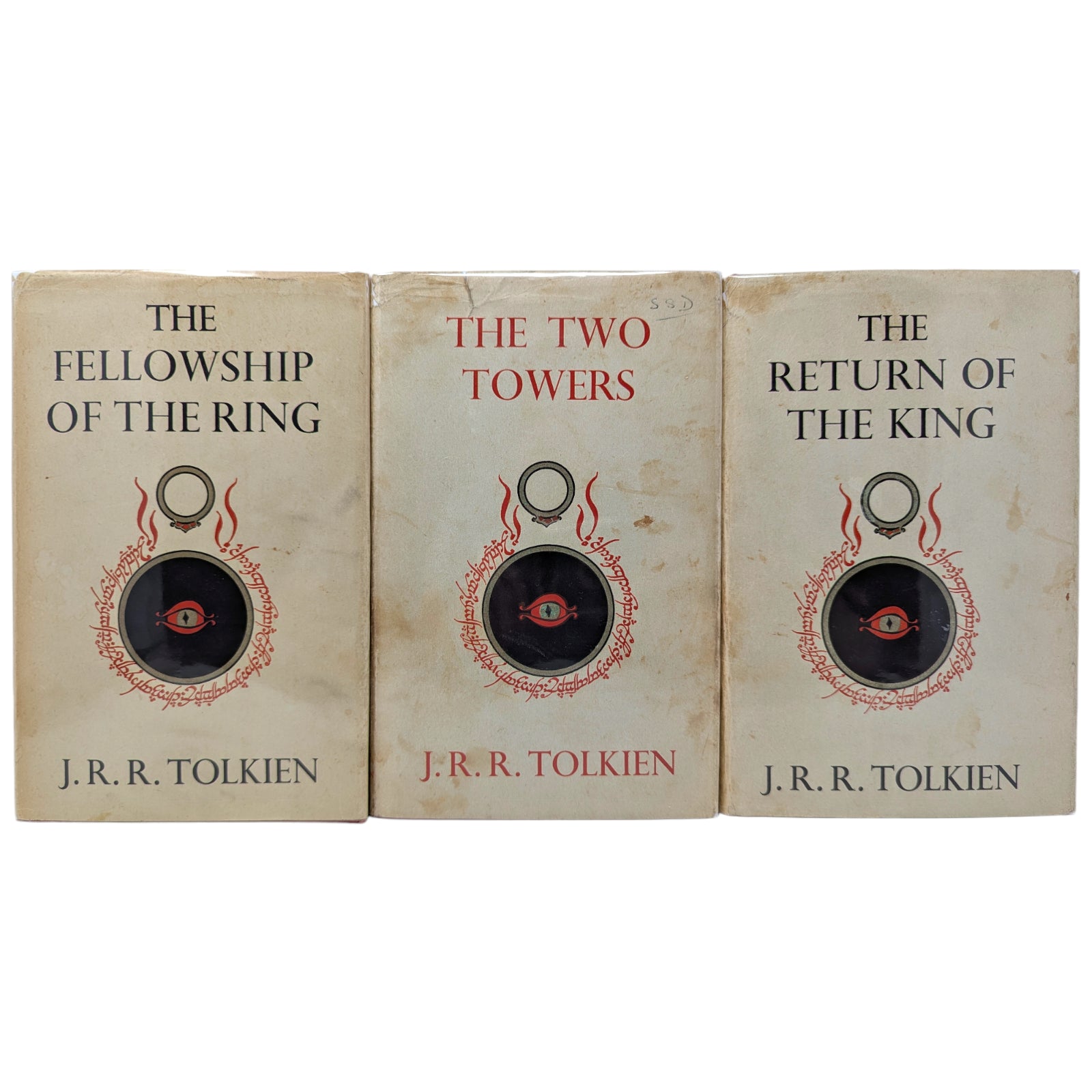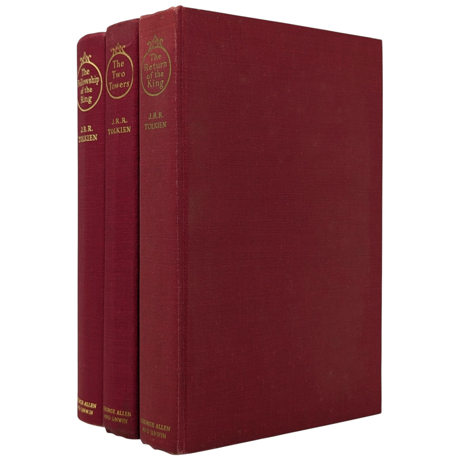 London: George Allen & Unwin. First editions, impressions 15th, 10th and 10th respectively, printed in 1966, 1966 and 1963 respectively. Complete in three volumes. Octavo (23 x 15 x 10cm), pp.423 [1]; pp.352; pp.416. With a folding map at the rear of each volume. Publisher's dark red cloth, title and decorative ring stamped on spine in gilt, plain endpapers, edges trimmed, top edge stained red, fore- and bottom edges unstained. With the grey wove paper dust wrappers (11th impression wrapper for 'The Two Towers' instead of 10th), lettered to front and spine and with the "Ring and Eye" device in black, red and gold, unclipped, priced at 25s, 21s and 25s net respectively.