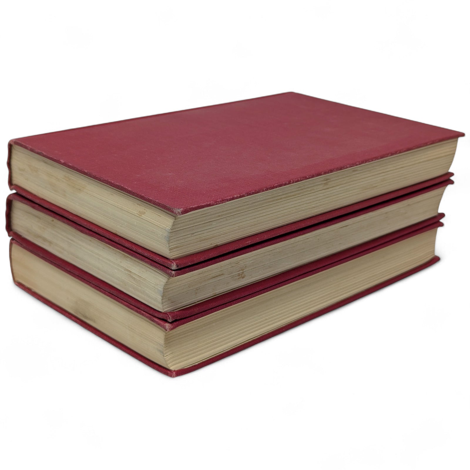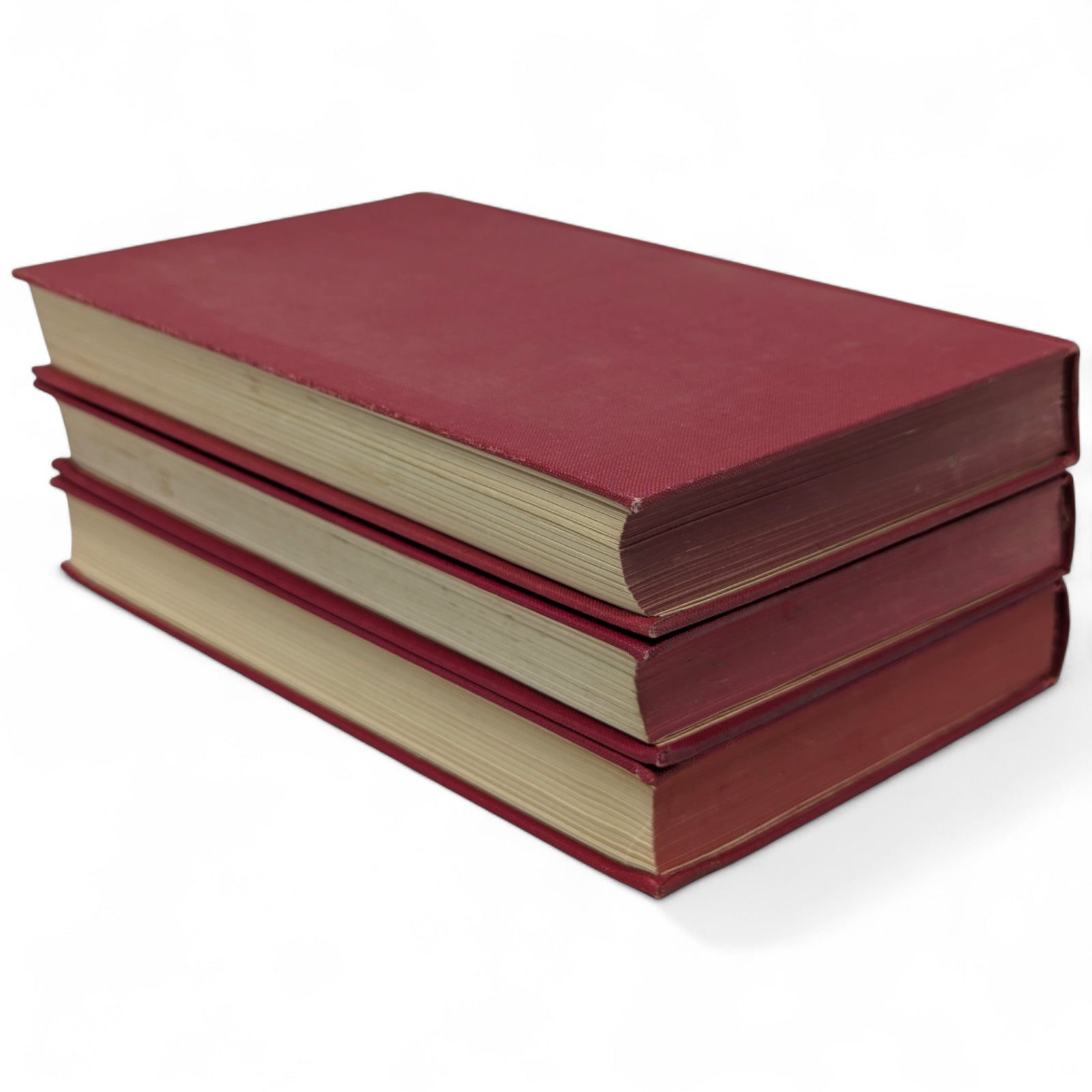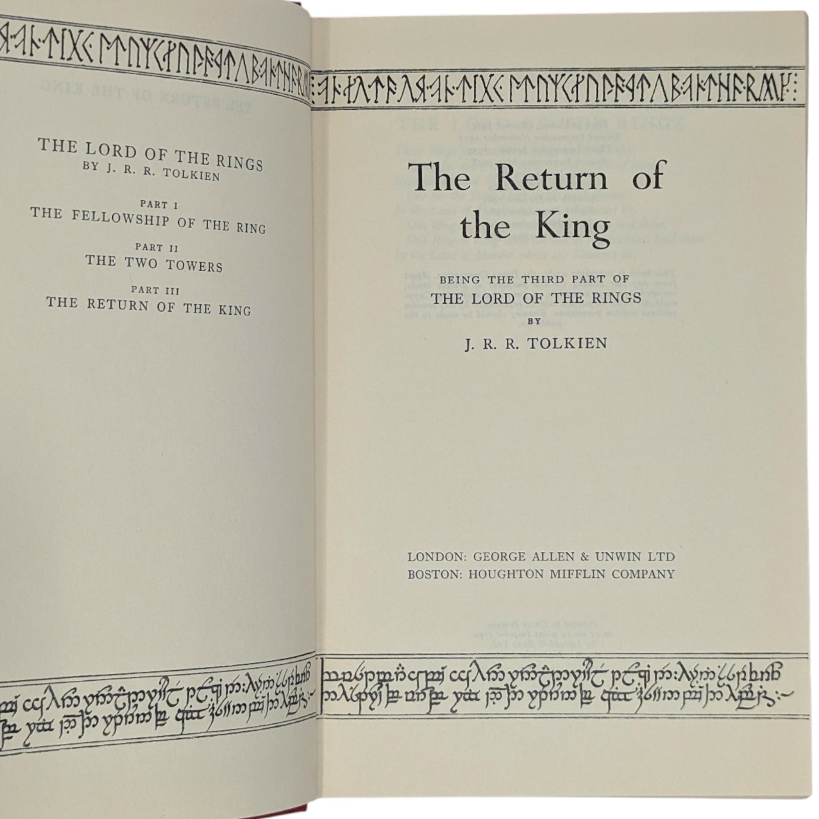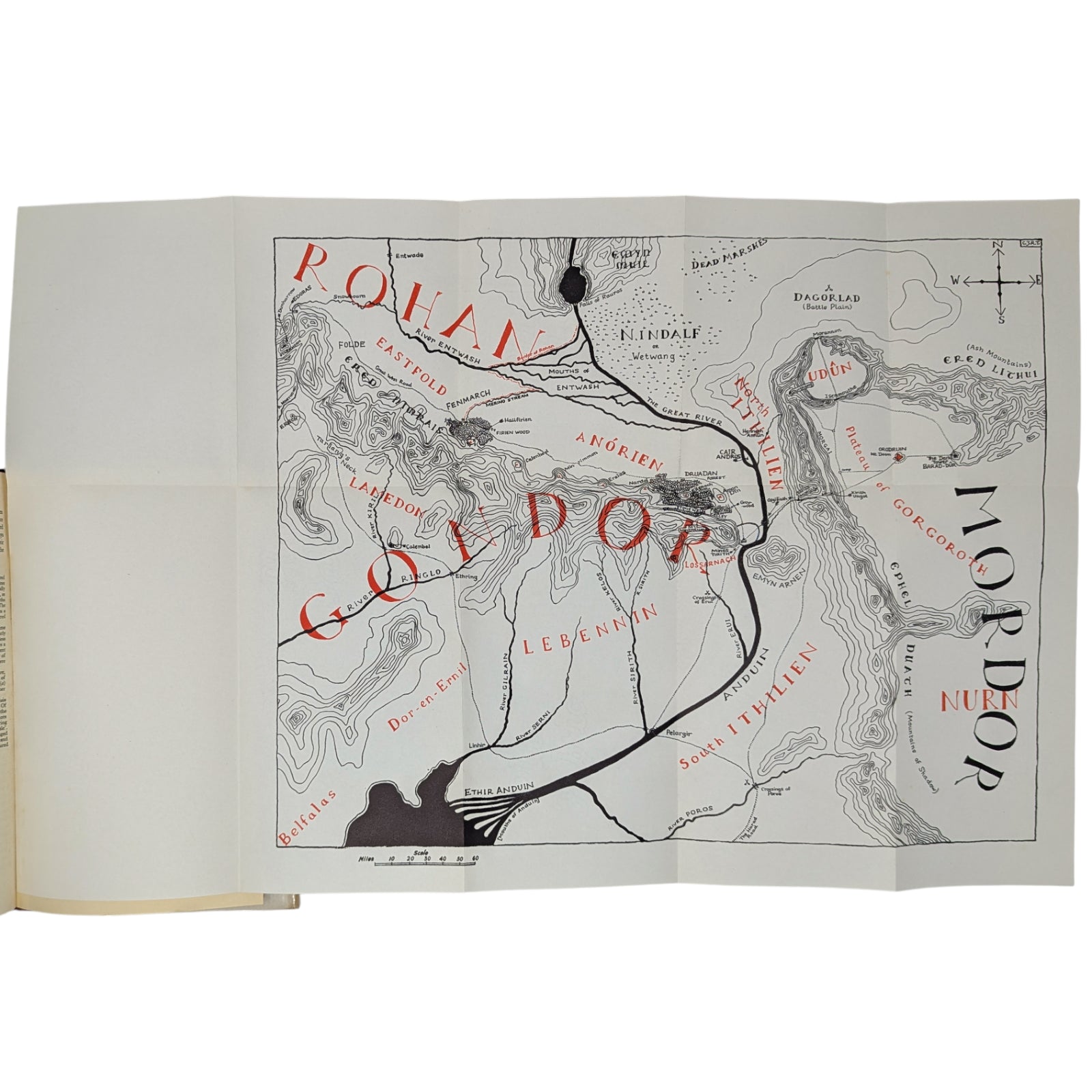 London: George Allen & Unwin. First editions, impressions 15th, 10th and 10th respectively, printed in 1966, 1966 and 1963 respectively. Complete in three volumes. Octavo (23 x 15 x 10cm), pp.423 [1]; pp.352; pp.416. With a folding map at the rear of each volume. Publisher's dark red cloth, title and decorative ring stamped on spine in gilt, plain endpapers, edges trimmed, top edge stained red, fore- and bottom edges unstained. With the grey wove paper dust wrappers (11th impression wrapper for 'The Two Towers' instead of 10th), lettered to front and spine and with the "Ring and Eye" device in black, red and gold, unclipped, priced at 25s, 21s and 25s net respectively.
