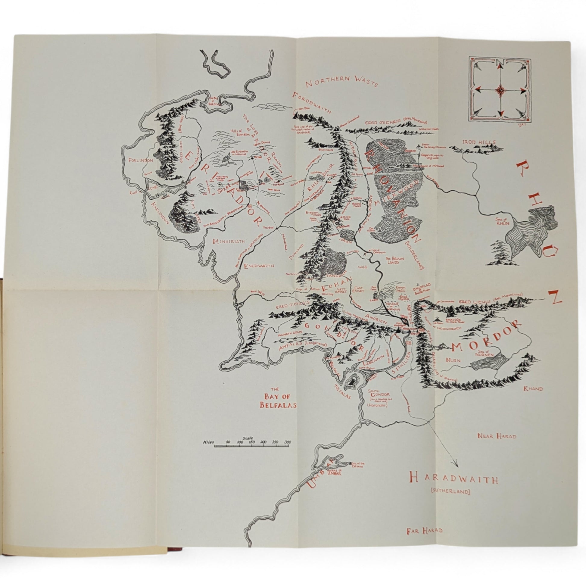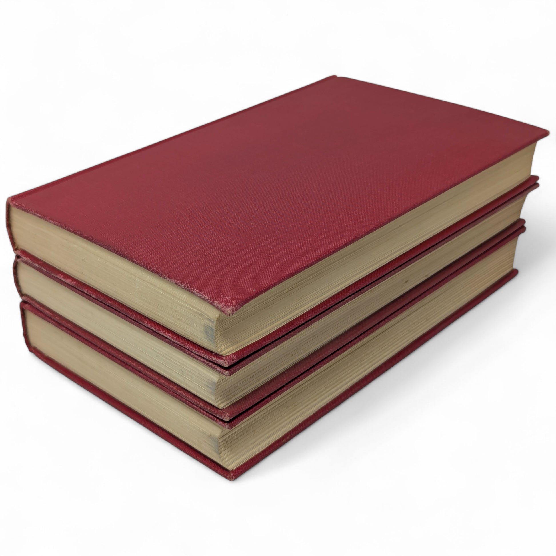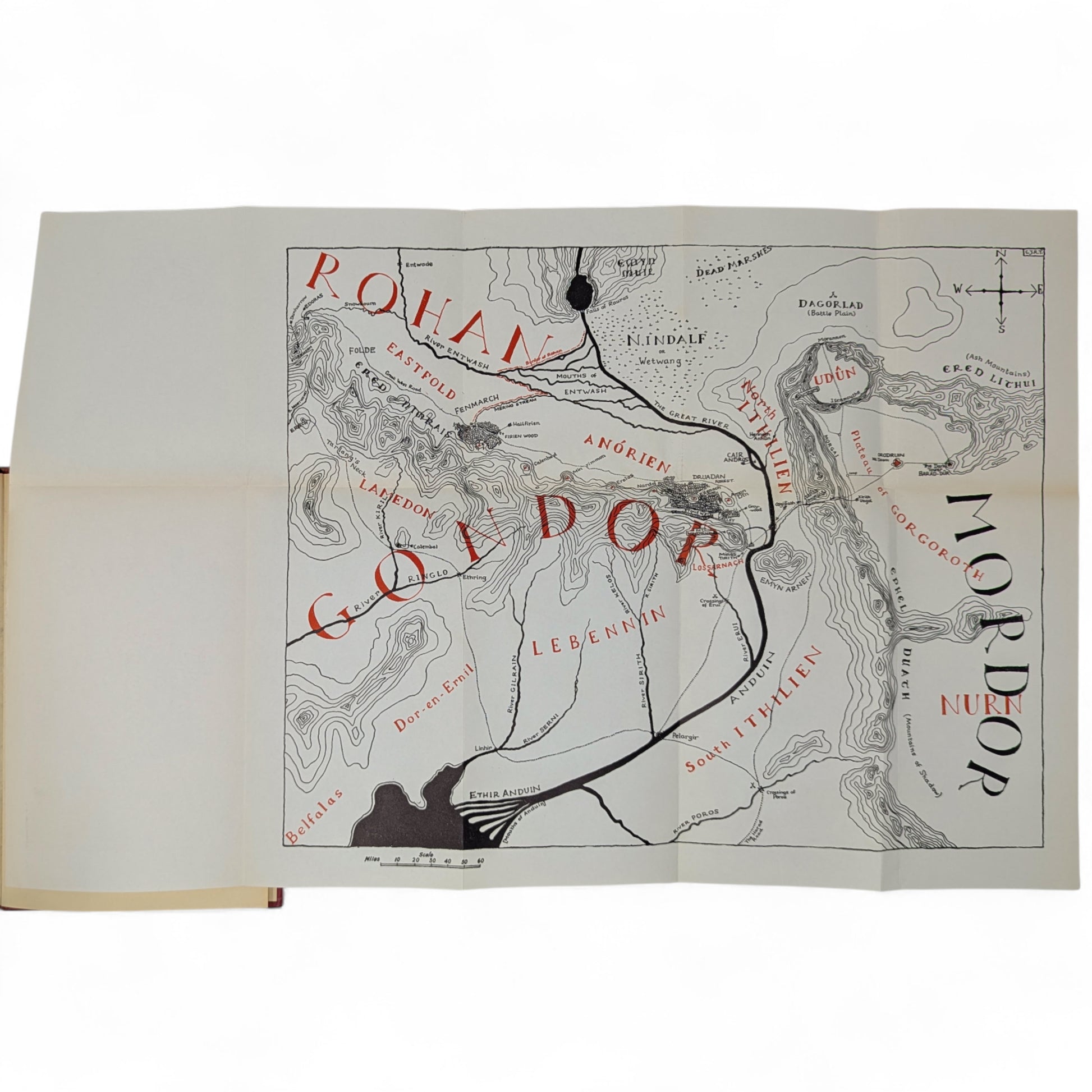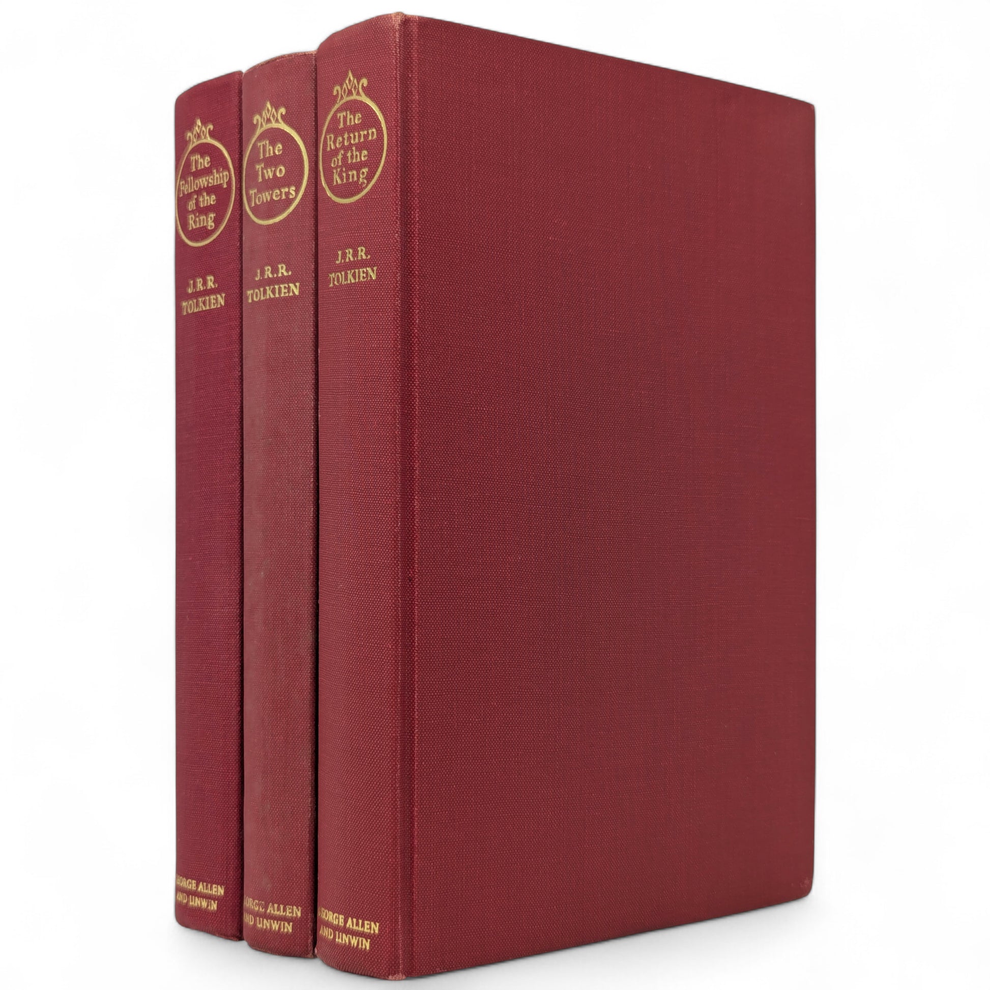 London: George Allen & Unwin. First editions, impressions 15th, 11th and 11th respectively, printed in 1965 and 1966. Complete in three volumes. Octavo (23 x 15 x 10cm), pp.423 [1]; pp.352; pp.416. With a folding map at the rear of each volume. Publisher's dark red cloth, title and decorative ring stamped on spine in gilt, plain endpapers, edges trimmed, top edge stained red, fore- and bottom edges unstained. With the grey wove paper dust wrappers, lettered to front and spine and with the "Ring and Eye" device in black, red and gold, unclipped and each priced at 25s.