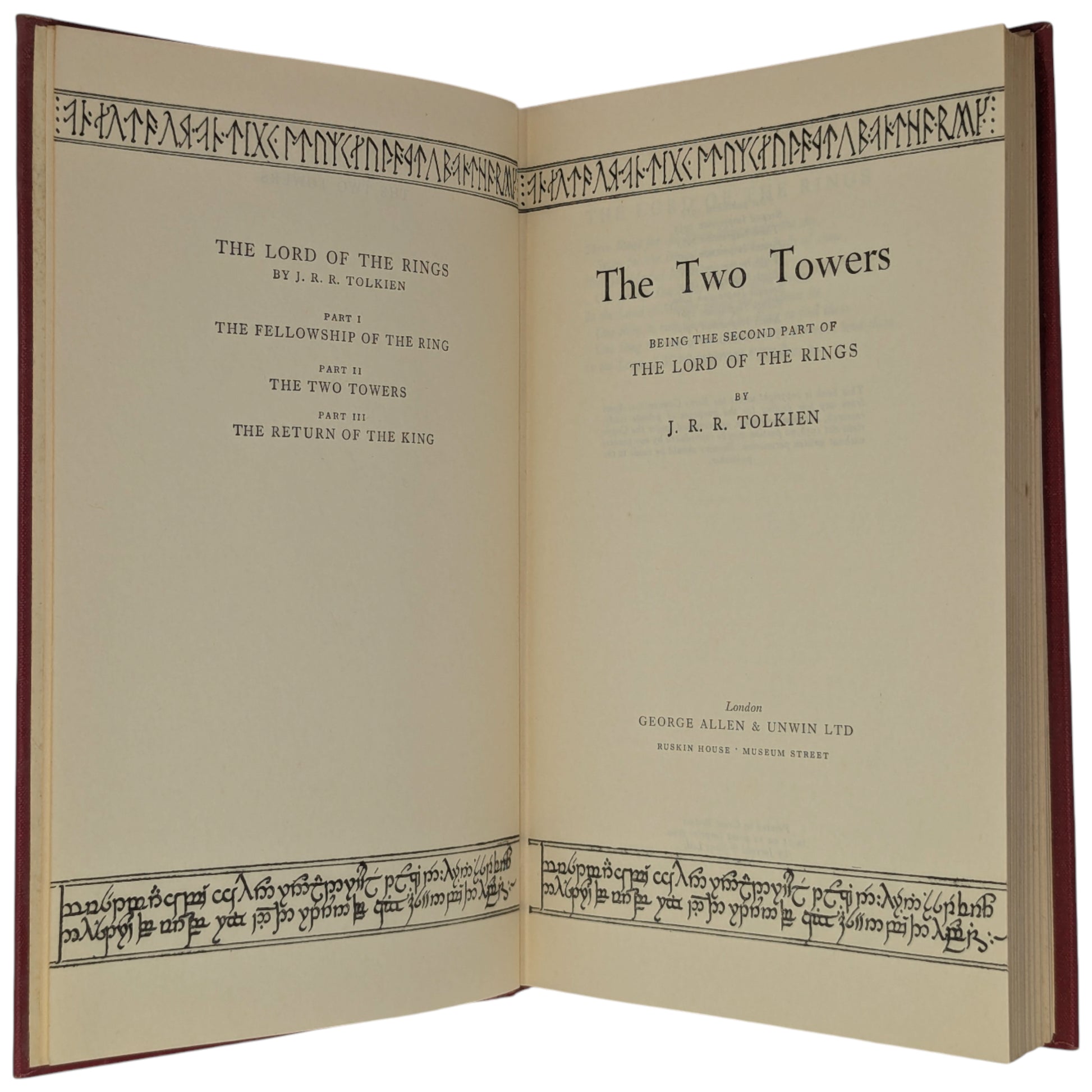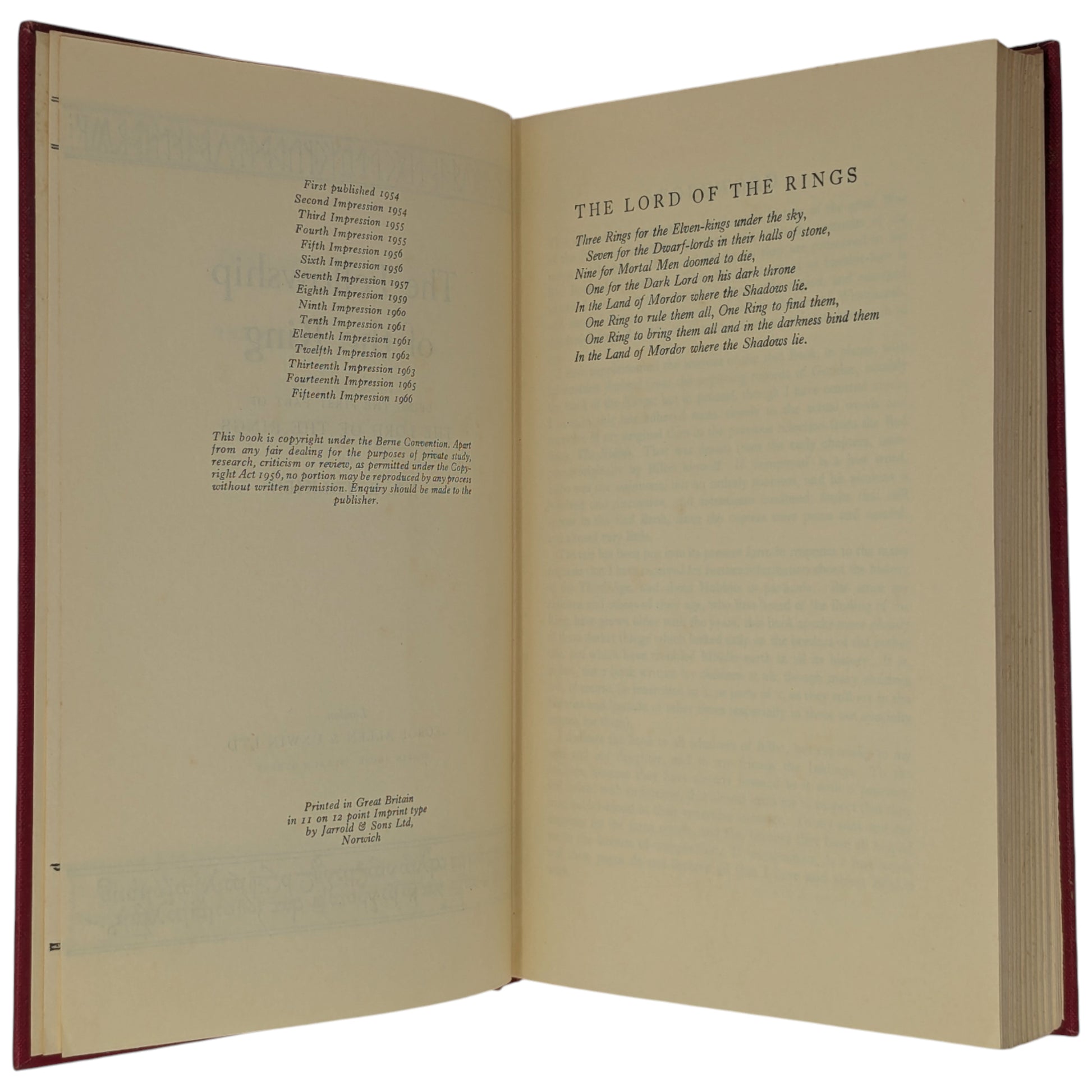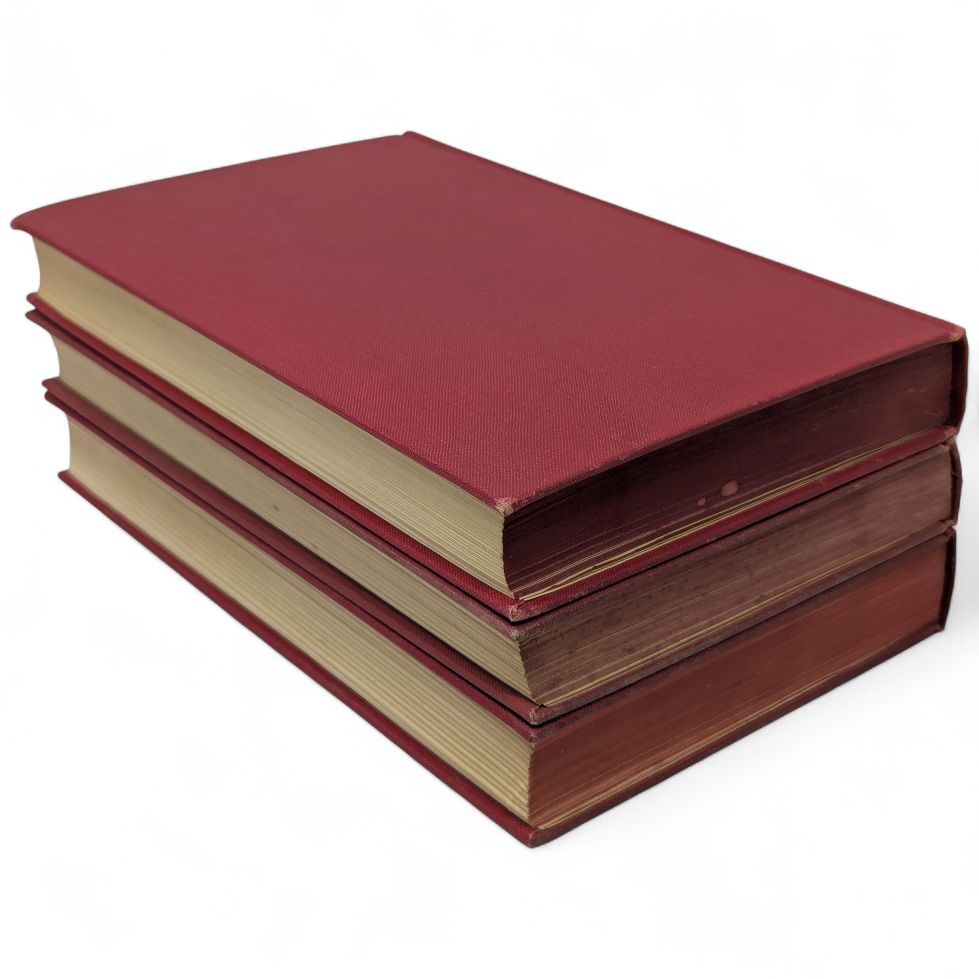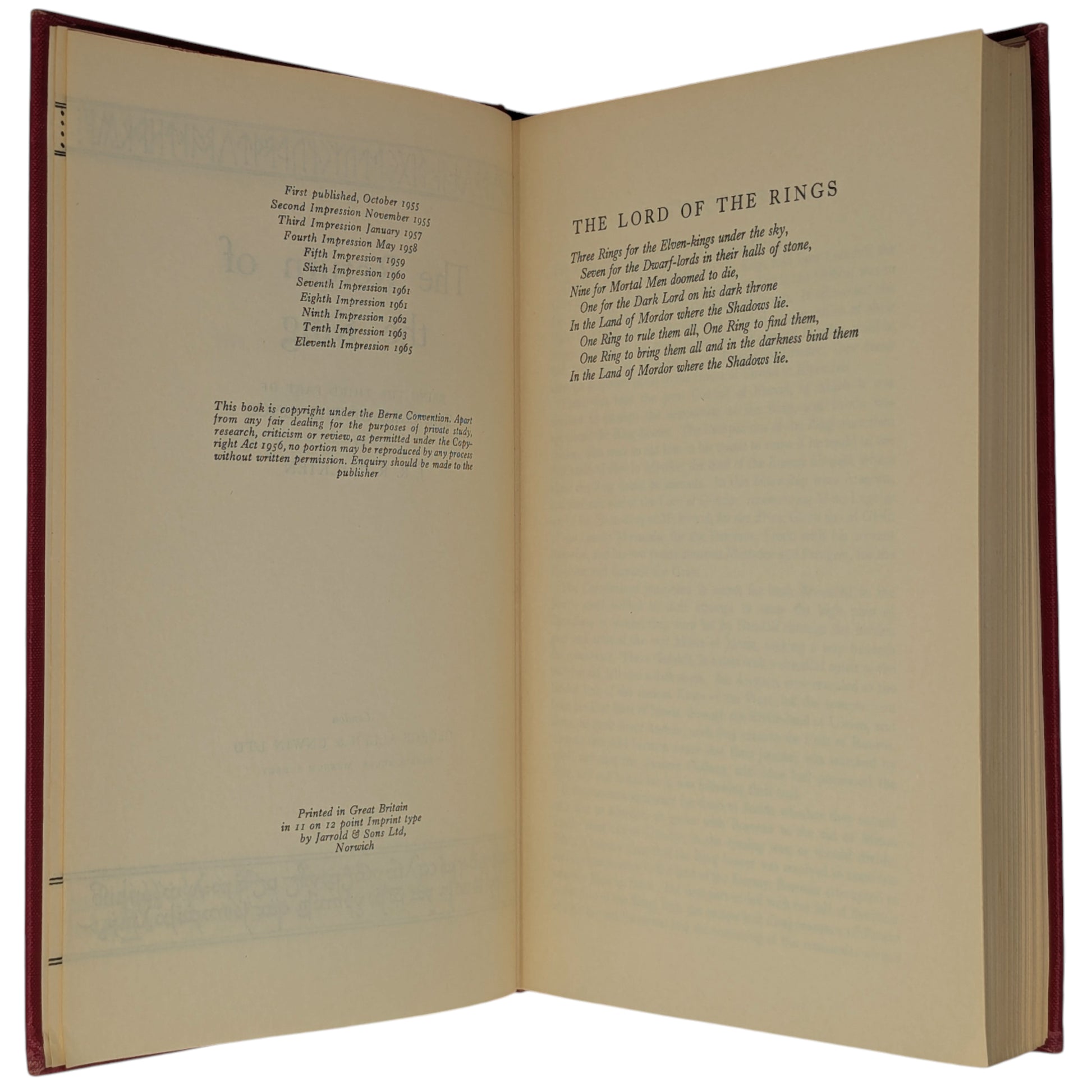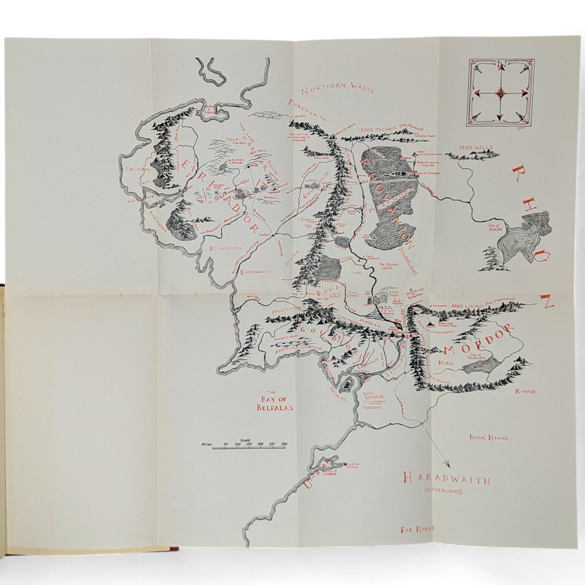London: George Allen & Unwin. First editions, impressions 15th, 11th and 11th respectively, printed in 1965 and 1966. Complete in three volumes. Octavo (23 x 15 x 10cm), pp.423 [1]; pp.352; pp.416. With a folding map at the rear of each volume. Publisher's dark red cloth, title and decorative ring stamped on spine in gilt, plain endpapers, edges trimmed, top edge stained red, fore- and bottom edges unstained. With the grey wove paper dust wrappers, lettered to front and spine and with the "Ring and Eye" device in black, red and gold, unclipped and each priced at 25s.