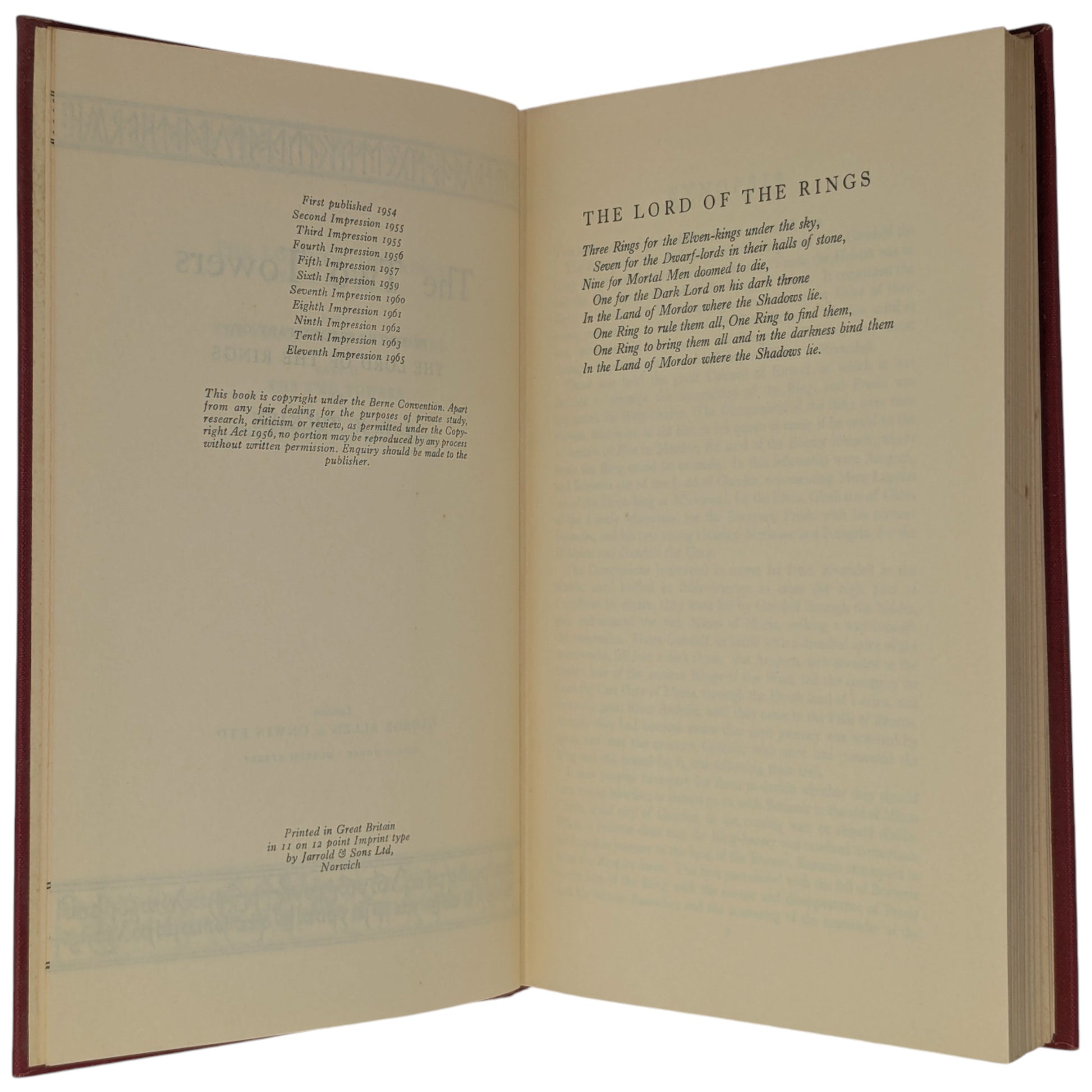 - The Two Towers (11th impression in 12th impression dustwrapper, 1965). The book itself is externally in overall clean condition with very bright gilt lettering. There is light bumping and wear to spine tips, covers are a little dusty, the joints, corners and extremities are slightly rubbed, the covers are a little dusty, the extremities are a little darkened, the edges show a few spots of foxing, and the top edge is faded and grubby. Binding itself is firm (although again, the book has the give of a read one) with the spine heavily cocked. There is an inscription penned to FFEP, light offsetting to FEPs, and marginal foxing to the last couple of pages. The unclipped dust wrapper is tanned to spine and joints, with a couple of larger stains to spine and a couple of others to front panel, with a small sticker to front flap, nibbled slightly to extremities with hardly any loss.