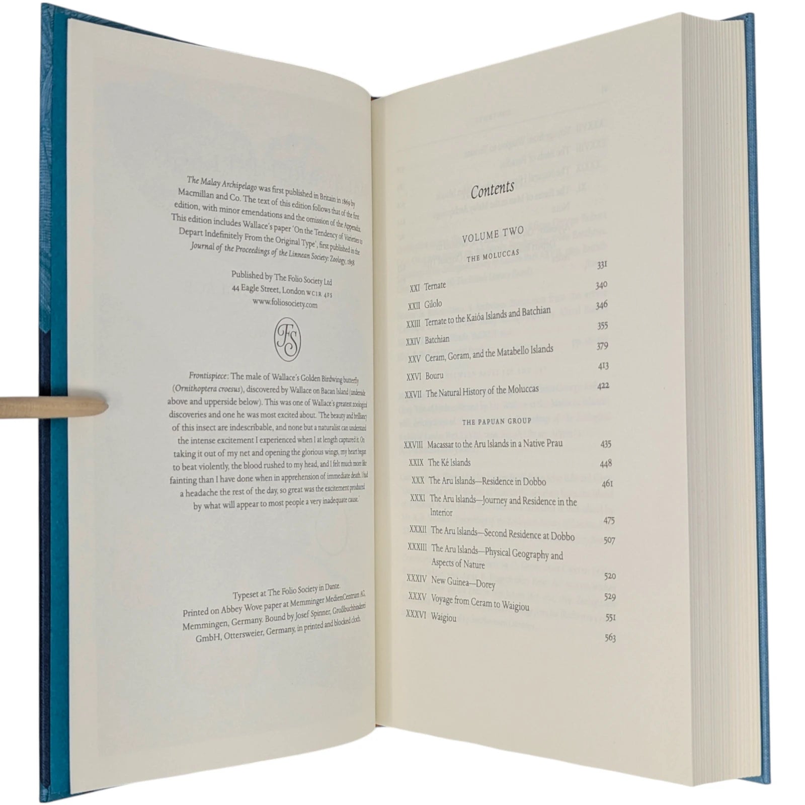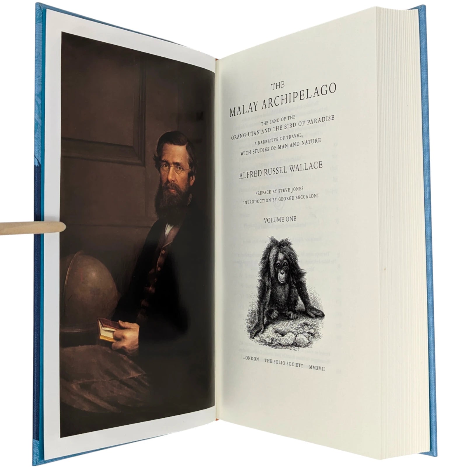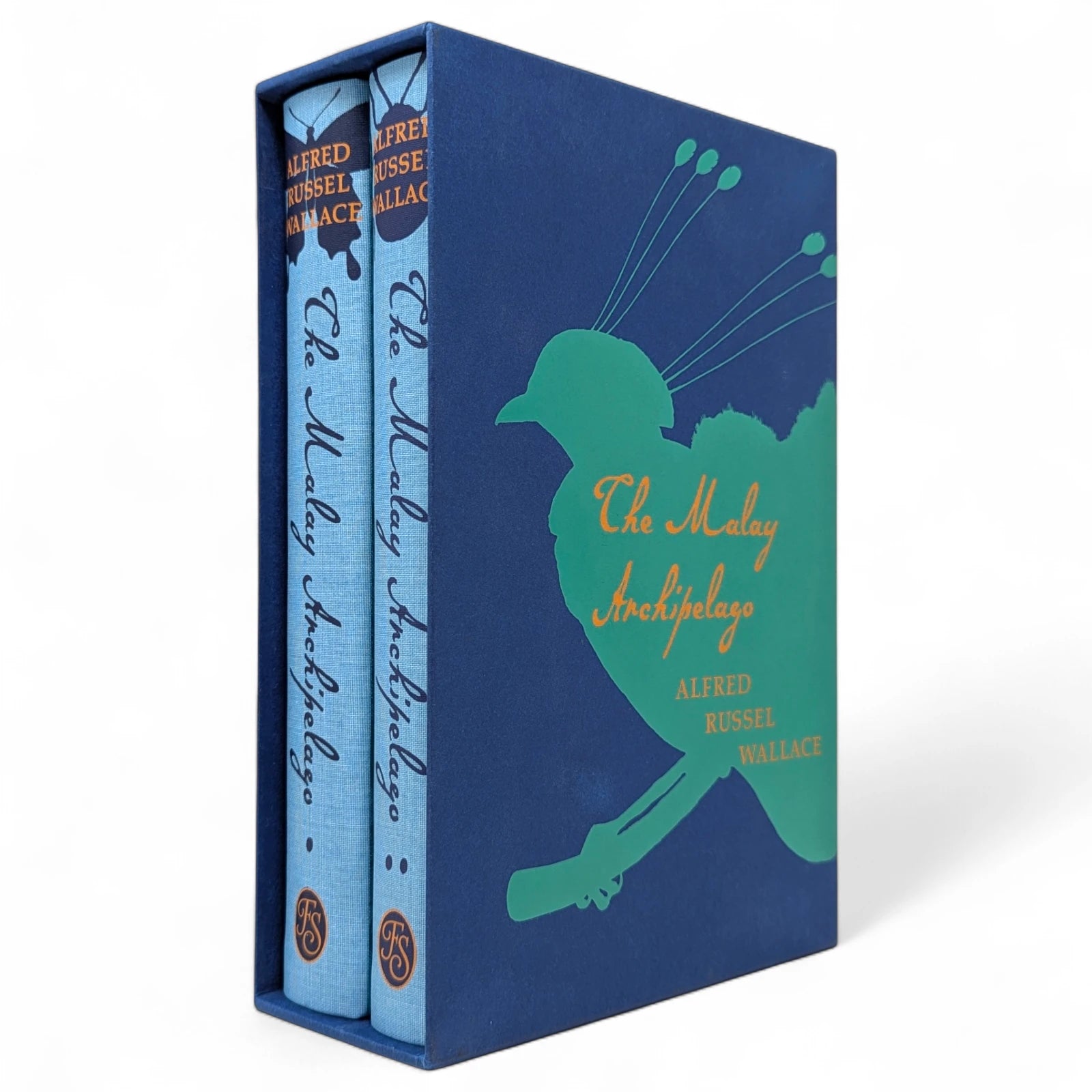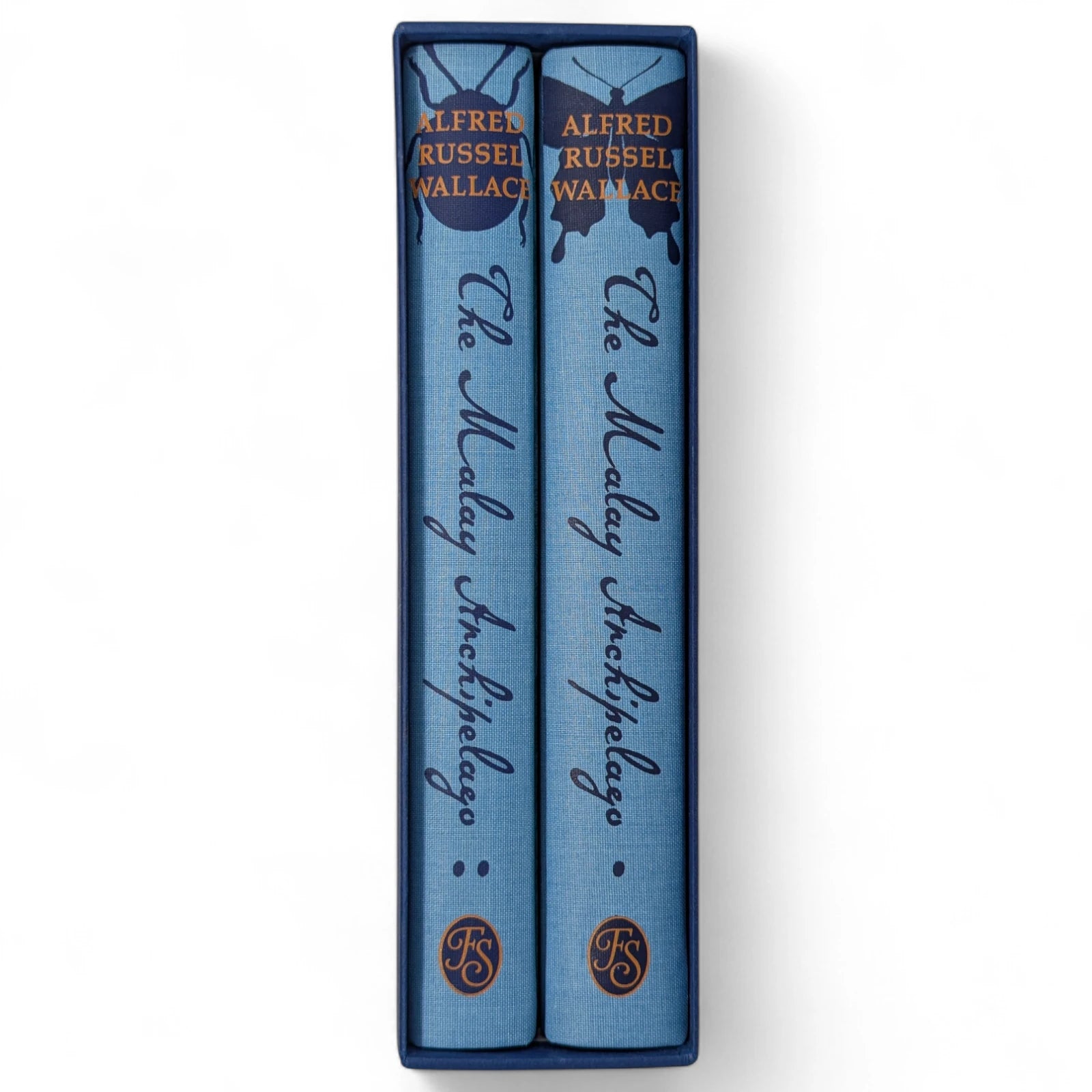 The Malay Archipelago, The Land of the Orangutan and The Bird of Paradise, A Narrative of Travel, with Studies of Man and Nature, Alfred Russel Wallace. London: The Folio Society, 2017. First printing thus. 239 × 162 × 31–34 mm. 2 vols (see below). Type: Dante. Printed by Memminger MedienCentrum. Bound by Josef Spinner in full pale blue cloth printed in green and blocked in pale brown and dark blue with two different designs; green endleaves. Blue two-volume slip case blocked in green and pale brown. The text follows that of the first edition published by Macmillan and Co. in 1869, with minor emendations and the ommission of the appendix. Wallace’s 1858 article ‘On the tendency of varieties to depart indefinitely from the original type’ is included at the end. In addition to the plates, over 50 black and white engraved illustrations are in the text. The two volumes are as follows: