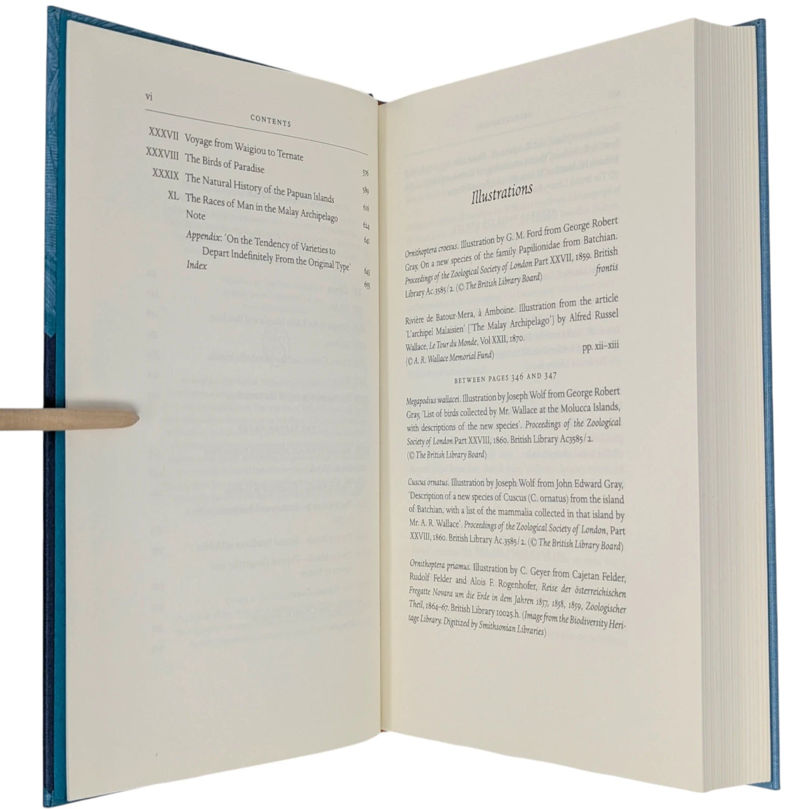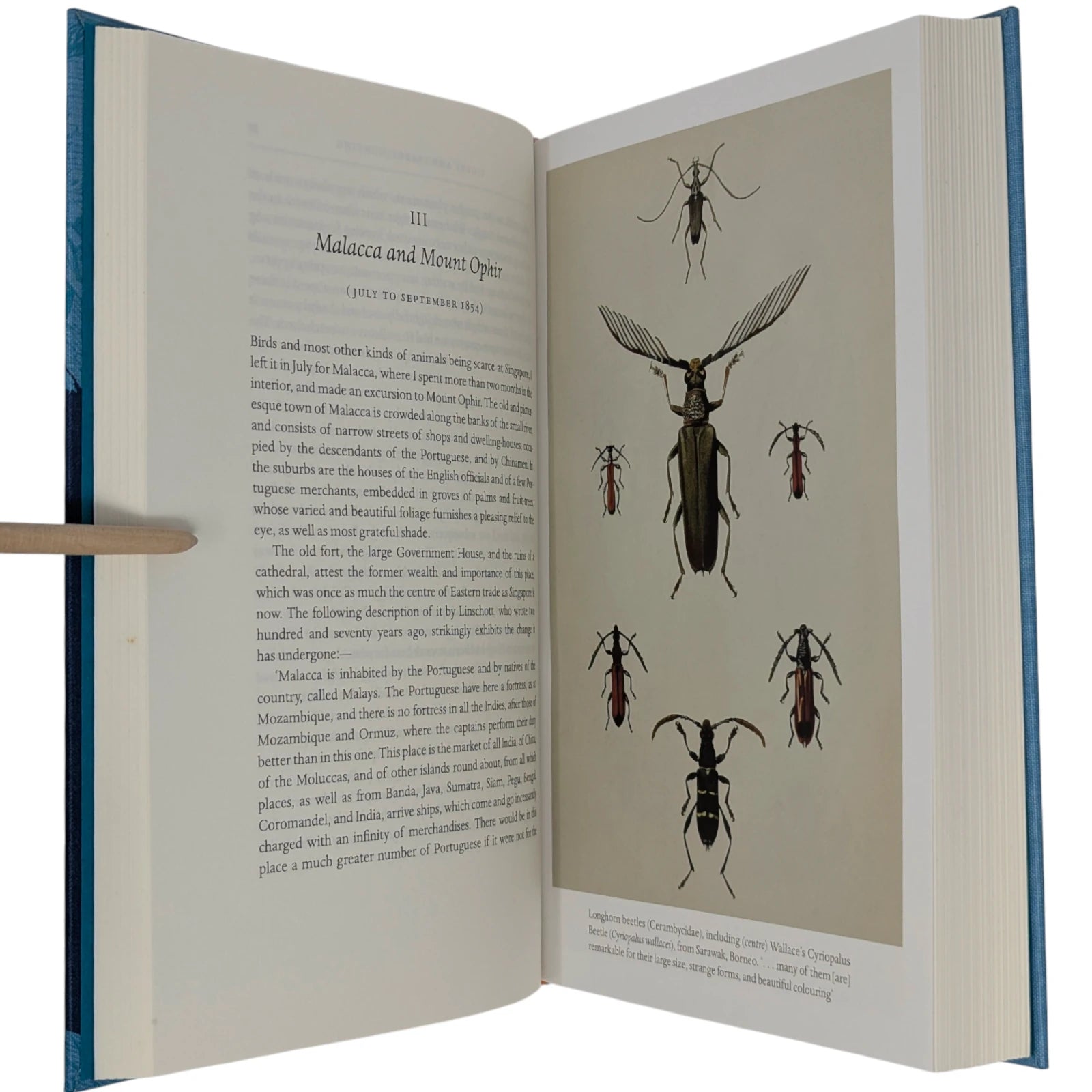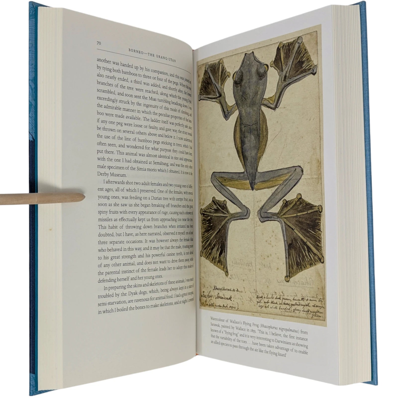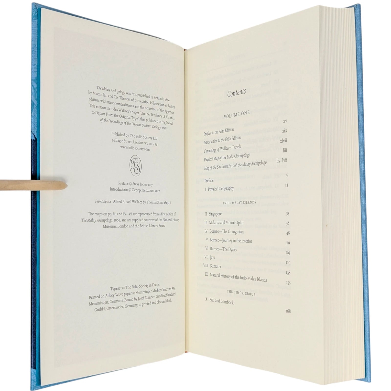 The Malay Archipelago, The Land of the Orangutan and The Bird of Paradise, A Narrative of Travel, with Studies of Man and Nature, Alfred Russel Wallace. London: The Folio Society, 2017. First printing thus. 239 × 162 × 31–34 mm. 2 vols (see below). Type: Dante. Printed by Memminger MedienCentrum. Bound by Josef Spinner in full pale blue cloth printed in green and blocked in pale brown and dark blue with two different designs; green endleaves. Blue two-volume slip case blocked in green and pale brown. The text follows that of the first edition published by Macmillan and Co. in 1869, with minor emendations and the ommission of the appendix. Wallace’s 1858 article ‘On the tendency of varieties to depart indefinitely from the original type’ is included at the end. In addition to the plates, over 50 black and white engraved illustrations are in the text. The two volumes are as follows:
