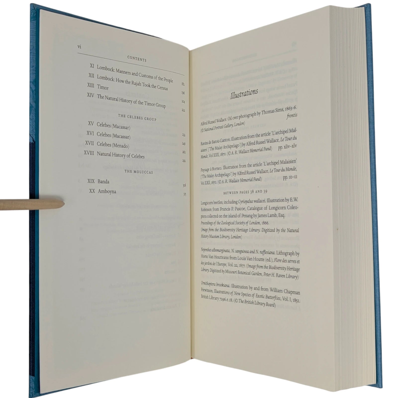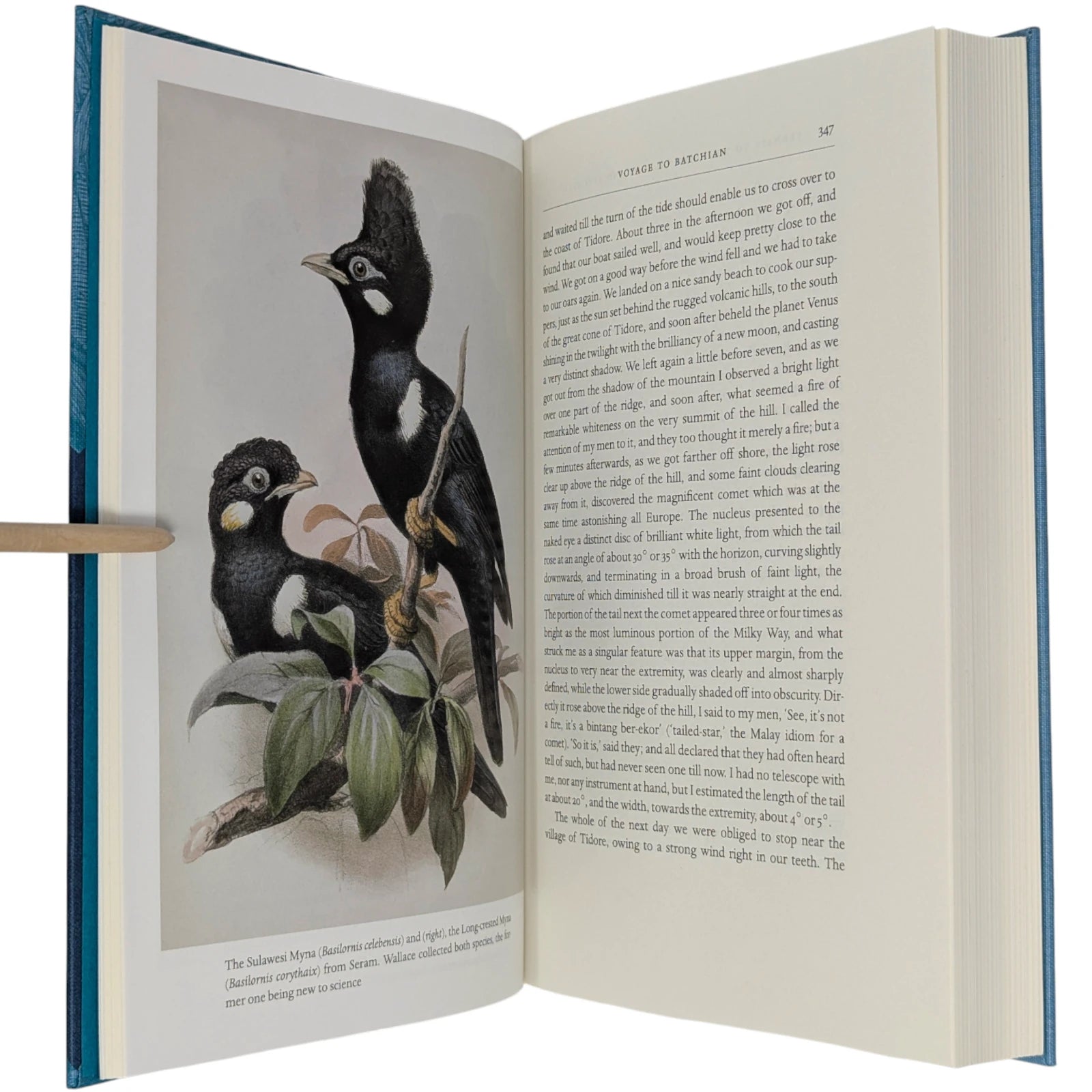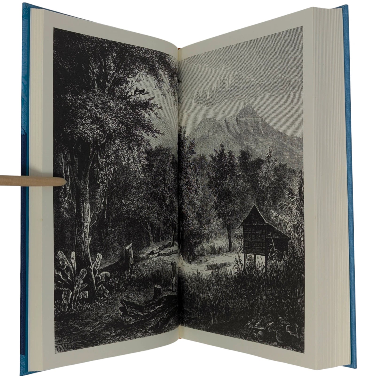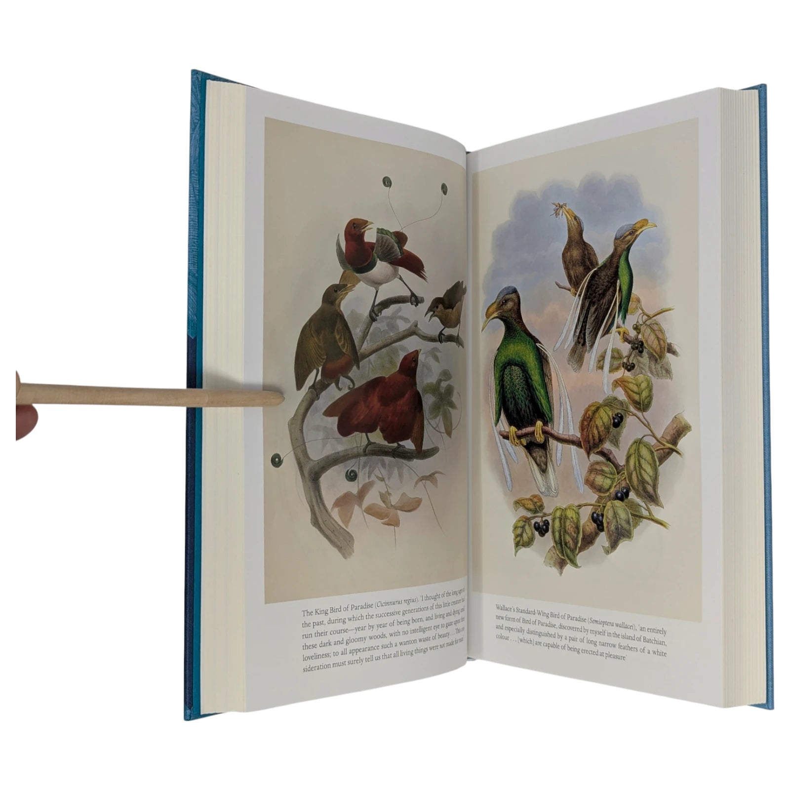 The Malay Archipelago, The Land of the Orangutan and The Bird of Paradise, A Narrative of Travel, with Studies of Man and Nature, Alfred Russel Wallace. London: The Folio Society, 2017. First printing thus. 239 × 162 × 31–34 mm. 2 vols (see below). Type: Dante. Printed by Memminger MedienCentrum. Bound by Josef Spinner in full pale blue cloth printed in green and blocked in pale brown and dark blue with two different designs; green endleaves. Blue two-volume slip case blocked in green and pale brown. The text follows that of the first edition published by Macmillan and Co. in 1869, with minor emendations and the ommission of the appendix. Wallace’s 1858 article ‘On the tendency of varieties to depart indefinitely from the original type’ is included at the end. In addition to the plates, over 50 black and white engraved illustrations are in the text. The two volumes are as follows: