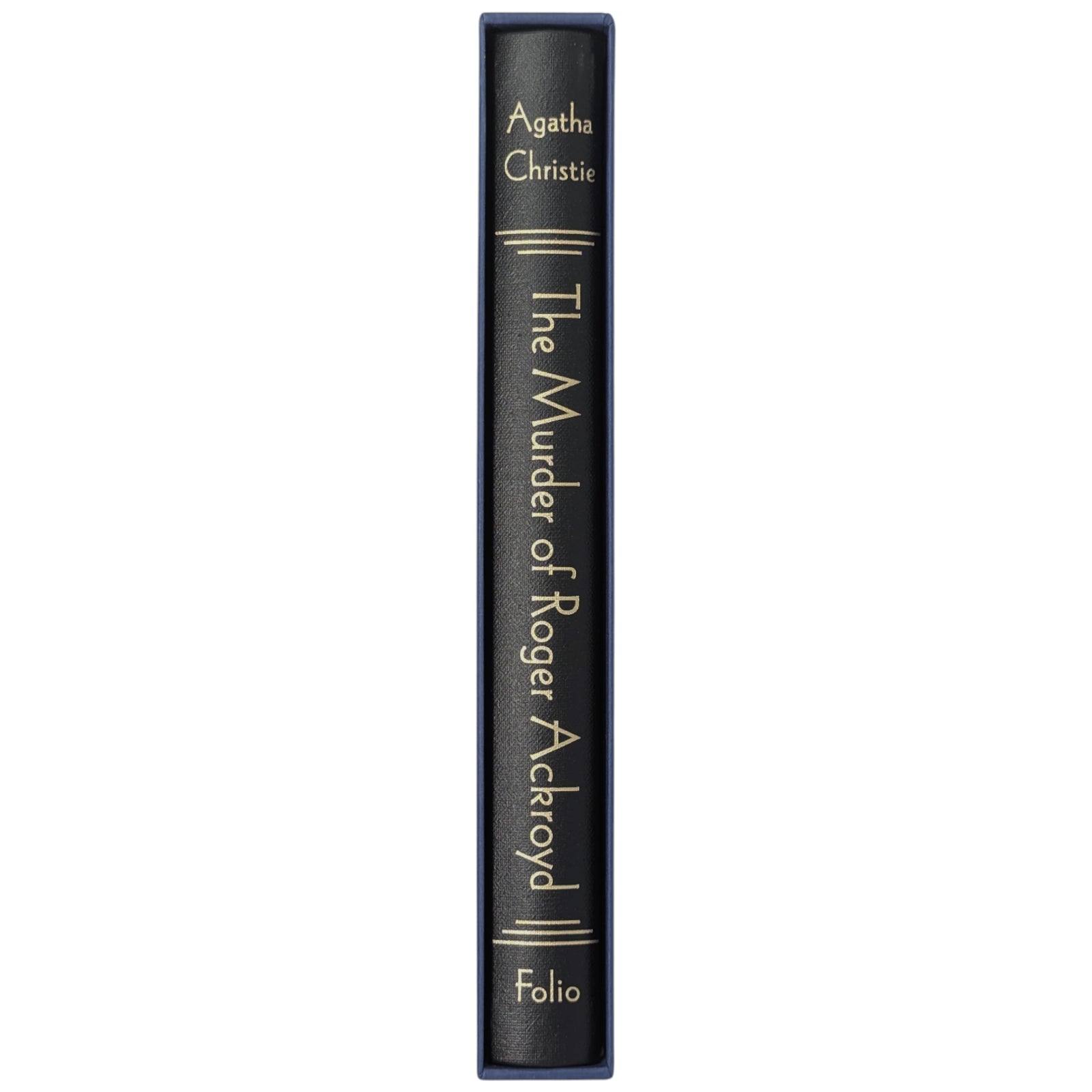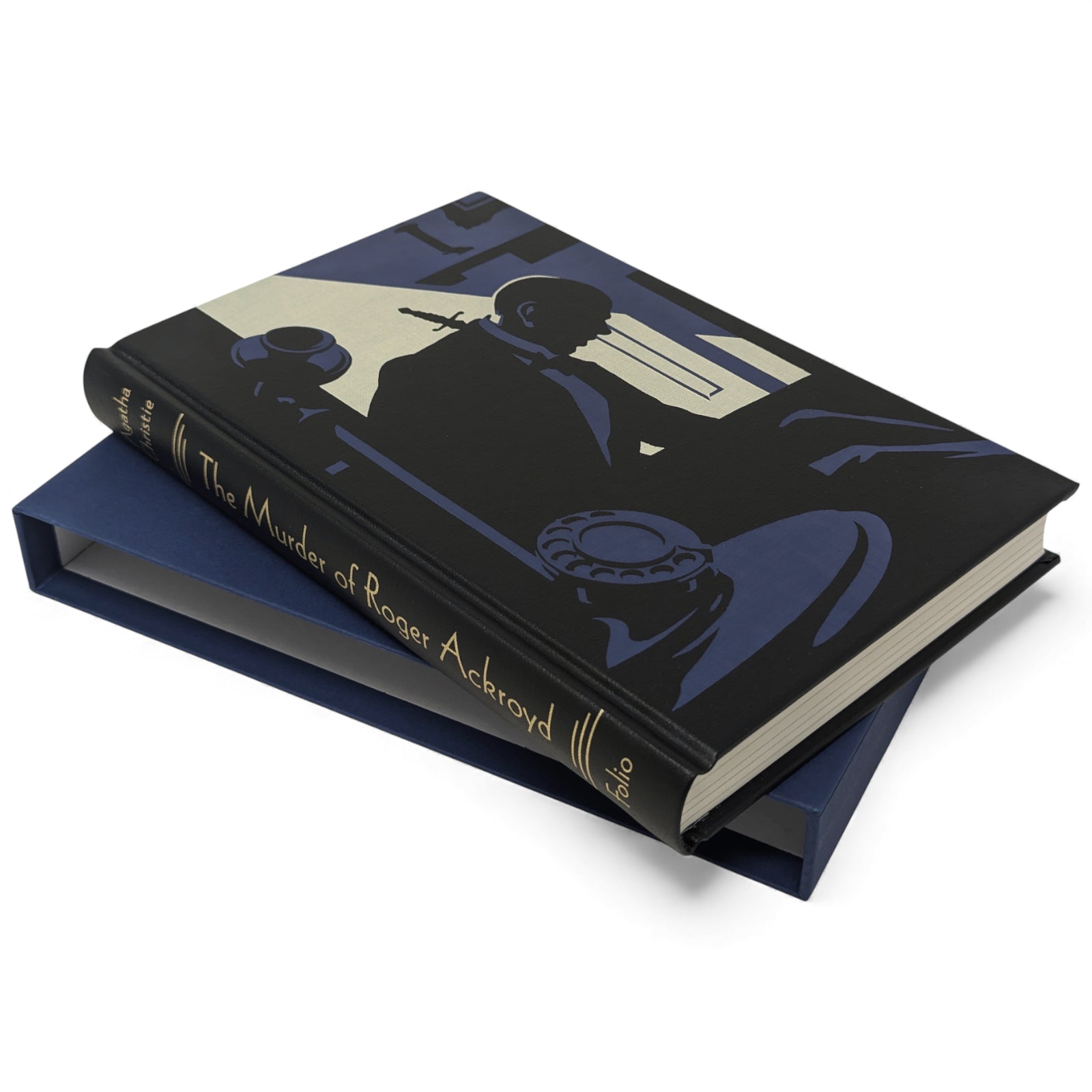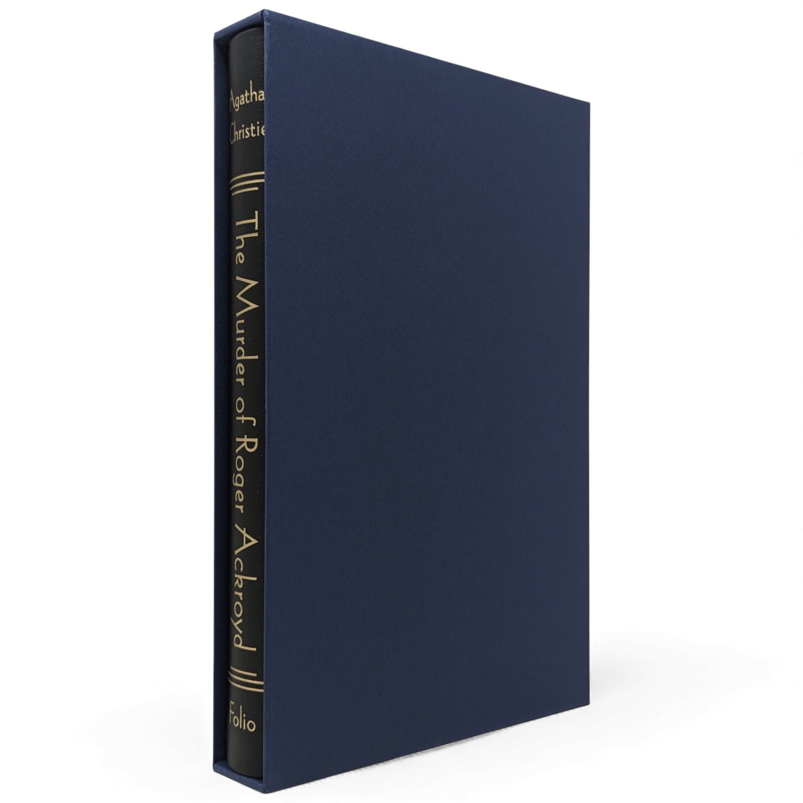 CHRISTIE, Agatha. The Murder of Roger Ackroyd. London: The Folio Society, 2013. Second printing thus, 2022. Introduced by Sophie Hannah, illustrated by Andrew Davidson. 229 × 152 × 25 mm. Pp. [i–iv] v–xiv [xv–xvi], [1–2] 3–222 [223–224]: [7] leaves of colour plates (facing pp. [iii], 17, 48, 80, 128, 160 and 193). Type: Bell with Kabel Heavy for display. Printed and bound by L.E.G.O. in full black buckram blocked in blue and cream with design by Davidson; dark grey endleaves. Blue slip case.