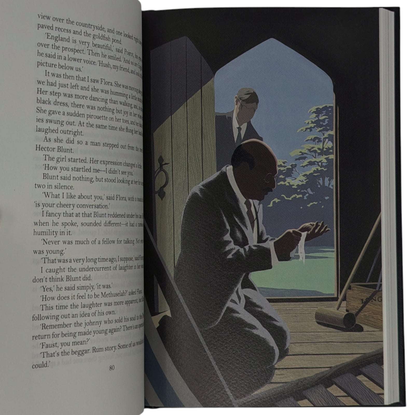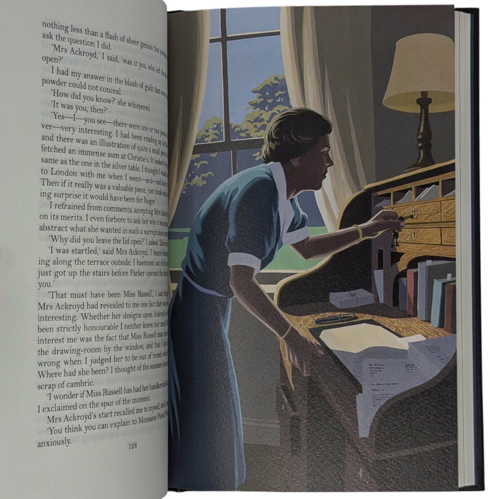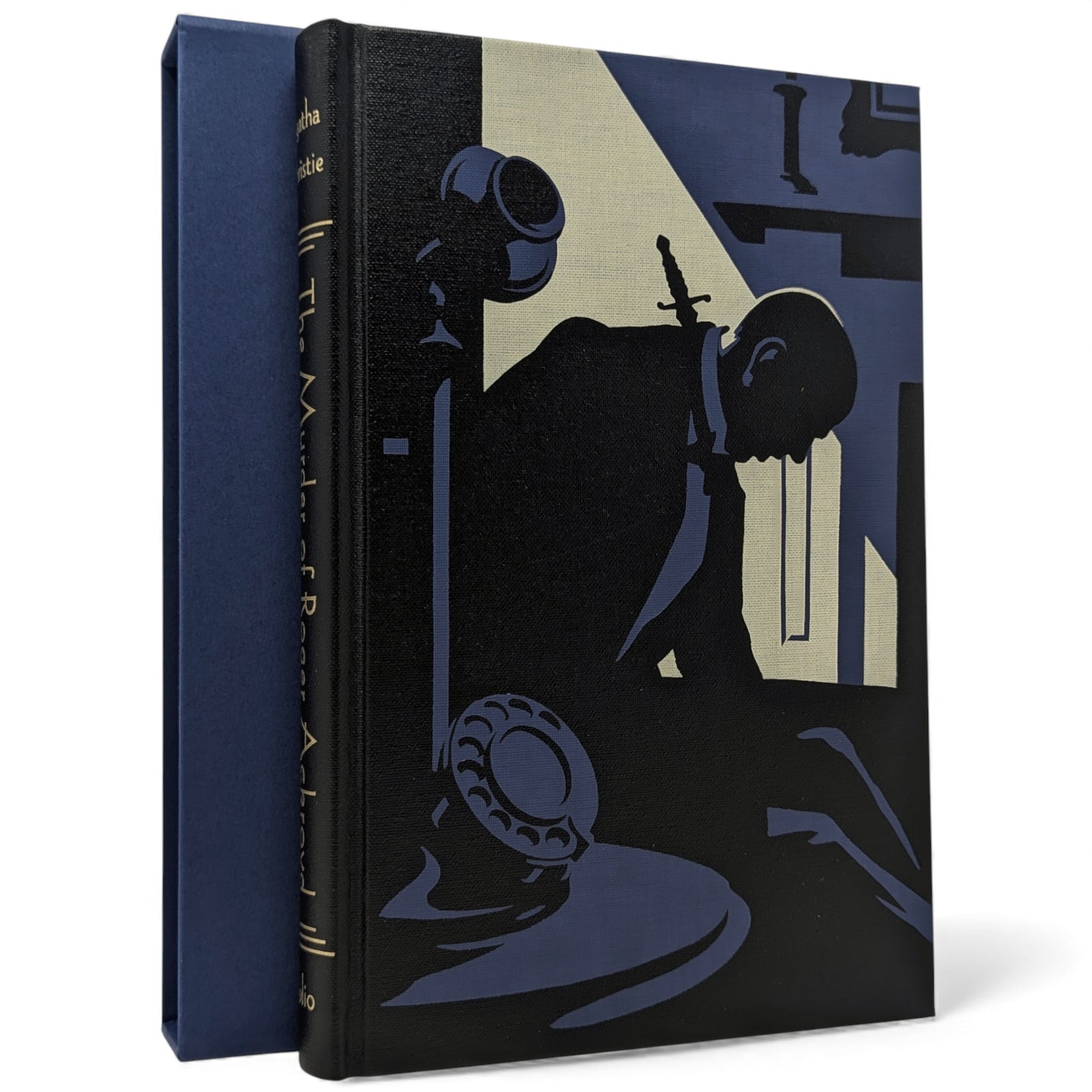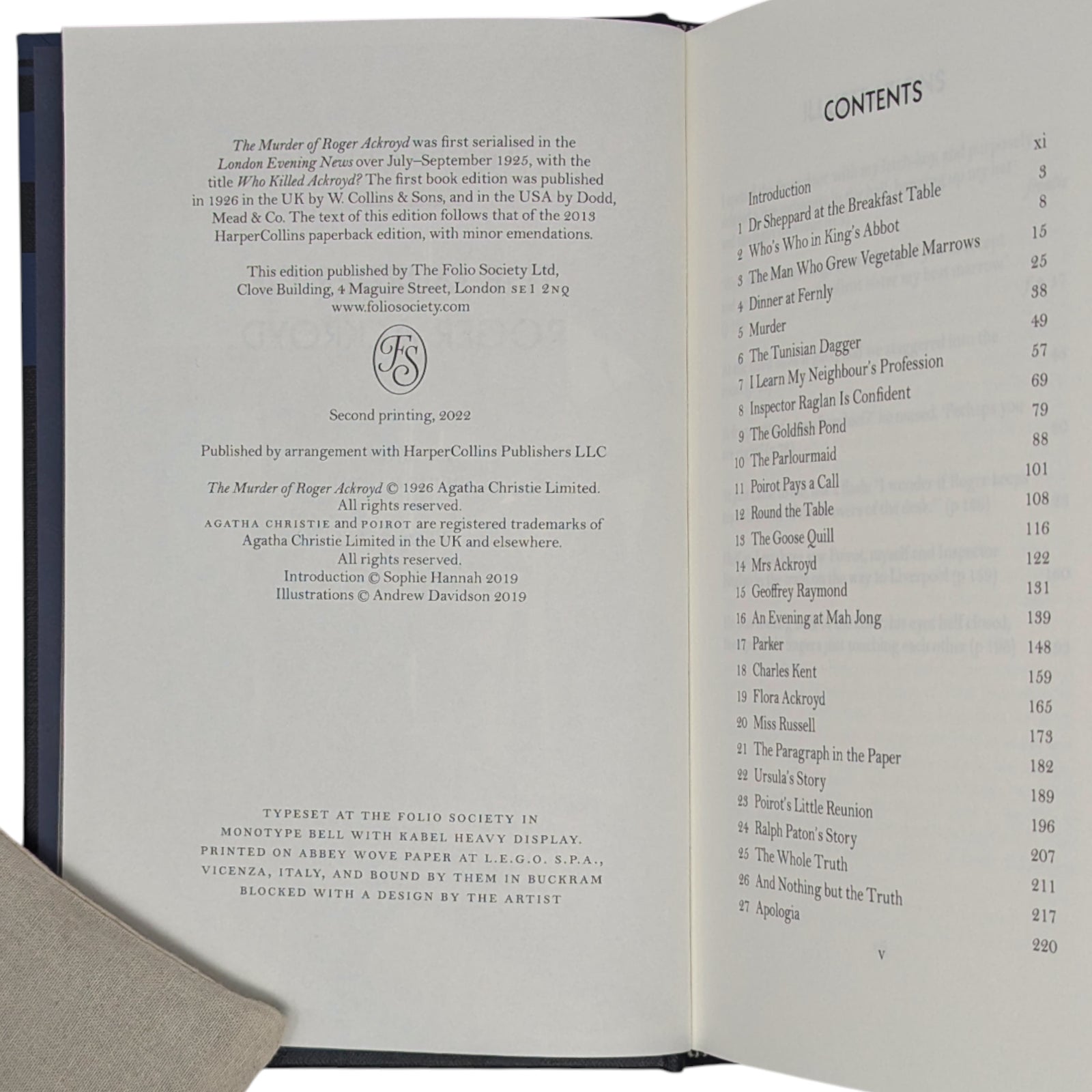 CHRISTIE, Agatha. The Murder of Roger Ackroyd. London: The Folio Society, 2013. Second printing thus, 2022. Introduced by Sophie Hannah, illustrated by Andrew Davidson. 229 × 152 × 25 mm. Pp. [i–iv] v–xiv [xv–xvi], [1–2] 3–222 [223–224]: [7] leaves of colour plates (facing pp. [iii], 17, 48, 80, 128, 160 and 193). Type: Bell with Kabel Heavy for display. Printed and bound by L.E.G.O. in full black buckram blocked in blue and cream with design by Davidson; dark grey endleaves. Blue slip case.