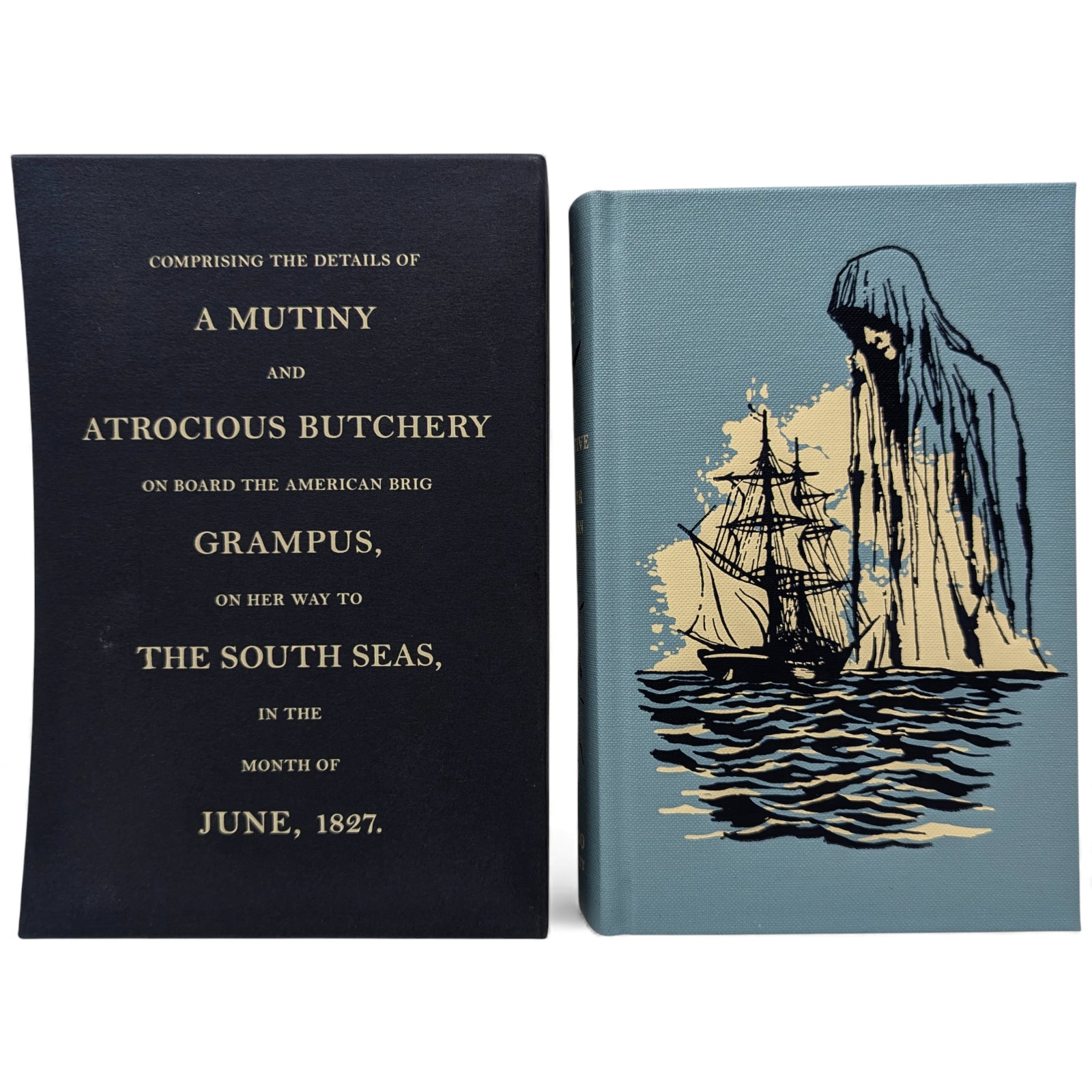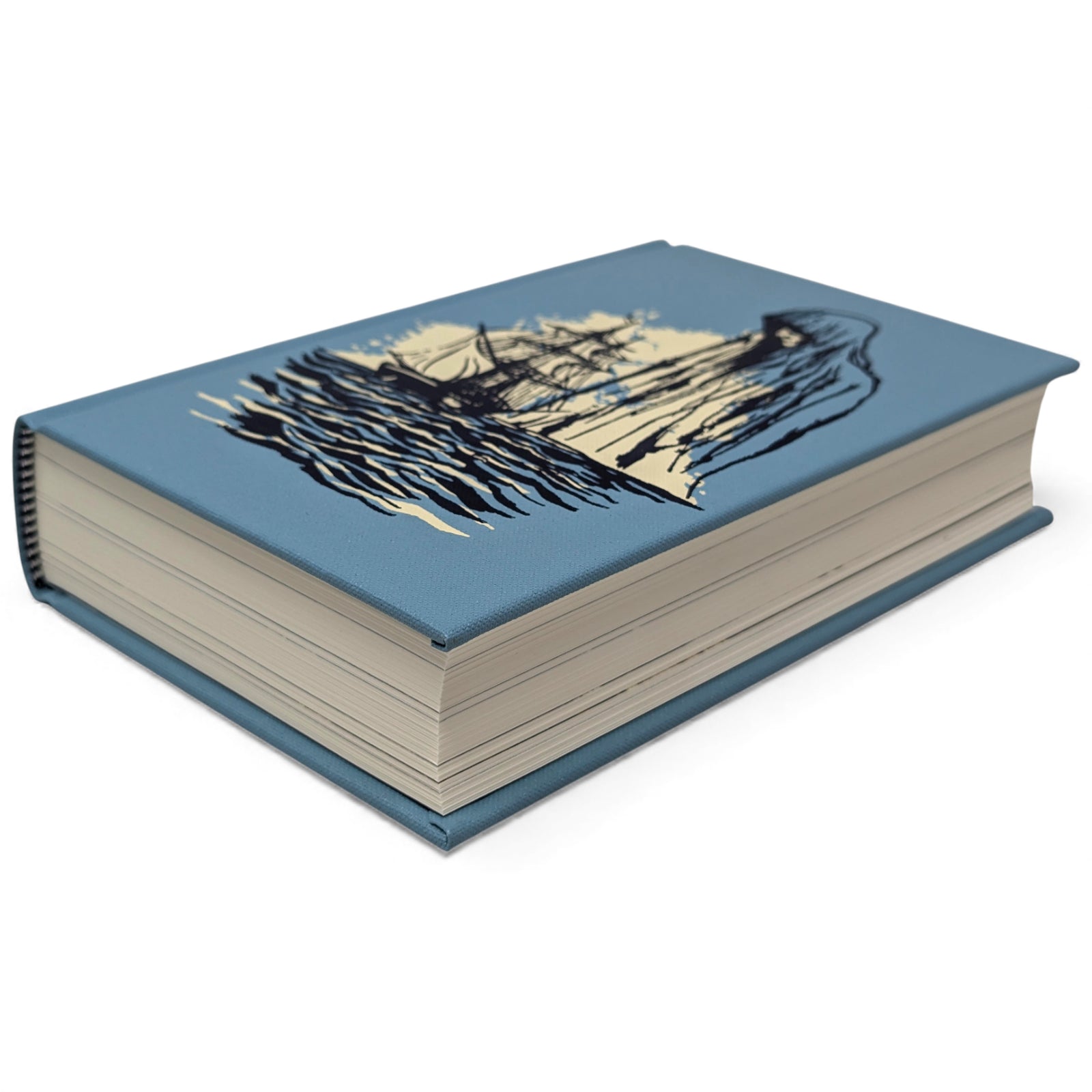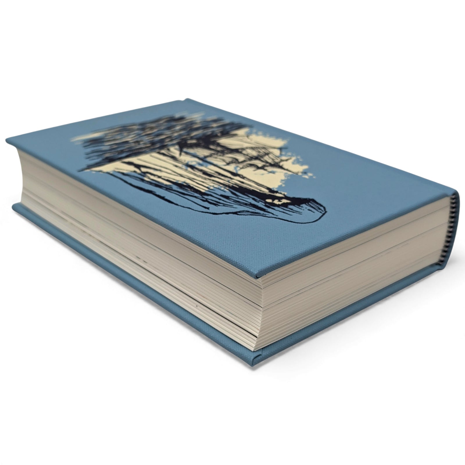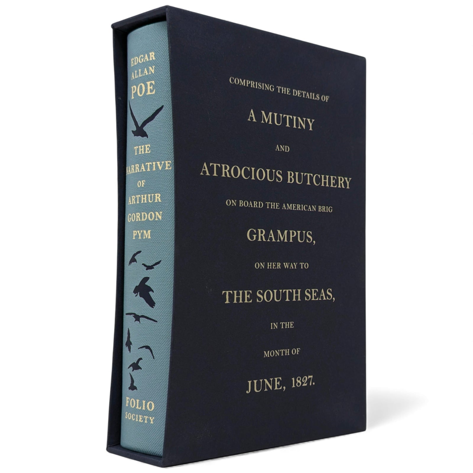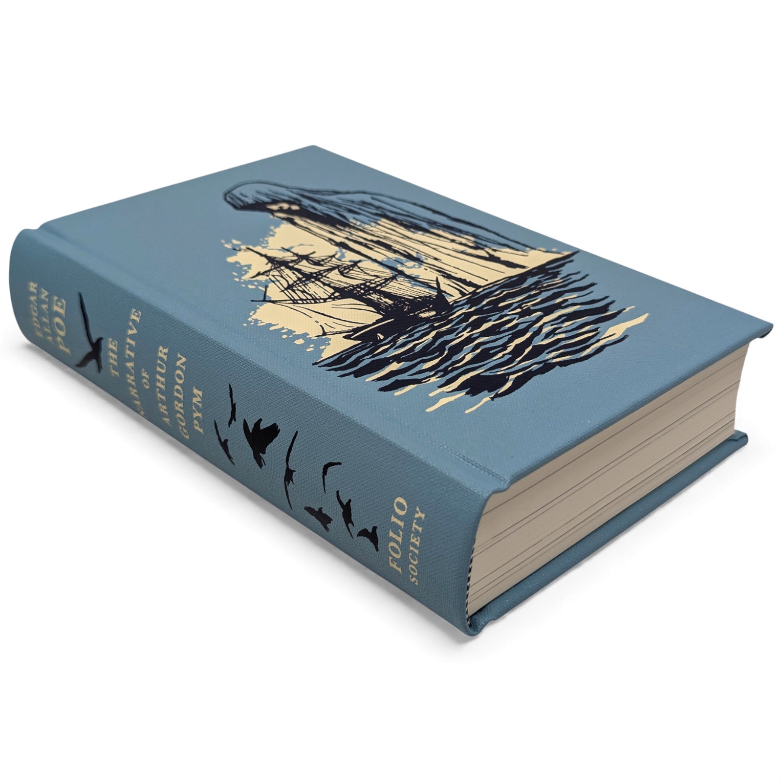 POE, Edgar Allan. The Narrative of Arthur Gordon Pym. London: The Folio Society [2015]. First printing thus. Introduced by Marilynne Robinson, illustrations by David Lupton. 175 × 117 × 36 mm. Pp. [i–iv] v–xxii, [1–2] 3–346: [7] leaves of colour plates (facing pp. [iii], 43, 138, 155, 250, 282 and 299). Type: Bell. Printed by Memminger MedienCentrum. Bound by Real Lachenmaier in full pale blue buckram blocked in dark blue and cream with design by Lupton; blue endleaves. Dark blue slip case blocked with subtitle design in cream on one side. Winner in literature category of the 2015 British Book Design and Production Awards.