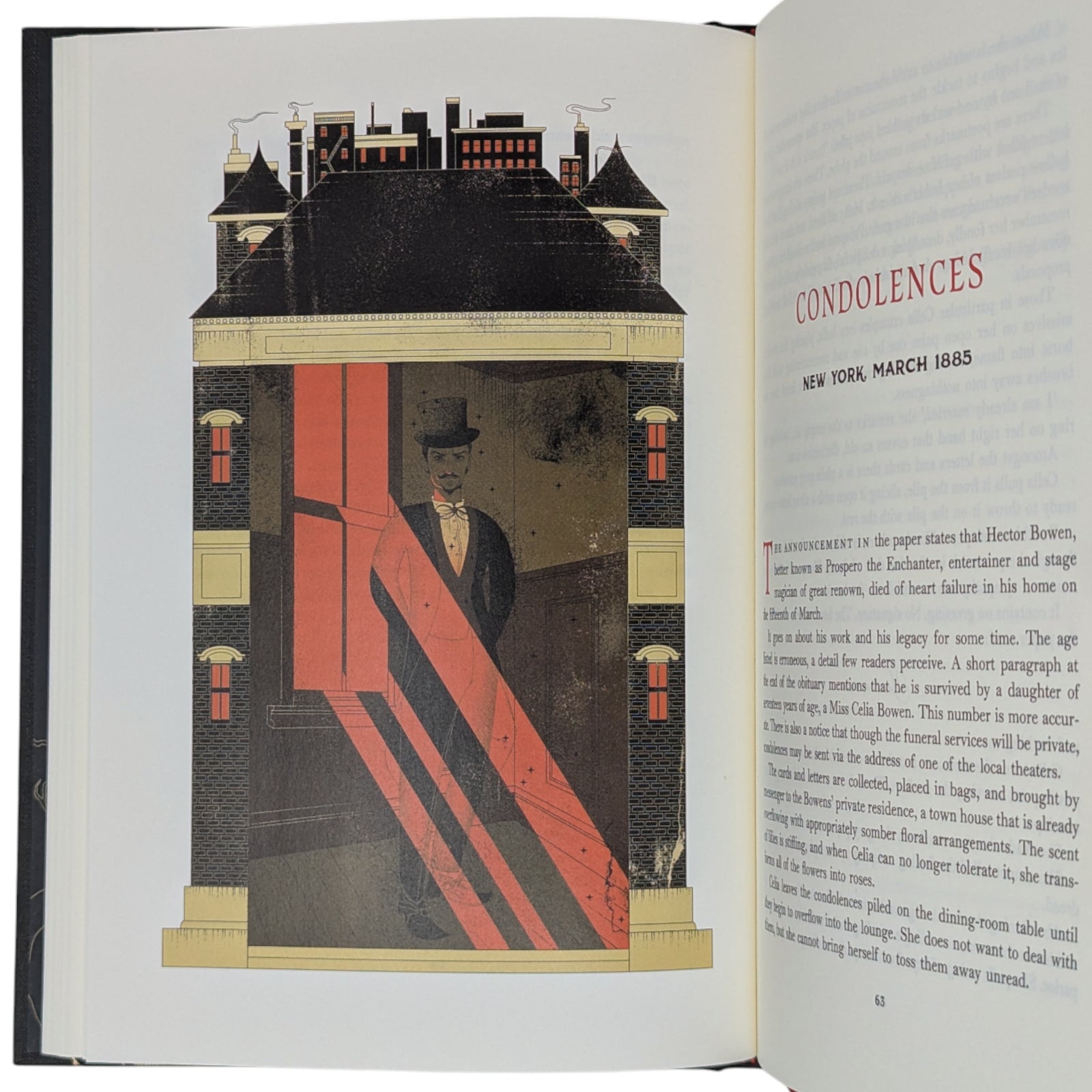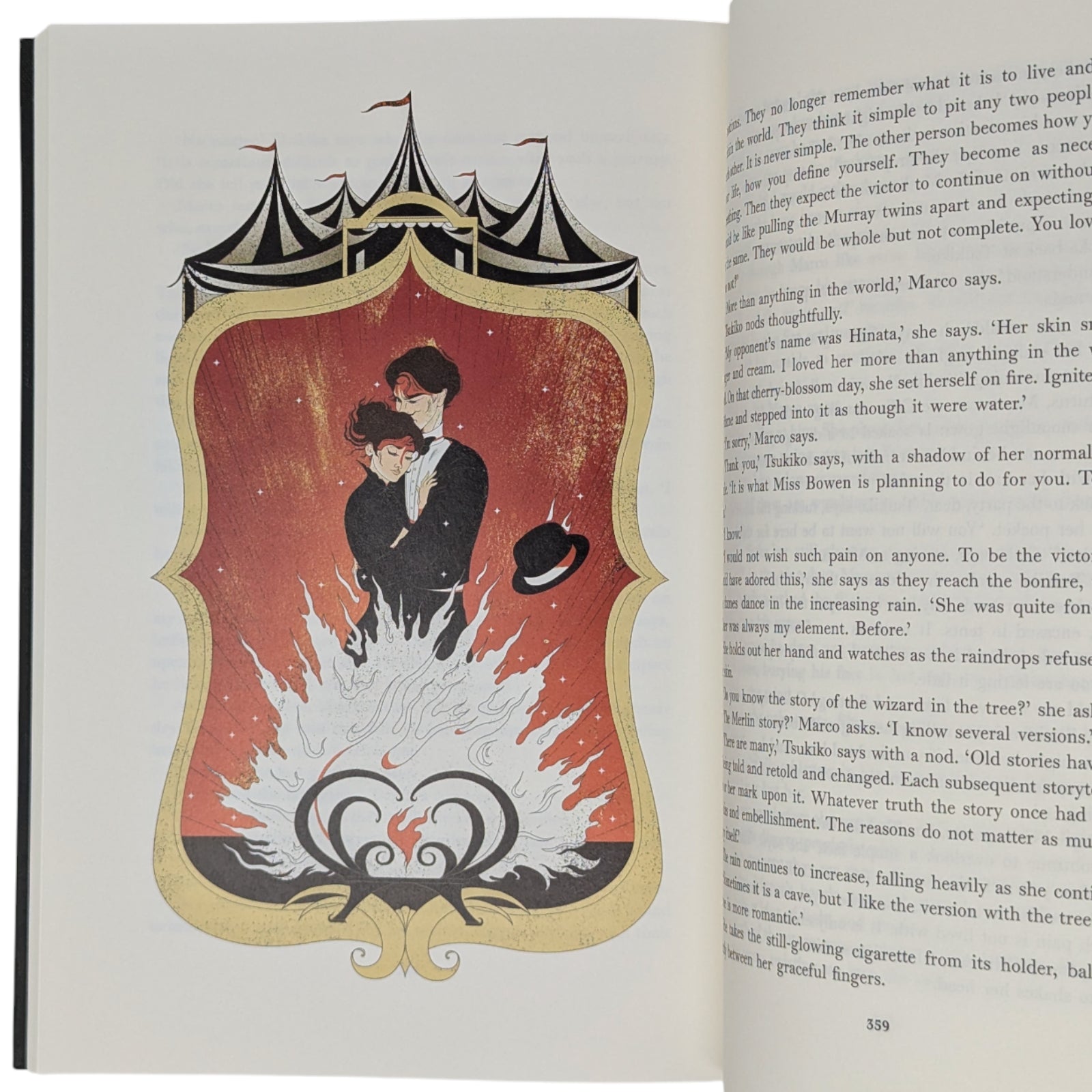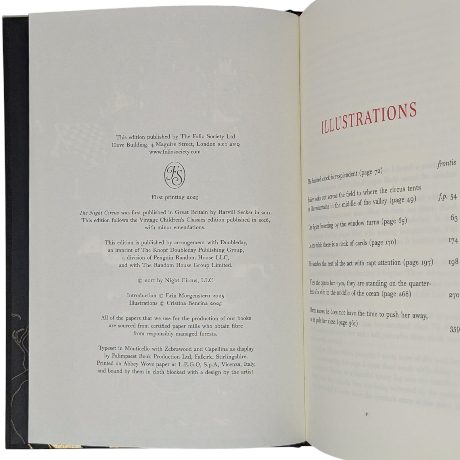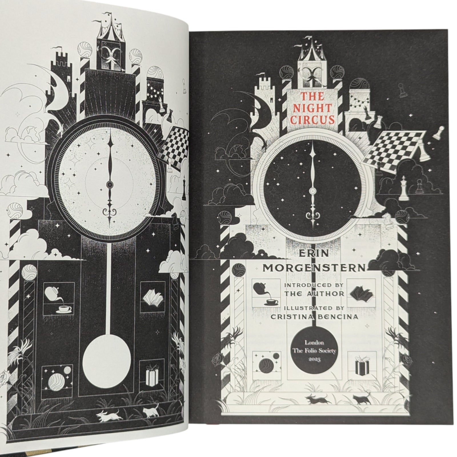 The Night Circus, by Erin Morgenstern. London: The Folio Society: 2025. First printing thus. Six full-page colour illustrations and black & white title spread by Cristina Bencina. Introduced by the author. Endpapers printed with metallic gold. Bound in black cloth cover blocked in gold and red with a picture. Red slipcase printed in black and gold with a design. 416pp. 24.4x17.3cm.