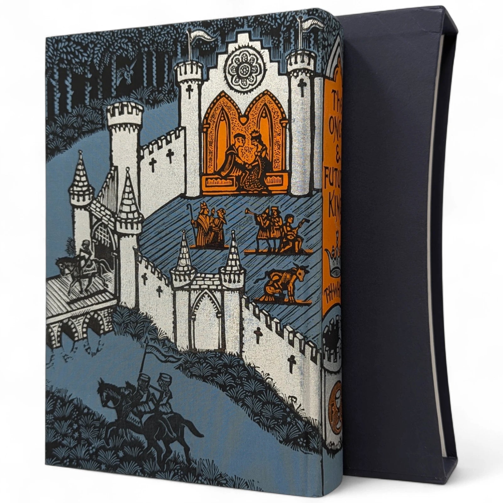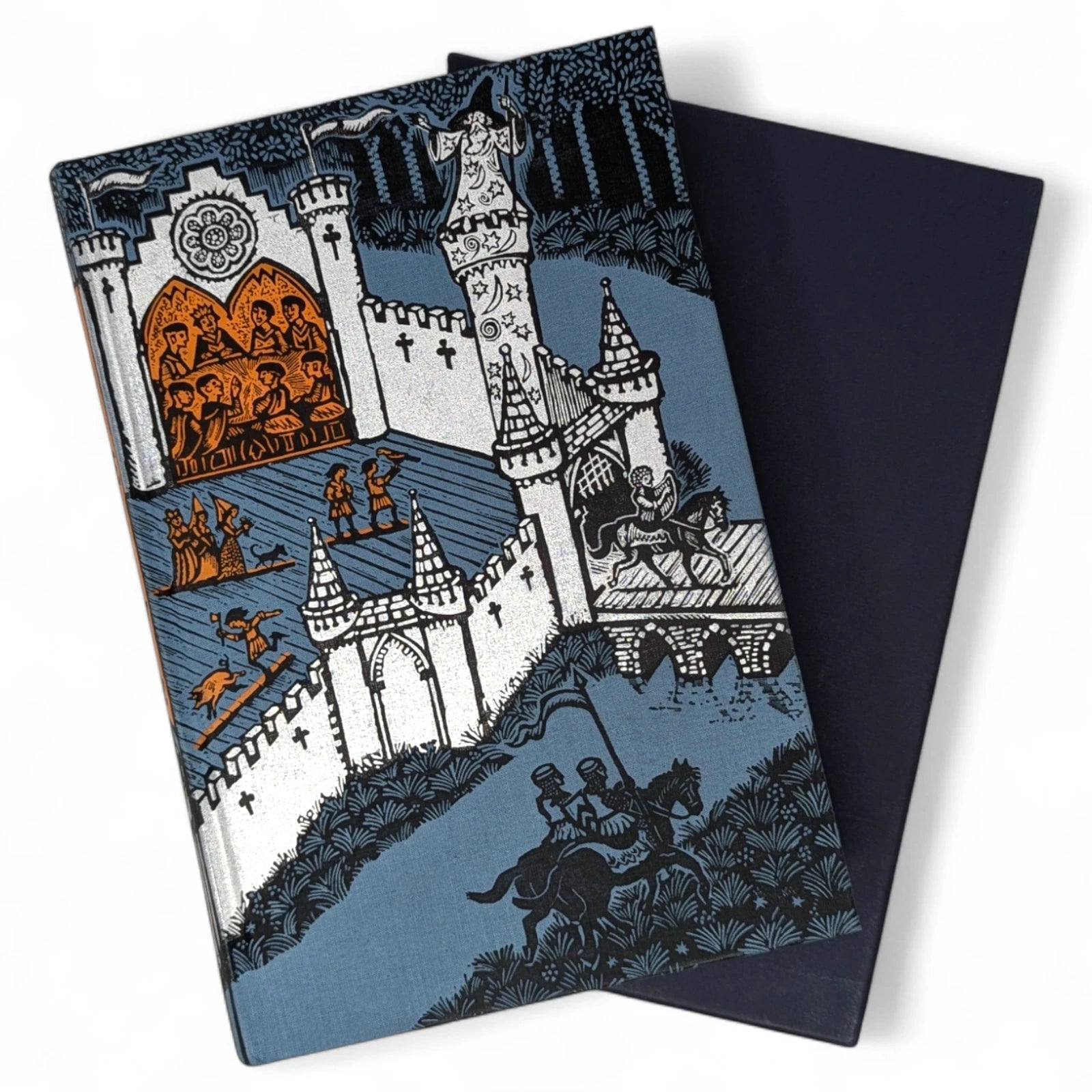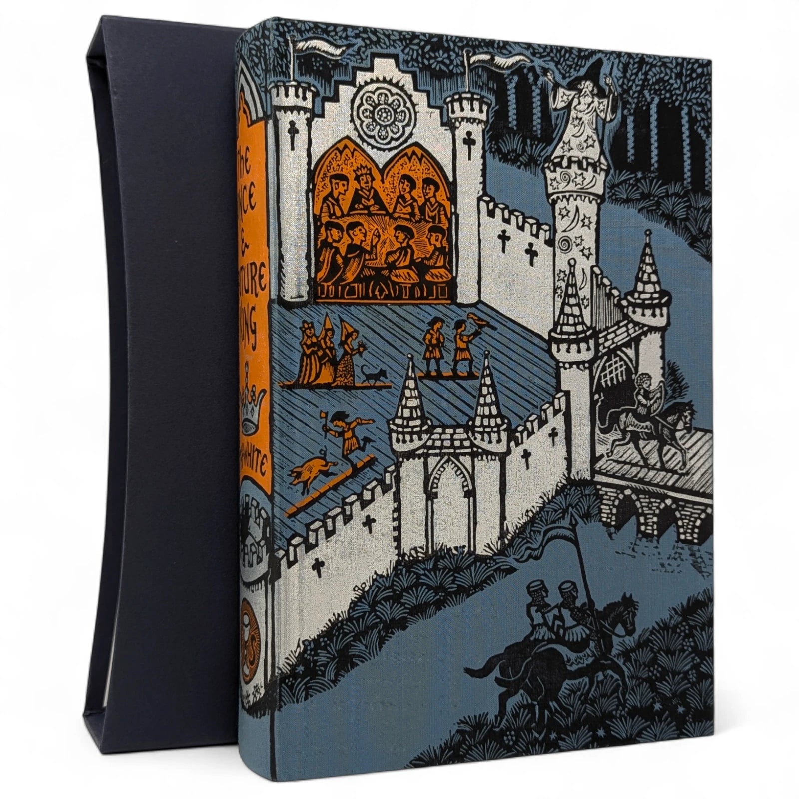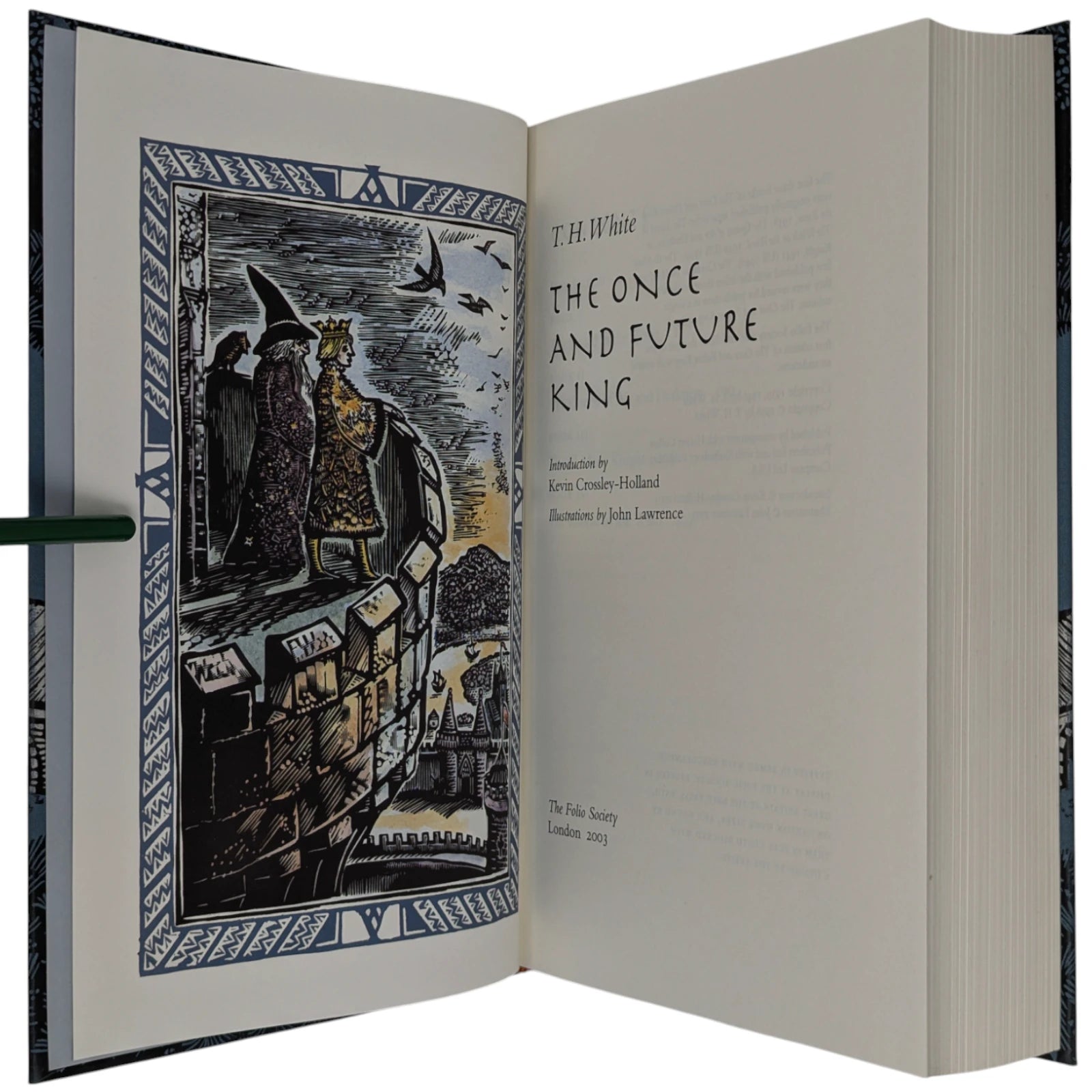 T.H. White, The Once and Future King. London: The Folio Society, 2003. First printing thus. Introduction by Kevin Crossley-Holland, illustrations by John Lawrence. 240 × 162 × 43 mm. Pp. [i–viii] ix–xvi [xvii–xviii], [1–2] 3–616 [617–622]: [17] leaves of colour plates. Type: Bembo with Herculanum for display. Printed and bound by the Bath Press. Full pale blue cloth with a design in orange, silver and black by Lawrence; metallic pale blue endleaves. Dark blue slip case. The plates are lithographic reproductions of wood-engravings with borders printed in a second colour and additional hand-colouring, and are quite delightful. This title was selected as the ‘Castaway’s Choice’ of John Amis and Juliet Barker.