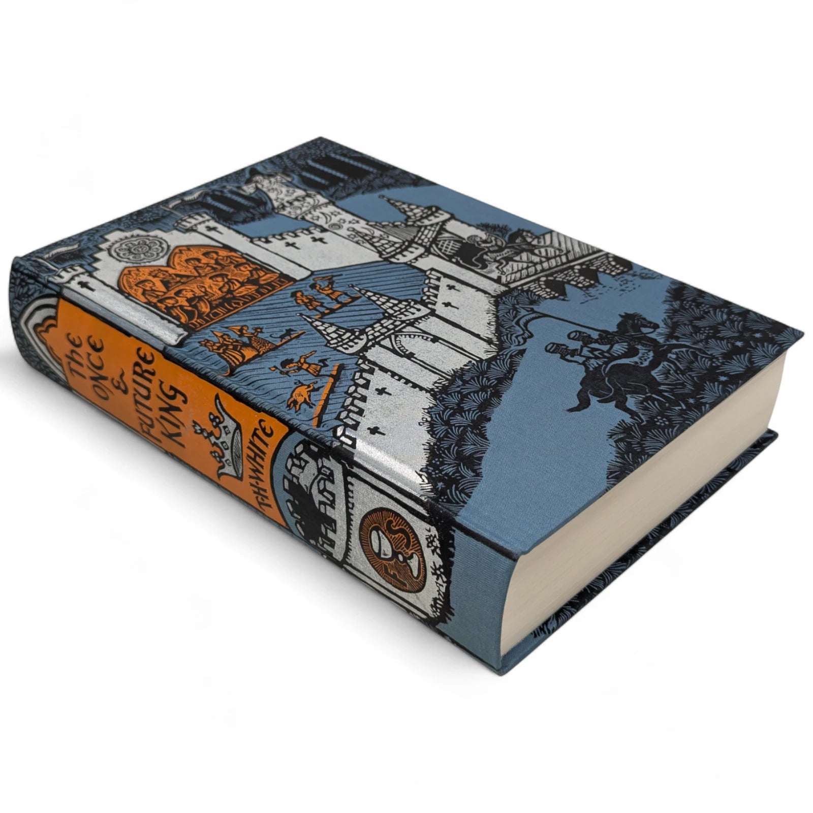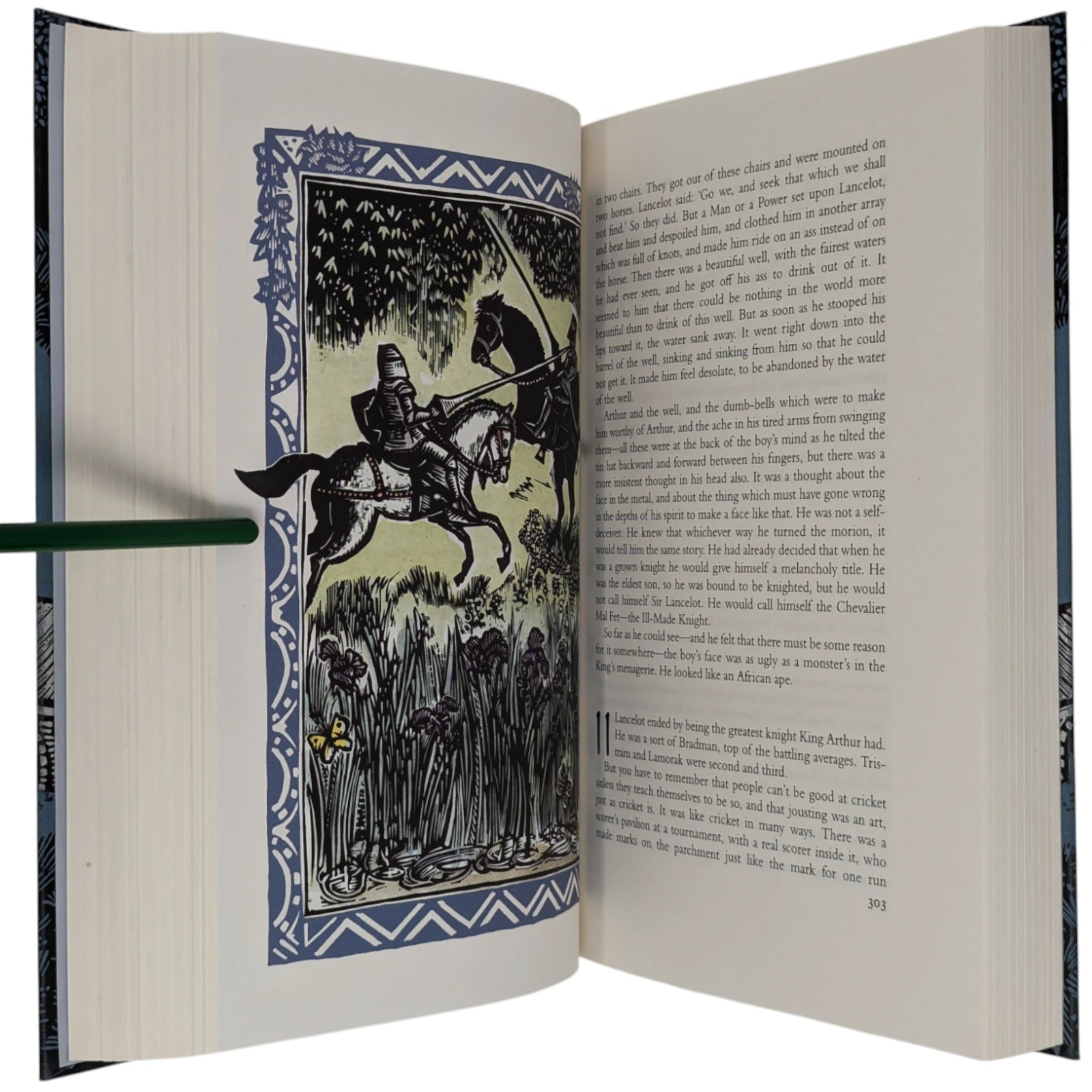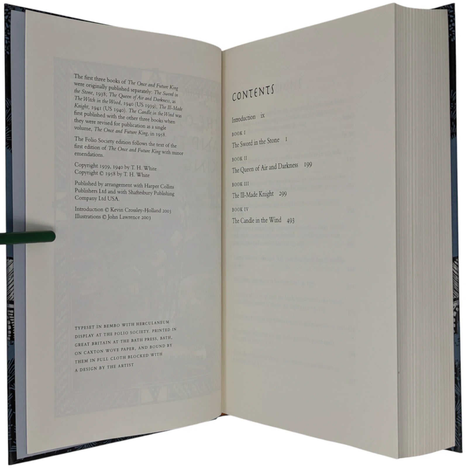 T.H. White, The Once and Future King. London: The Folio Society, 2003. First printing thus. Introduction by Kevin Crossley-Holland, illustrations by John Lawrence. 240 × 162 × 43 mm. Pp. [i–viii] ix–xvi [xvii–xviii], [1–2] 3–616 [617–622]: [17] leaves of colour plates. Type: Bembo with Herculanum for display. Printed and bound by the Bath Press. Full pale blue cloth with a design in orange, silver and black by Lawrence; metallic pale blue endleaves. Dark blue slip case. The plates are lithographic reproductions of wood-engravings with borders printed in a second colour and additional hand-colouring, and are quite delightful. This title was selected as the ‘Castaway’s Choice’ of John Amis and Juliet Barker.
