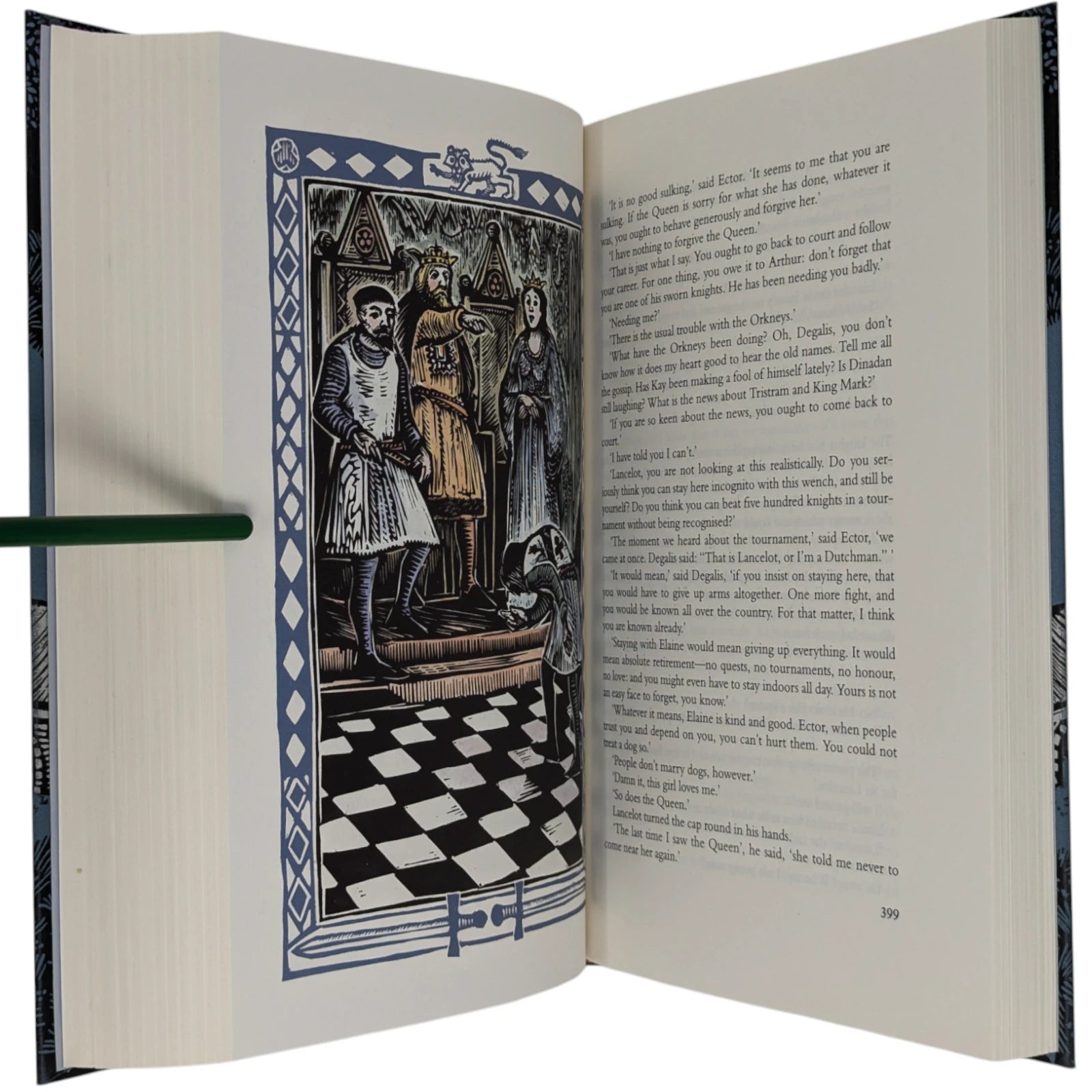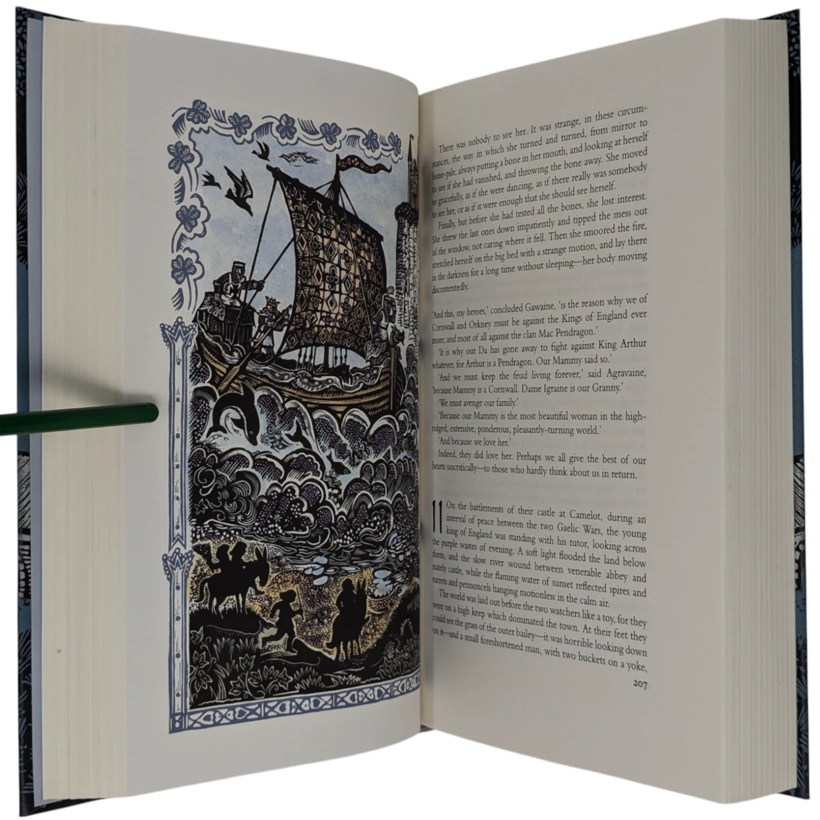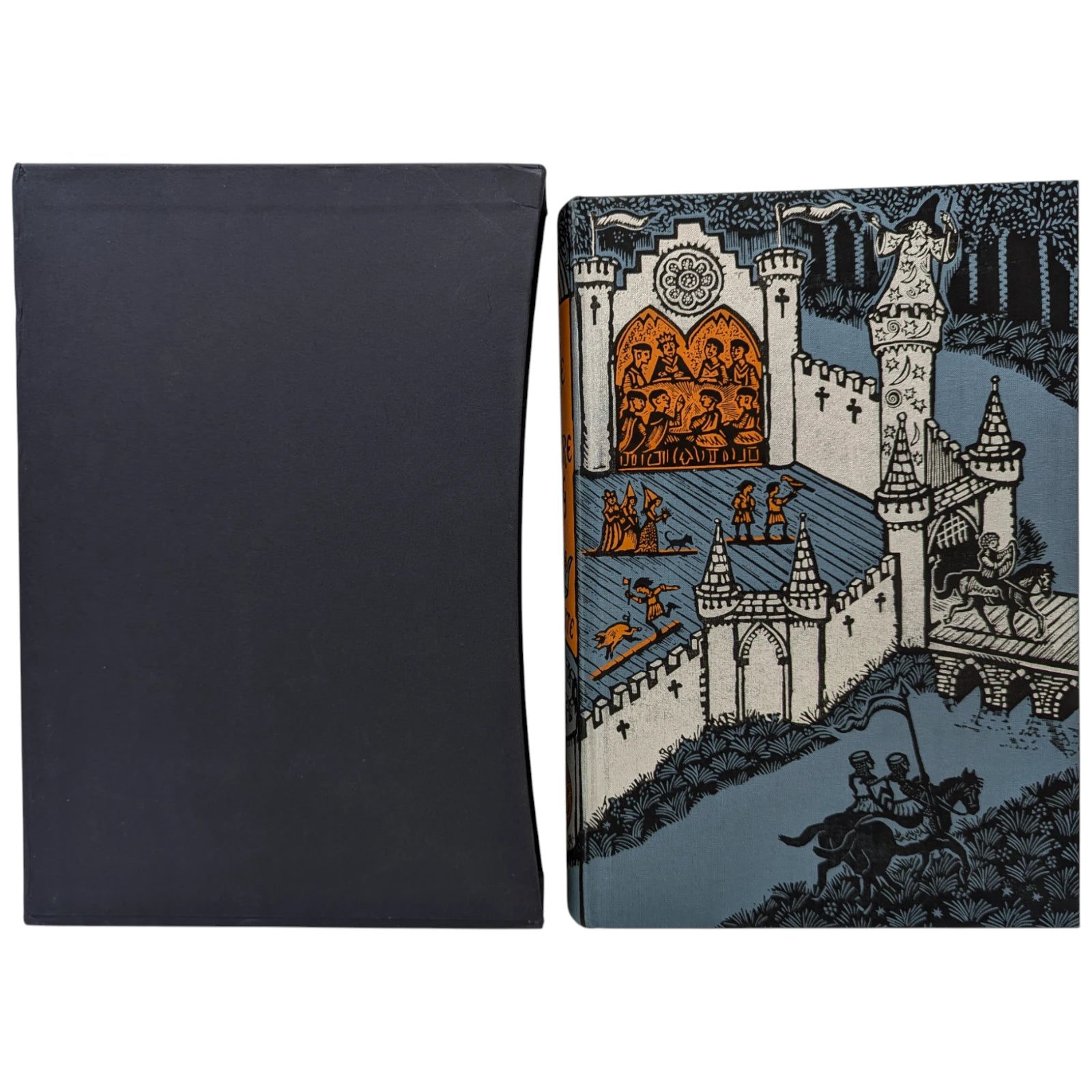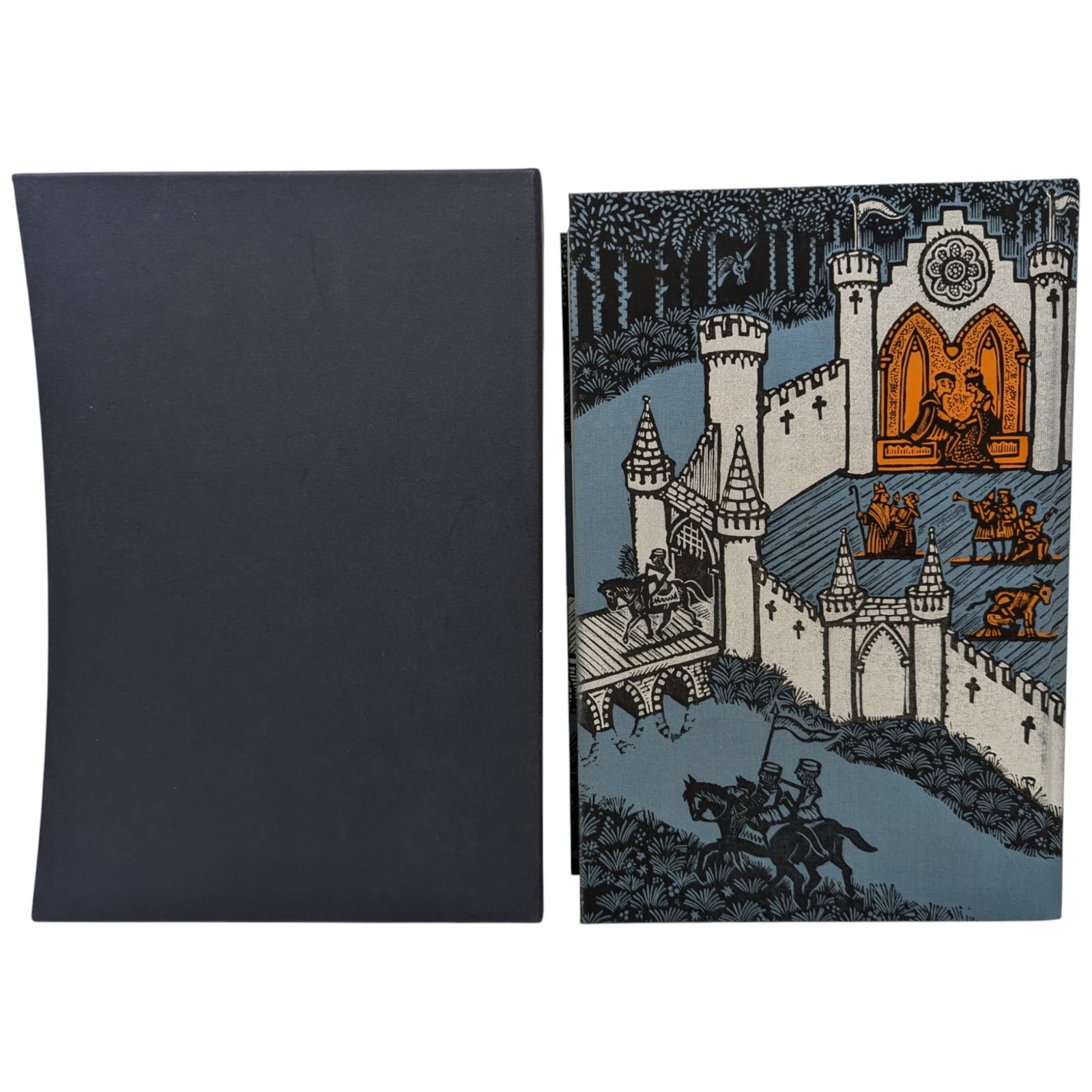 T.H. White, The Once and Future King. London: The Folio Society, 2003. First printing thus. Introduction by Kevin Crossley-Holland, illustrations by John Lawrence. 240 × 162 × 43 mm. Pp. [i–viii] ix–xvi [xvii–xviii], [1–2] 3–616 [617–622]: [17] leaves of colour plates. Type: Bembo with Herculanum for display. Printed and bound by the Bath Press. Full pale blue cloth with a design in orange, silver and black by Lawrence; metallic pale blue endleaves. Dark blue slip case. The plates are lithographic reproductions of wood-engravings with borders printed in a second colour and additional hand-colouring, and are quite delightful. This title was selected as the ‘Castaway’s Choice’ of John Amis and Juliet Barker.