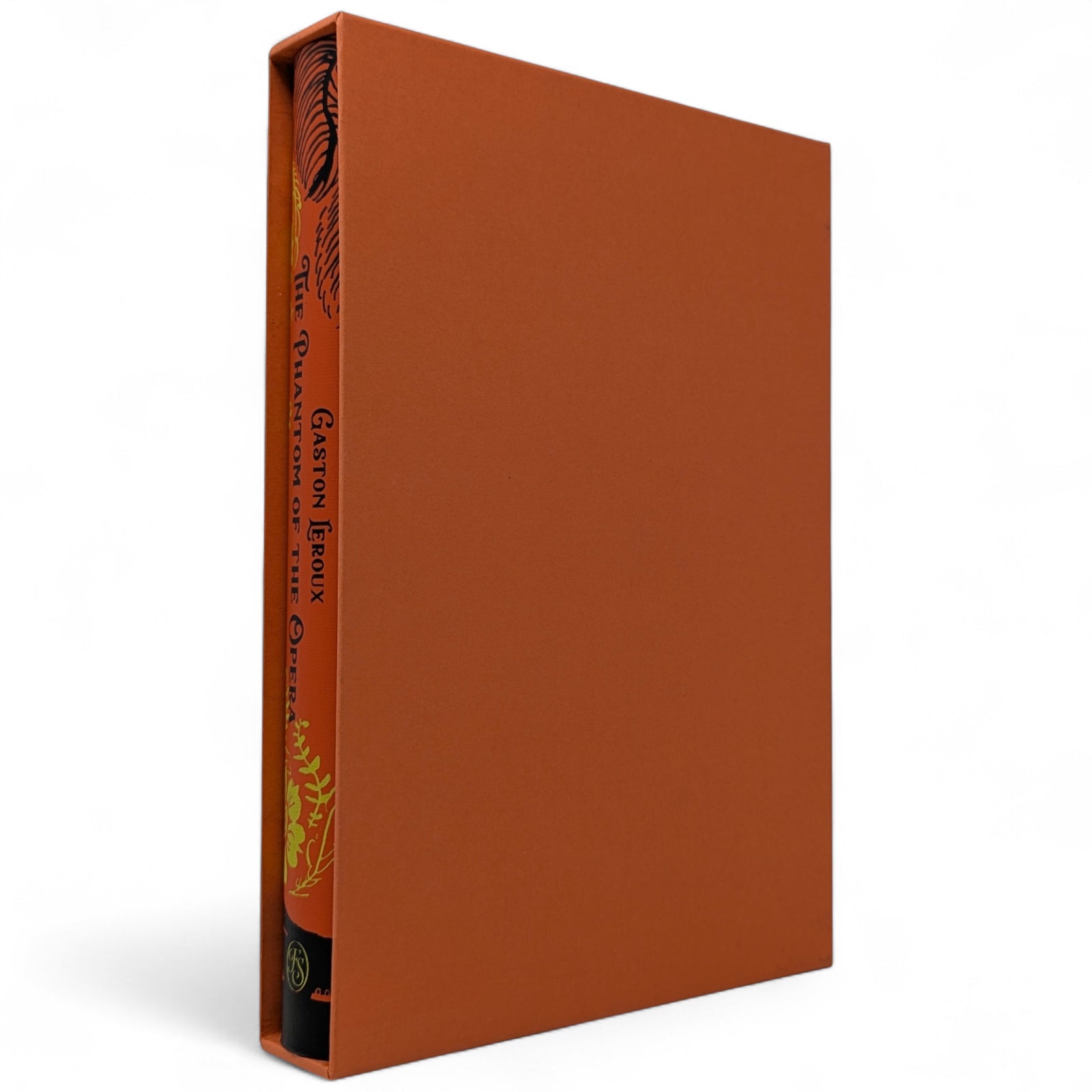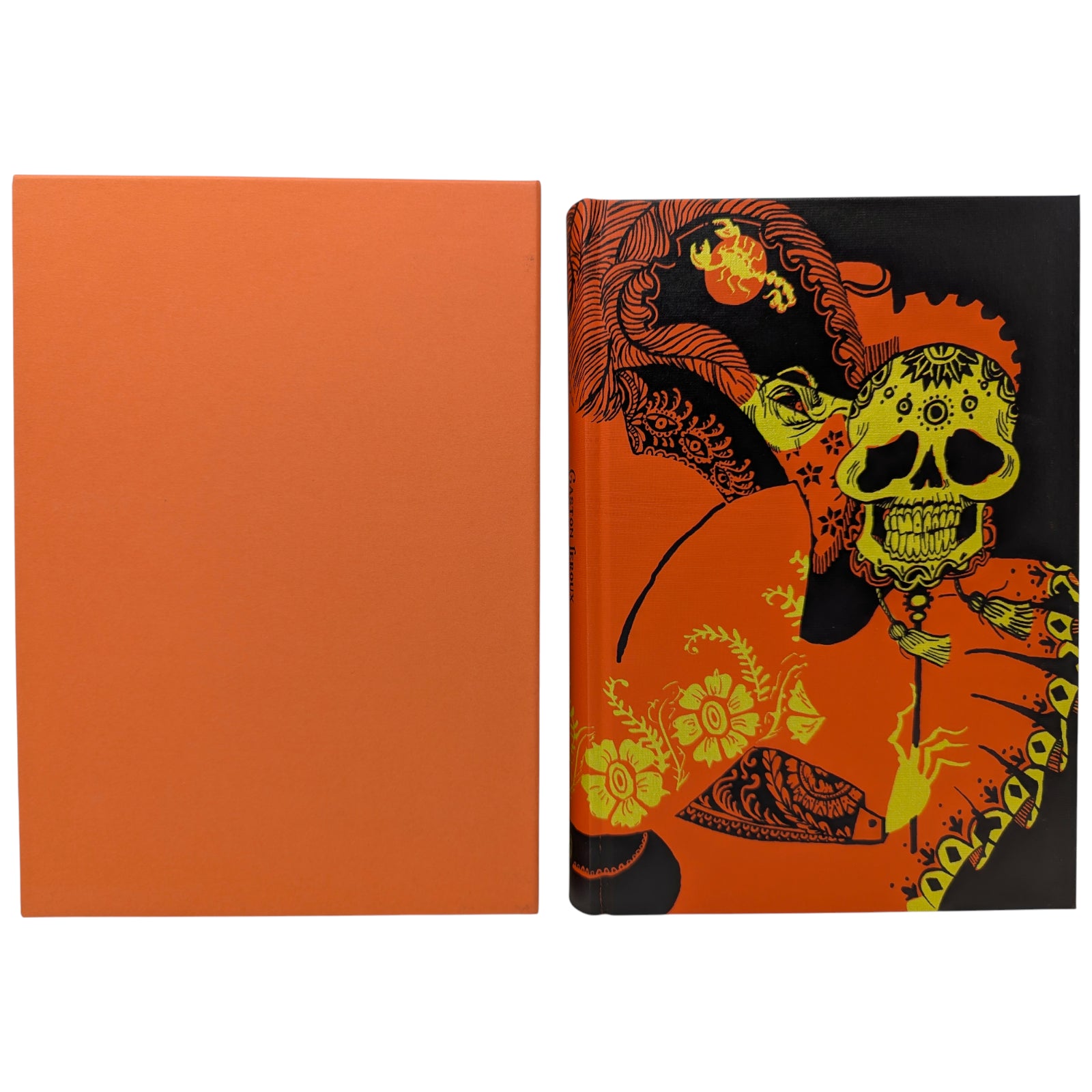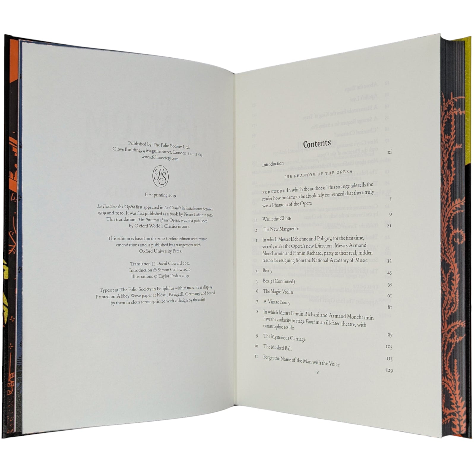 Gaston Leroux, The Phantom of the Opera. London: The Folio Society, 2019. First printing thus. Translated by David Coward, introduced by Simon Callow, illustrated by Taylor Dolan. 252 × 177 × 31 mm. Pp. [1–2], [i–iv] v–xx, [1–4] 5–333 [334–338]: [9] leaves of colour plates (facing pp. [iii], 26, 146, 163, [194], and between pp. [290]–291 and 330–331). Type: Poliphilus with Amarante for display. Printed and bound by Kösel in full orange cloth printed in black and metallic pale green with design by Dolan. Edges printed with design in black and orange. Orange endleaves printed with designs in black. Orange slip case. Two of the plates are double-page spreads. Dolan has also provided 27 black and white chapter openings.