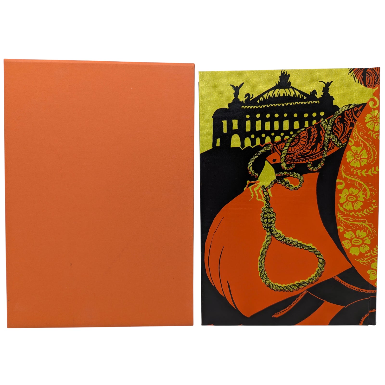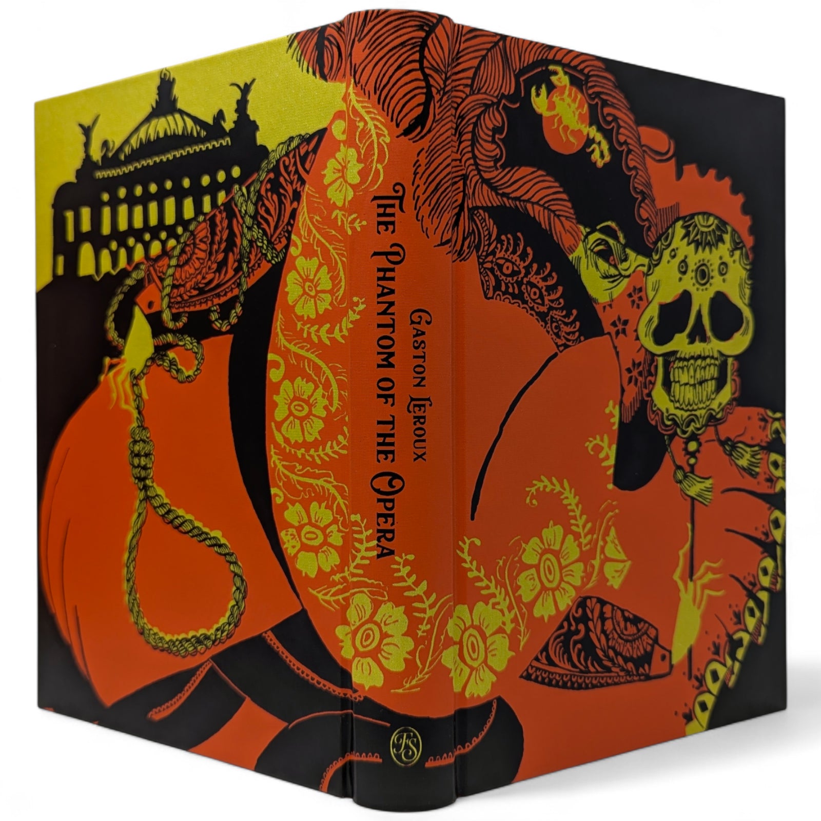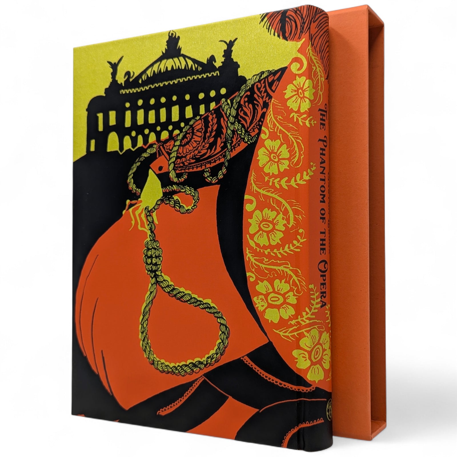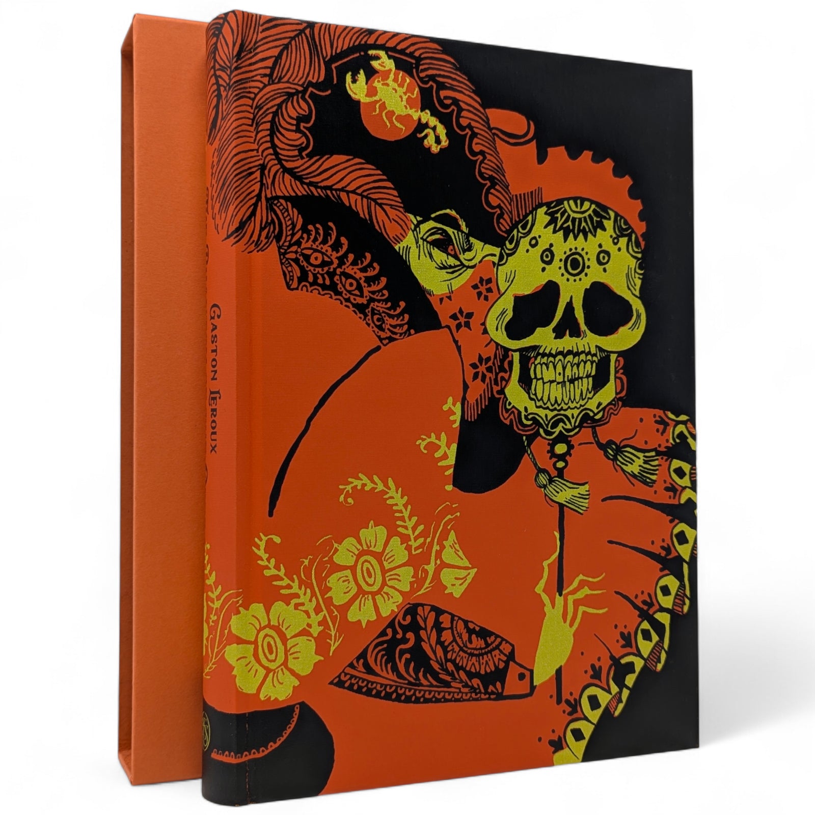 Gaston Leroux, The Phantom of the Opera. London: The Folio Society, 2019. First printing thus. Translated by David Coward, introduced by Simon Callow, illustrated by Taylor Dolan. 252 × 177 × 31 mm. Pp. [1–2], [i–iv] v–xx, [1–4] 5–333 [334–338]: [9] leaves of colour plates (facing pp. [iii], 26, 146, 163, [194], and between pp. [290]–291 and 330–331). Type: Poliphilus with Amarante for display. Printed and bound by Kösel in full orange cloth printed in black and metallic pale green with design by Dolan. Edges printed with design in black and orange. Orange endleaves printed with designs in black. Orange slip case. Two of the plates are double-page spreads. Dolan has also provided 27 black and white chapter openings.