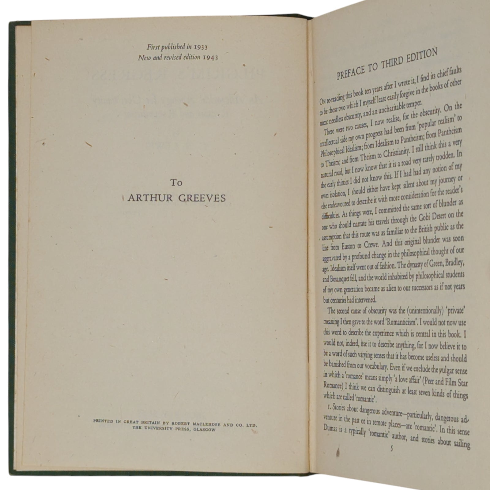 LEWIS, C. S. The Pilgrim's Regress: An Allegorical Apology for Christianity, Reason and Romanticism. London: Geoffrey Bles, 1943. Originally published in 1933, this is the first printing of the new and revised edition of Lewis' first published work of prose fiction, third work to be published and first after he converted to Christianity.
