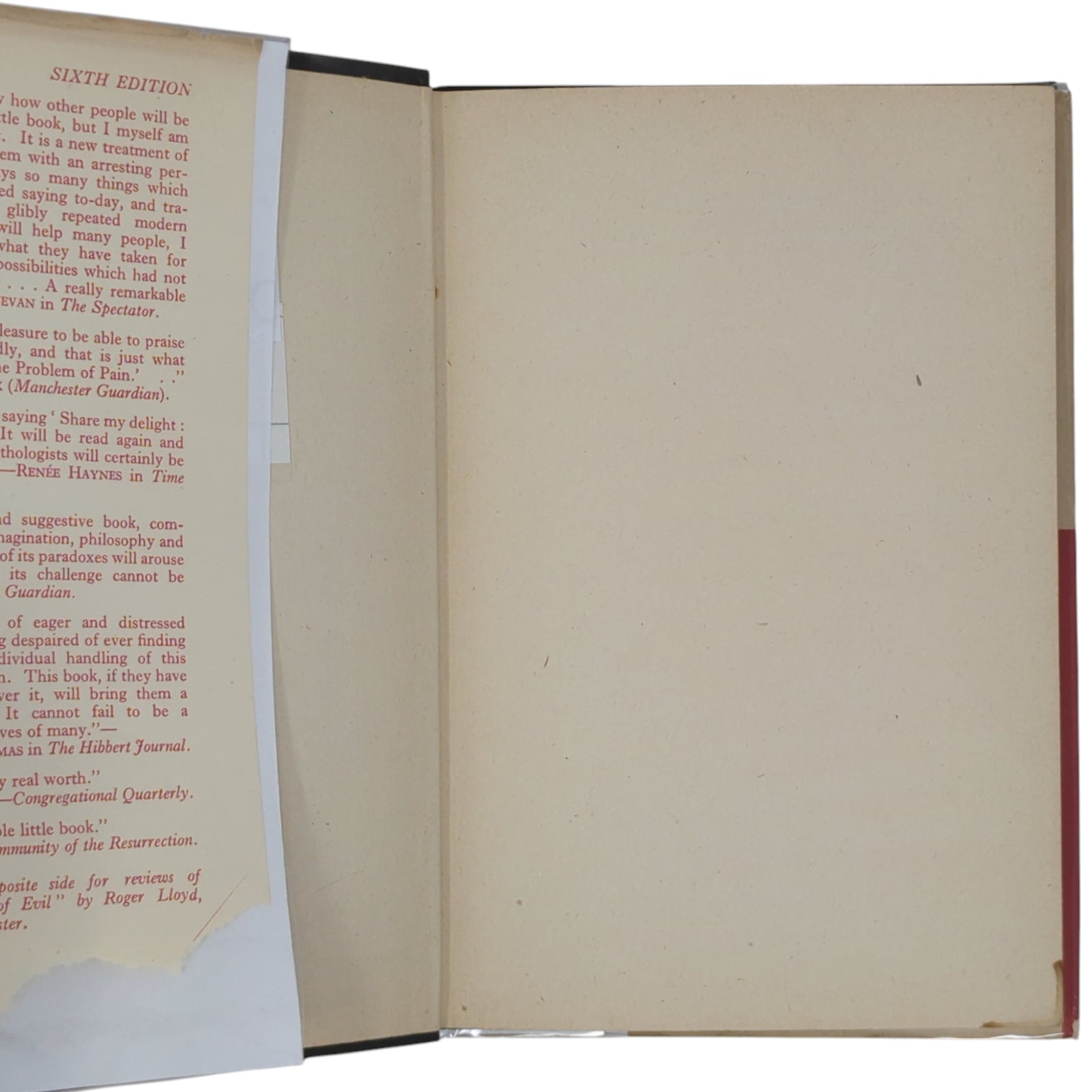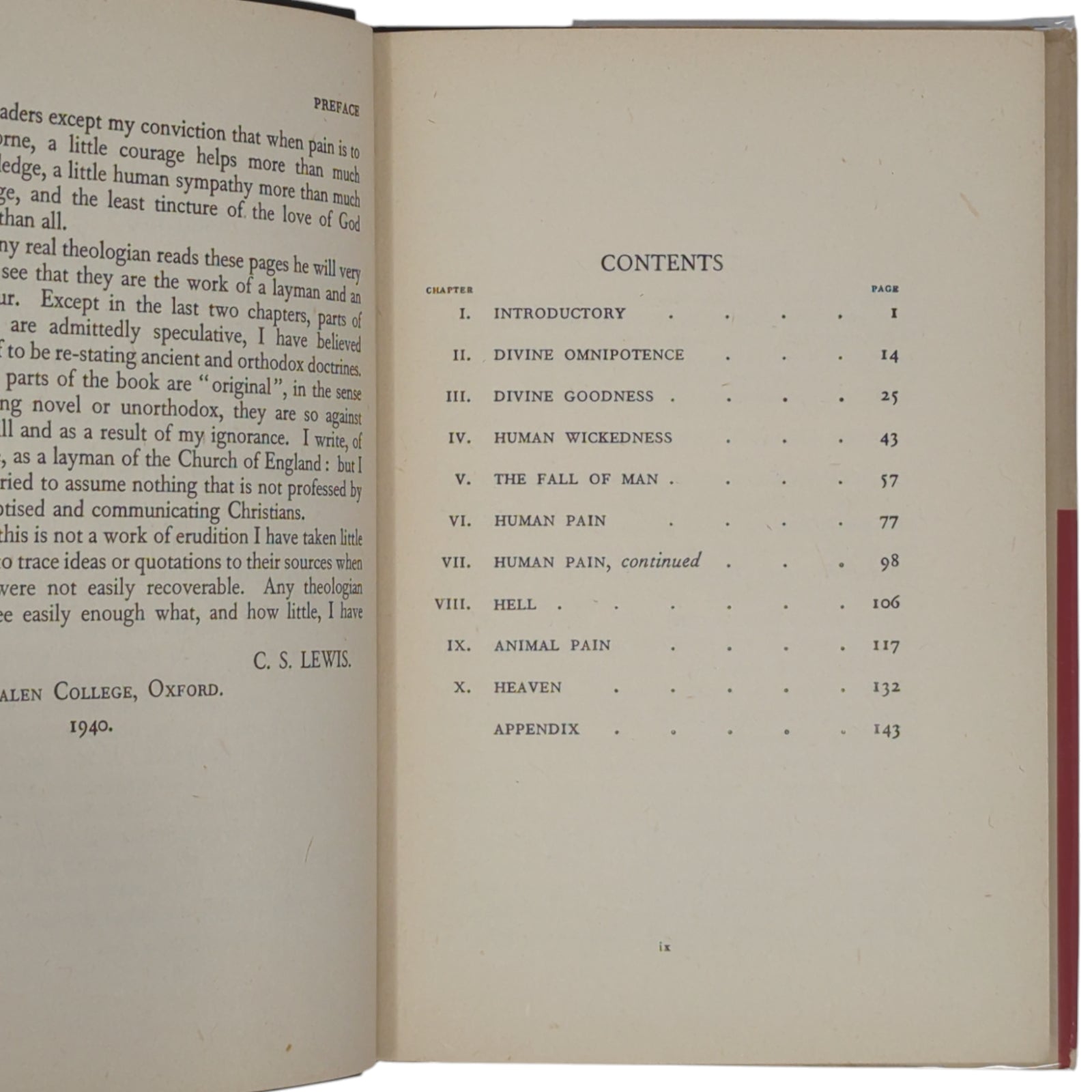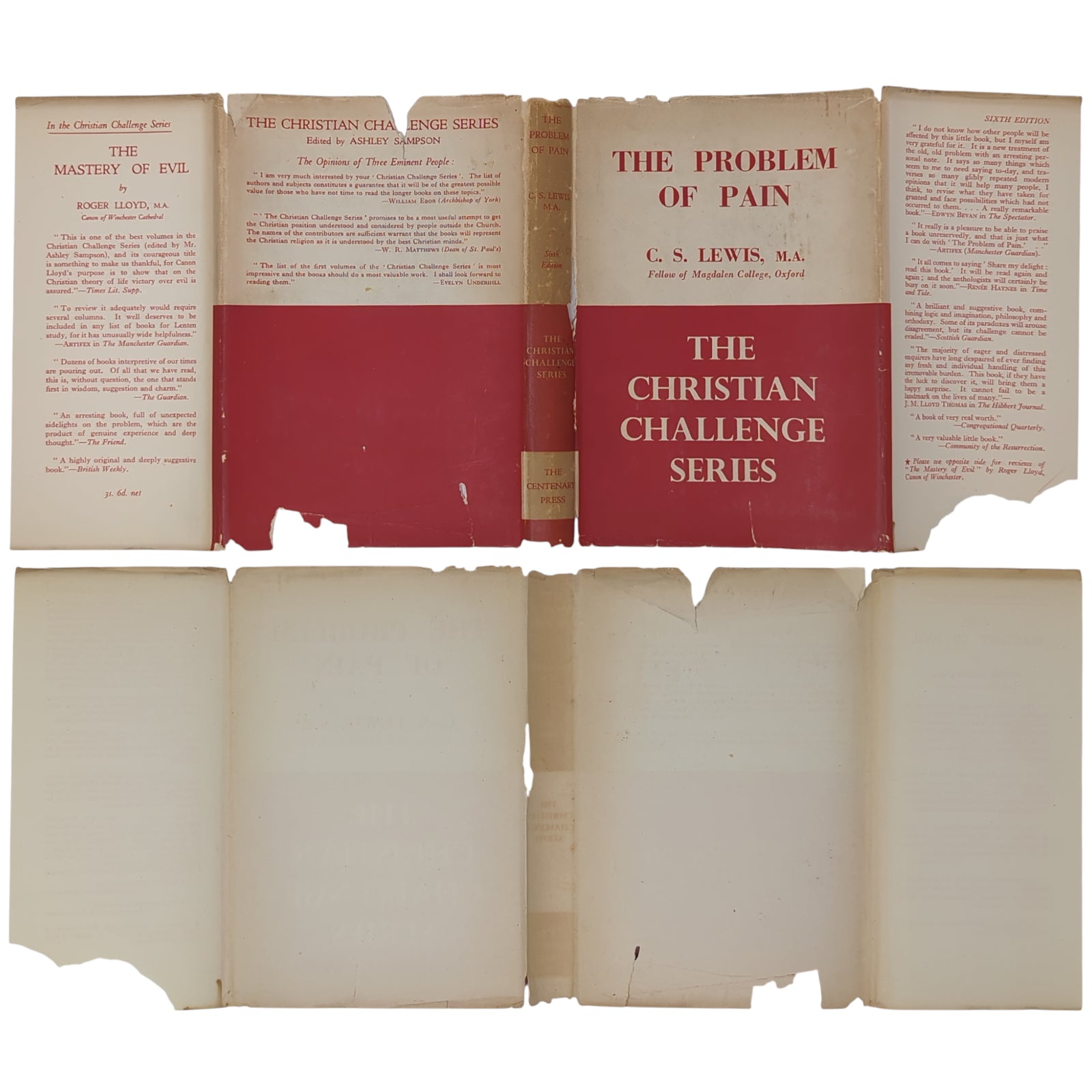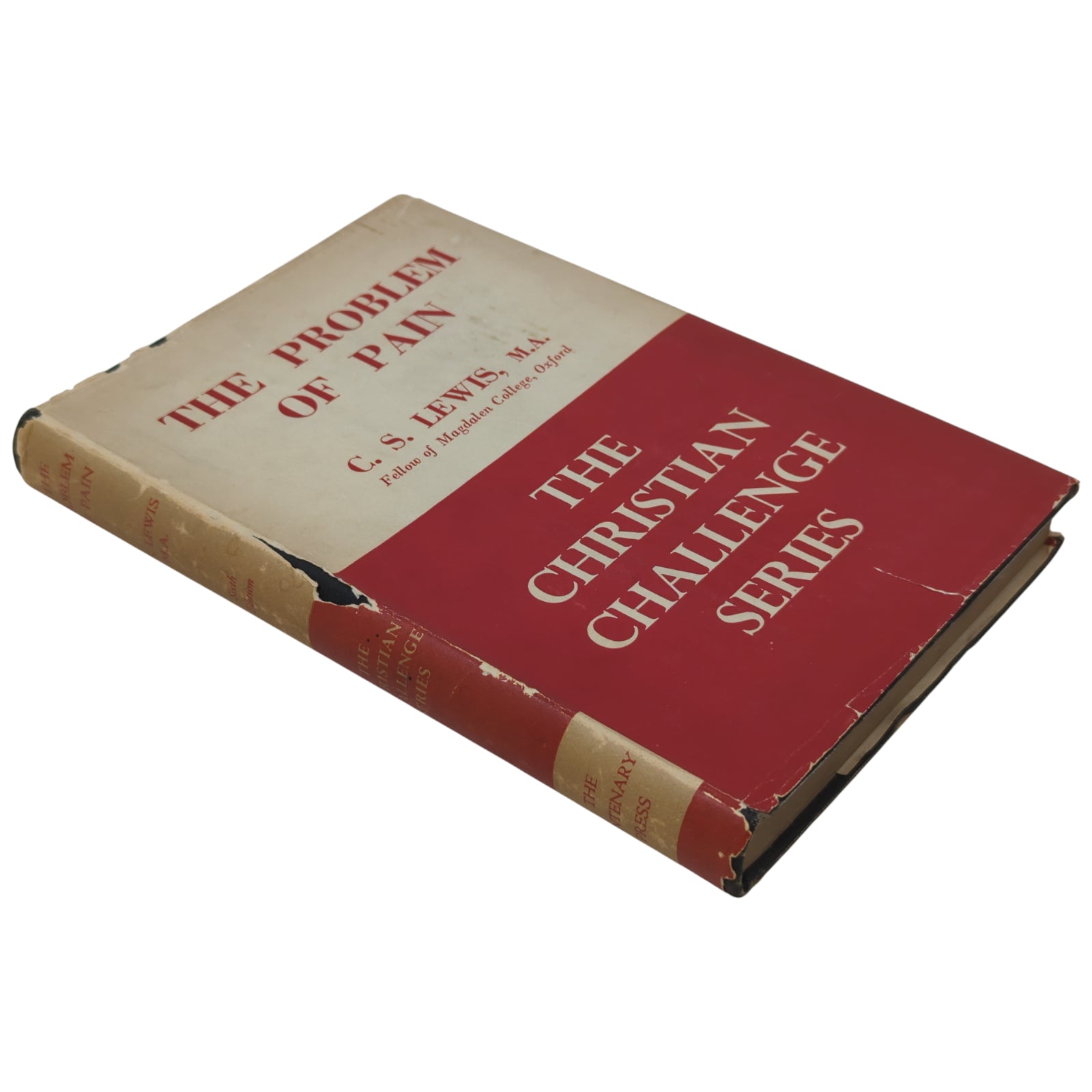 LEWIS, C.S. The Problem of Pain [The Christian Challenge Series]. London: Geoffrey Bles, 1940. First edition, 6th printing (October 1941) of the author's examination of the age-old question of how there can be suffering while God is all-powerful and still good. Publisher's black cloth, clear label with title to spine; with price-clipped dustwrapper.