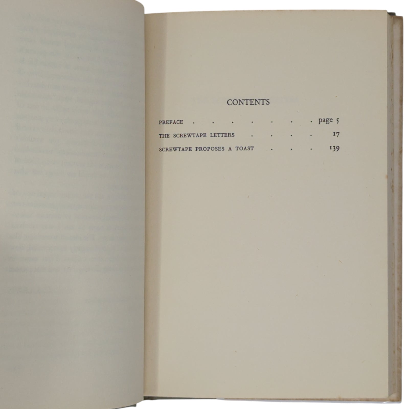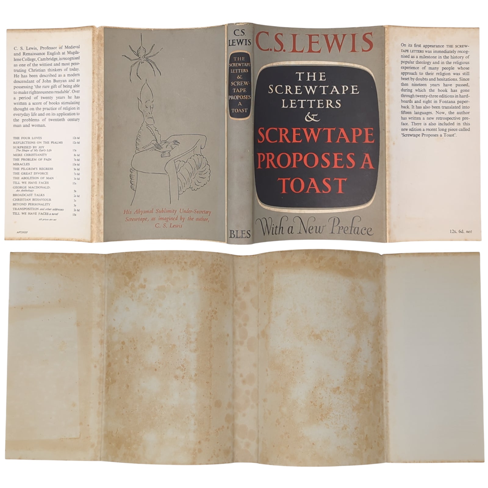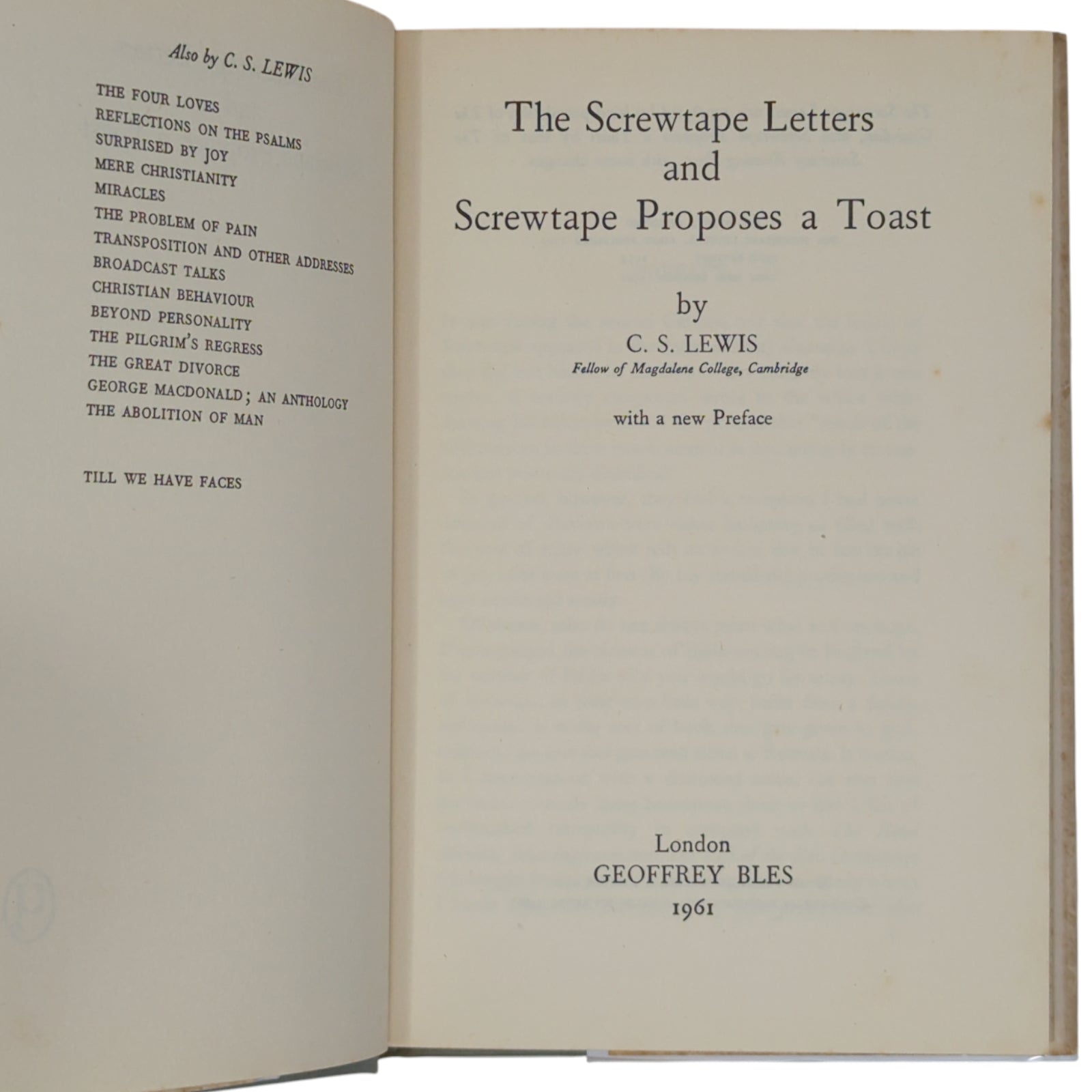 LEWIS, C.S. The Screwtape Letters and Screwtape Proposes a Toast. London: Geoffrey Bles, 1961. First "new edition" combining both The Screwtape Letters and the later satirical lecture Screwtape Proposes a Toast. With a new and additional Preface by the author.