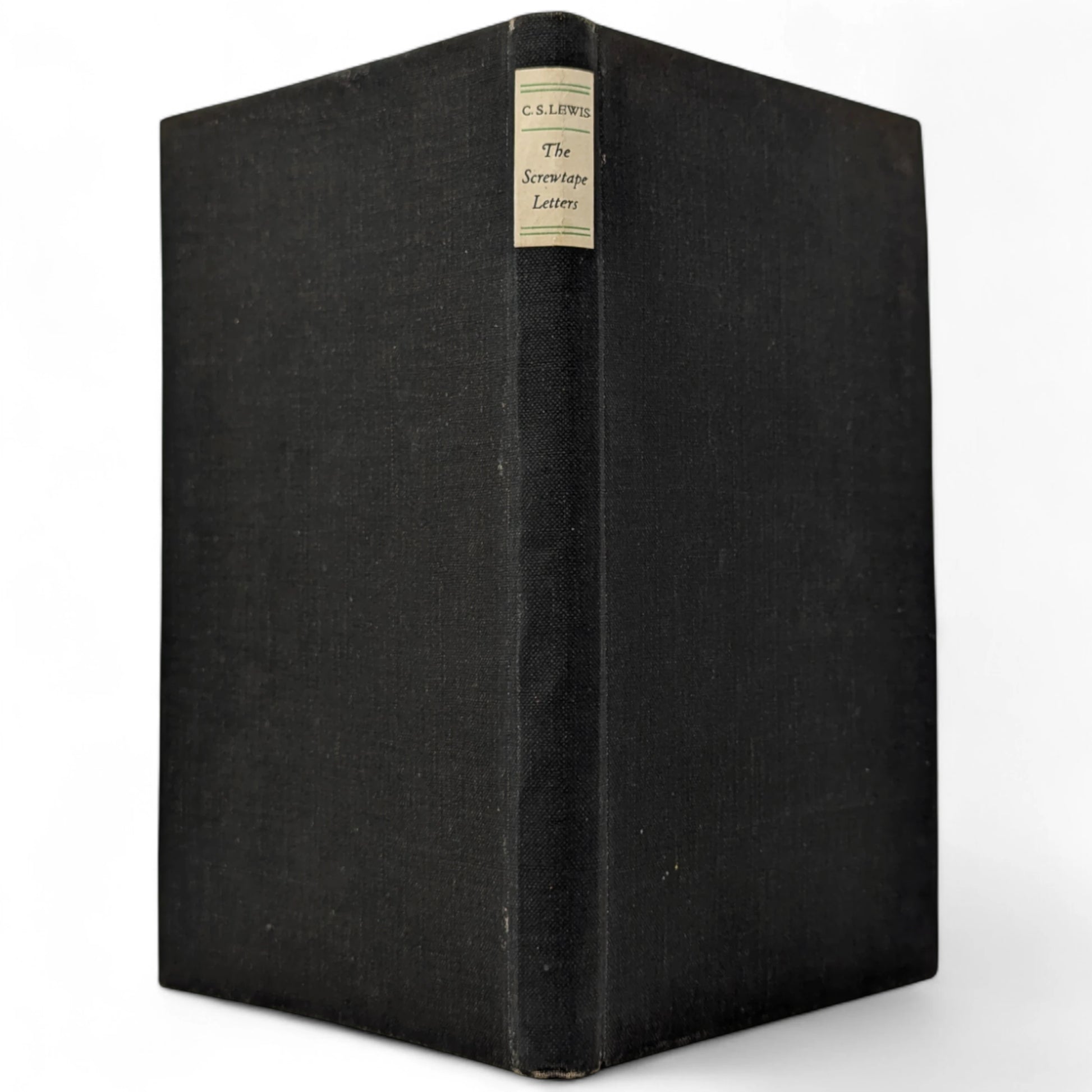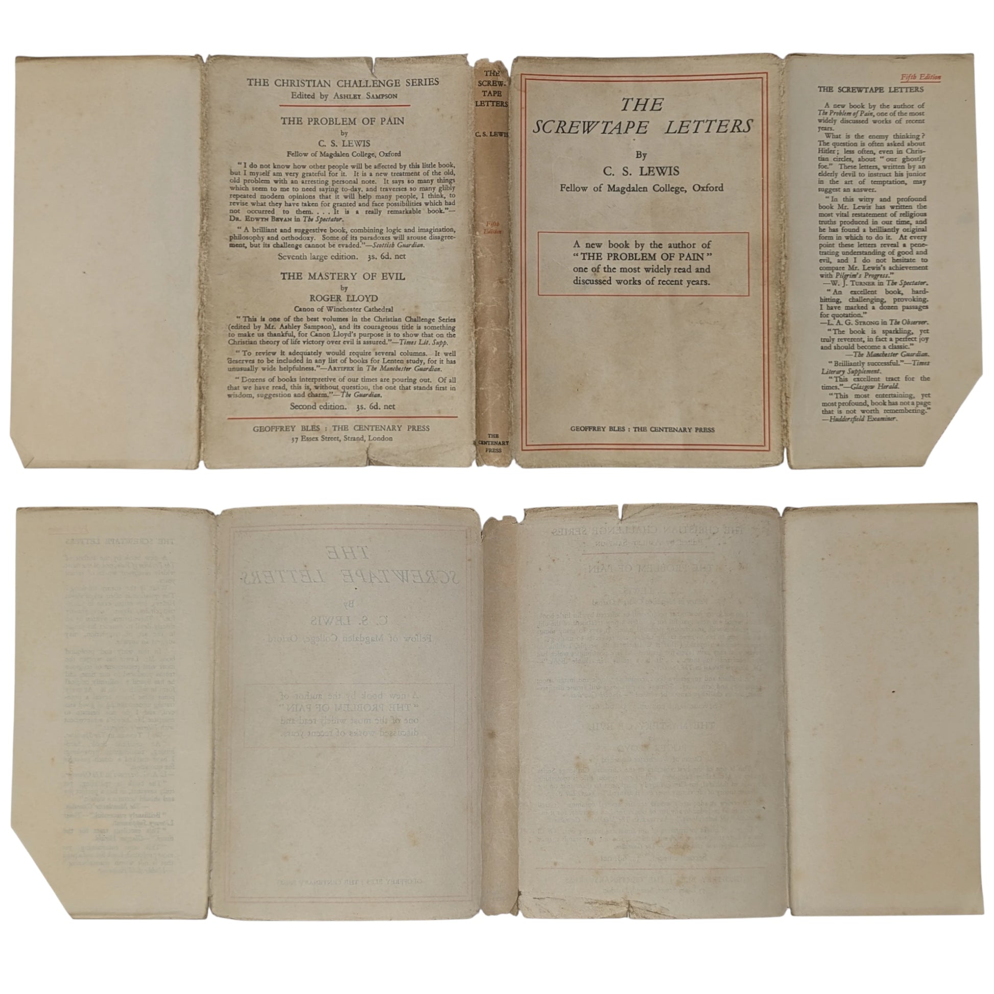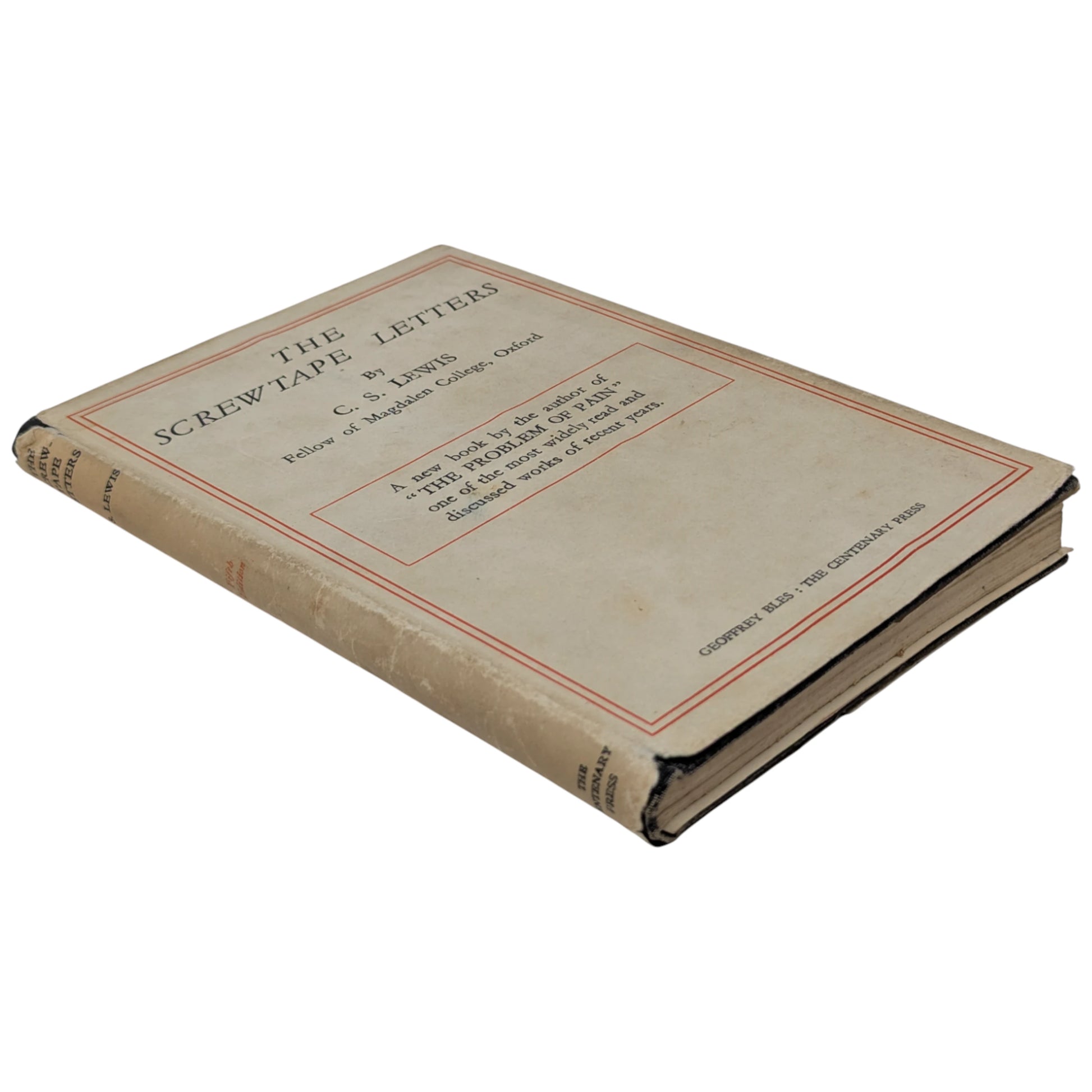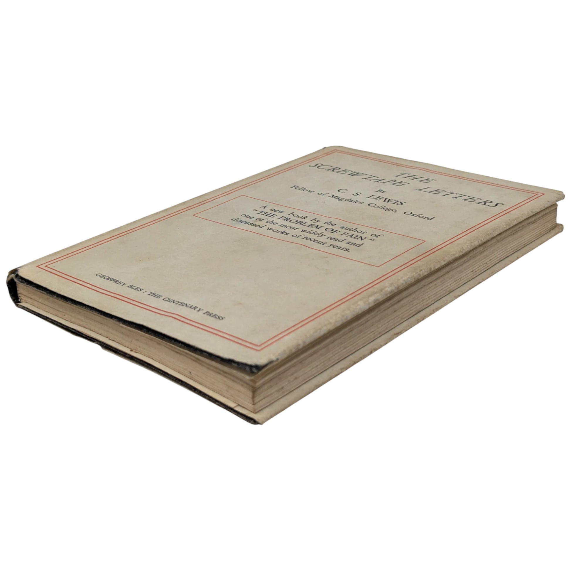 LEWIS, C.S. The Screwtape Letters. London: Geoffrey Bles, 1942. First edition, sixth printing, 1942. Publisher's black cloth, clear label with title to spinel with earlier (fifth edition) price-clipped dustwrapper.