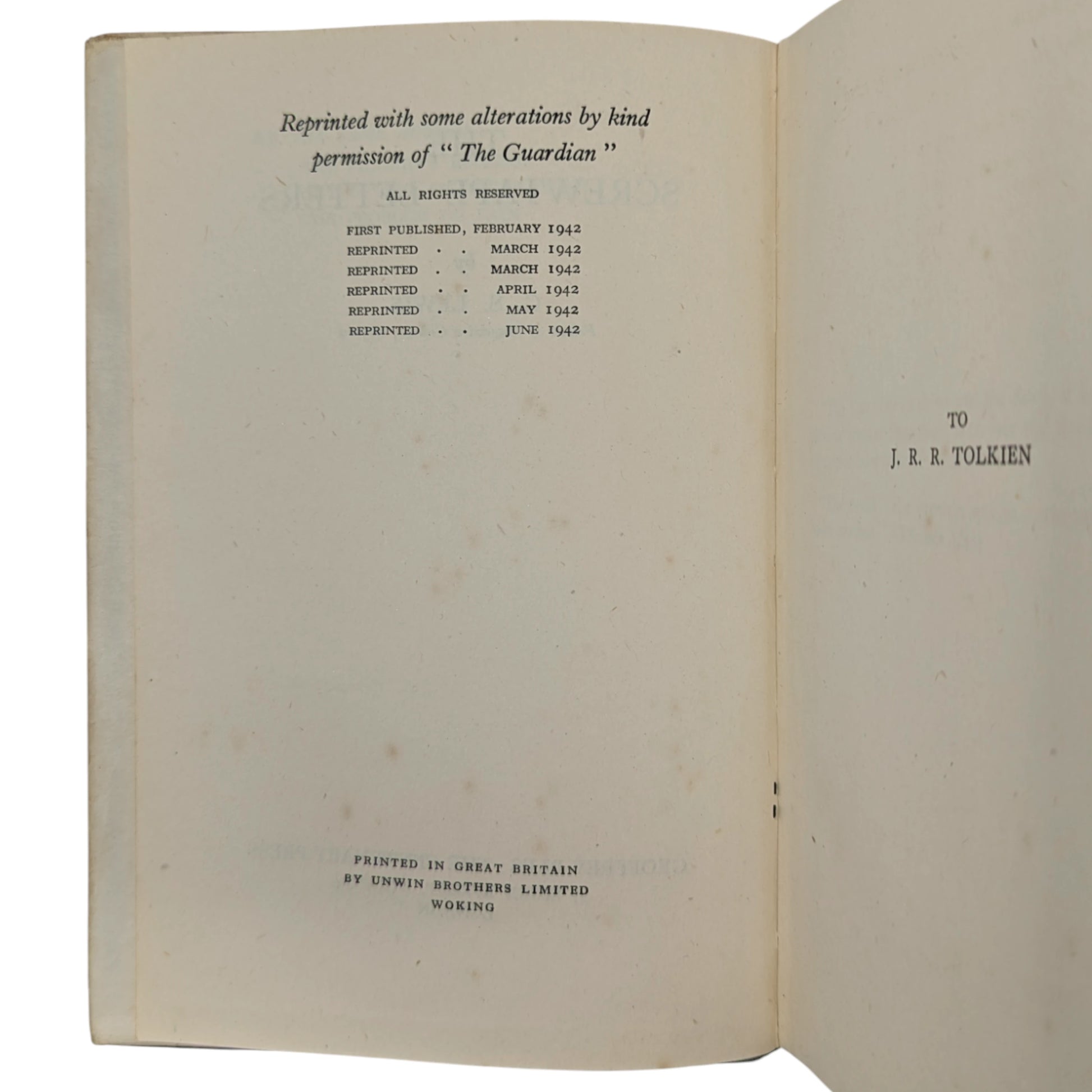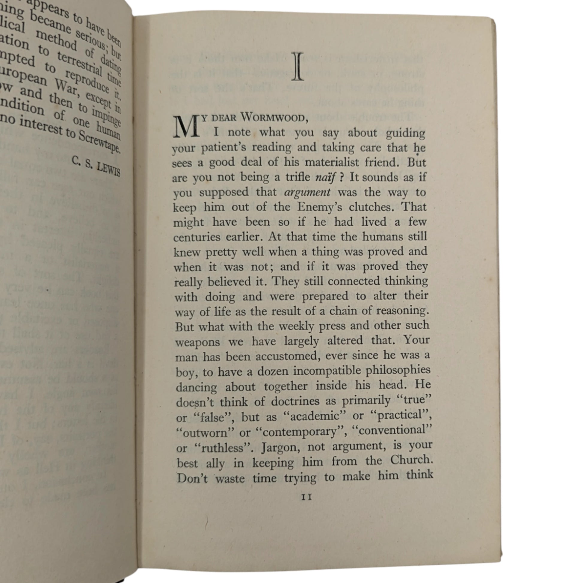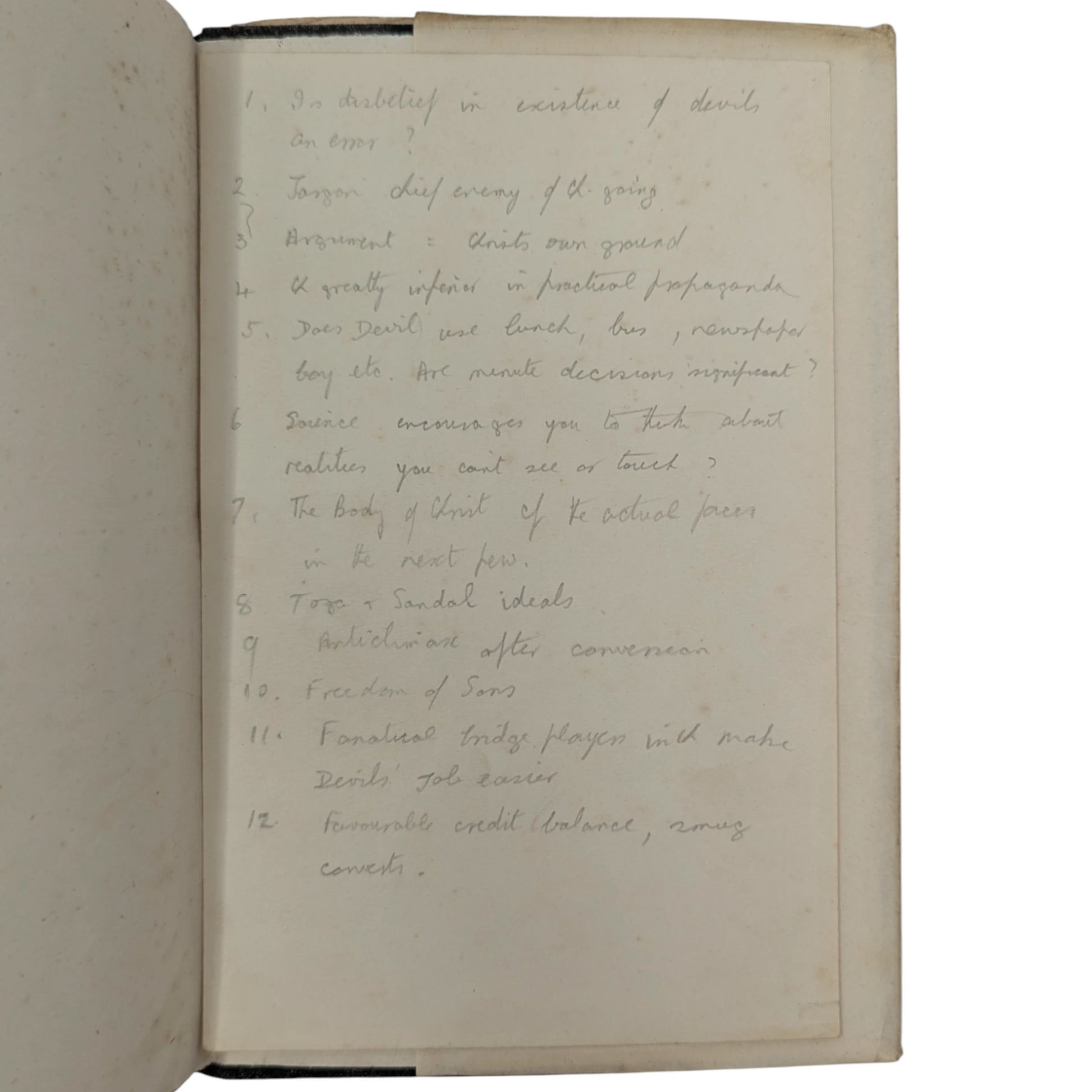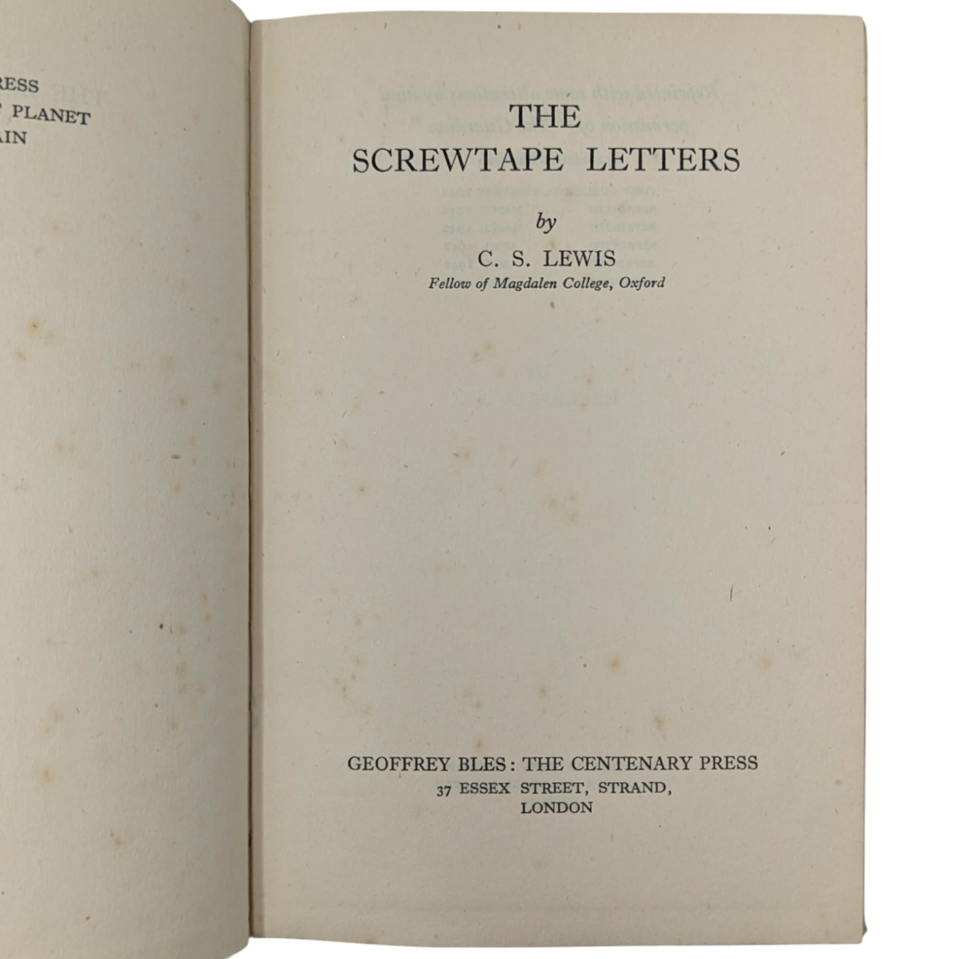 LEWIS, C.S. The Screwtape Letters. London: Geoffrey Bles, 1942. First edition, sixth printing, 1942. Publisher's black cloth, clear label with title to spinel with earlier (fifth edition) price-clipped dustwrapper.