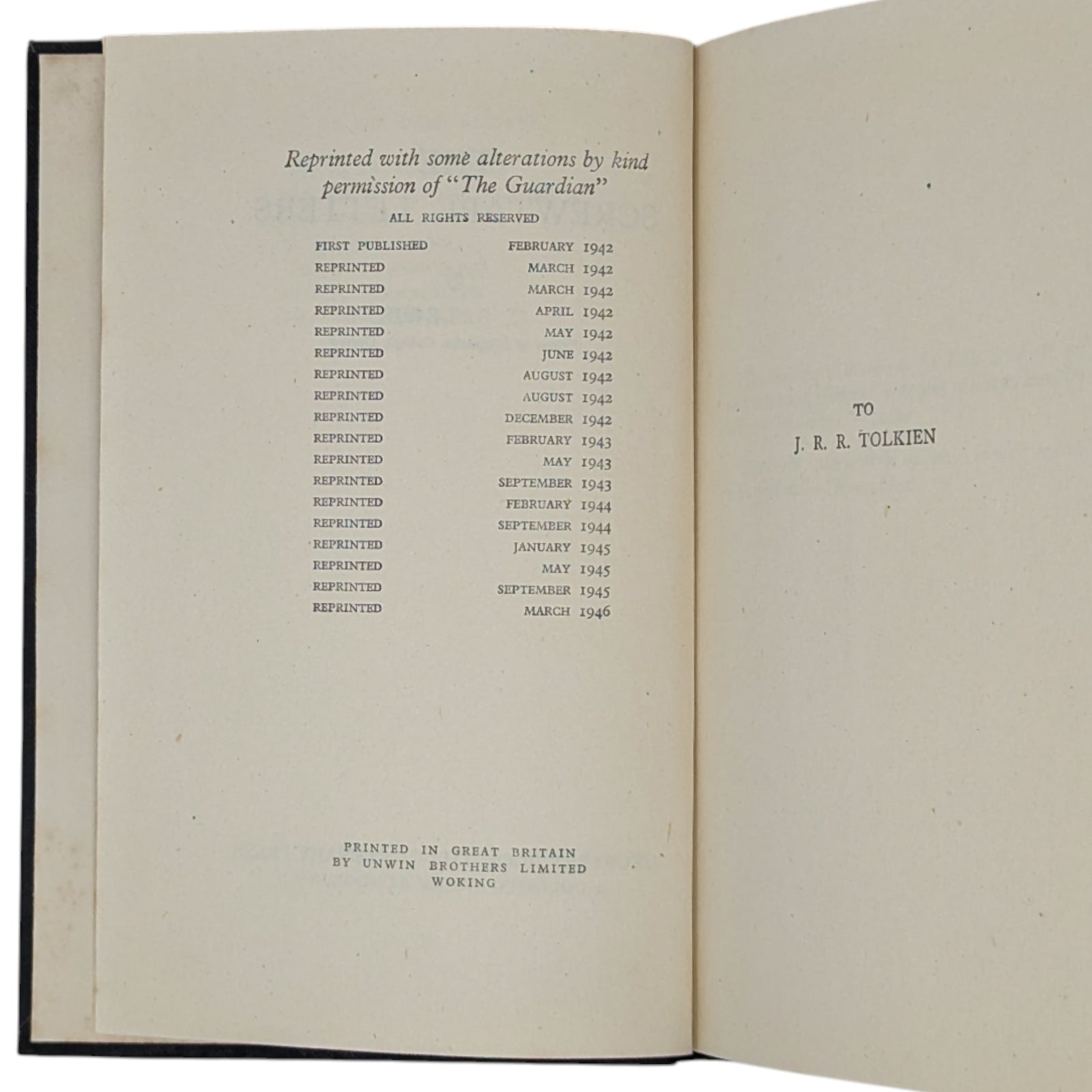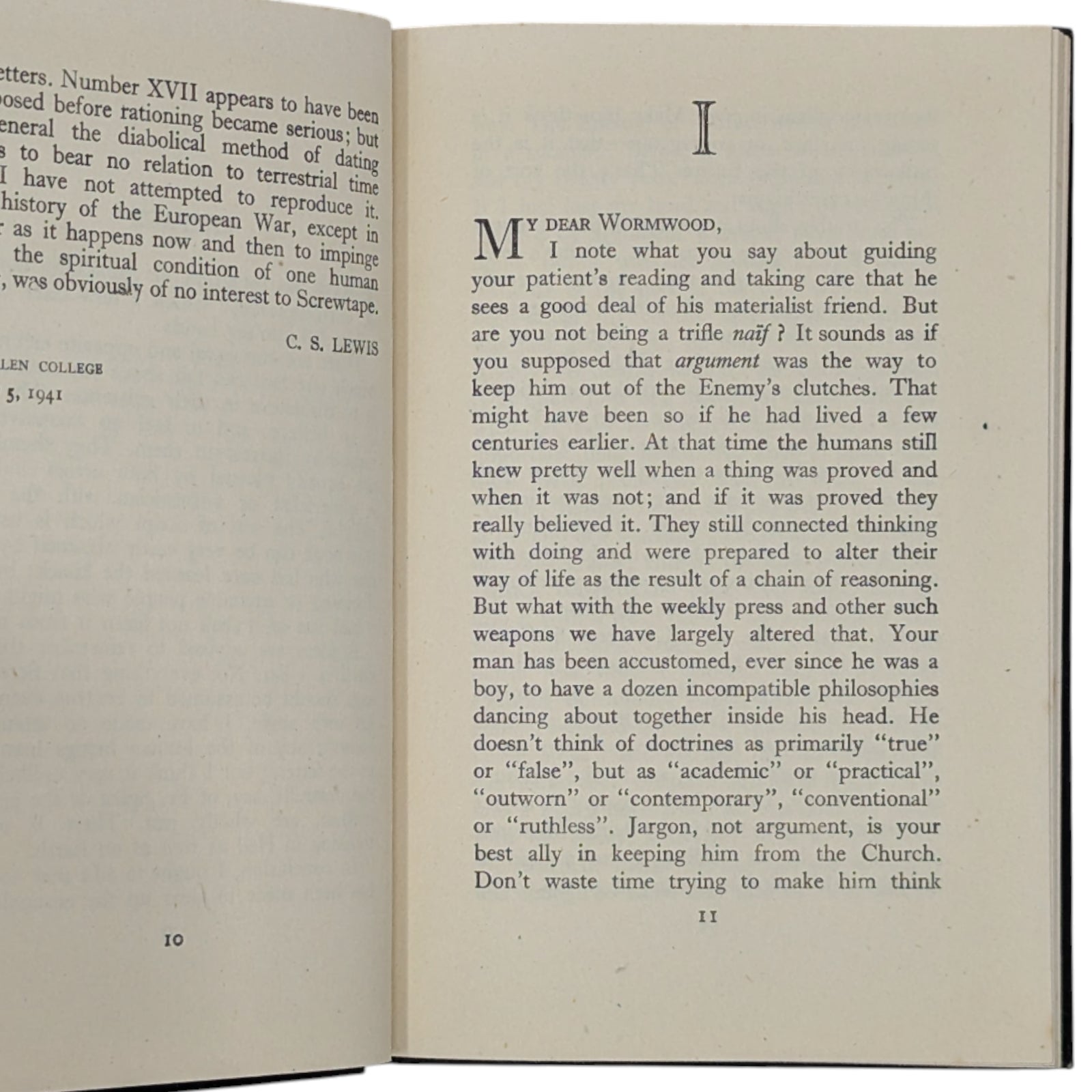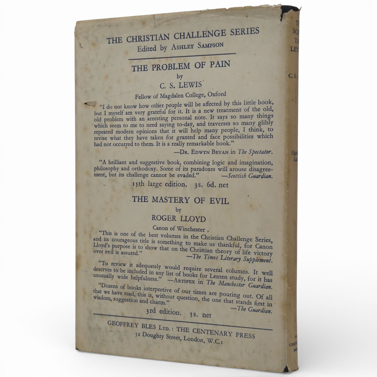 LEWIS, C.S. The Screwtape Letters. London: Geoffrey Bles, 1942. First edition, very late printing, March 1946. Publisher's black cloth, clear label with title to spine; with original, unclipped (5s. net) dustwrapper.