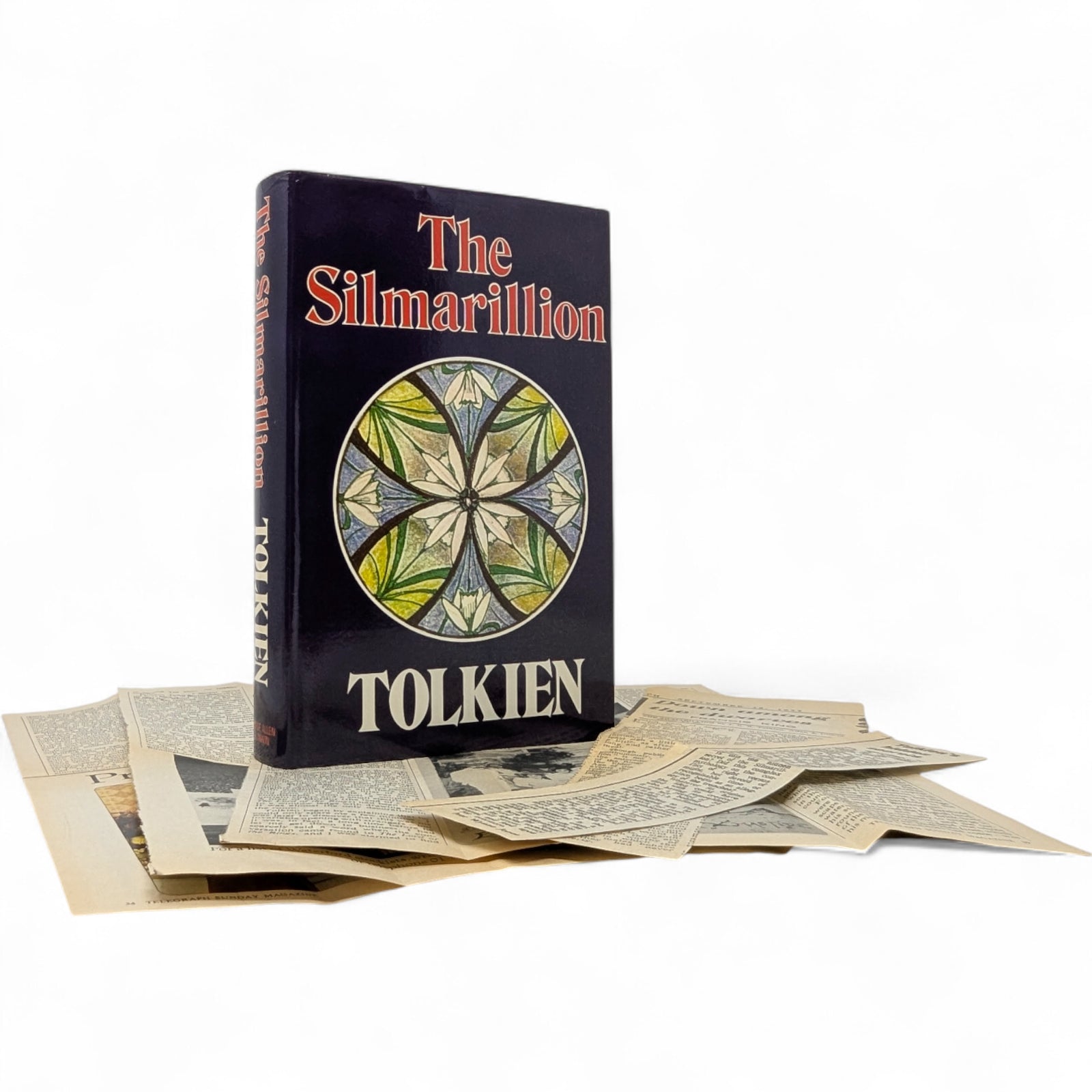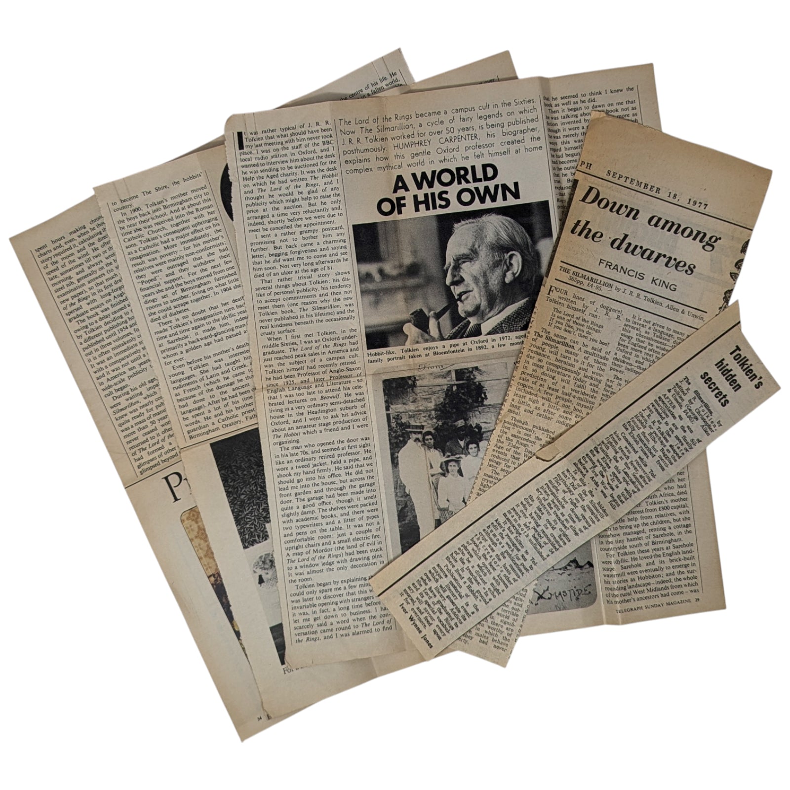 [Accompanied by] three original newspaper cuttings from the 1970s, issued at the time of The Silmarillion’s first publication. These include “Down Among the Dwarves” (likely The Sunday Telegraph), Francis King’s contemporary review praising the book’s mythic grandeur; “Tolkien’s Hidden Secrets” (regional UK press), Ivor Wynne Jones’s reflection on its wartime origins and posthumous completion by Christopher Tolkien; and “A World of His Own” (Telegraph Sunday Magazine), Humphrey Carpenter’s richly illustrated biographical essay tracing Tolkien’s creative life and the making of his mythology. The articles are not very neatly cut and they are heavily tanned with many folds and creases; perfectly legible however.