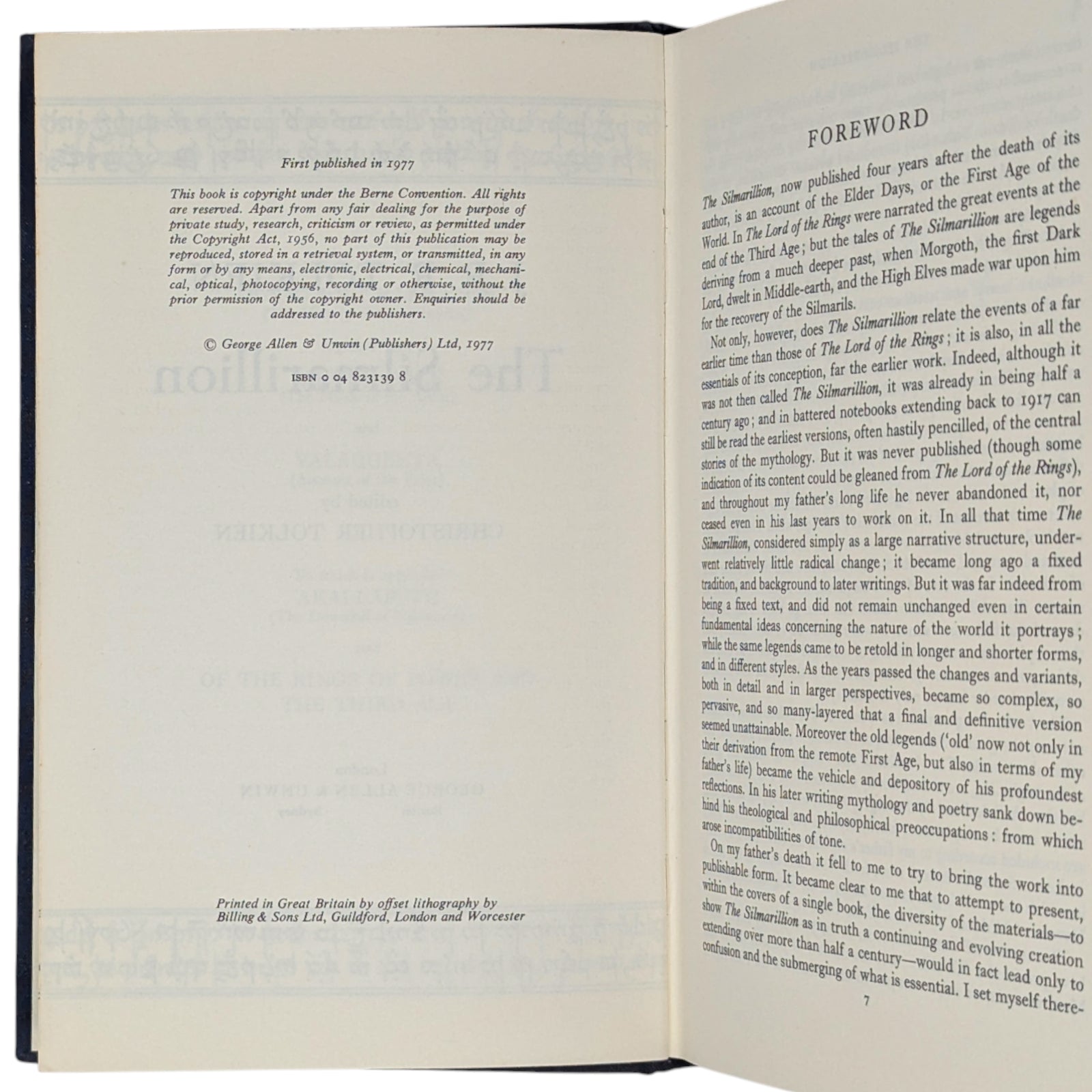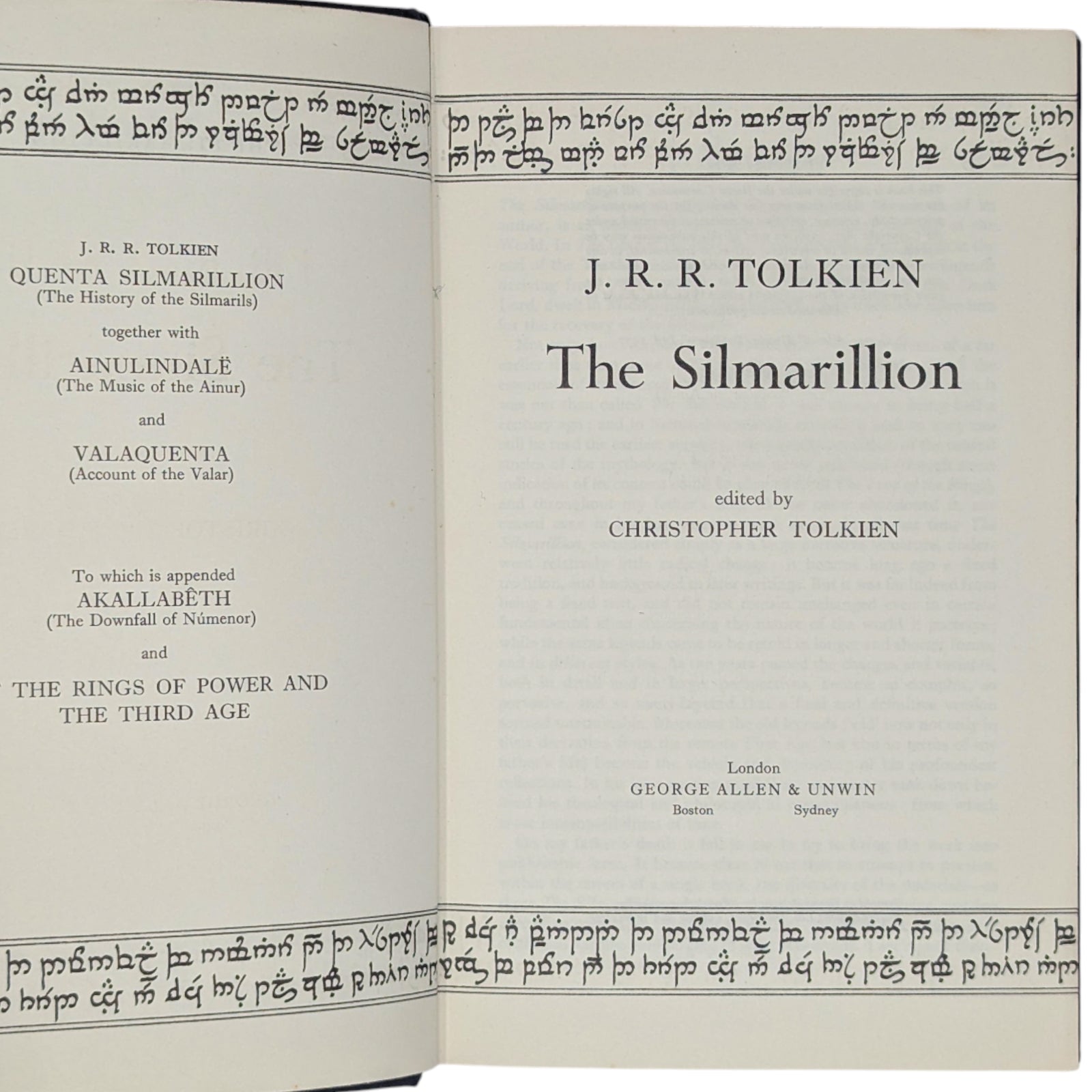 The Silmarillion, by J. R. R. Tolkien. London: George Allen & Unwin, 1977. First edition (British), first printing, the domestic edition, printed by Billing & Sons, priced £4.95 to the inner front flap of the (unclipped) dust jacket. An export issue, printed by William Clowes, was published simultaneously.