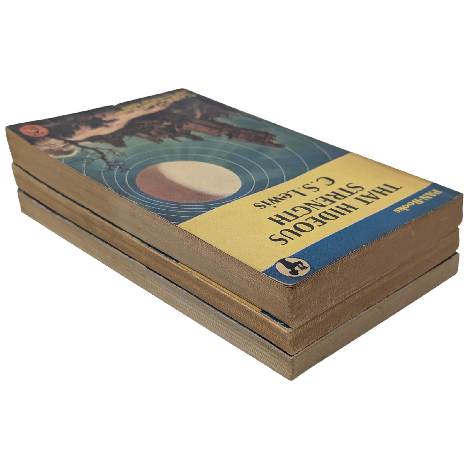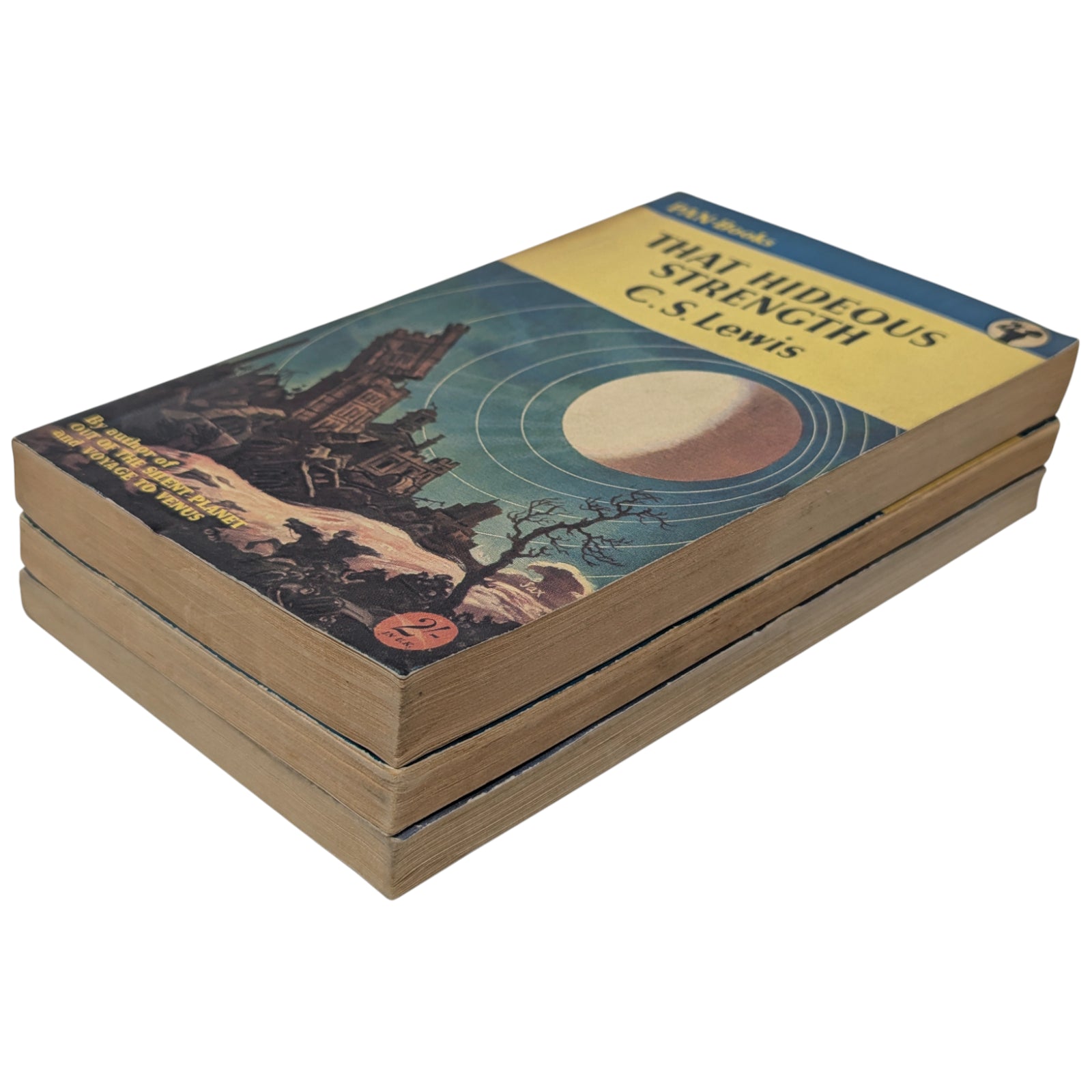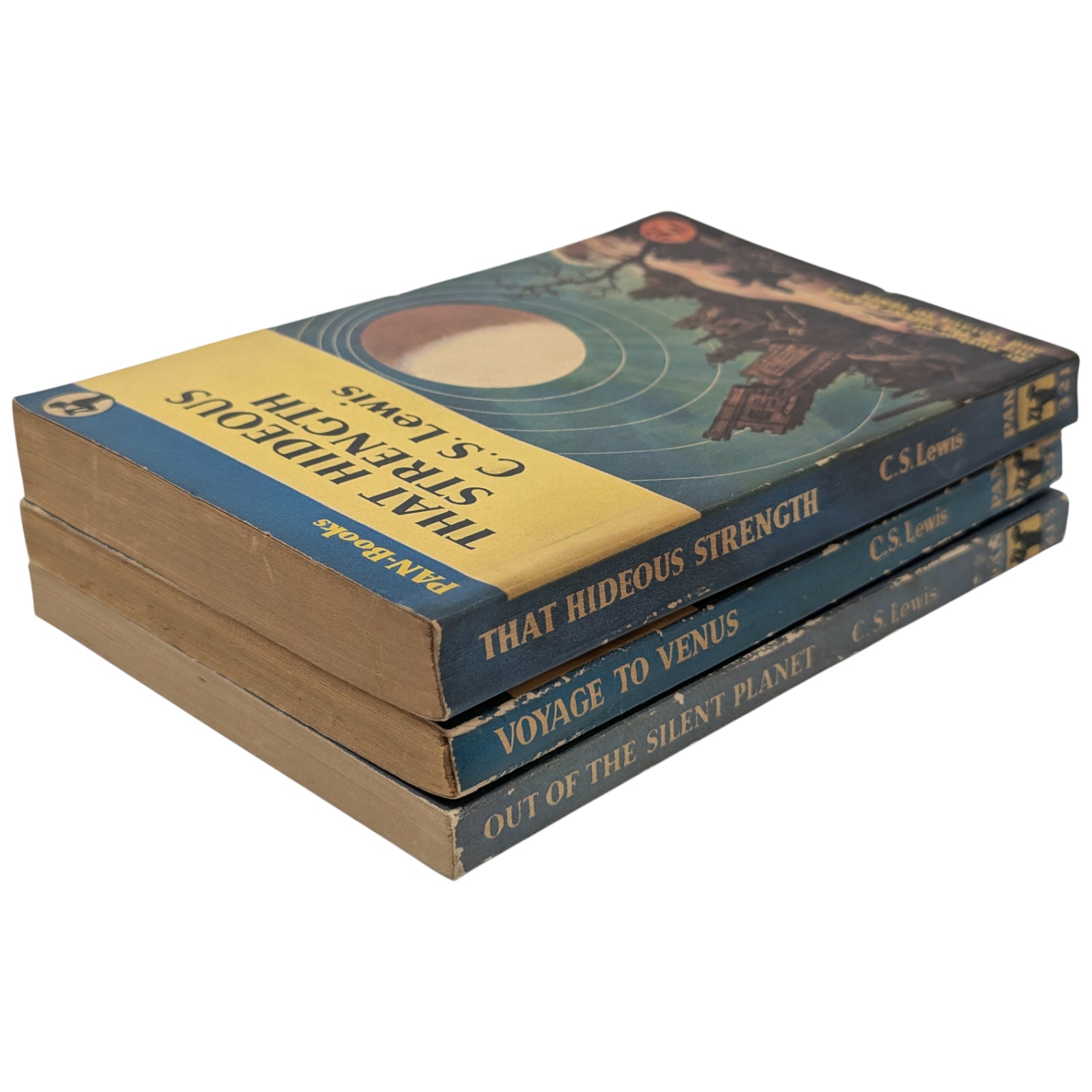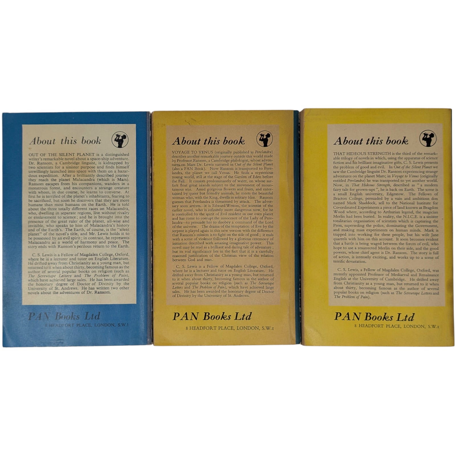 LEWIS, C. S. Out of the Silent Planet; Voyage to Venus (Perelandra); That Hideous Strength. London: Pan Books Ltd, 1952, 1953 and 1955. First Pan editions, first printings. 3 paperback volumes; each 17.7 x 11.3 cm; 189 pp, 187 pp and 251 pp respectively; publisher's advertisements at rear.