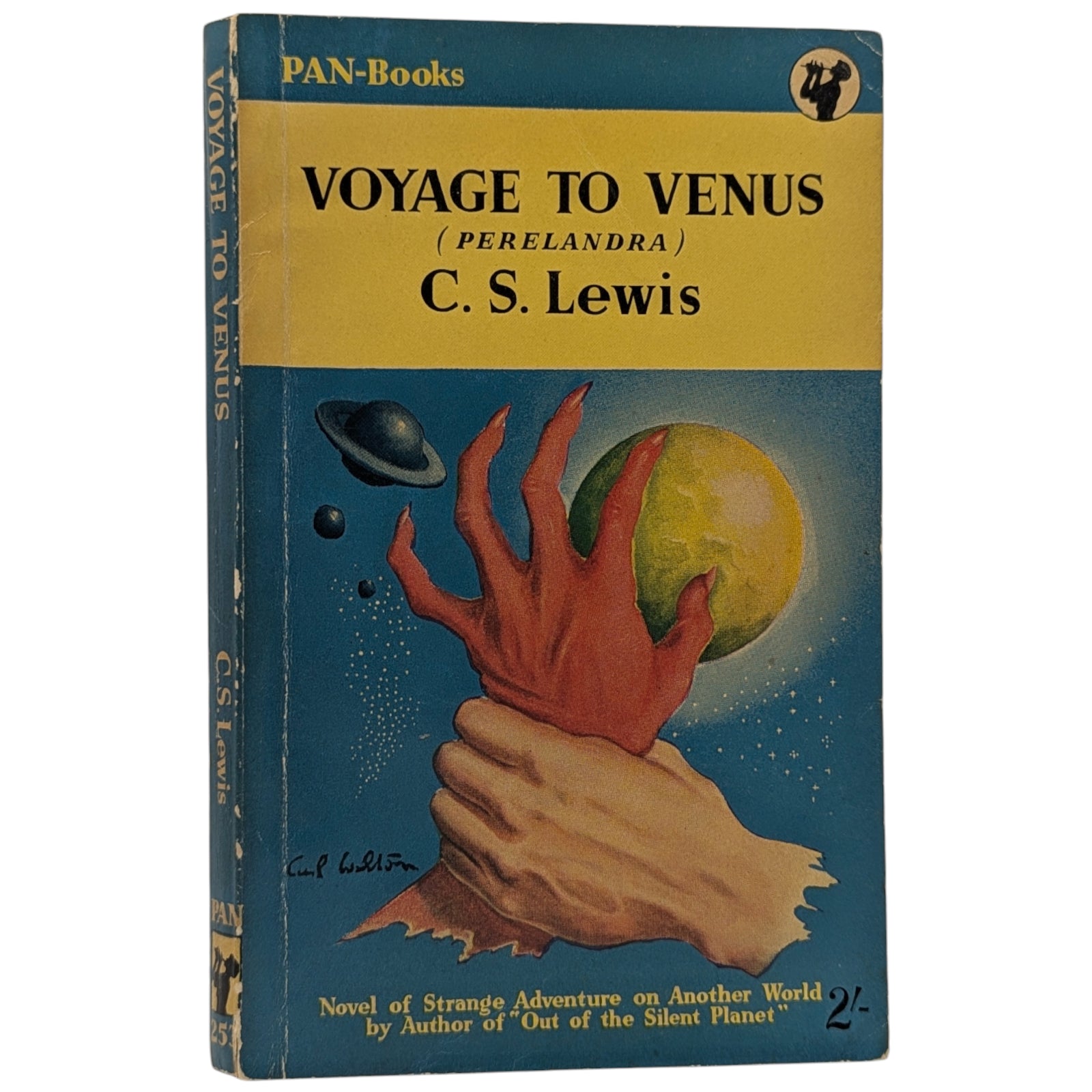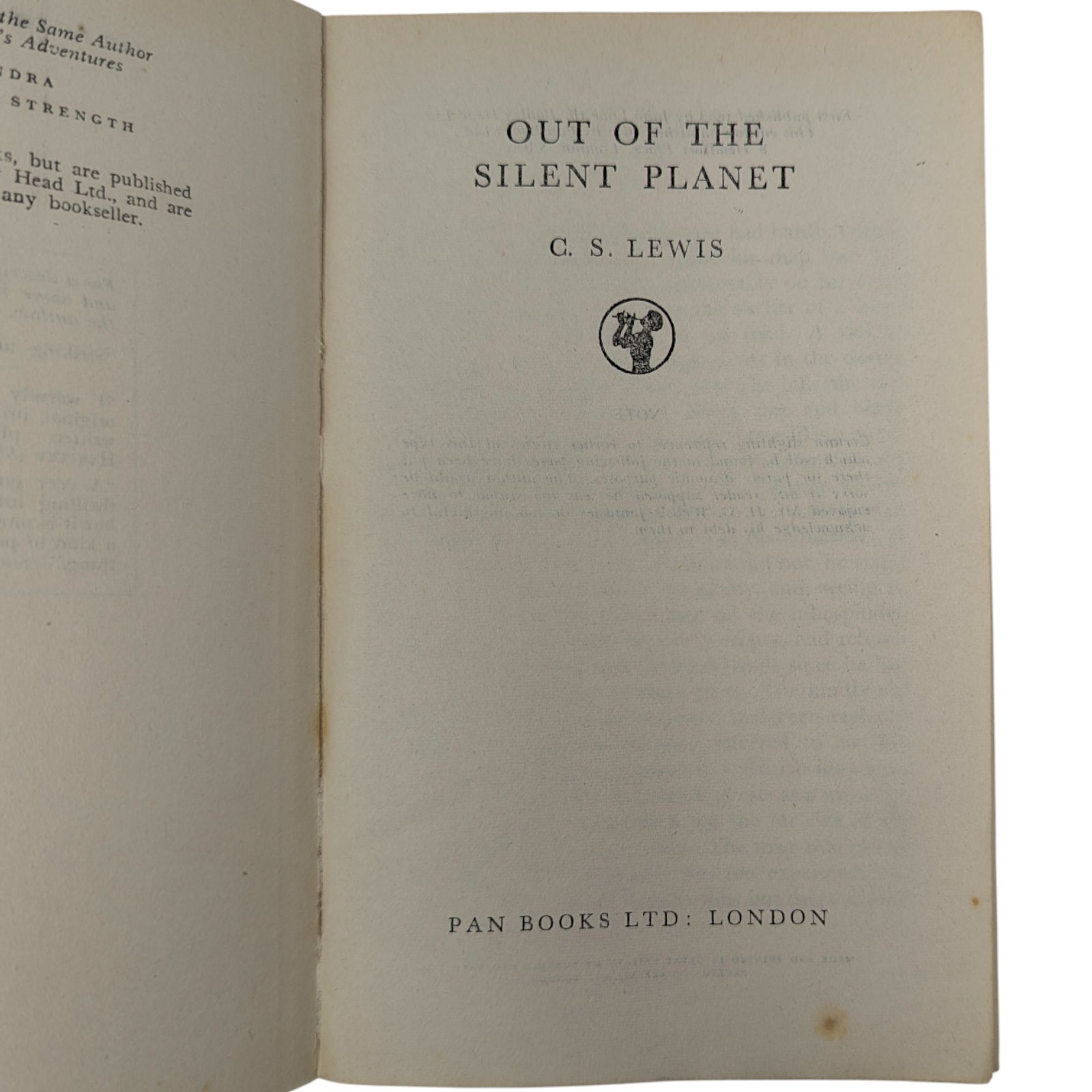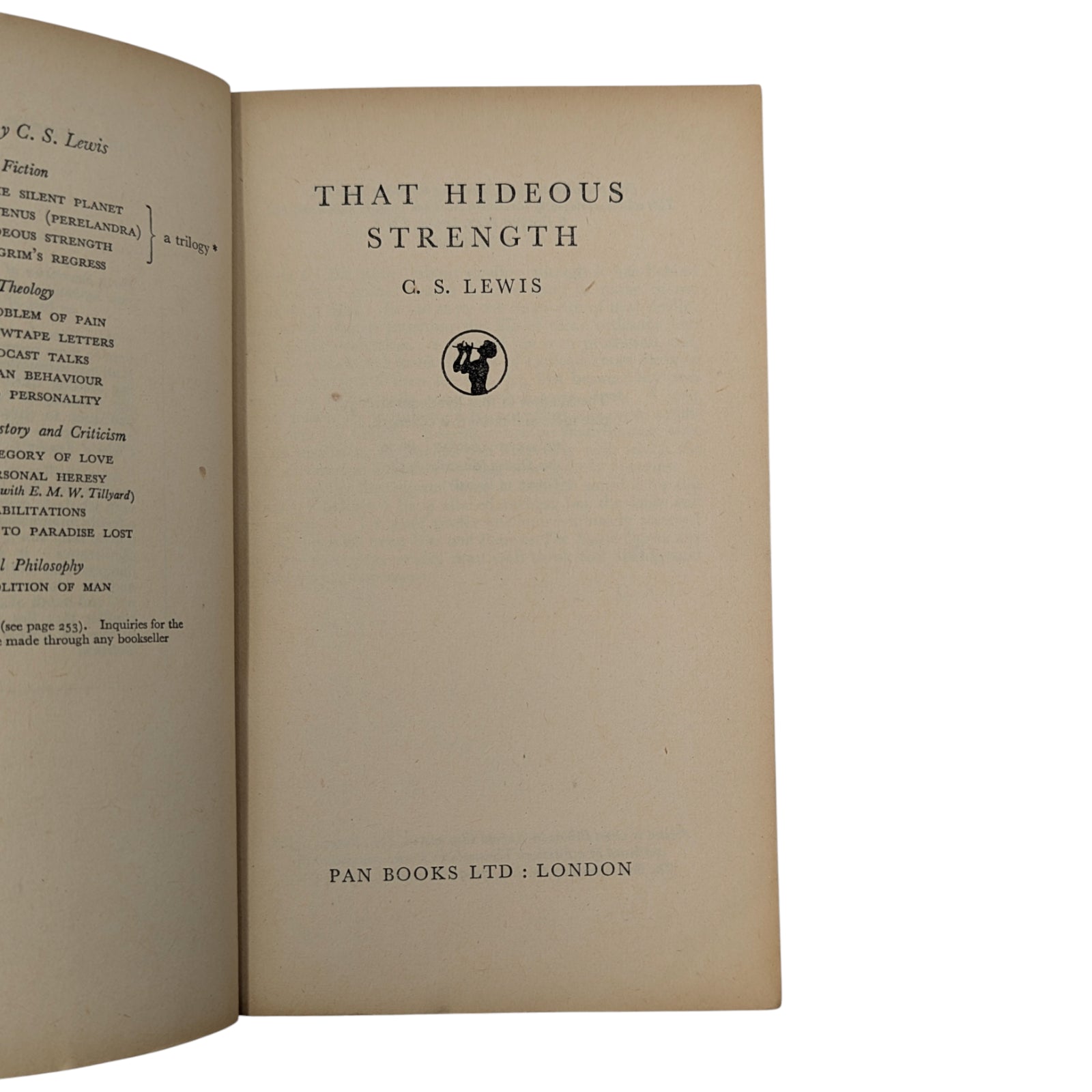 LEWIS, C. S. Out of the Silent Planet; Voyage to Venus (Perelandra); That Hideous Strength. London: Pan Books Ltd, 1952, 1953 and 1955. First Pan editions, first printings. 3 paperback volumes; each 17.7 x 11.3 cm; 189 pp, 187 pp and 251 pp respectively; publisher's advertisements at rear.