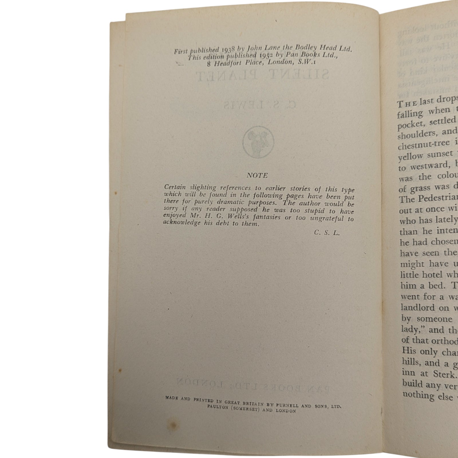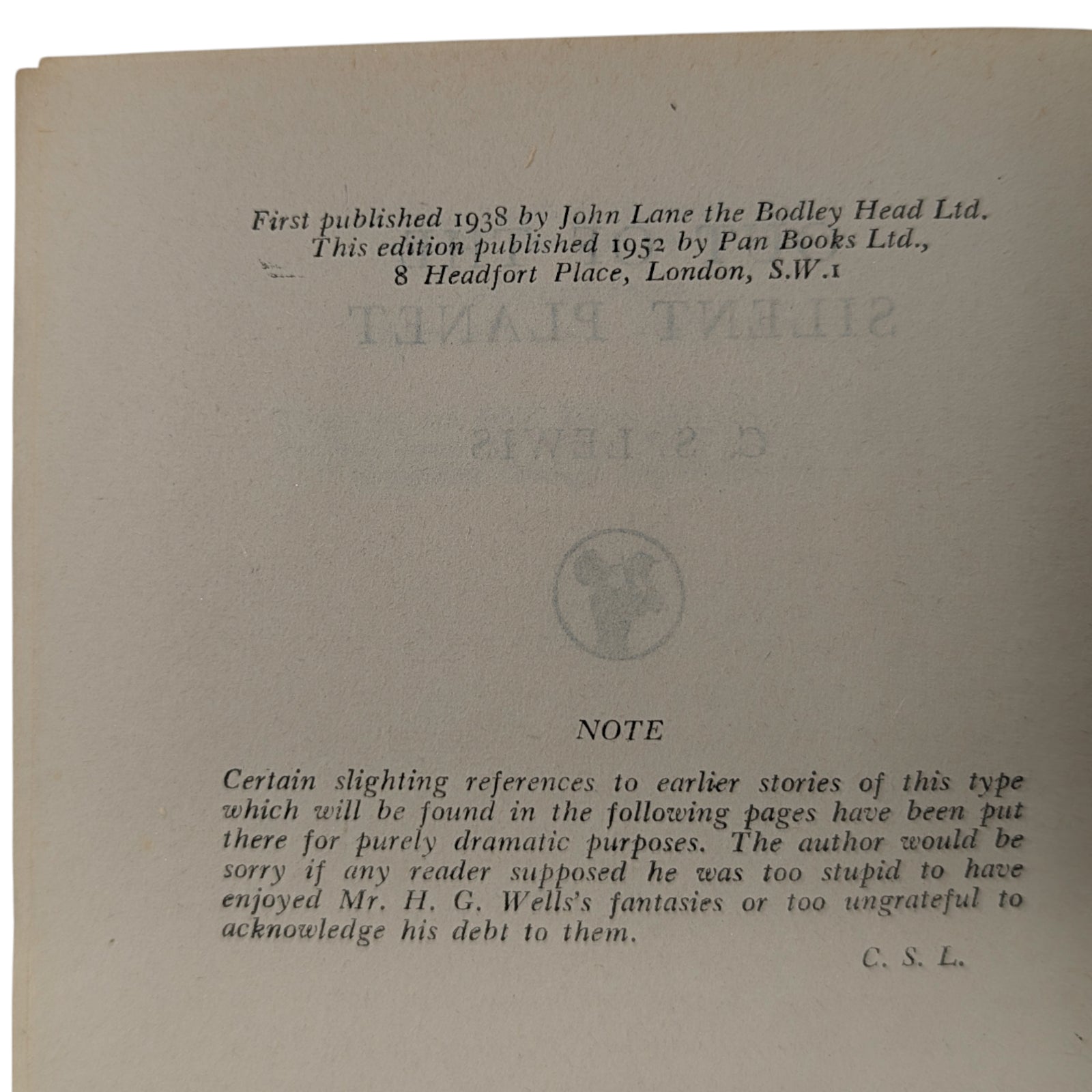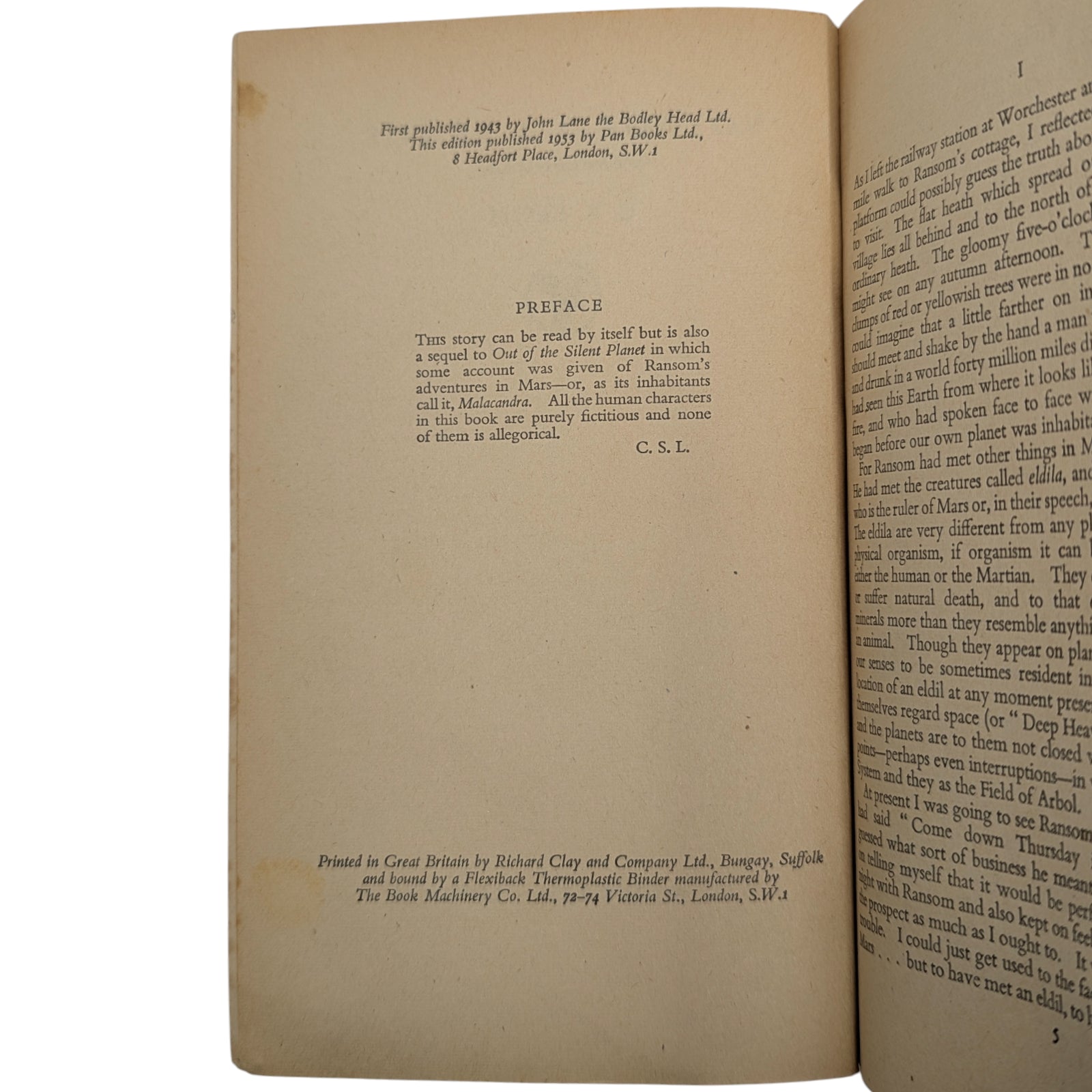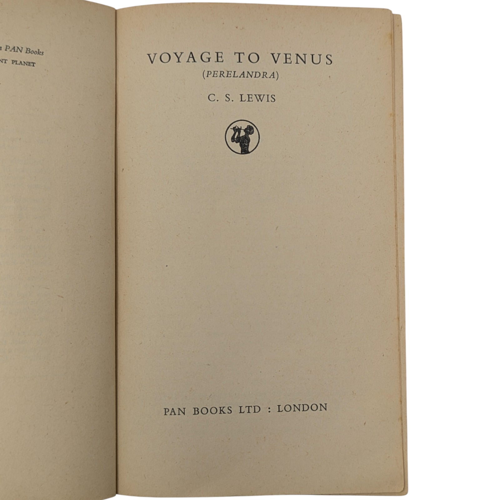 LEWIS, C. S. Out of the Silent Planet; Voyage to Venus (Perelandra); That Hideous Strength. London: Pan Books Ltd, 1952, 1953 and 1955. First Pan editions, first printings. 3 paperback volumes; each 17.7 x 11.3 cm; 189 pp, 187 pp and 251 pp respectively; publisher's advertisements at rear.