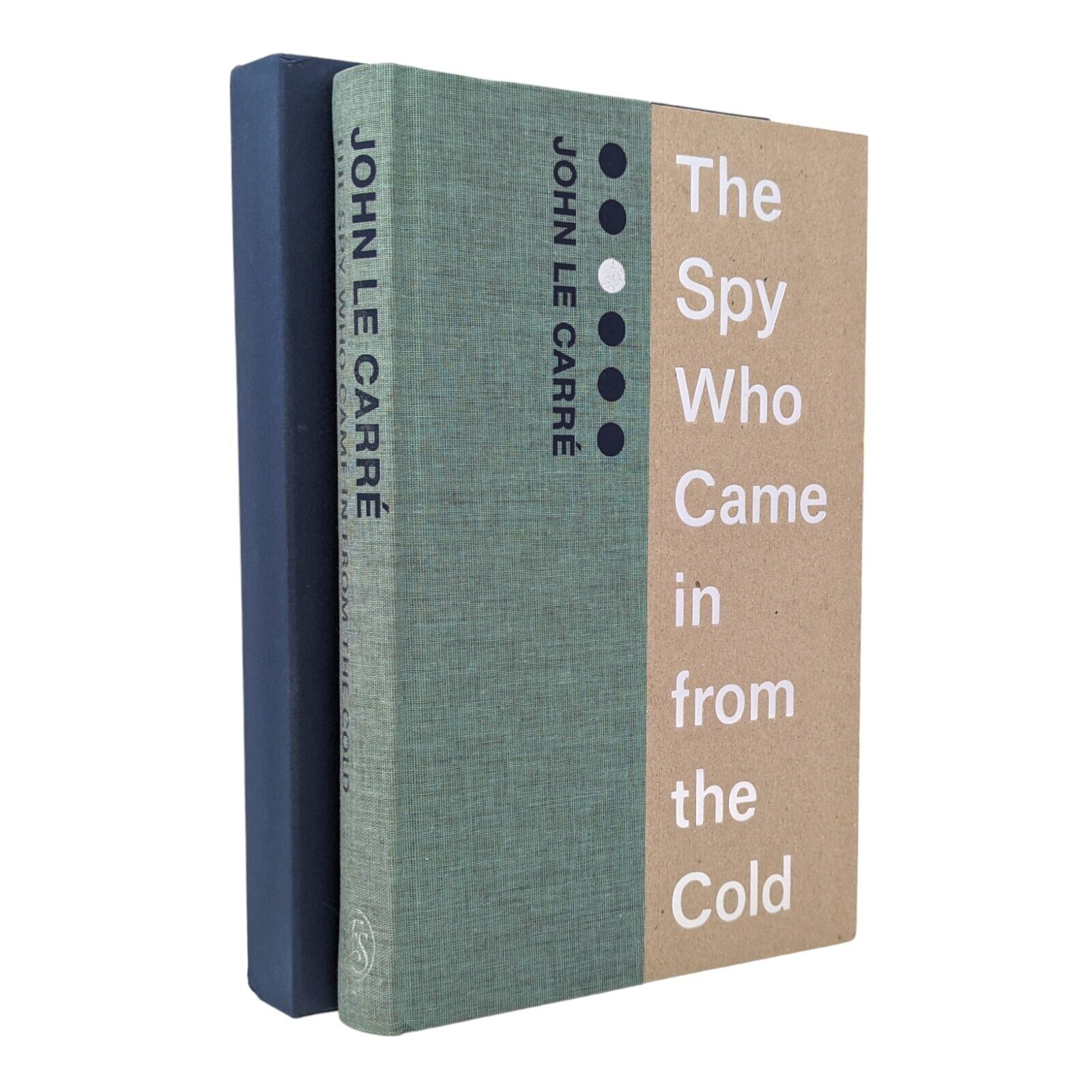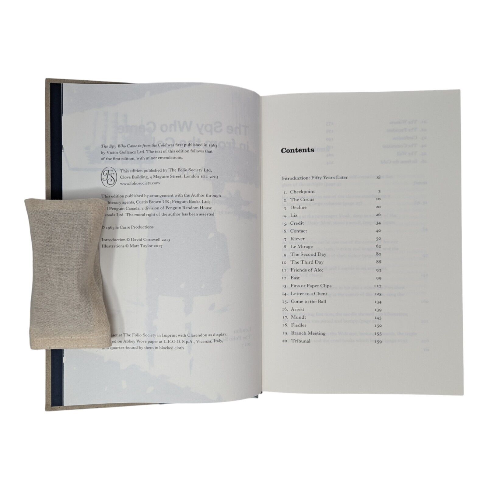 The Spy Who Came In From the Cold by John le Carré. London: The Folio Society, 2017. Introduction by the author, illustrations by Matt Taylor. 242 × 163 × 26 mm. Pp. [i–vi] vii–xvi, [1–2] 3–216: [8] leaves of colour plates (facing pp. [iii], 32, 64, 97, 145, 160, 201 and 216). Type: Imprint with Clarendon for display. Printed and bound by L.E.G.O. in quarter green-grey cloth and boards left raw blocked in silver and blue; dark blue endleaves. Dark blue slip case.