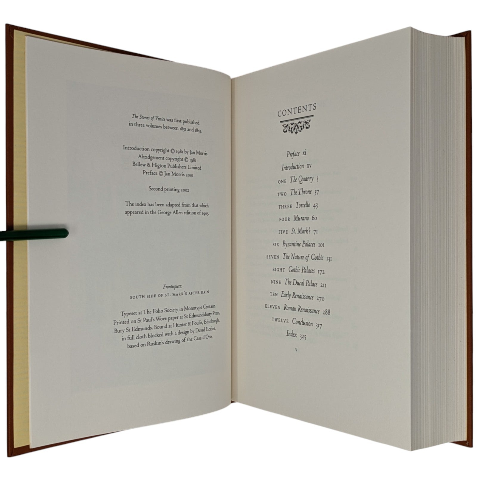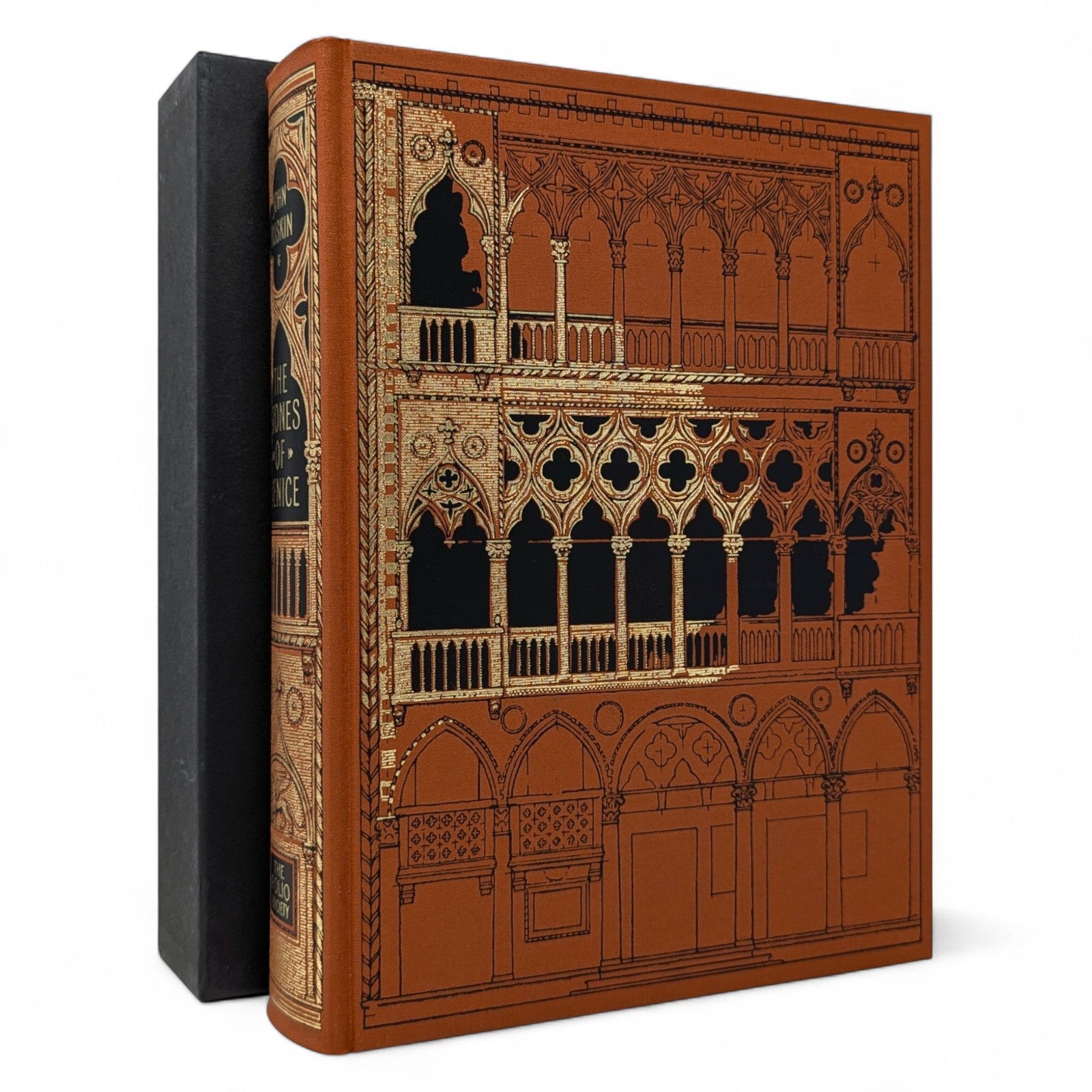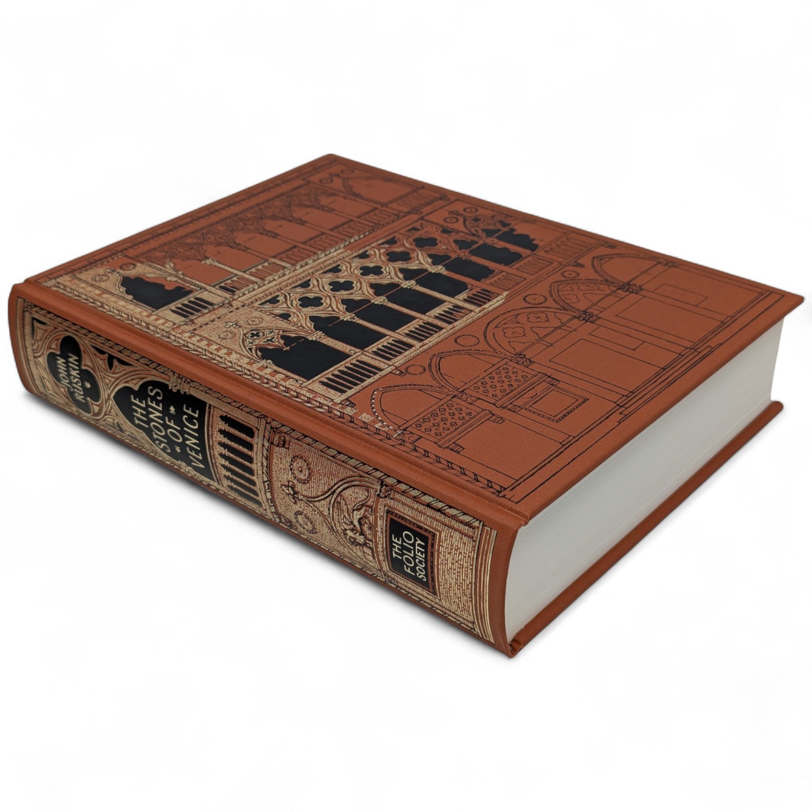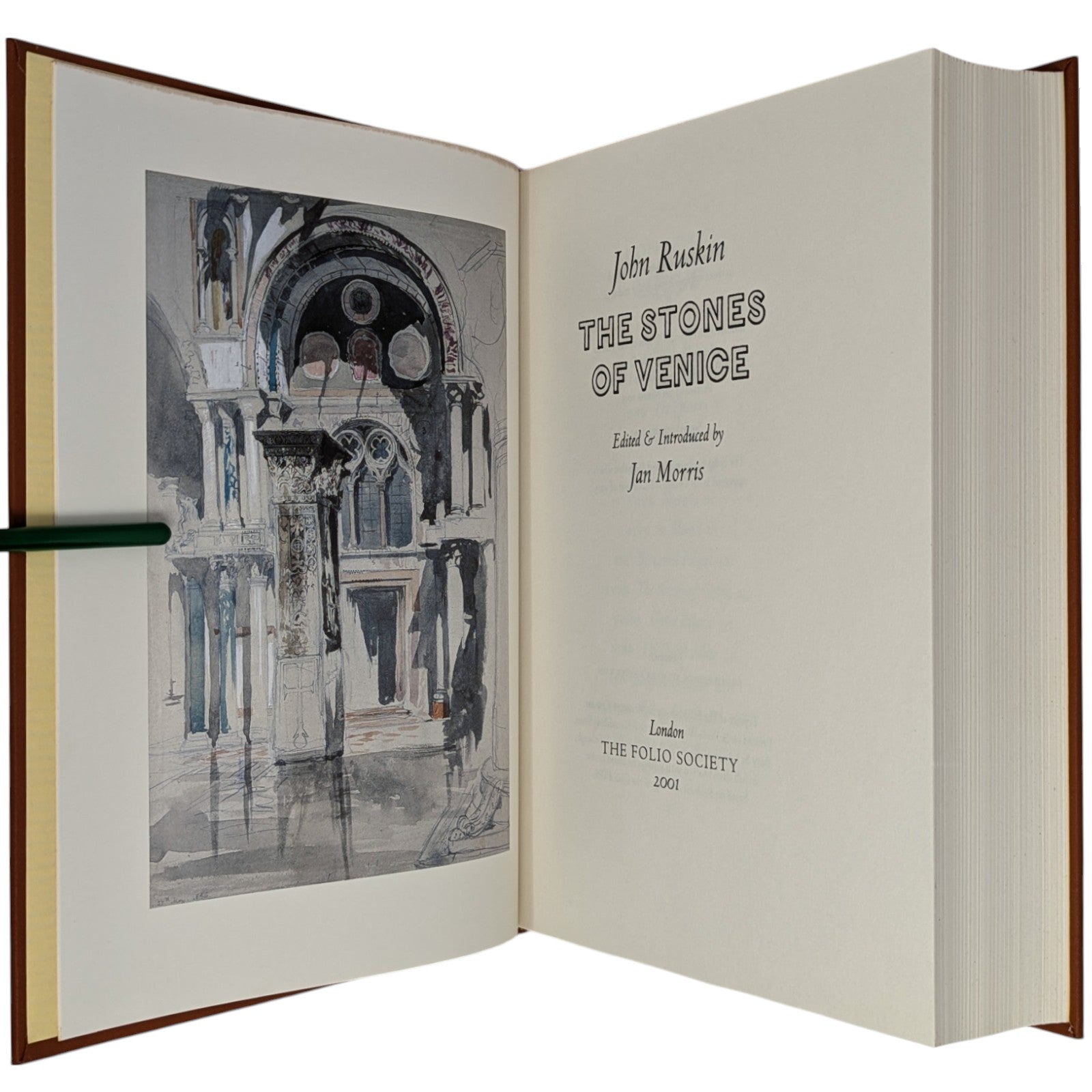 John Ruskin, The Stones of Venice. London: The Folio Society, 2001. Second printing thus, 2002. Edited & introduced by Jan Morris. 253 × 193 × 52 mm. Pp. [i–iv] v–xlvi, [1–2] 3–350: [14] leaves of colour, [16] pages of monochrome plates. Type: Centaur and Arrighi with Open Sans-Surryphs for the title. Printed by the Saint Edmundsbury Press. Bound by Hunter and Foulis in pale red-brown cloth with a design in black and gold by David Eccles; pale yellow endleaves. Black slip case.