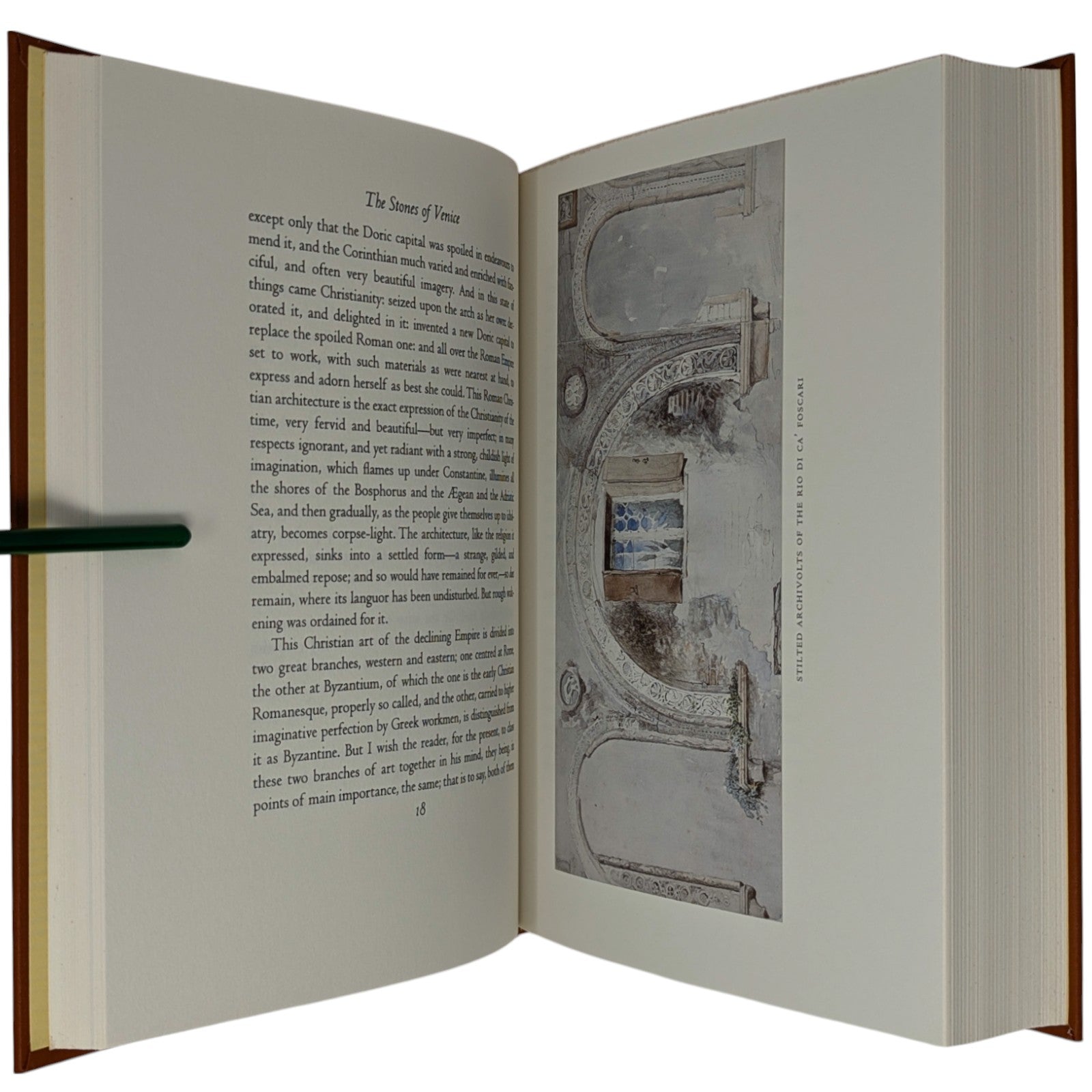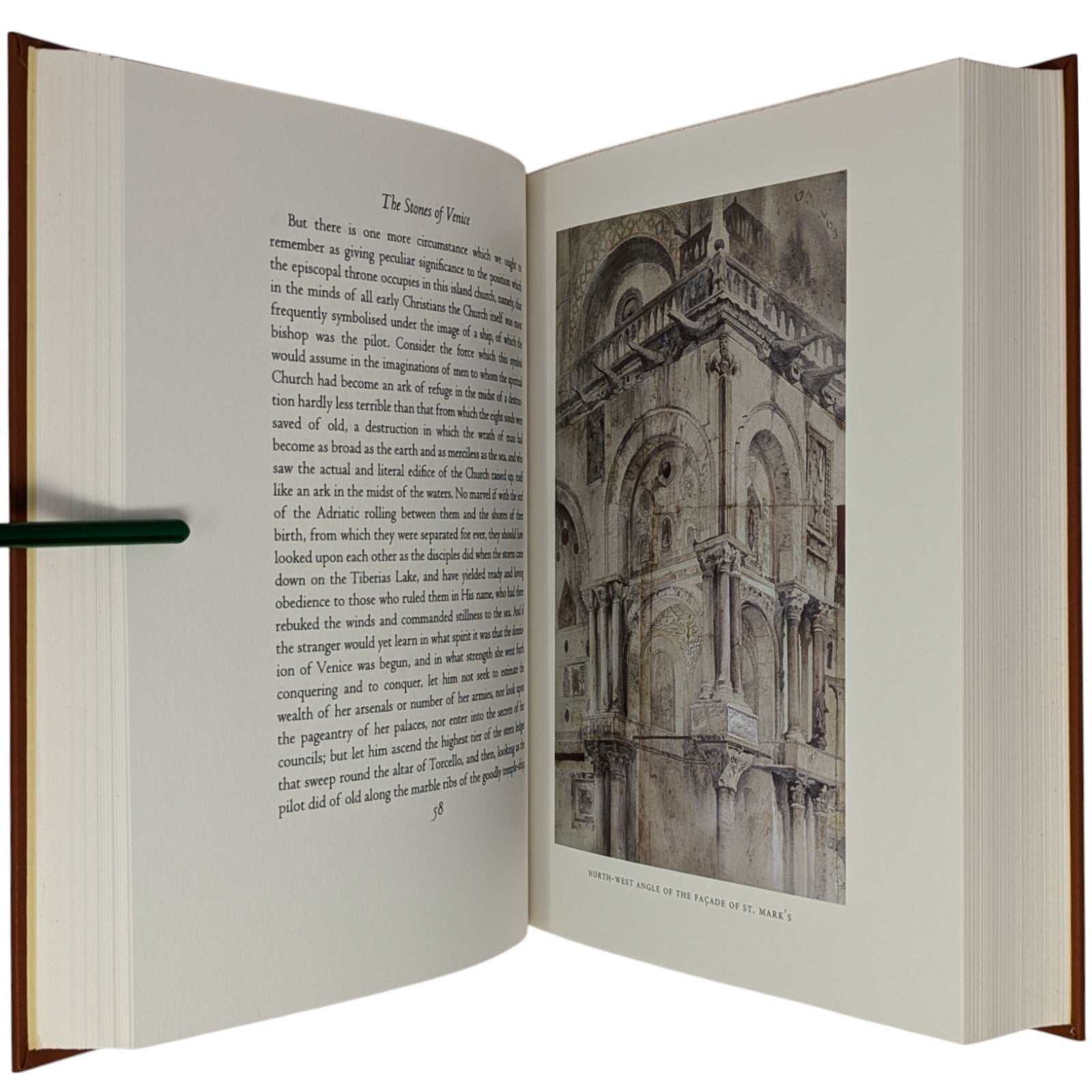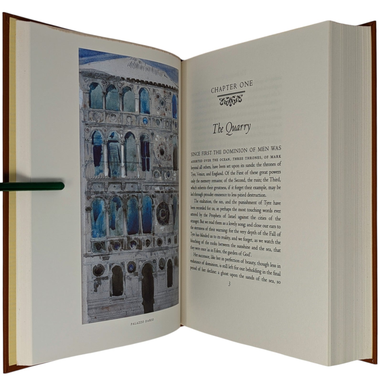 John Ruskin, The Stones of Venice. London: The Folio Society, 2001. Second printing thus, 2002. Edited & introduced by Jan Morris. 253 × 193 × 52 mm. Pp. [i–iv] v–xlvi, [1–2] 3–350: [14] leaves of colour, [16] pages of monochrome plates. Type: Centaur and Arrighi with Open Sans-Surryphs for the title. Printed by the Saint Edmundsbury Press. Bound by Hunter and Foulis in pale red-brown cloth with a design in black and gold by David Eccles; pale yellow endleaves. Black slip case.